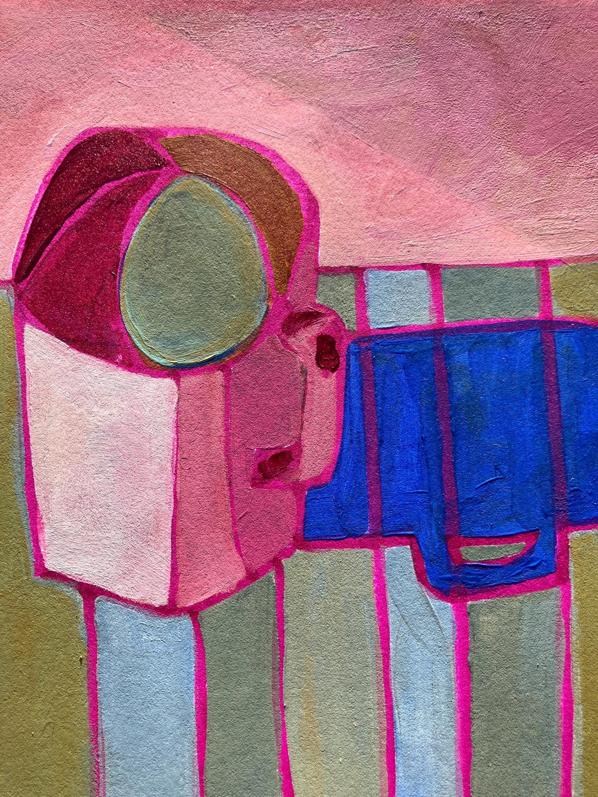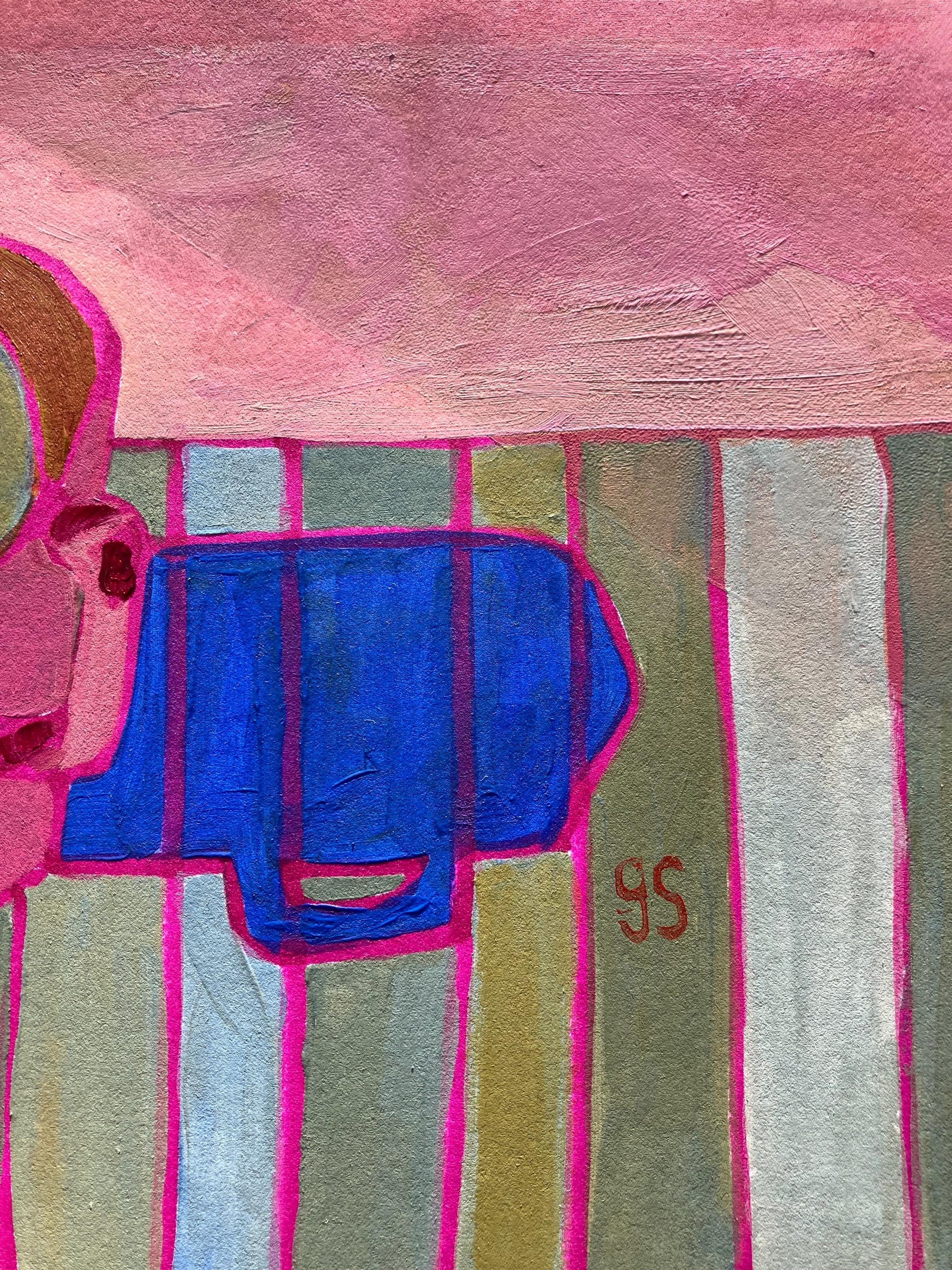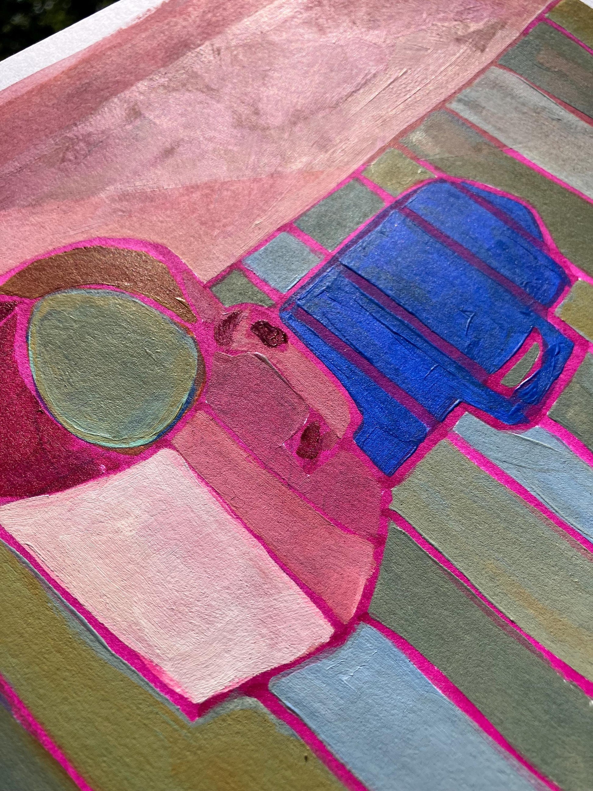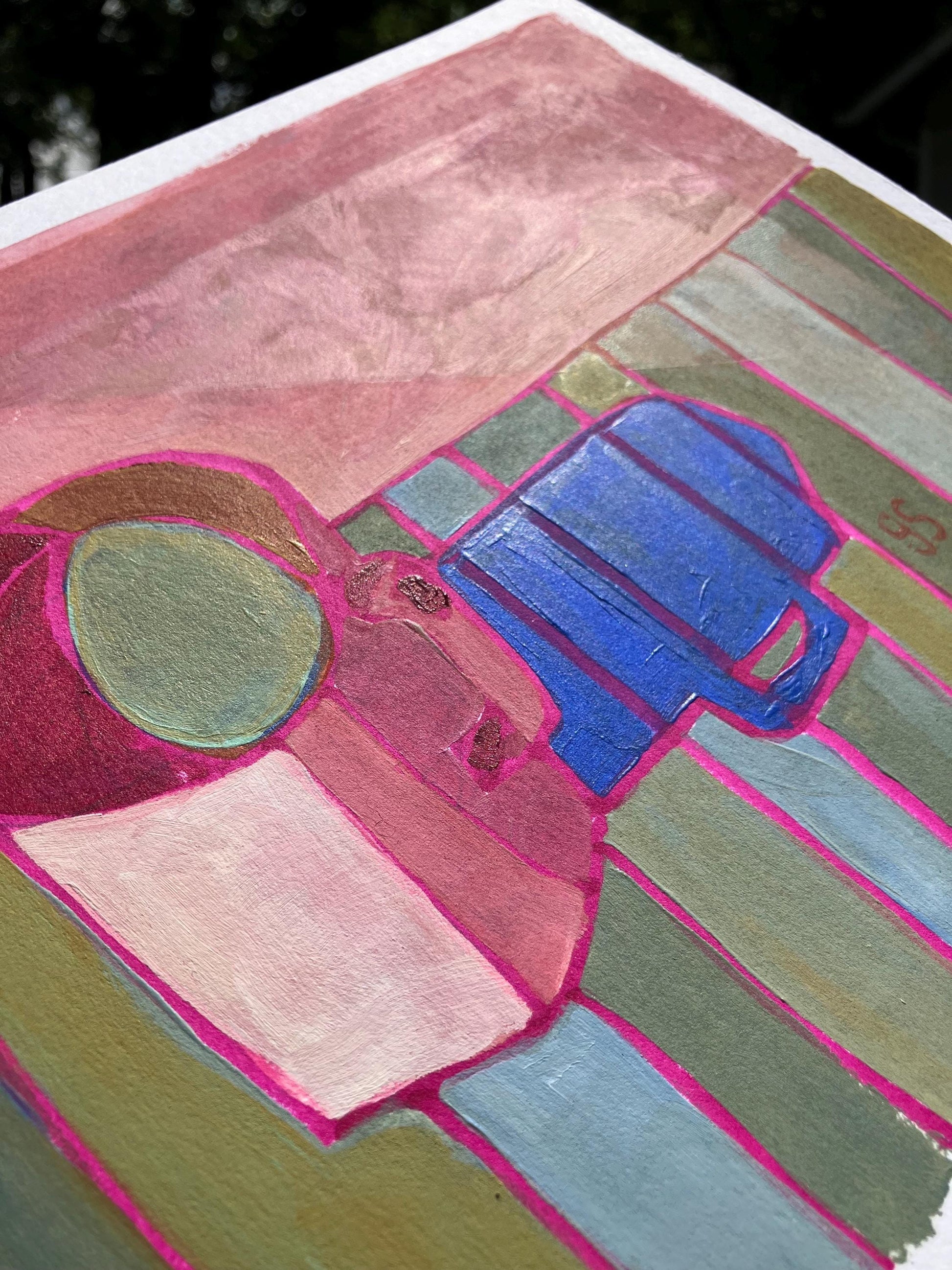 This original 8x10" acrylic painting of a coffee cup was painted in bright colors with pink highlights onto thick cotton paper. This piece features short brushstrokes and neutral colors.