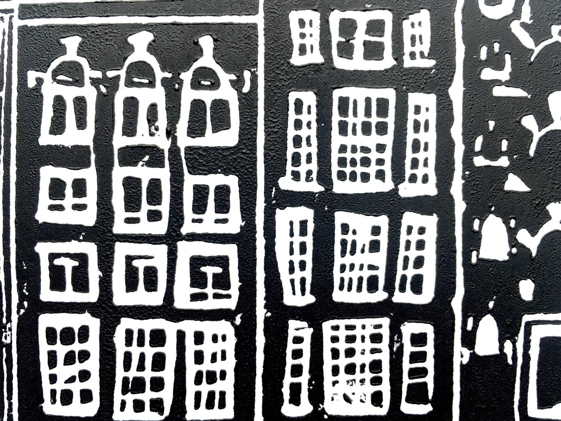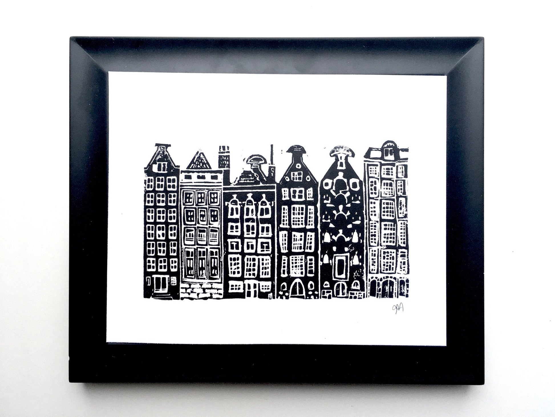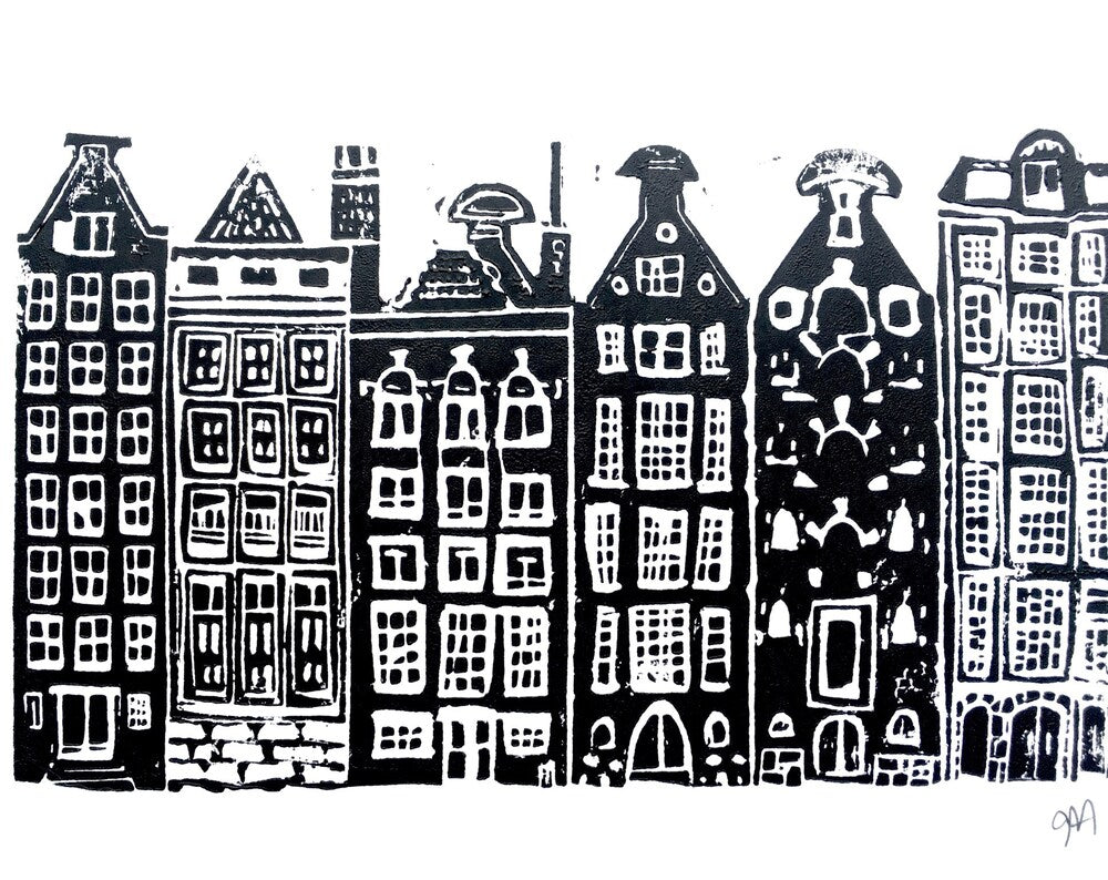 Original linocut print of the famous canal houses of Amsterdam, Netherlands.