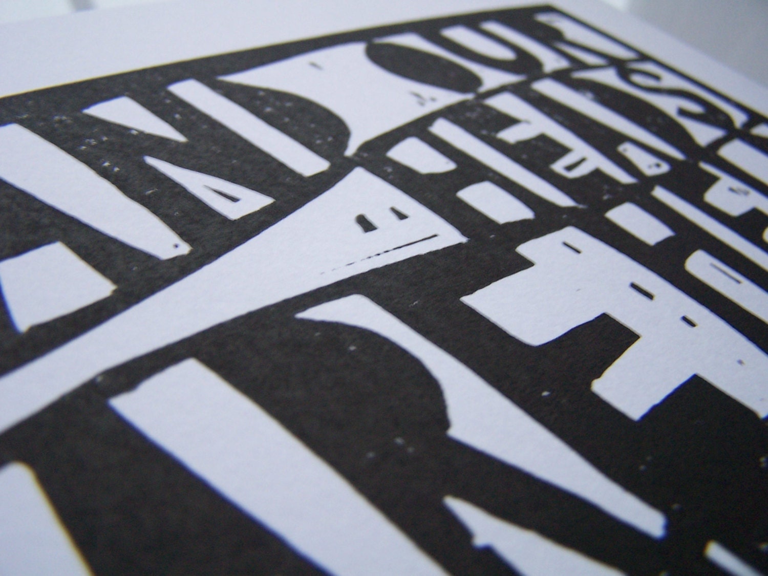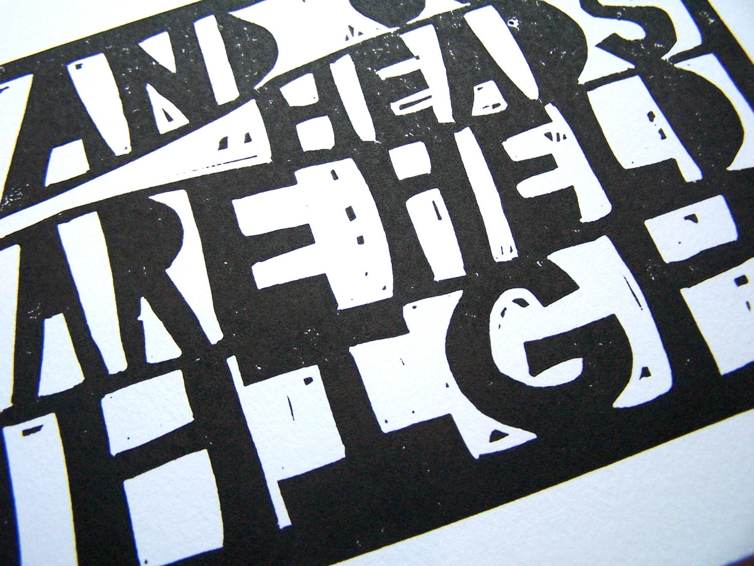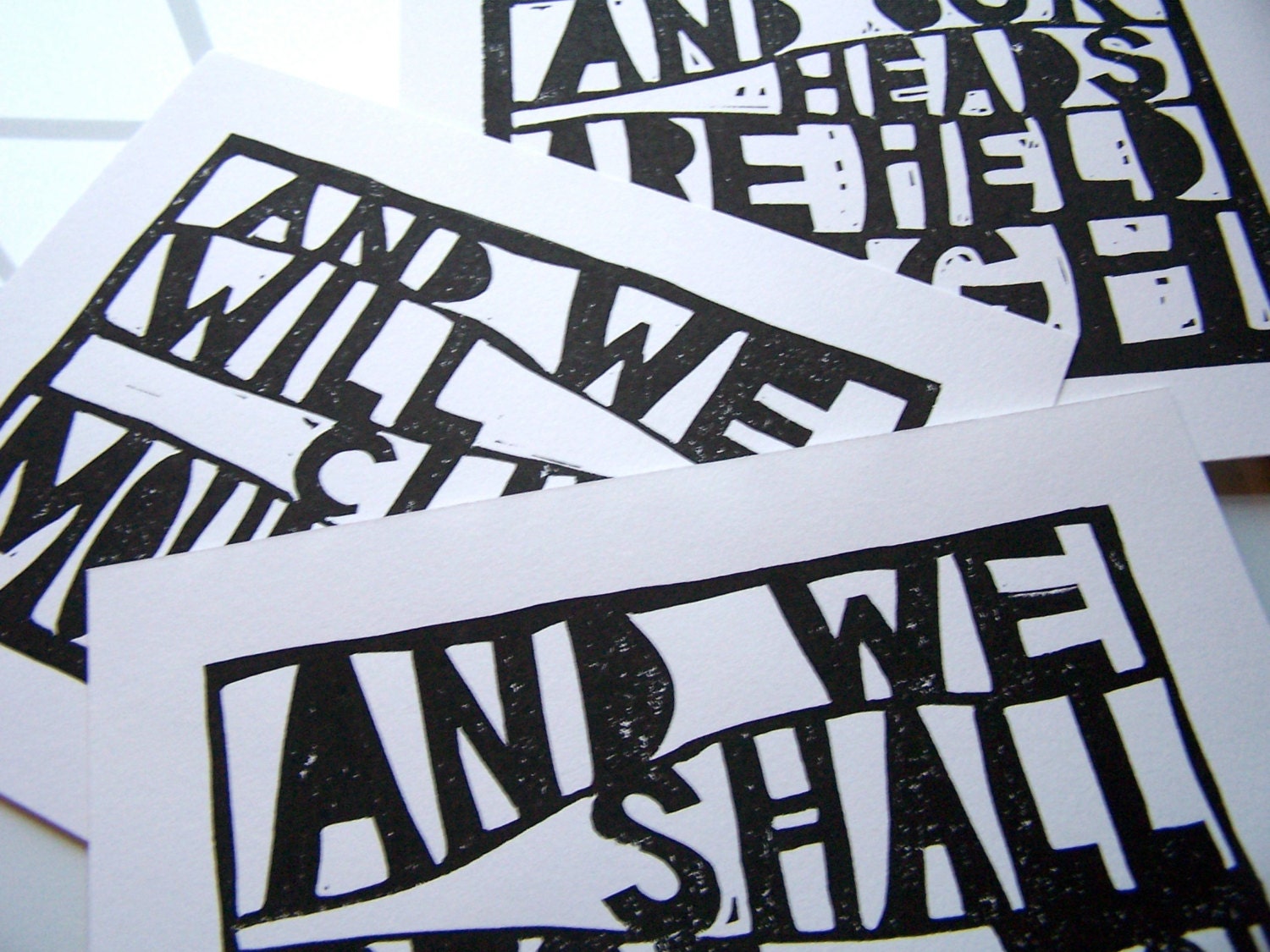 This hand-pulled linoleum block was pressed in black on thick, cotton paper. Because each linoprint is pressed individually, no two are completely alike. This is a set of three. Great individually or in the group. Check out my shop for the rest: 1) AND WE HOLD OUR HEADS HIGH 2) AND WE WILL CLIMB MOUNTAINS 3) AND WE SHALL RISE VICTORIOUS!
