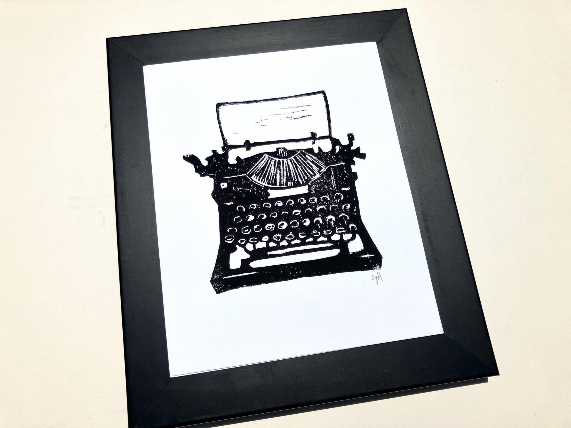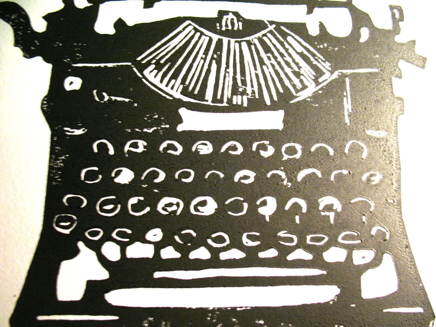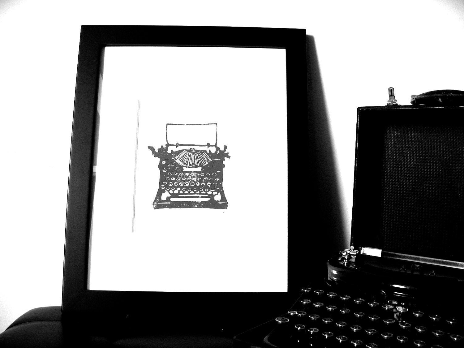 This hand-pulled relief print of an antique black typewriter was printed in black on thick letterpress paper. The linoleum block is carved by hand, inked, then each linoprint is pressed individually. Due to the printmaking process, there will be slight variations from print to print giving you an original piece of art! All materials are archival. Wide margins give you room to mat and frame to your liking. This is the perfect gift for antique enthusiasts and writers, but not secretaries.