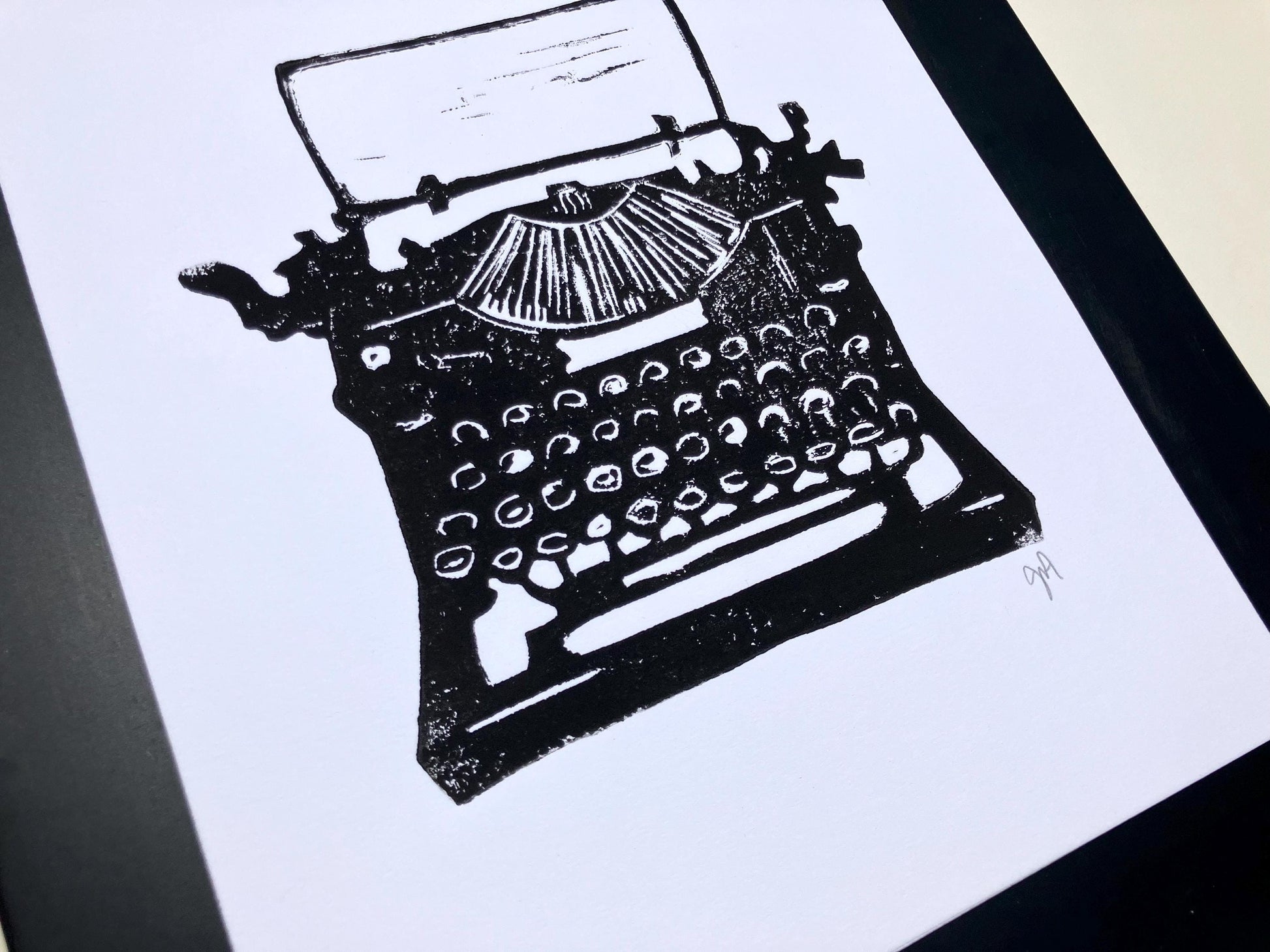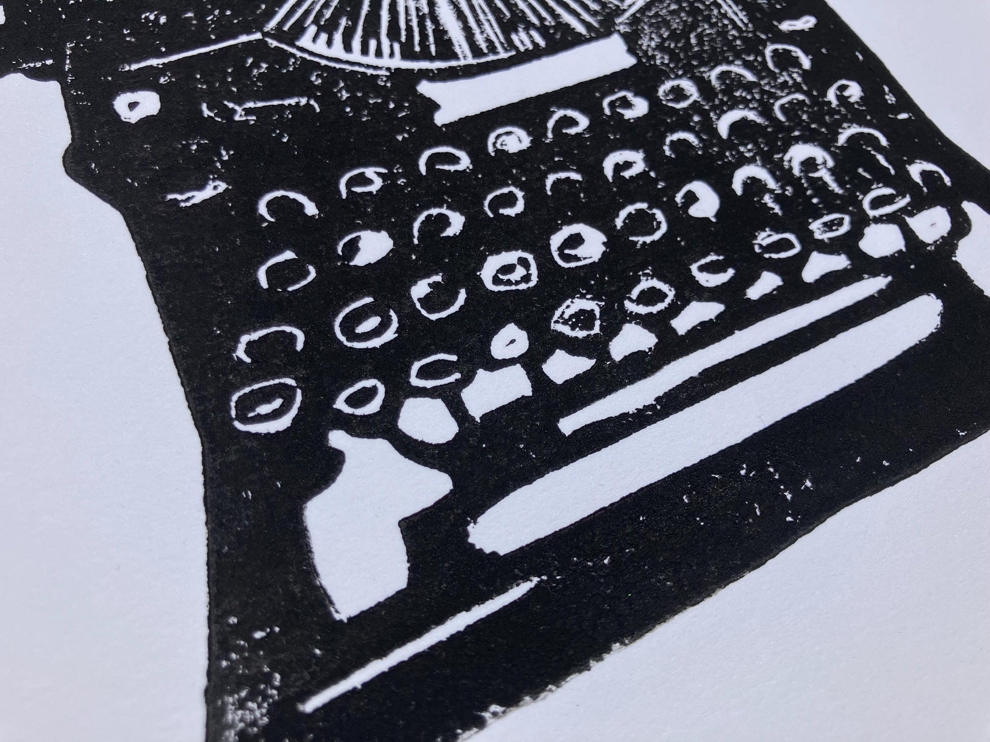 Minimal antique typewriter linocut print, in black. 8x10in.
