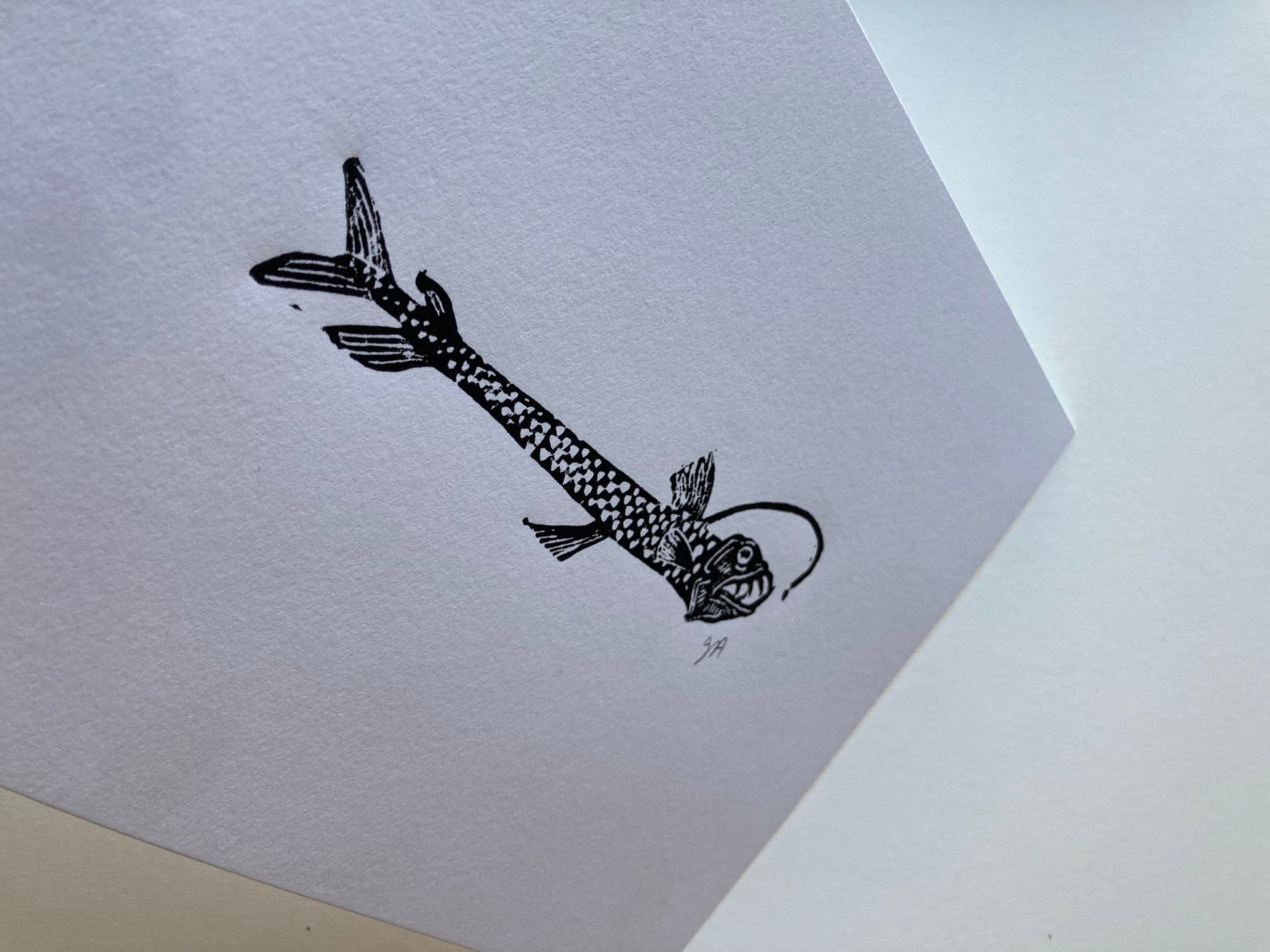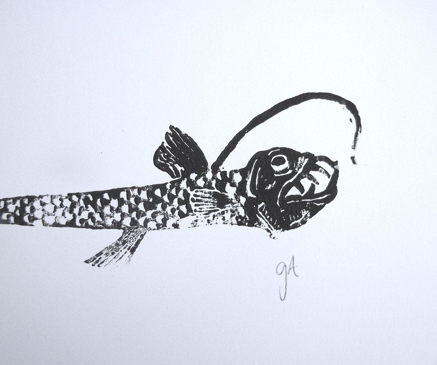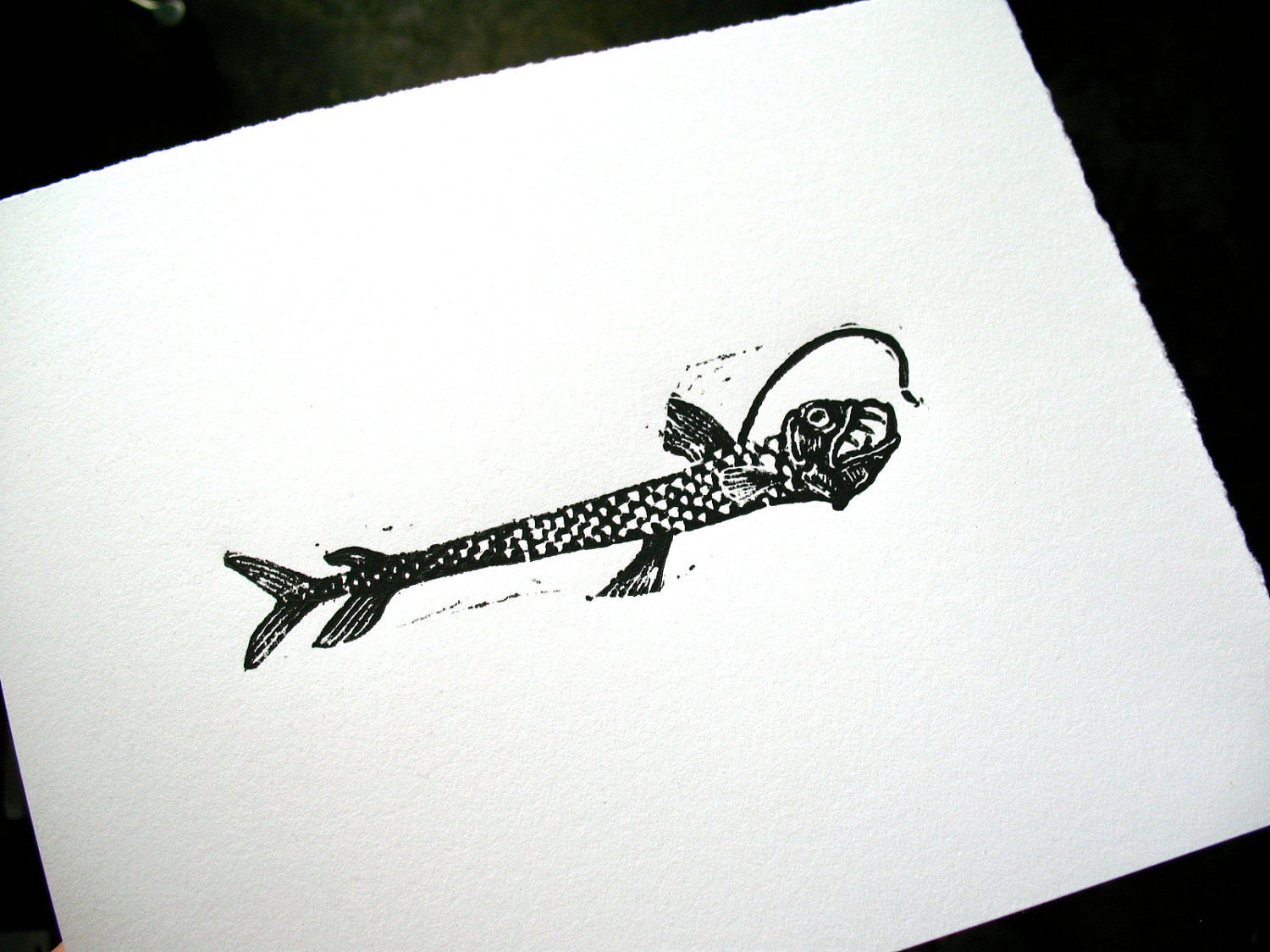 Black linoleum block print 8x10. This original, hand-pulled linoprint of a viperfish was hand-pressed in black on beautiful cotton letterpress paper. The linoleum block is cut by hand, inked, then each linoprint is pressed individually. Due to the printing process, there will be slight variations from print to print. All materials are archival. Wide margins give you room to mat and frame to your liking. This is the perfect gift for that marine adventurist in your life. Or Jacques Cousteau. Or Steve Zissou.
