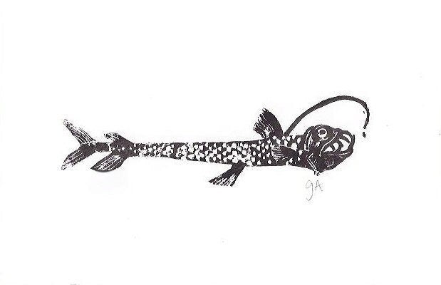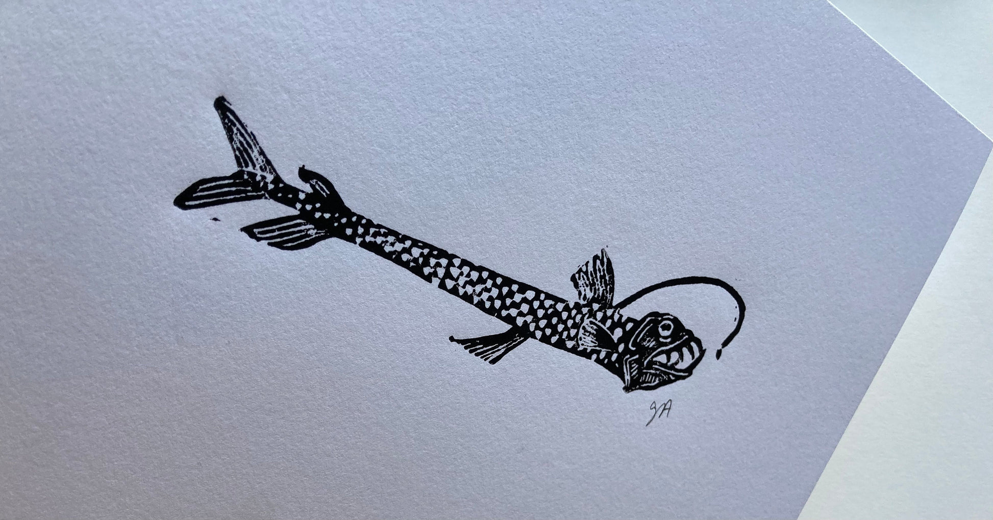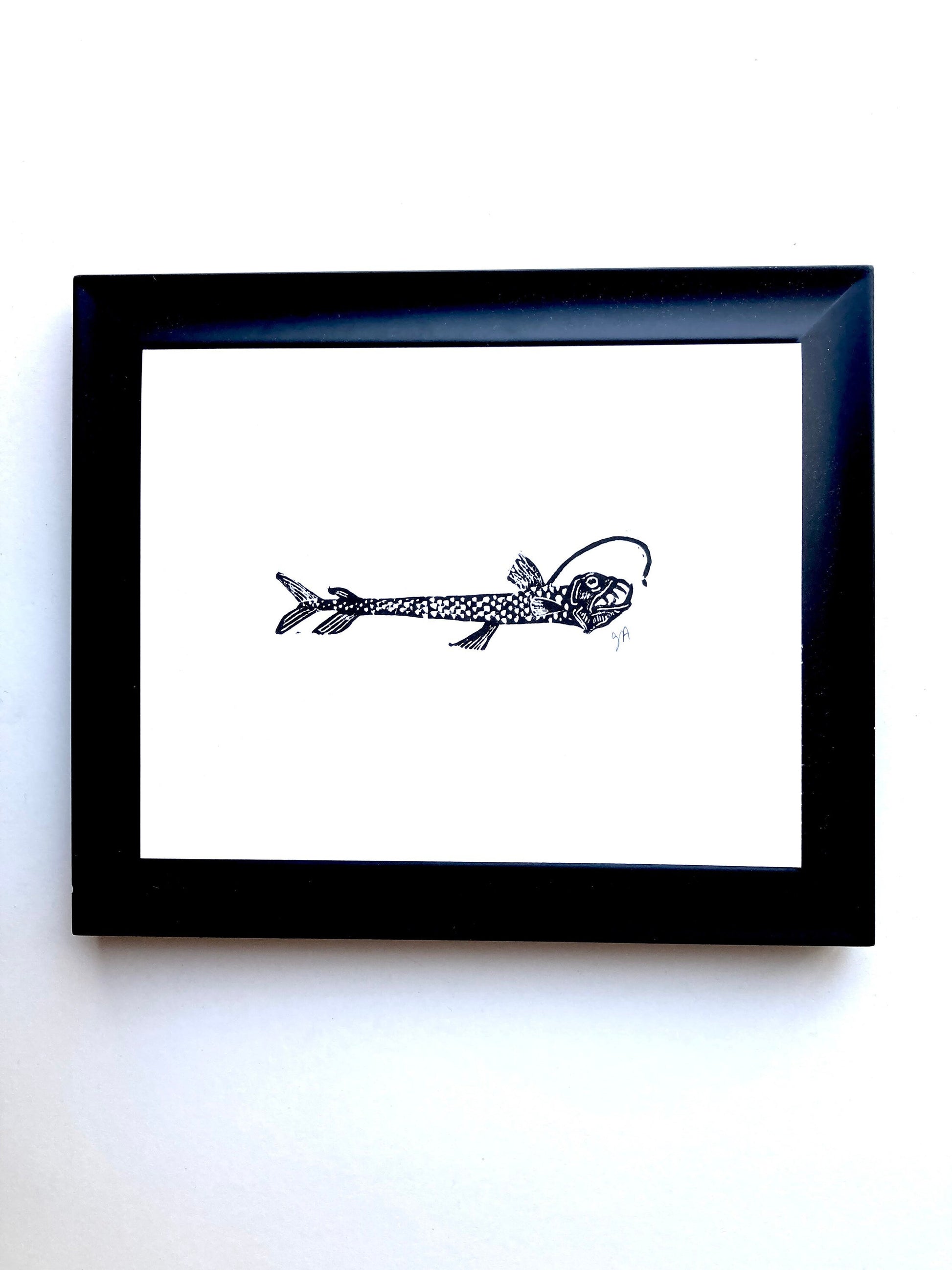 Black linoleum block print 8x10. This original, hand-pulled linoprint of a viperfish was hand-pressed in black on beautiful cotton letterpress paper. The linoleum block is cut by hand, inked, then each linoprint is pressed individually. Due to the printing process, there will be slight variations from print to print. All materials are archival. Wide margins give you room to mat and frame to your liking. This is the perfect gift for that marine adventurist in your life. Or Jacques Cousteau. Or Steve Zissou.