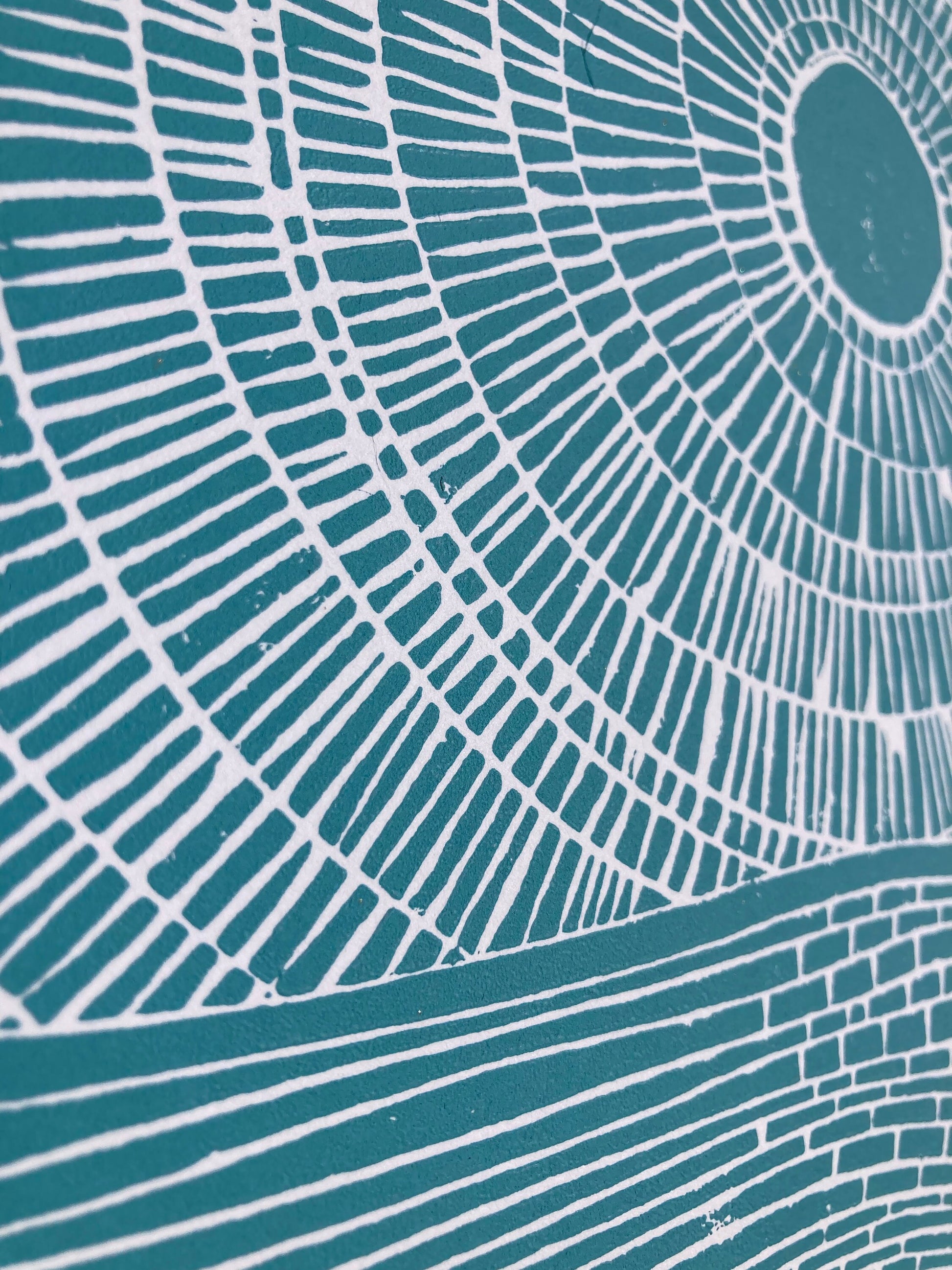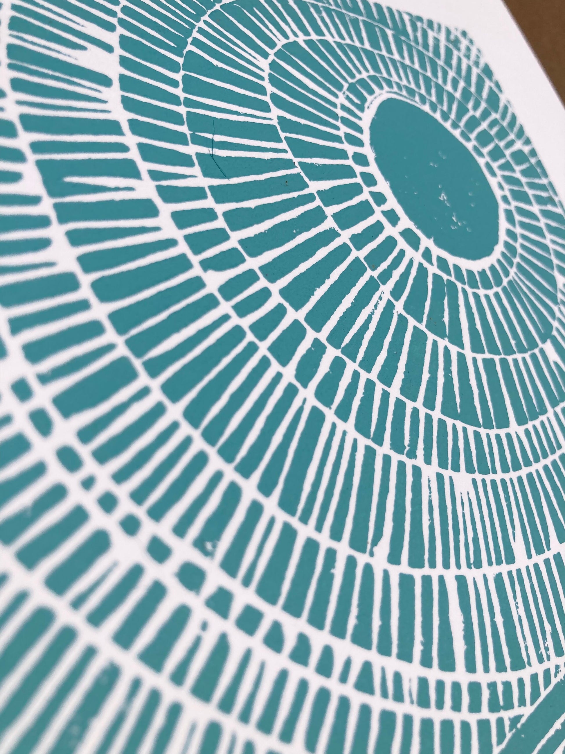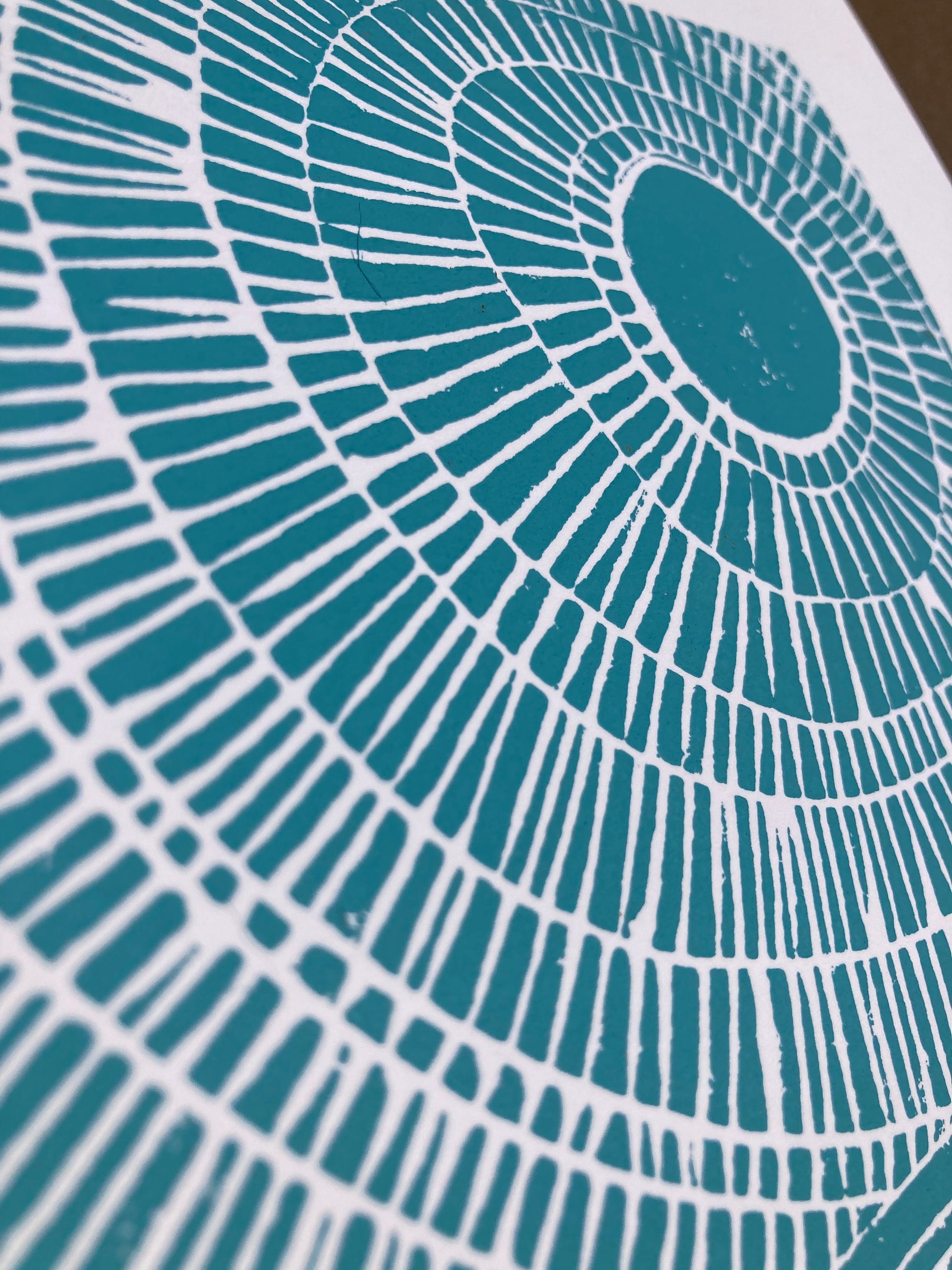 This original, hand-pulled linocut print of the ocean was pressed in light turquoise blue on thick cotton letterpress paper. The linoleum block is cut by hand, inked, then each linoprint is pressed individually. Due to the printmaking process (which is done entirely by hand), there will be variations from print to print. All materials are archival.