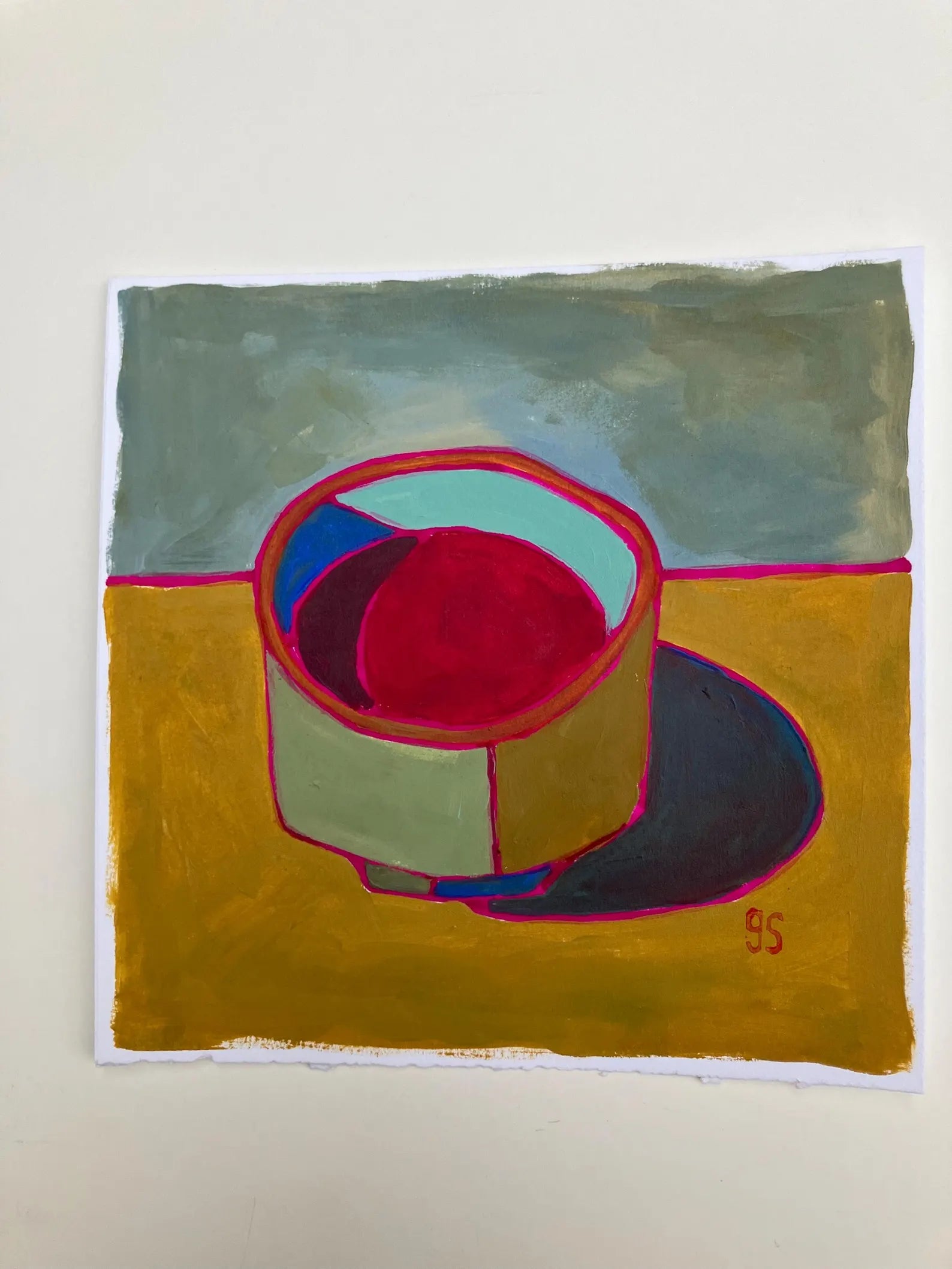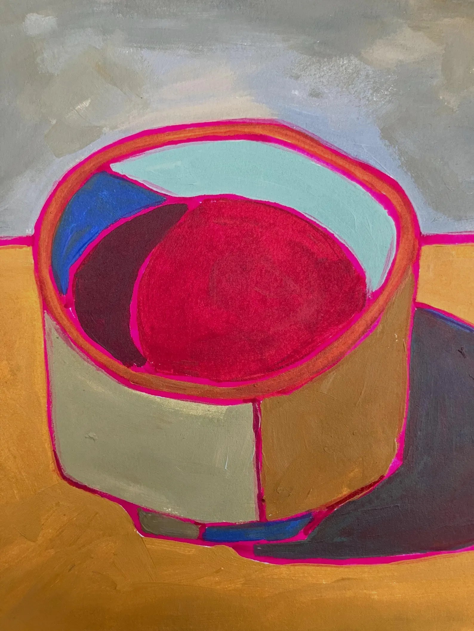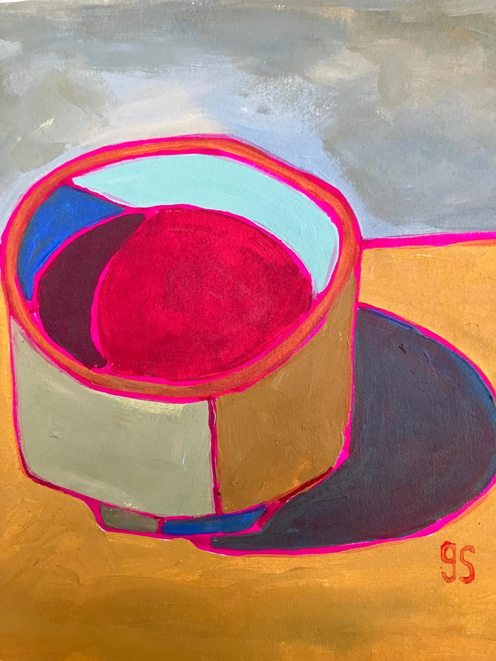 This original 8x8" acrylic painting of a coffee cup was painted in vibrant colors with hot pink highlights. This piece features short brushstrokes and bright colors.