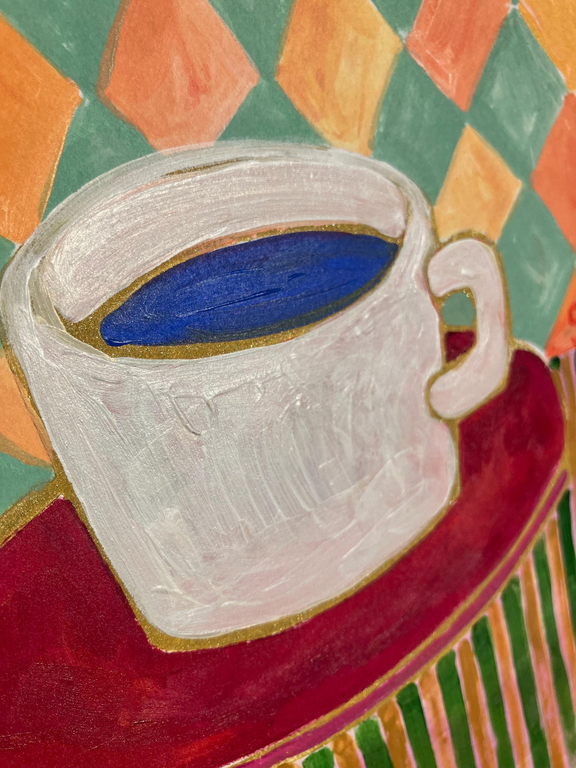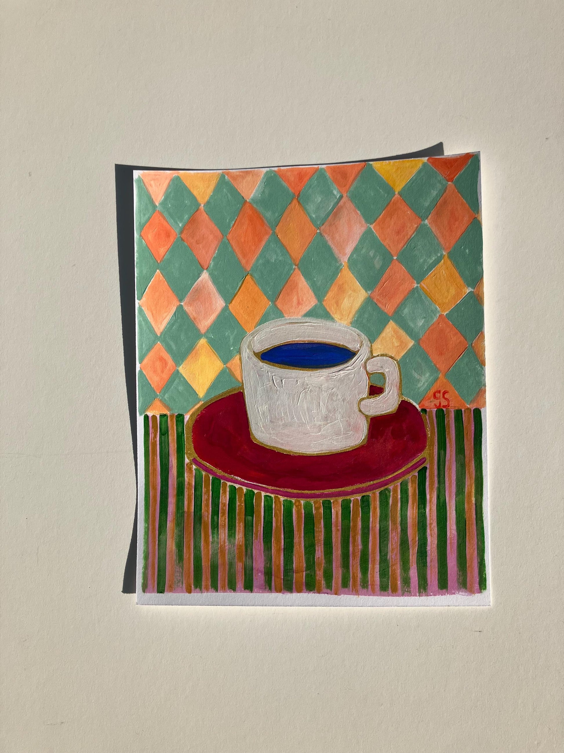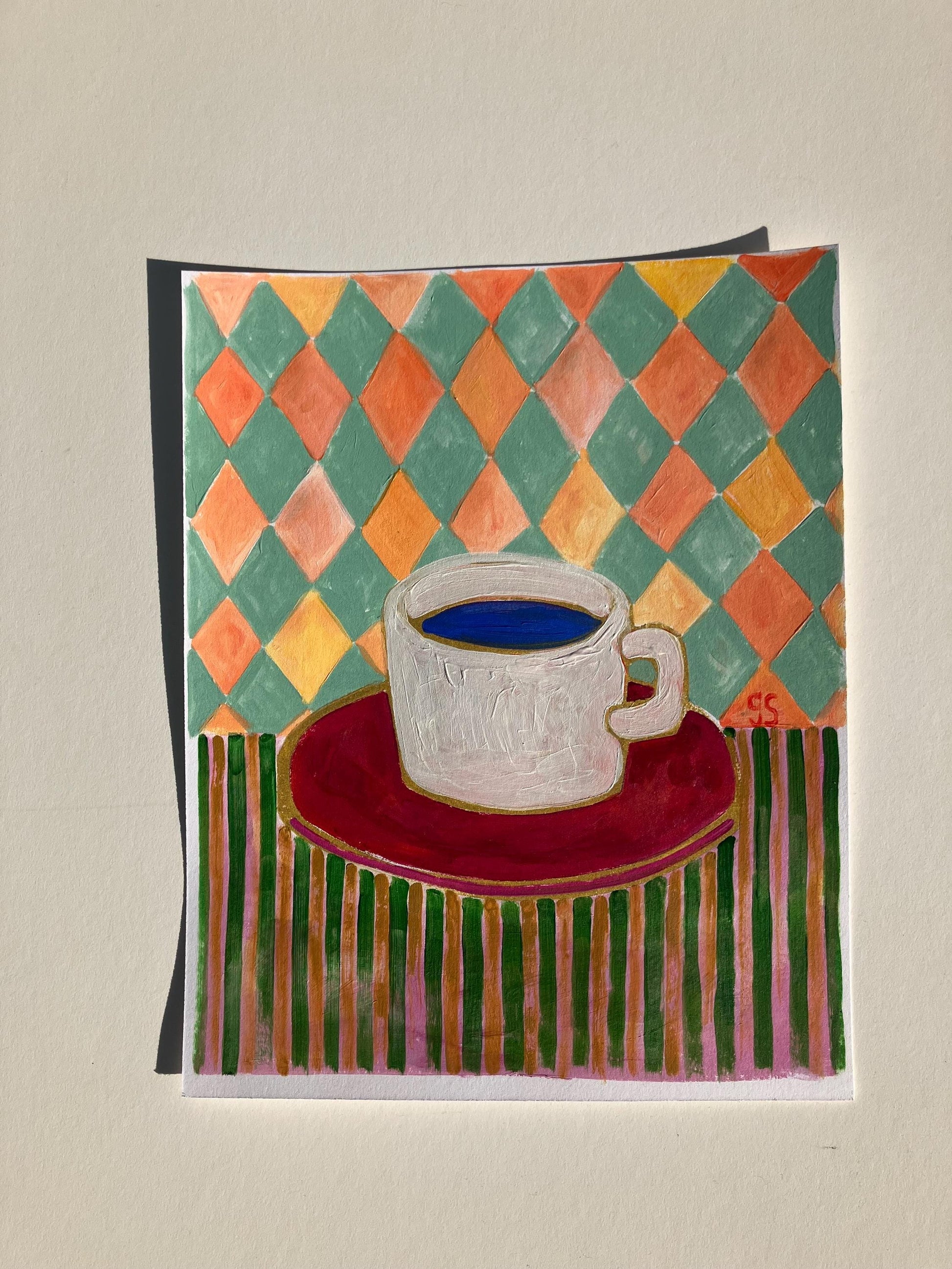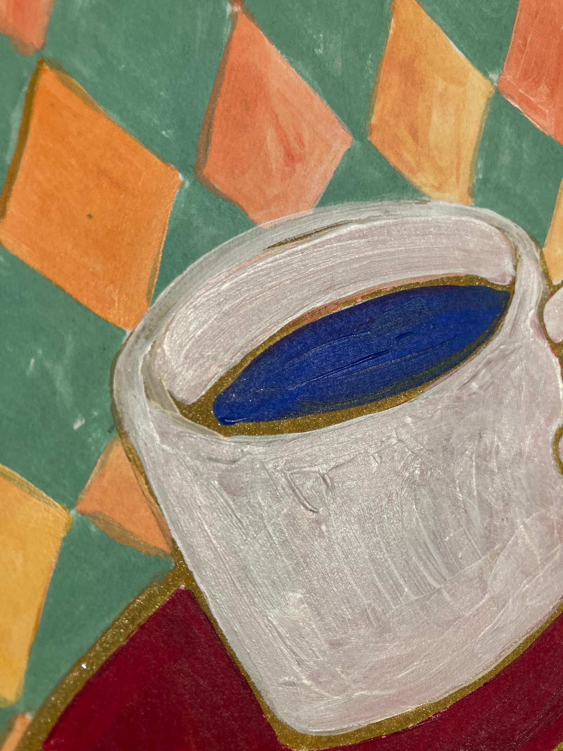 This original 8x10" acrylic painting of a coffee cup was painted in various muted colors on thick cotton paper. This original painting is nicely textured. The paper was recycled from a linocut print, giving it a unique texture. This piece is an original, texture abound!