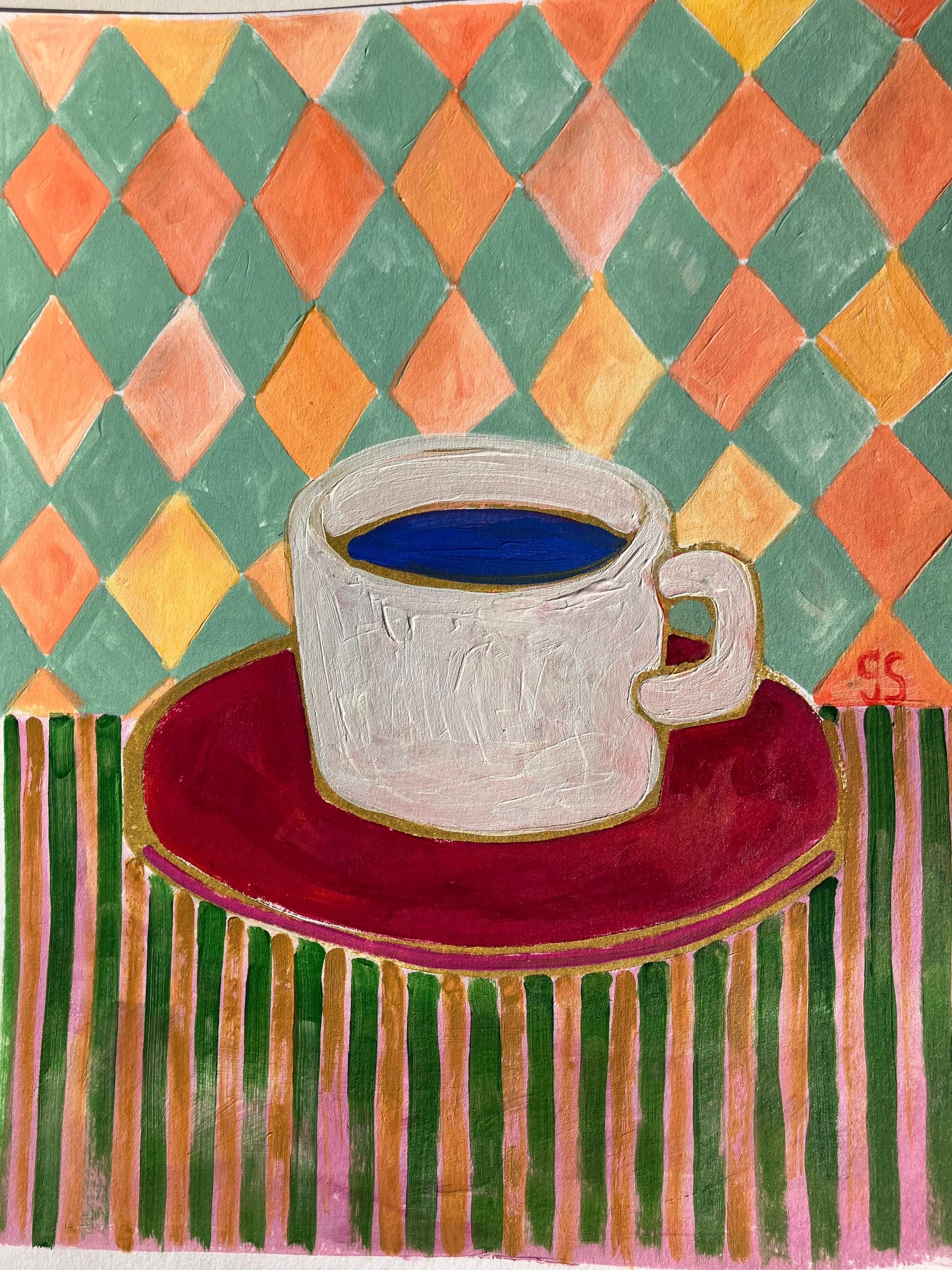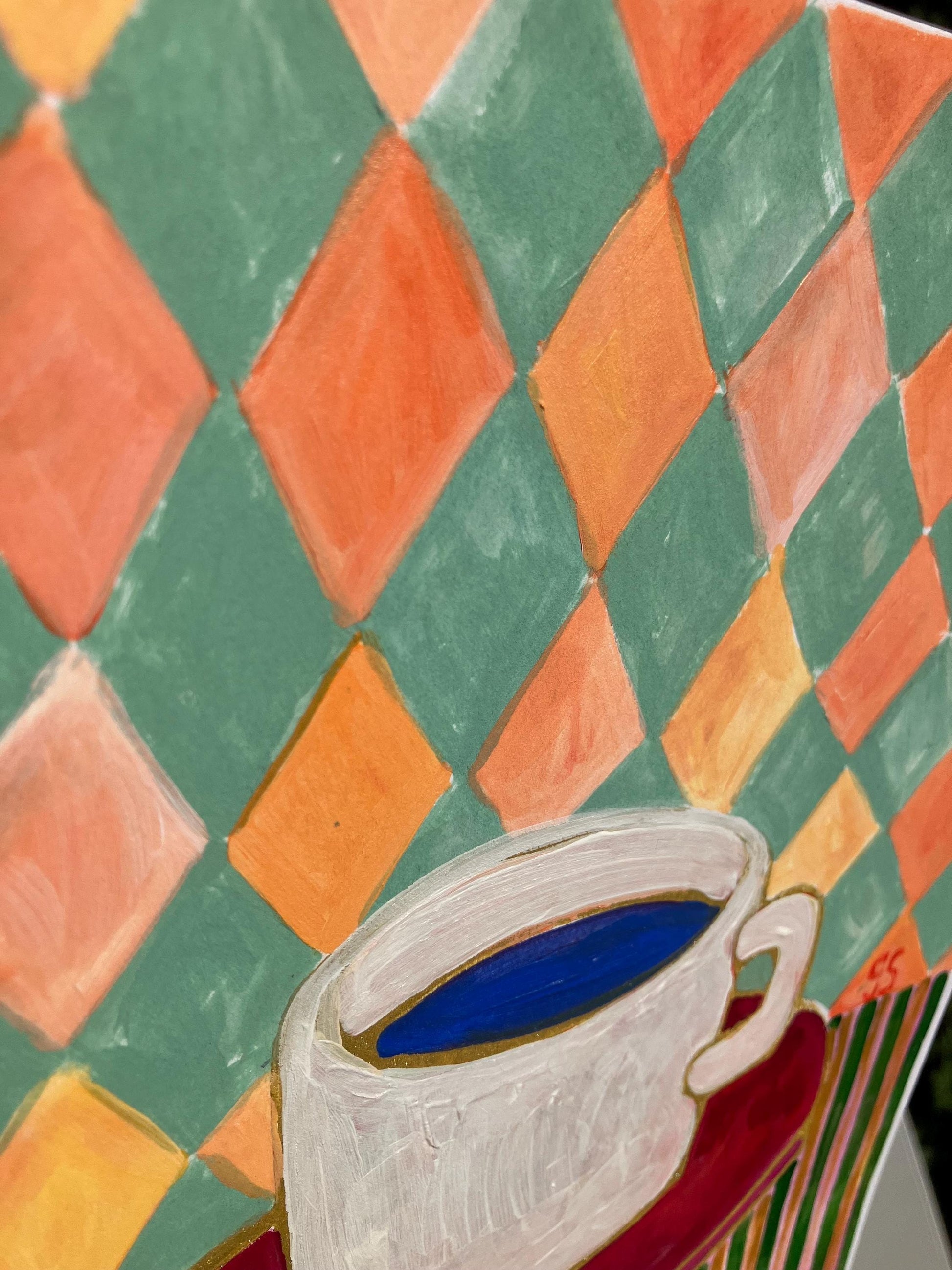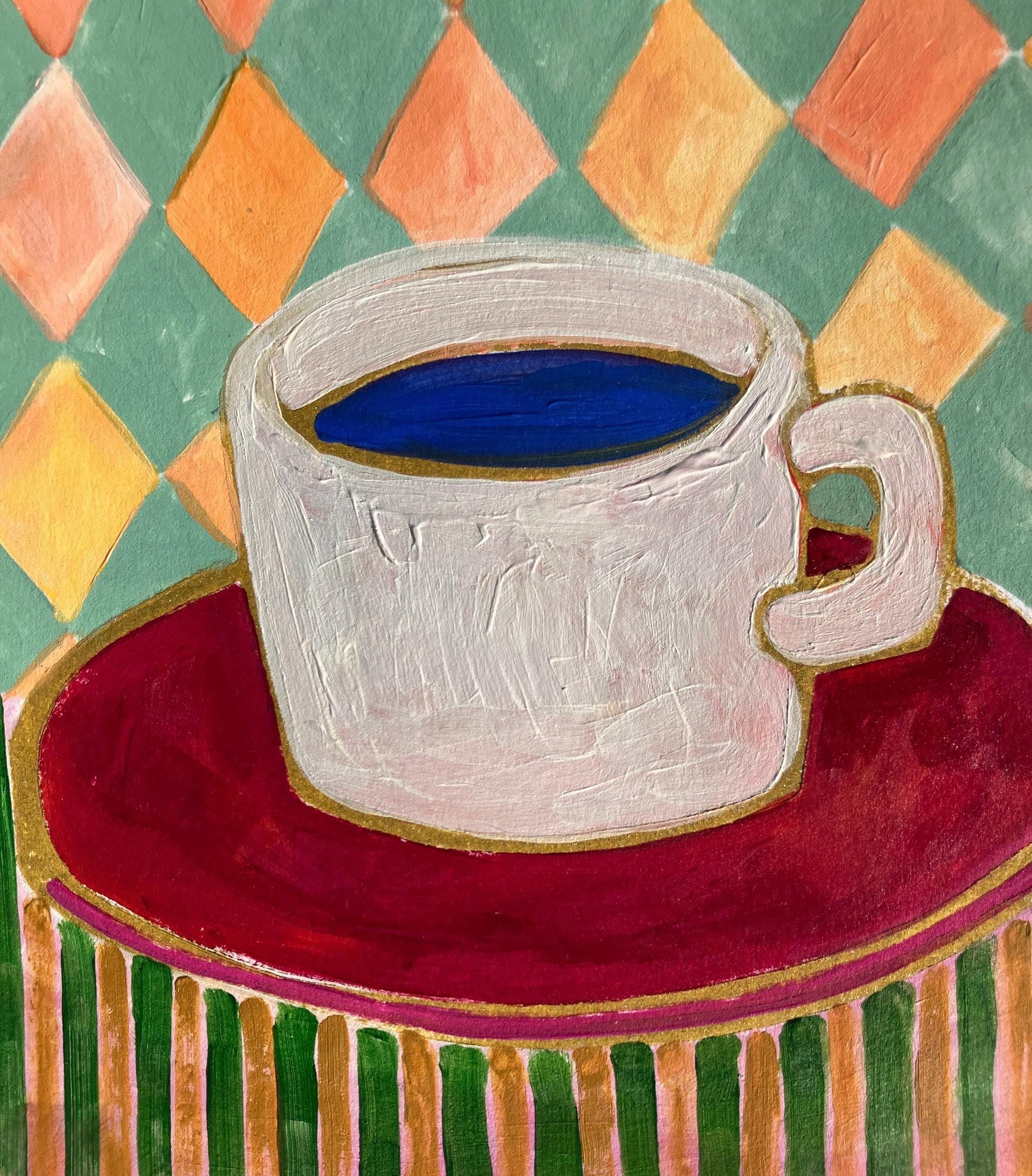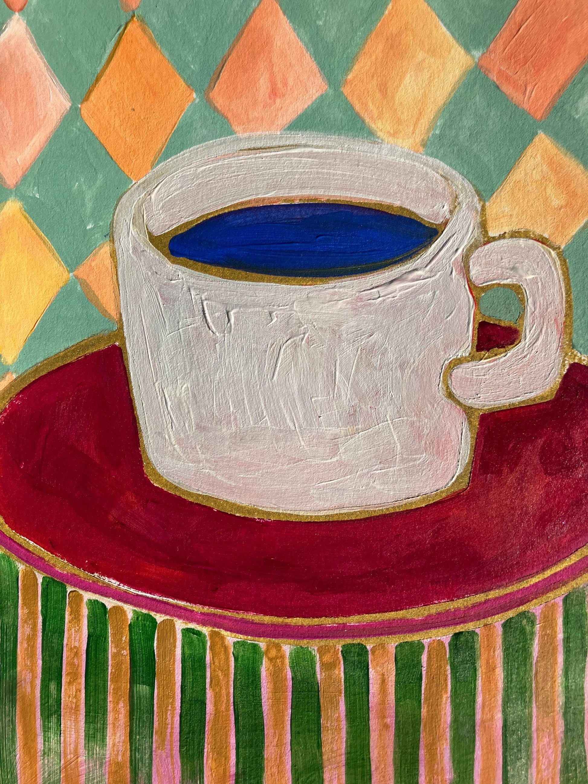 This original 8x10" acrylic painting of a coffee cup was painted in various muted colors on thick cotton paper. This original painting is nicely textured. The paper was recycled from a linocut print, giving it a unique texture. This piece is an original, texture abound!