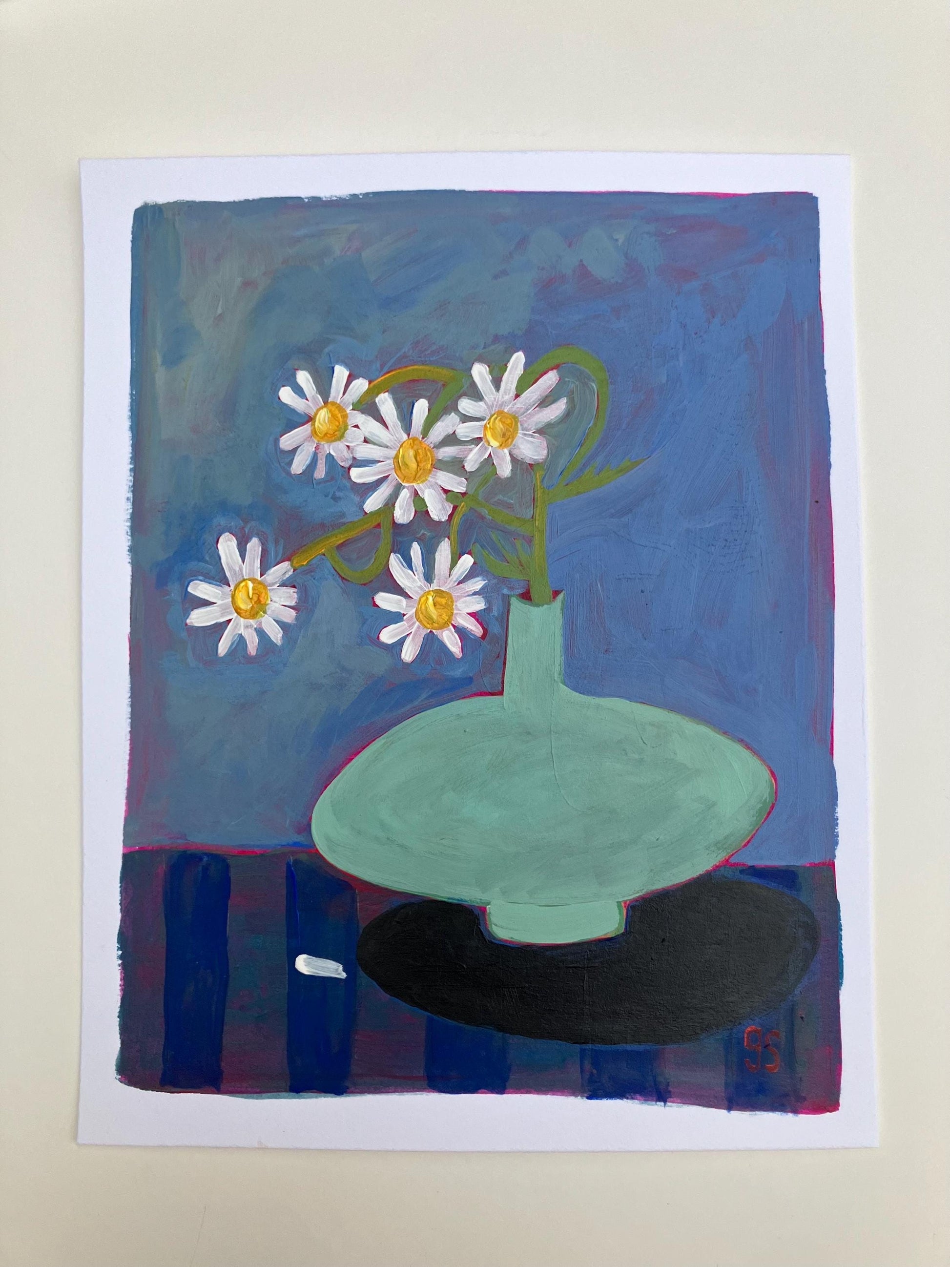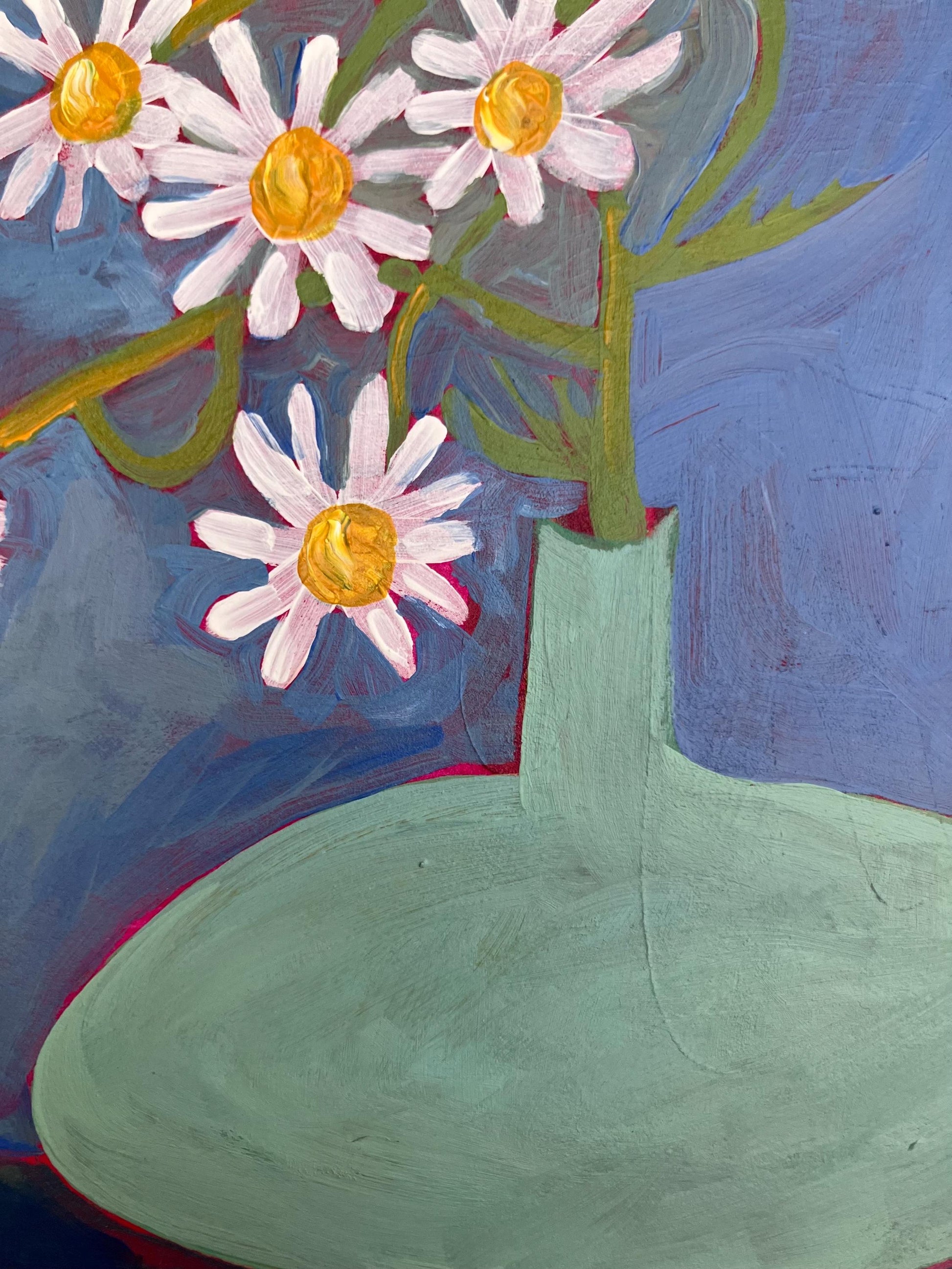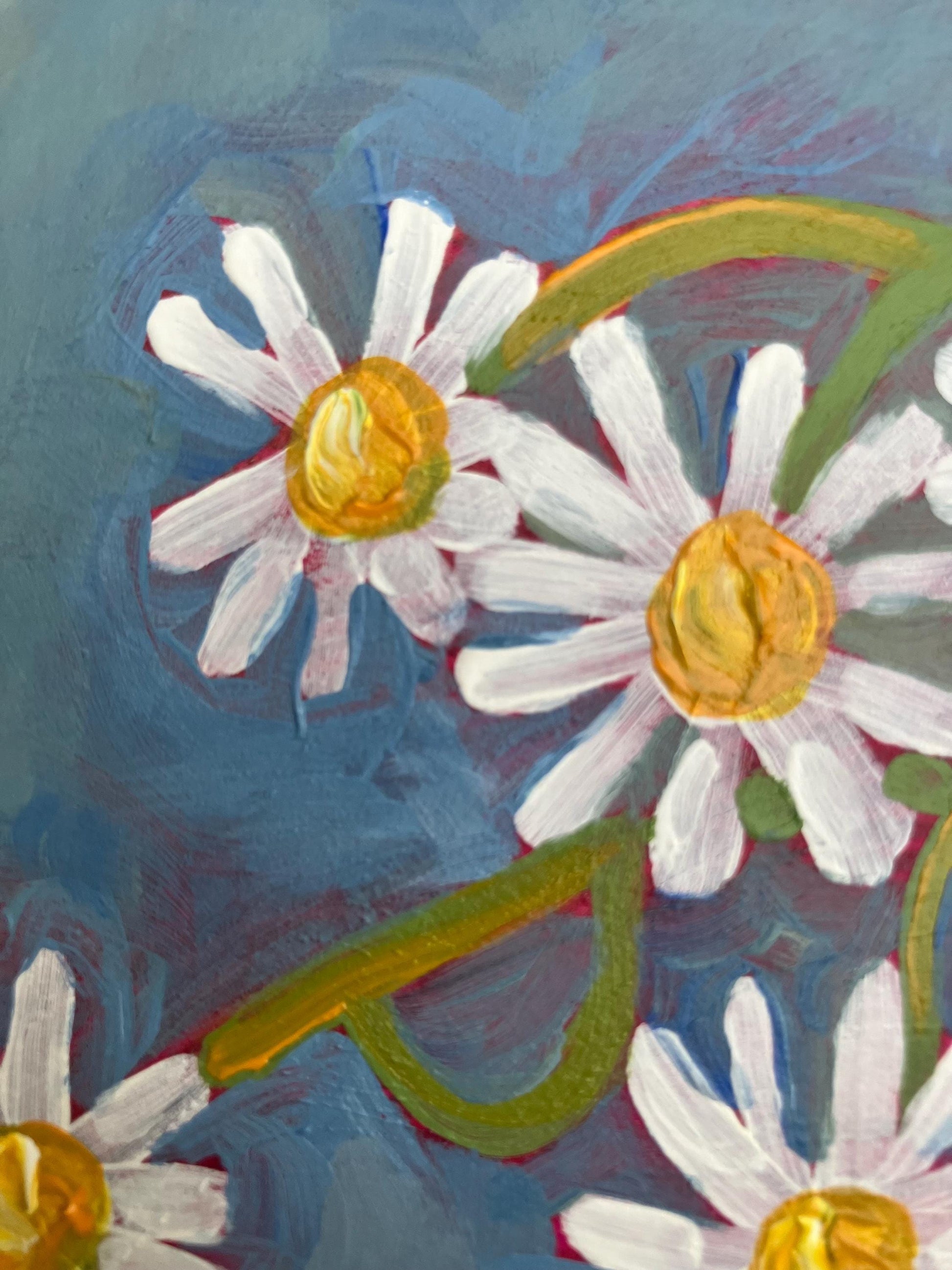 This original 8x10" acrylic painting of daisies was painted in blue-tone colors with hot pink undertones. This piece features short brushstrokes and livelya colors. This original painting is nicely textured. The paper was recycled from a linocut print, giving it a unique texture. This piece is an original, texture abound!