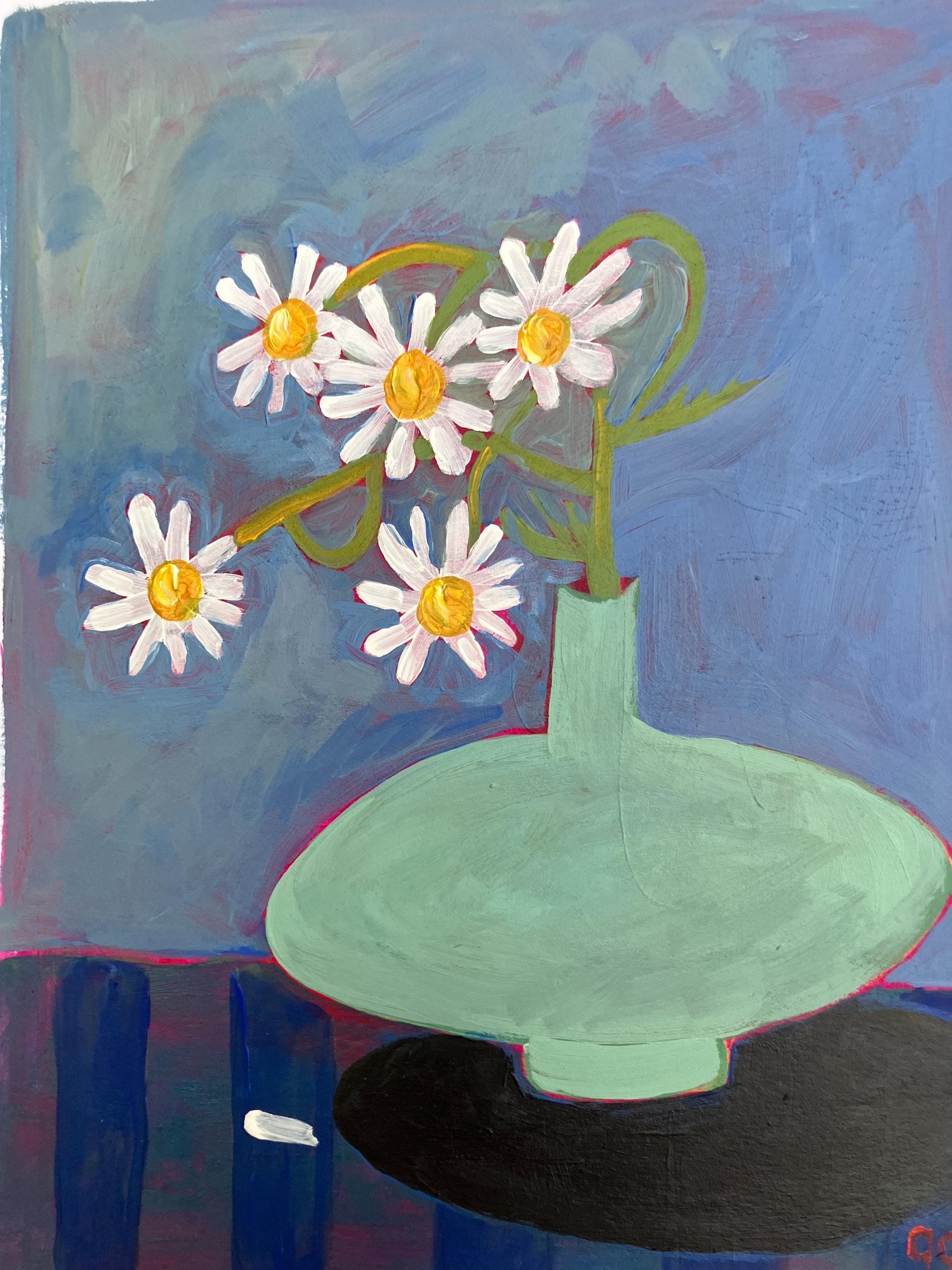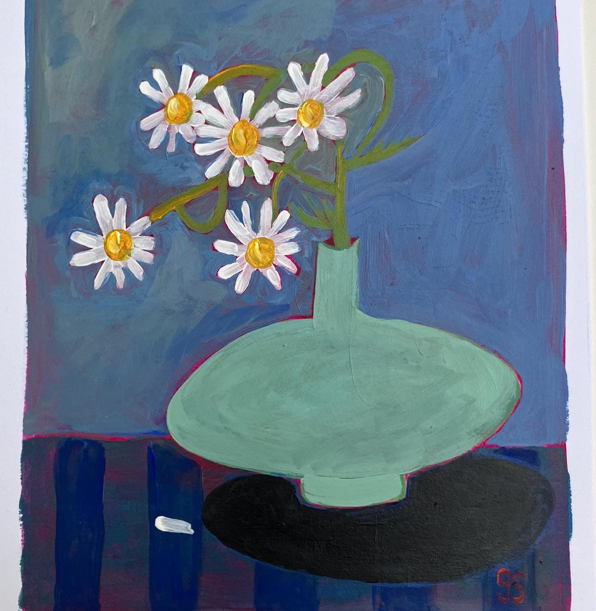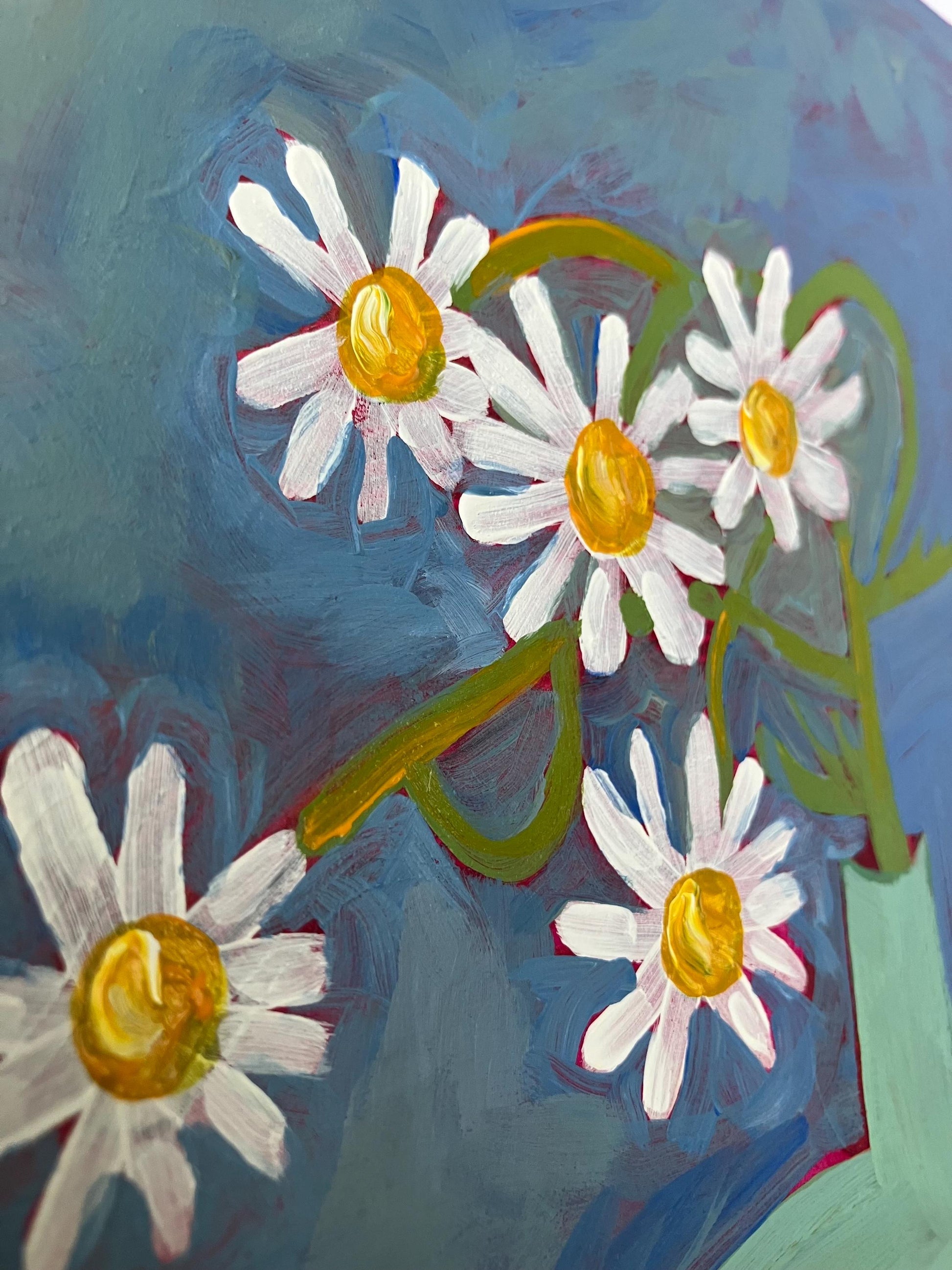 This original 8x10" acrylic painting of daisies was painted in blue-tone colors with hot pink undertones. This piece features short brushstrokes and livelya colors. This original painting is nicely textured. The paper was recycled from a linocut print, giving it a unique texture. This piece is an original, texture abound!