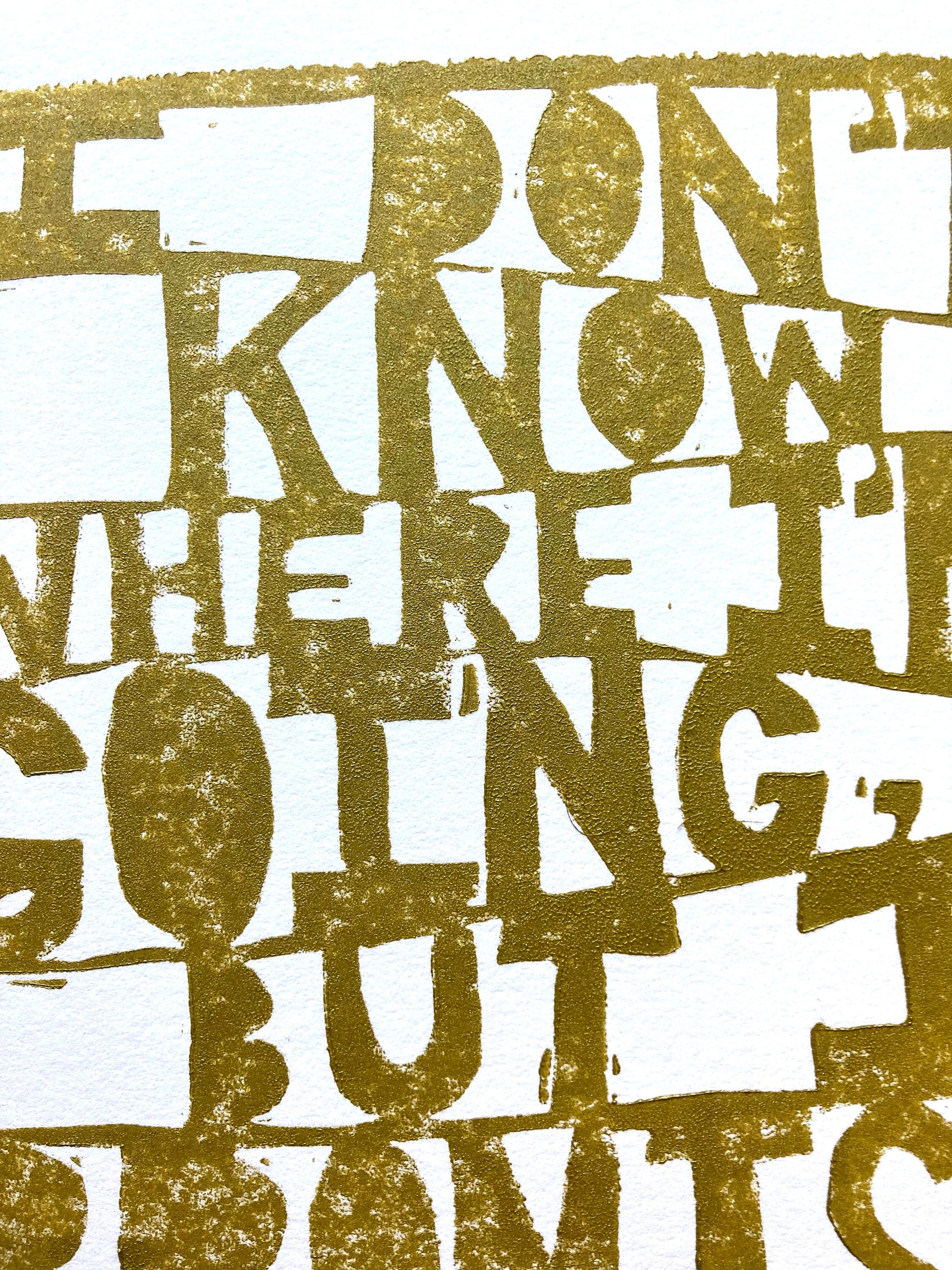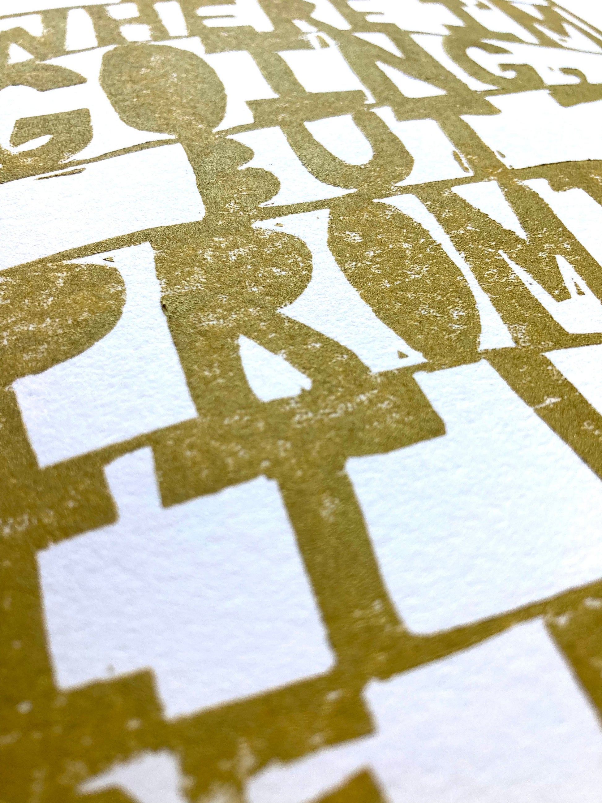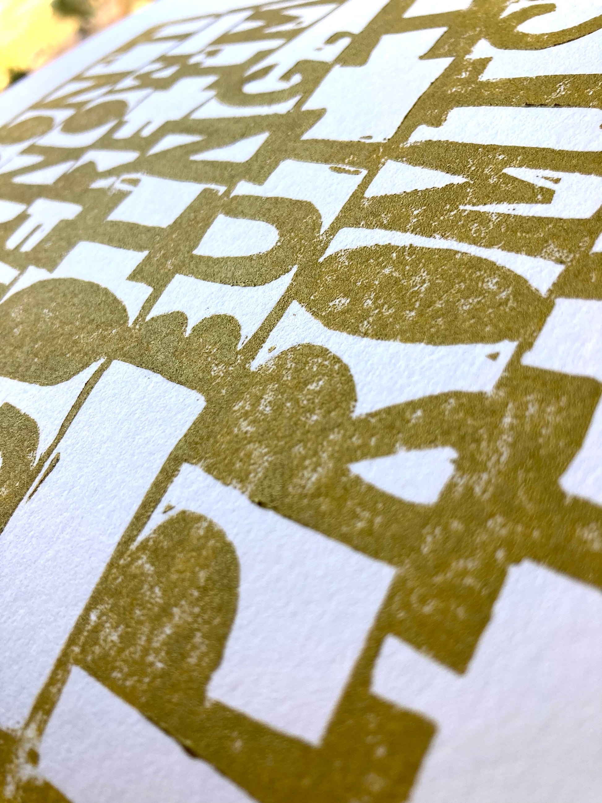This original, hand-pulled print was hand-pressed in shimmery metallic gold on beautifully thick cotton letterpress paper. The linoleum block is cut by hand, inked, then each print is pressed individually. Due to the printing process (which is done entirely by hand), there will be variations from print to print. All materials are permanent and archival.