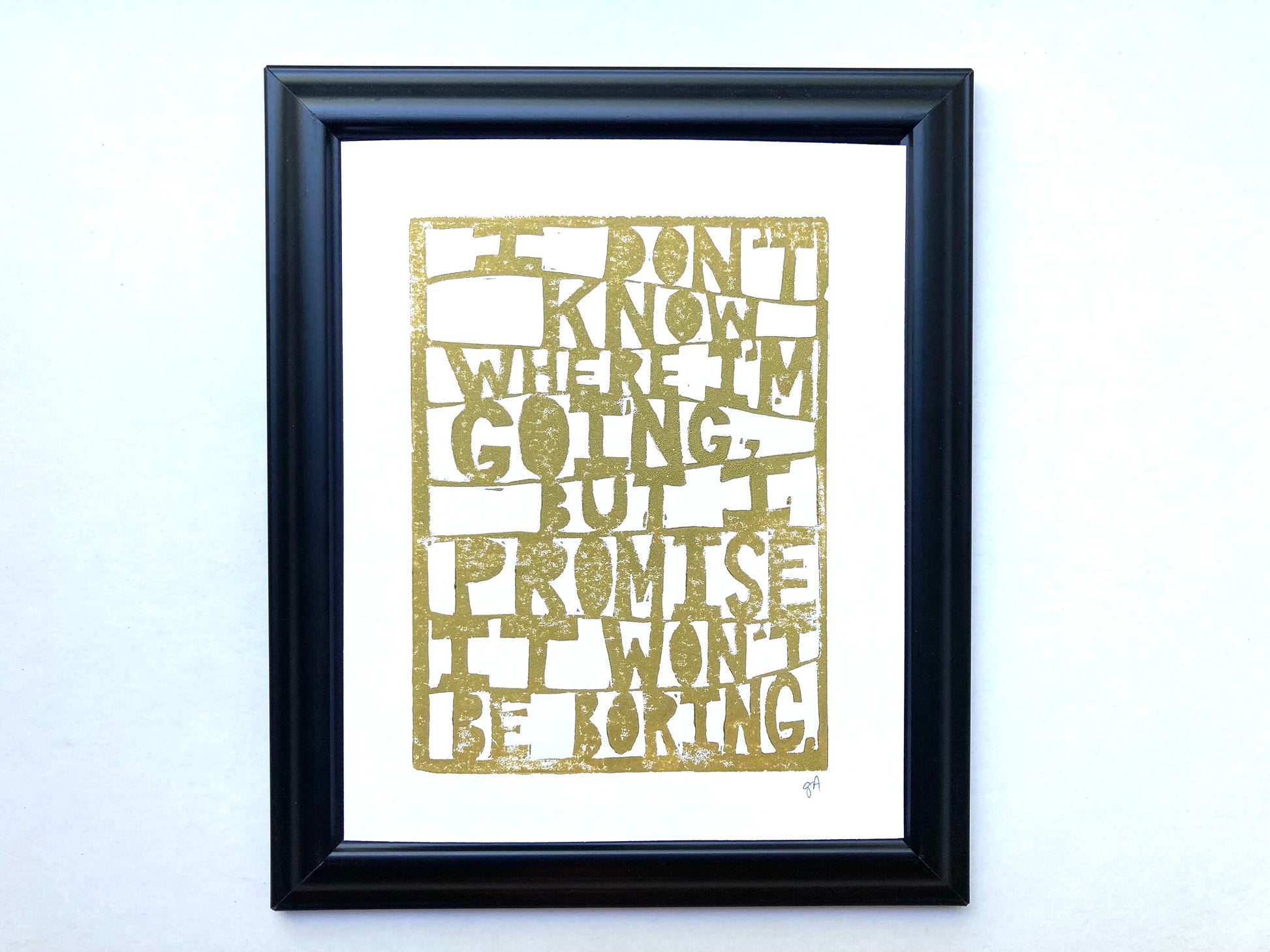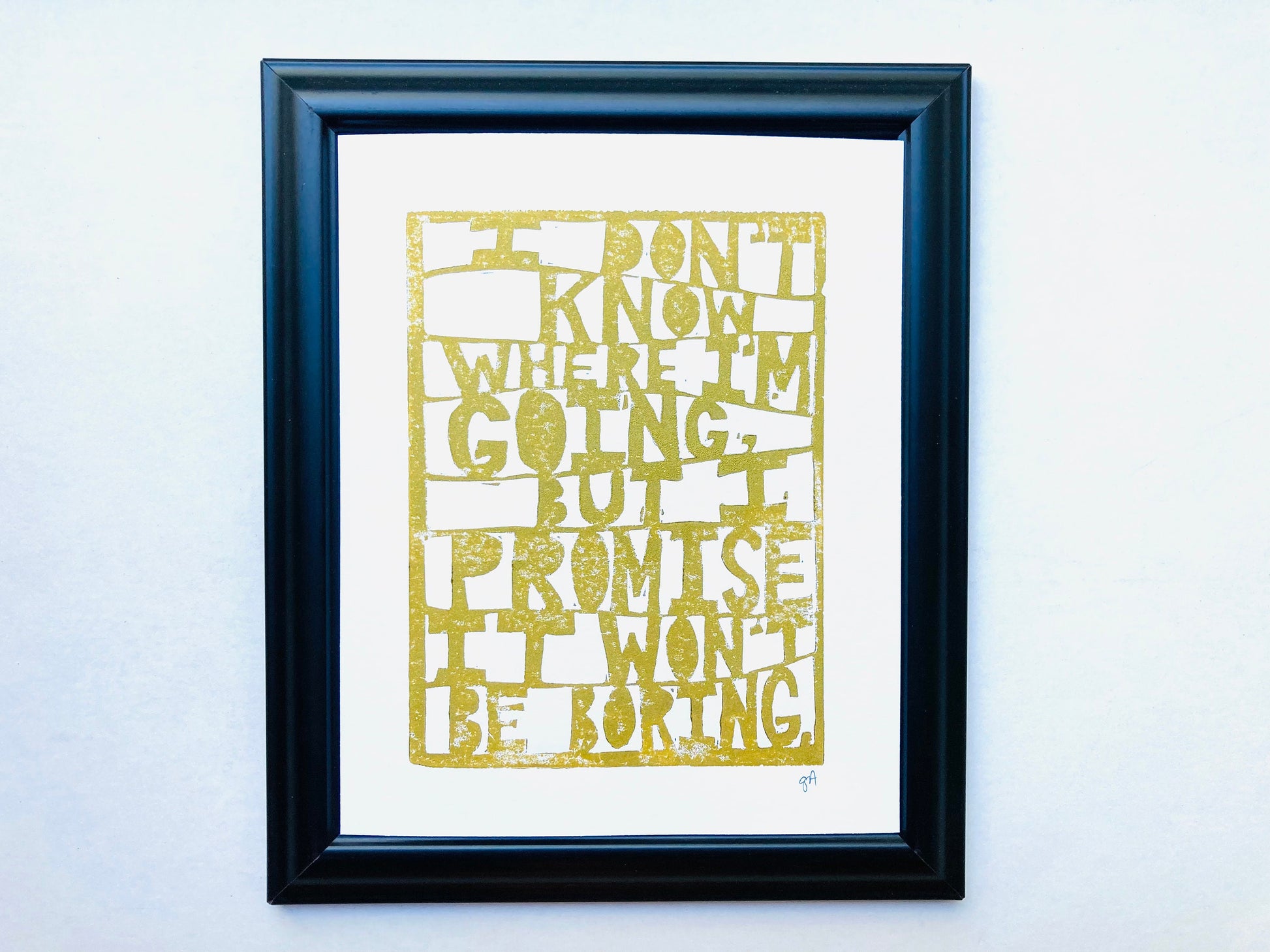 David Bowie Quote - I don't know where I'm going but it won't be boring - Printed in metallic gold on fabulously textured cotton paper.