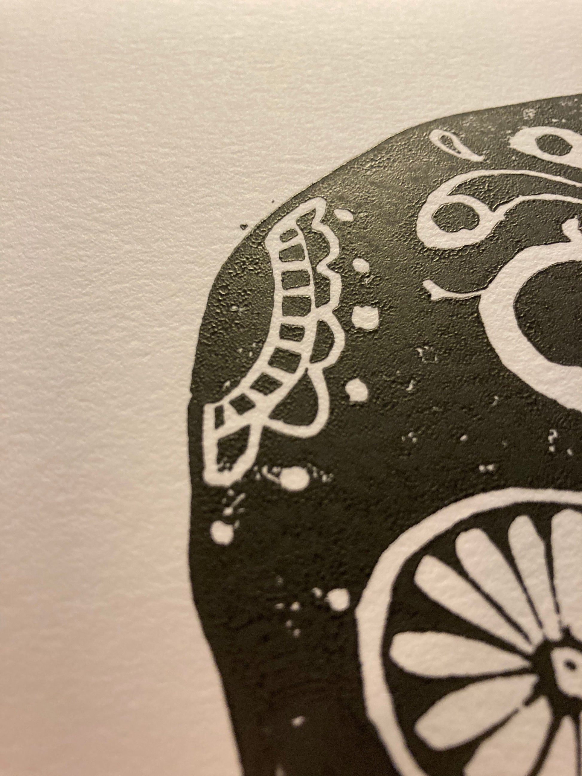 This hand-pulled linocut print of a Day of the Dead Calavera skull was hand-pressed in black on gorgeous cotton paper. The linoleum block is carved by hand, inked, then each linoprint is pressed individually. Due to the printing process, there will be slight variations from print to print. All materials are archival. Wide margins give you room to mat and frame to your liking. This print makes a great gift!