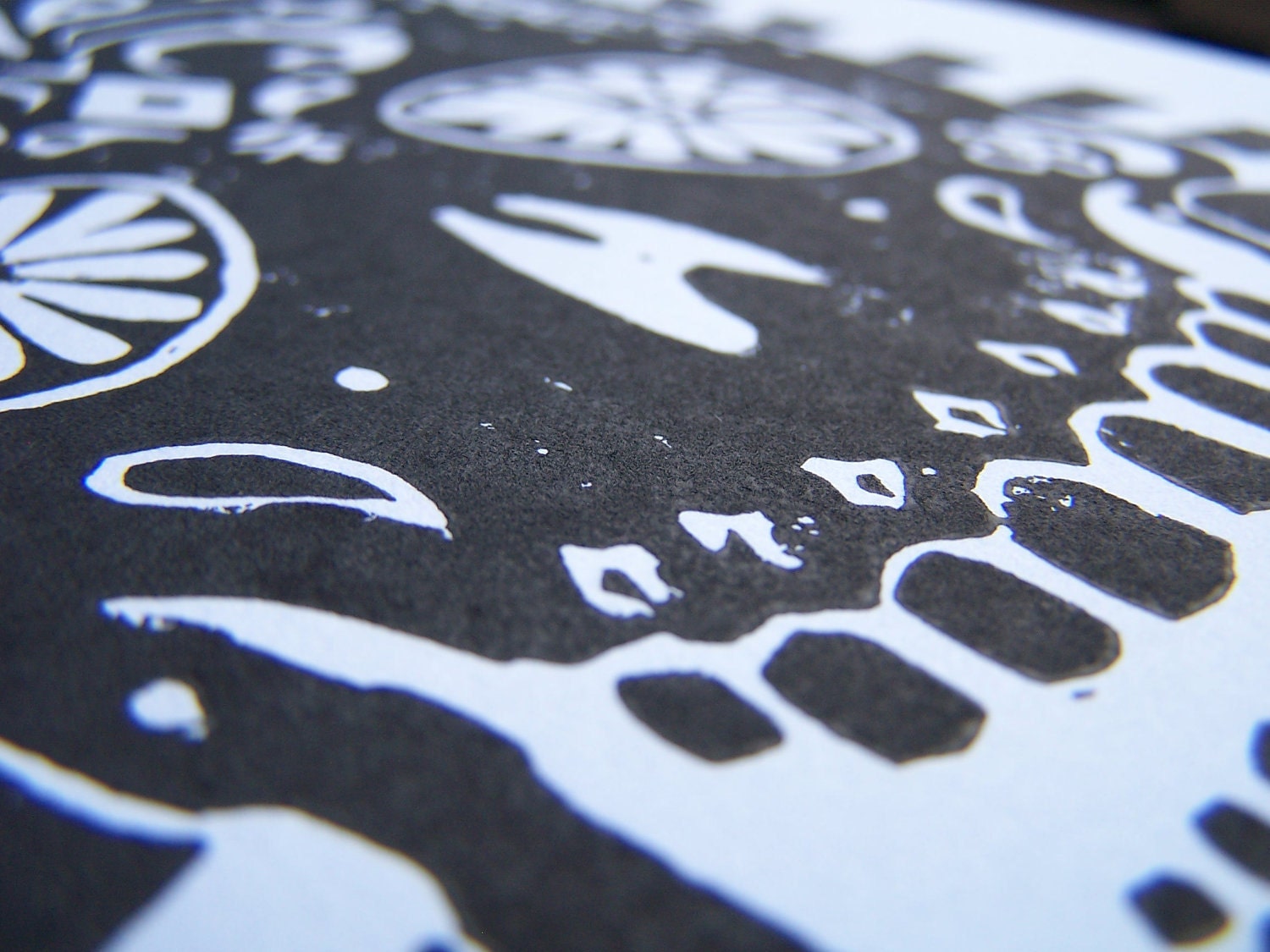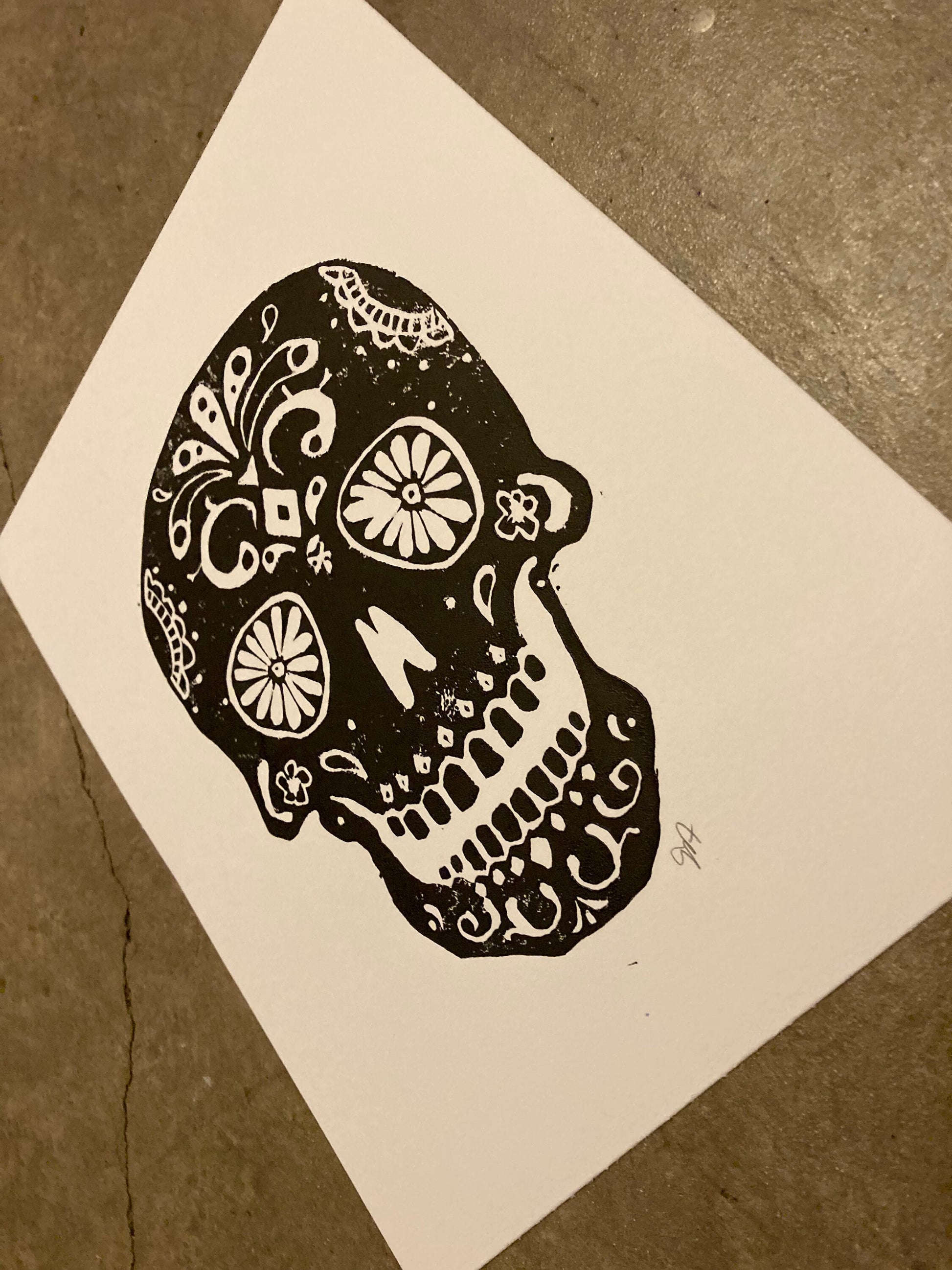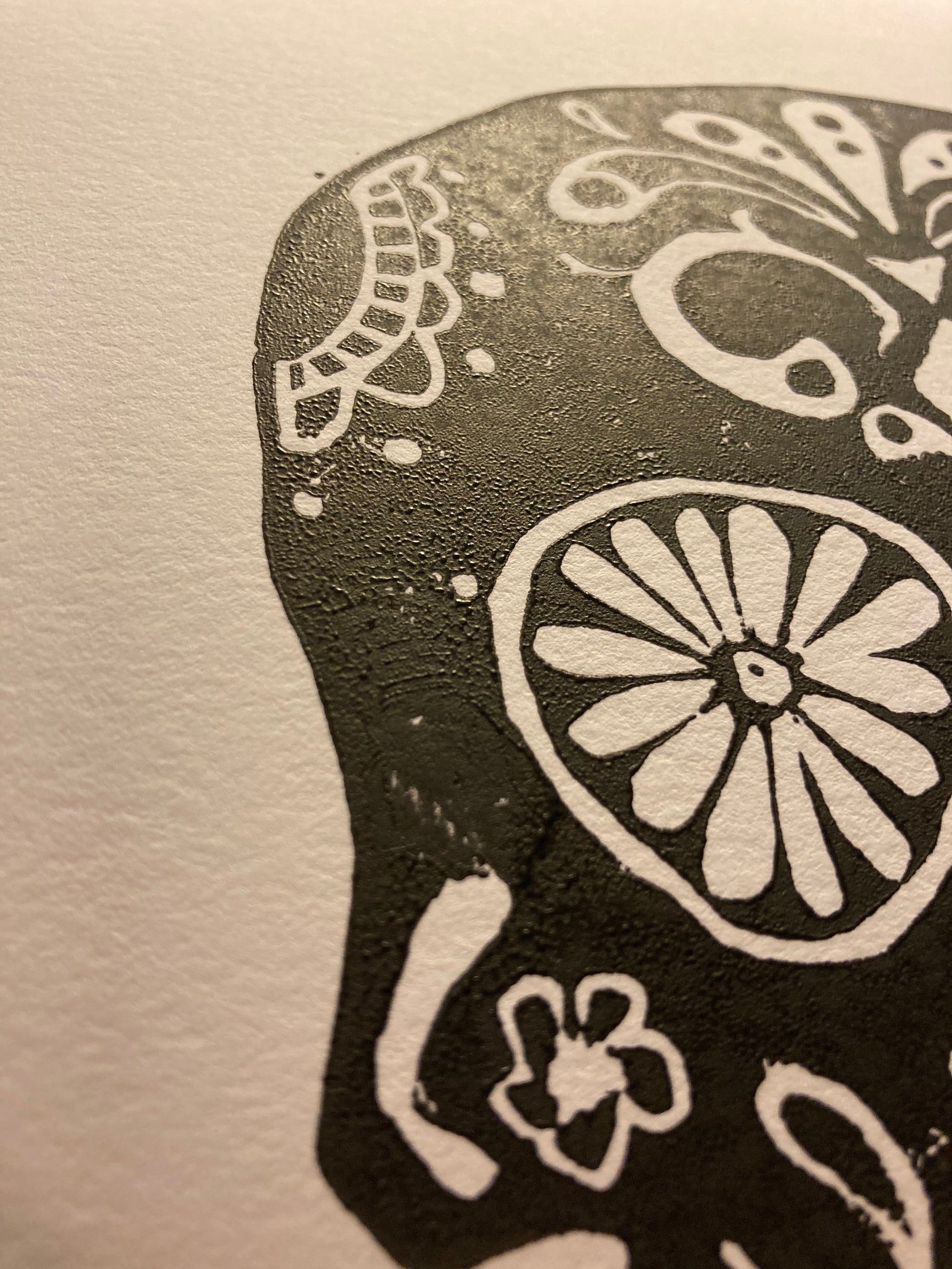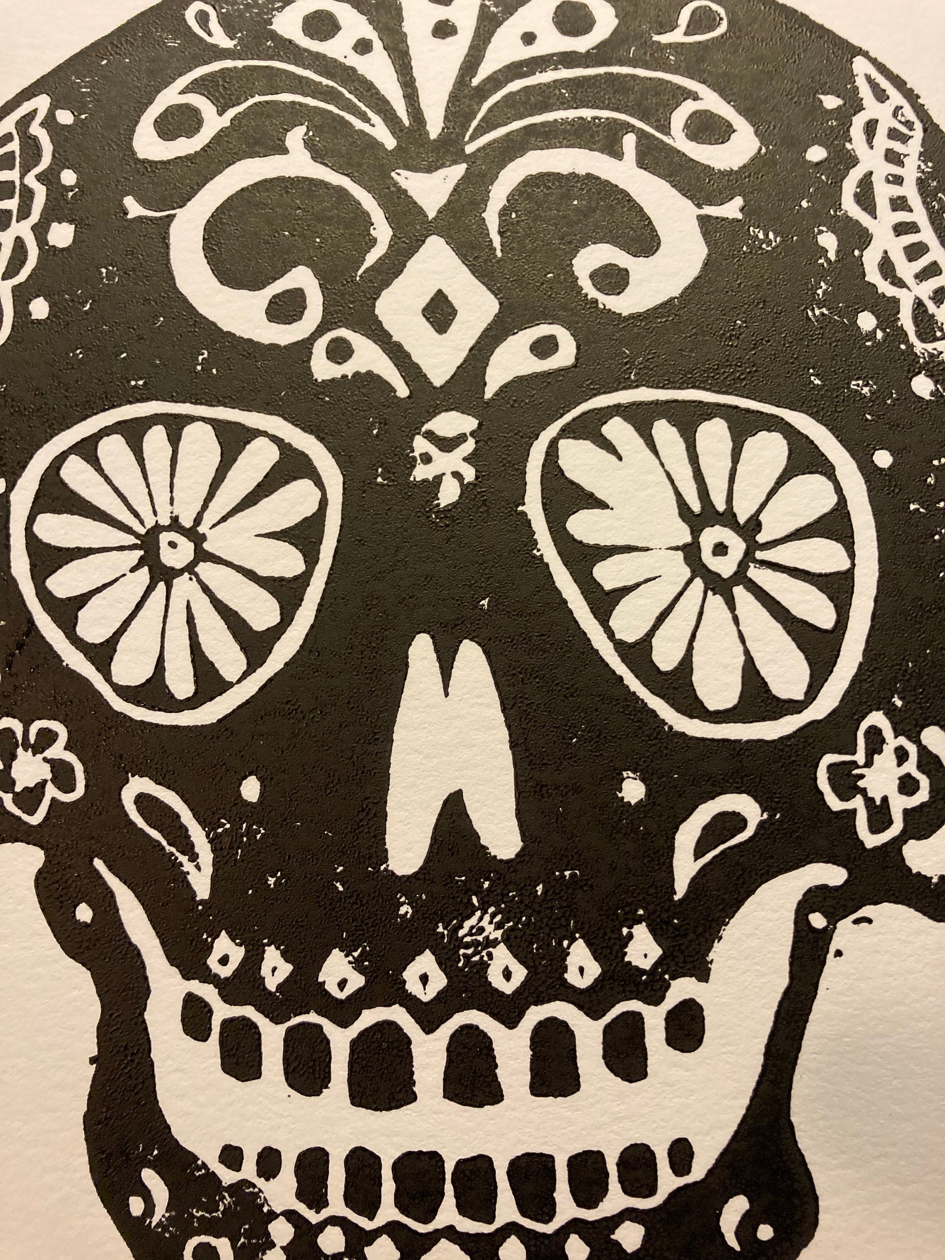 Day of the Dead Calavera Skull linoleum block print, 8x10.