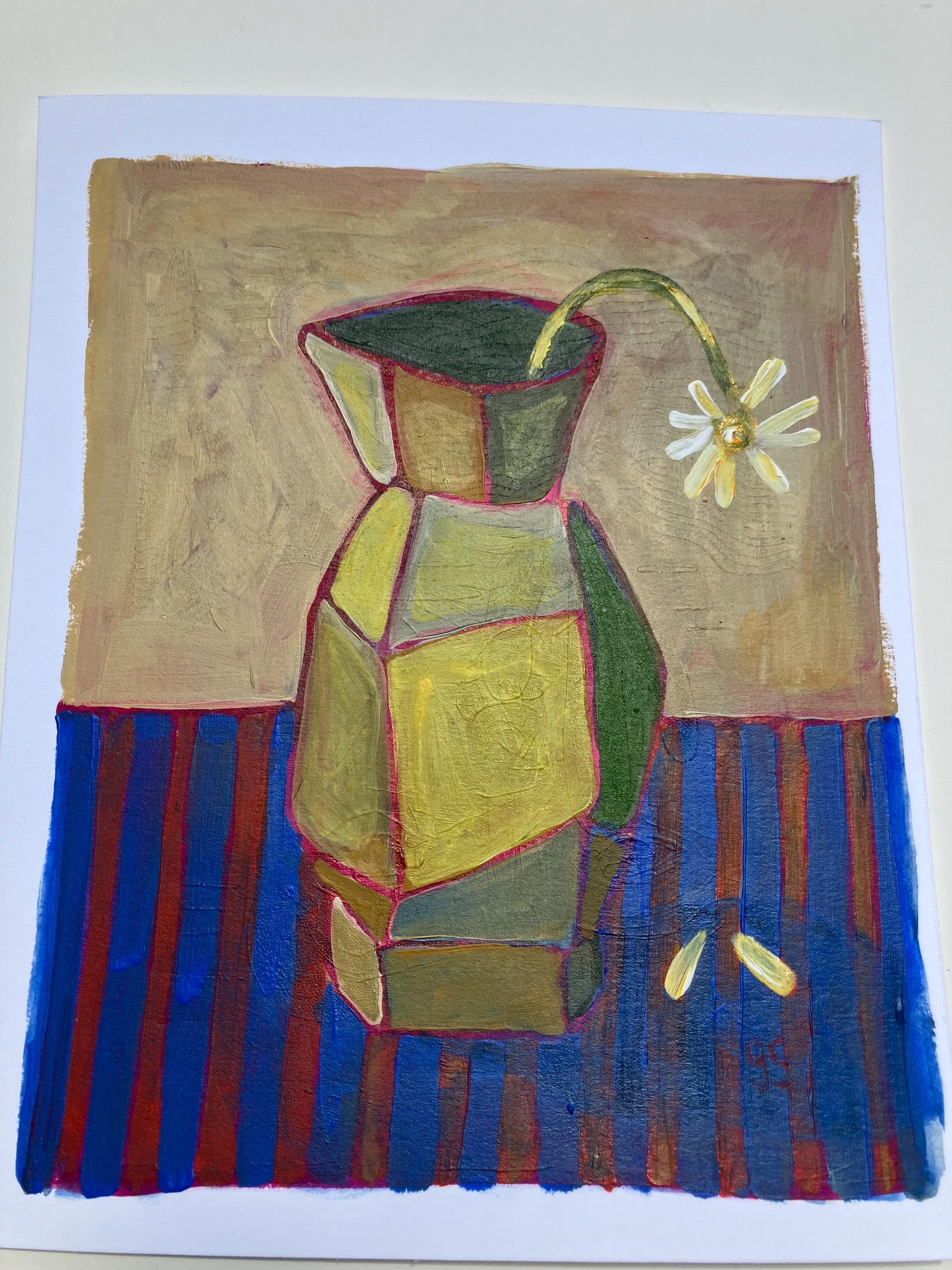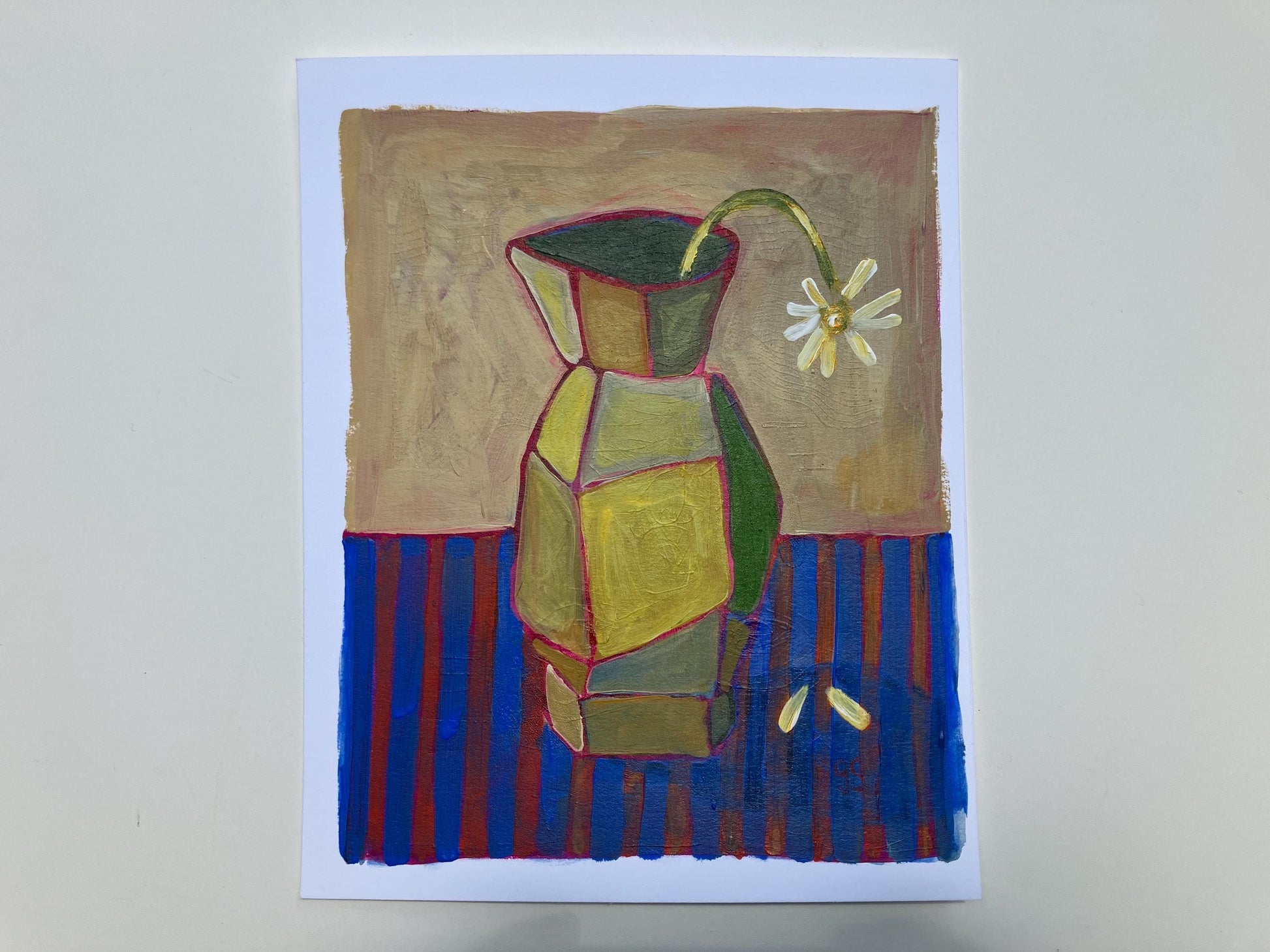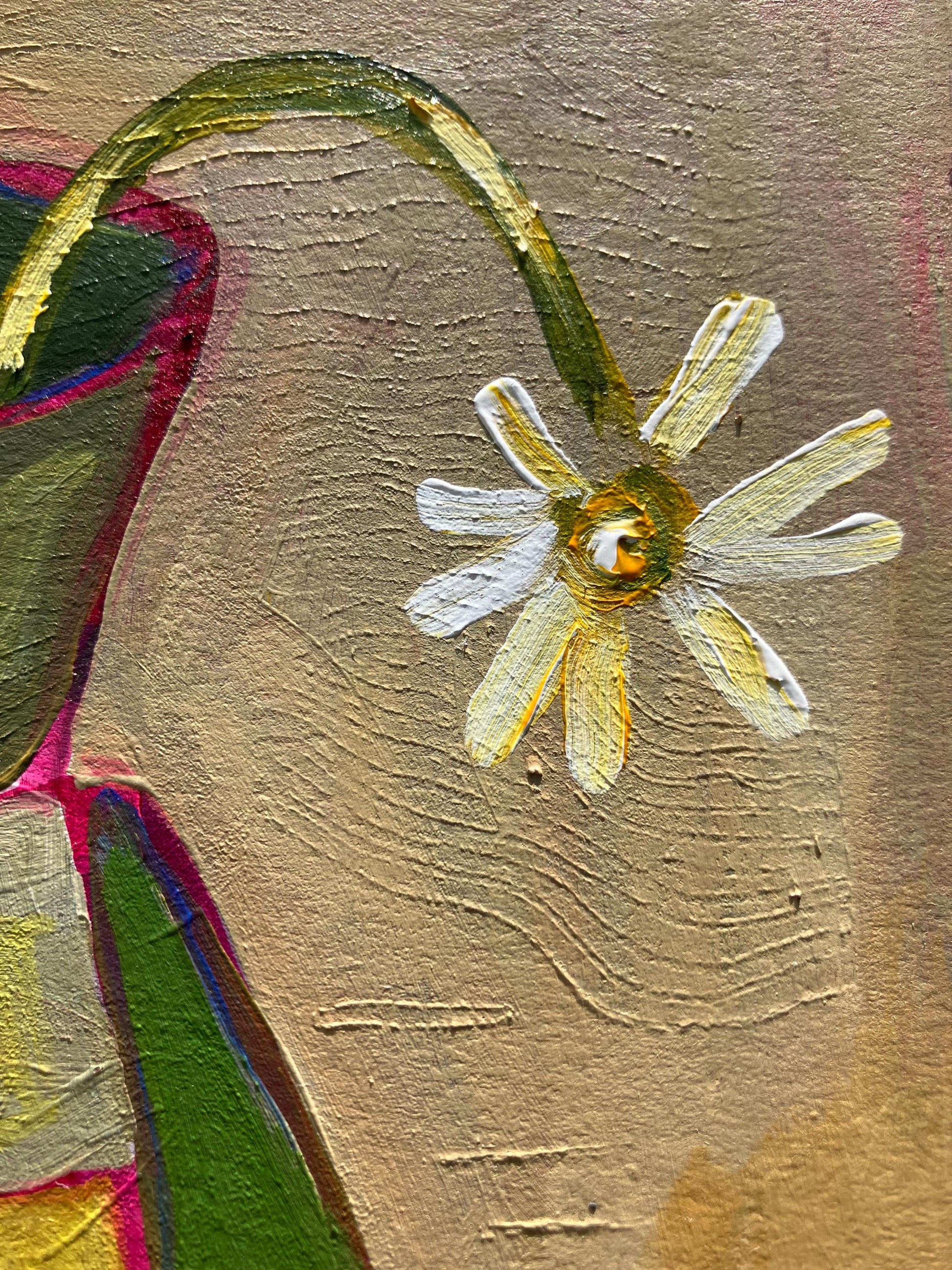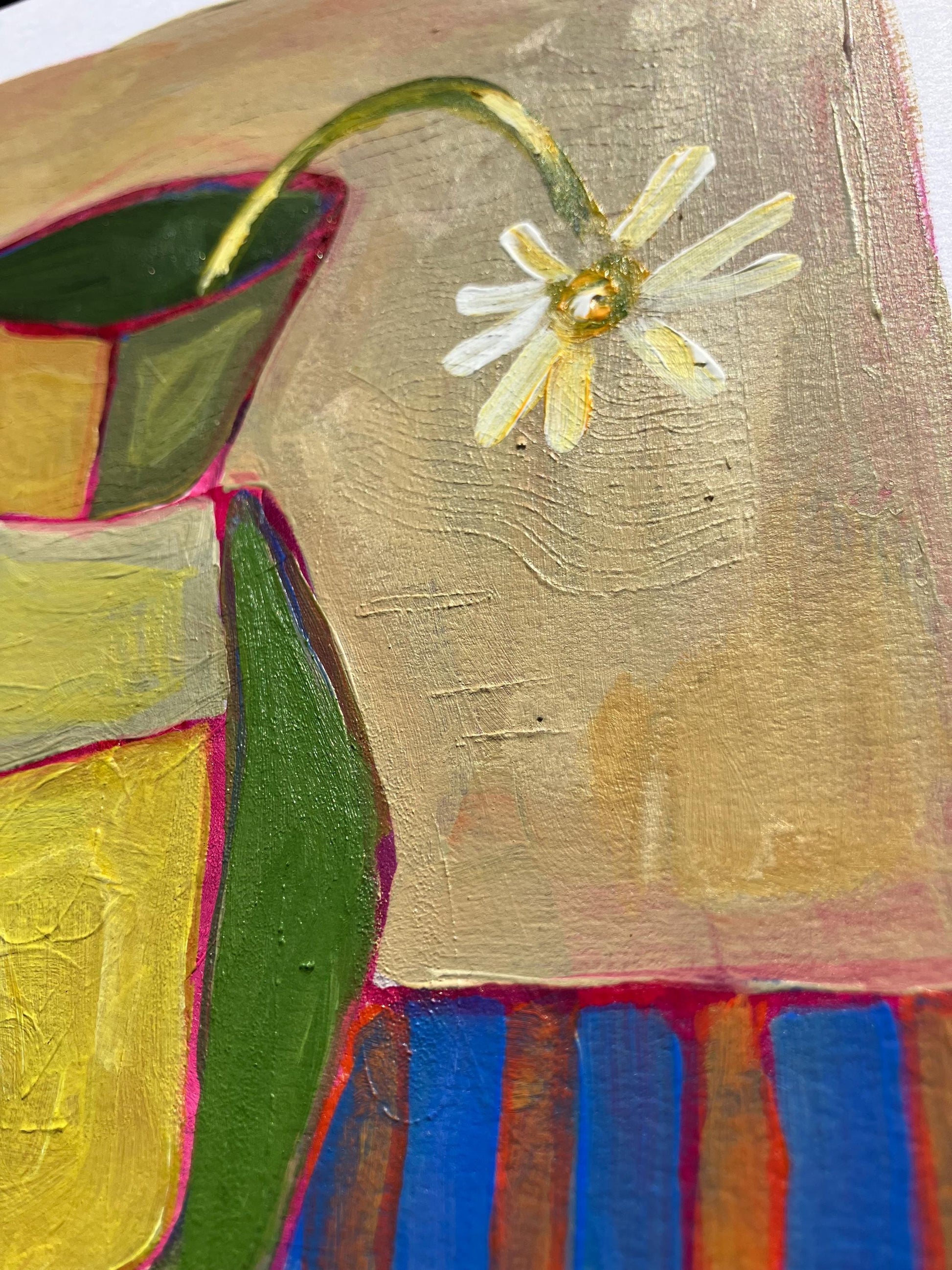 This original 8x10" acrylic painting of sad flower was painted in olive green and blue. This piece features short brushstrokes and neutral colors. It was painted on cotton Lettra paper. This original painting is nicely textured. The paper was recycled from a linocut print, giving it a unique texture. This piece is an original, texture abound! Ready to be framed.
