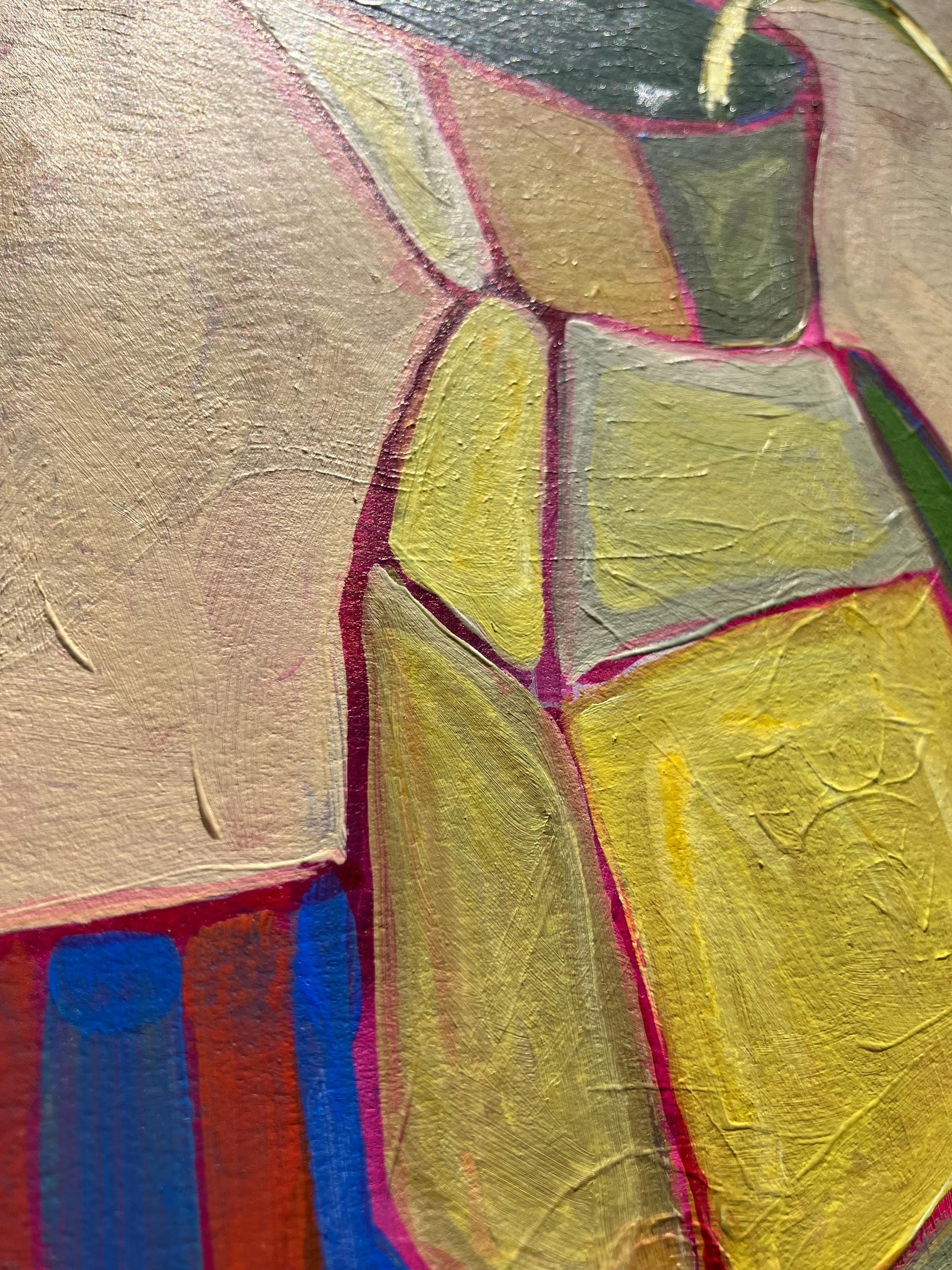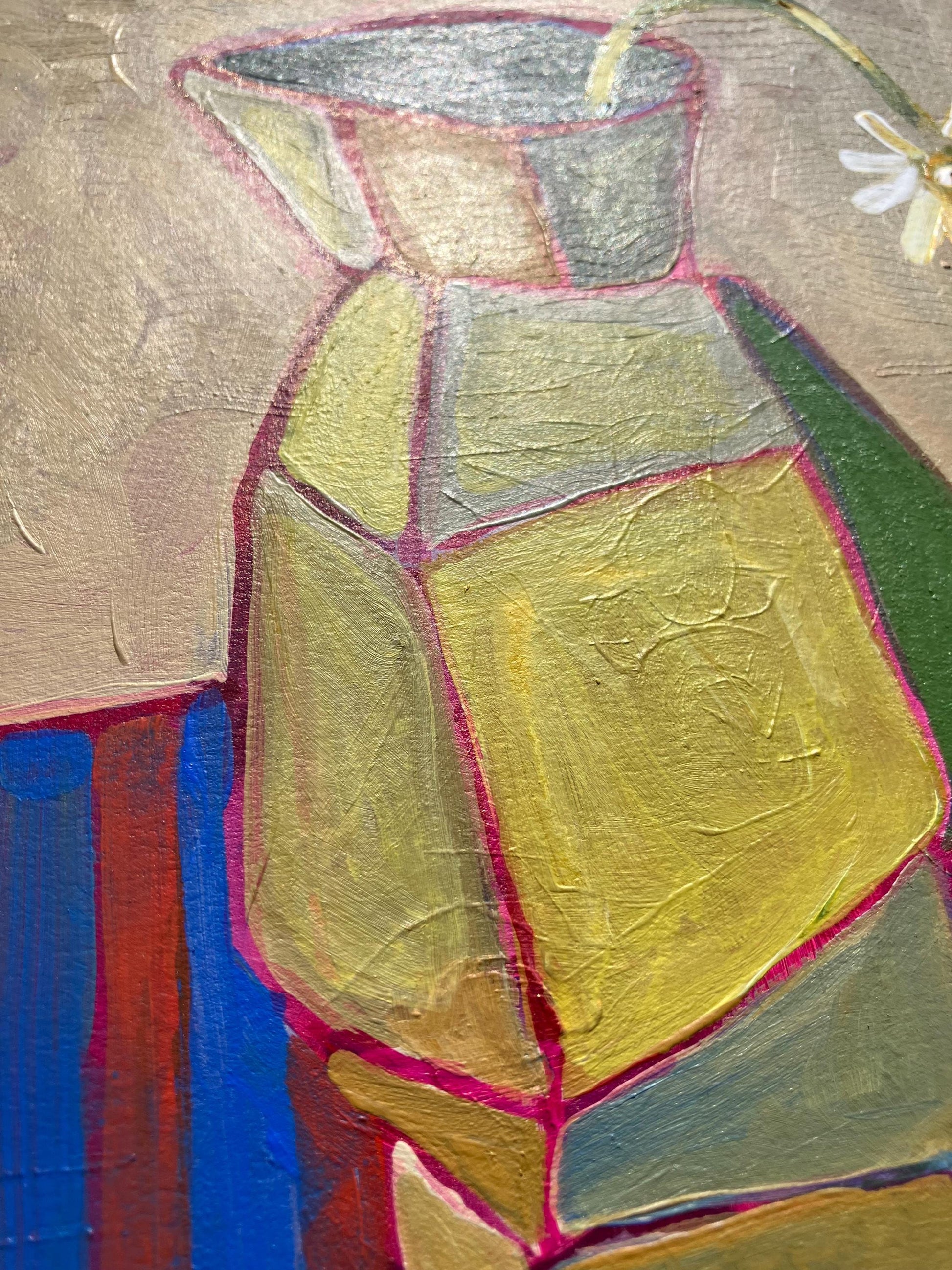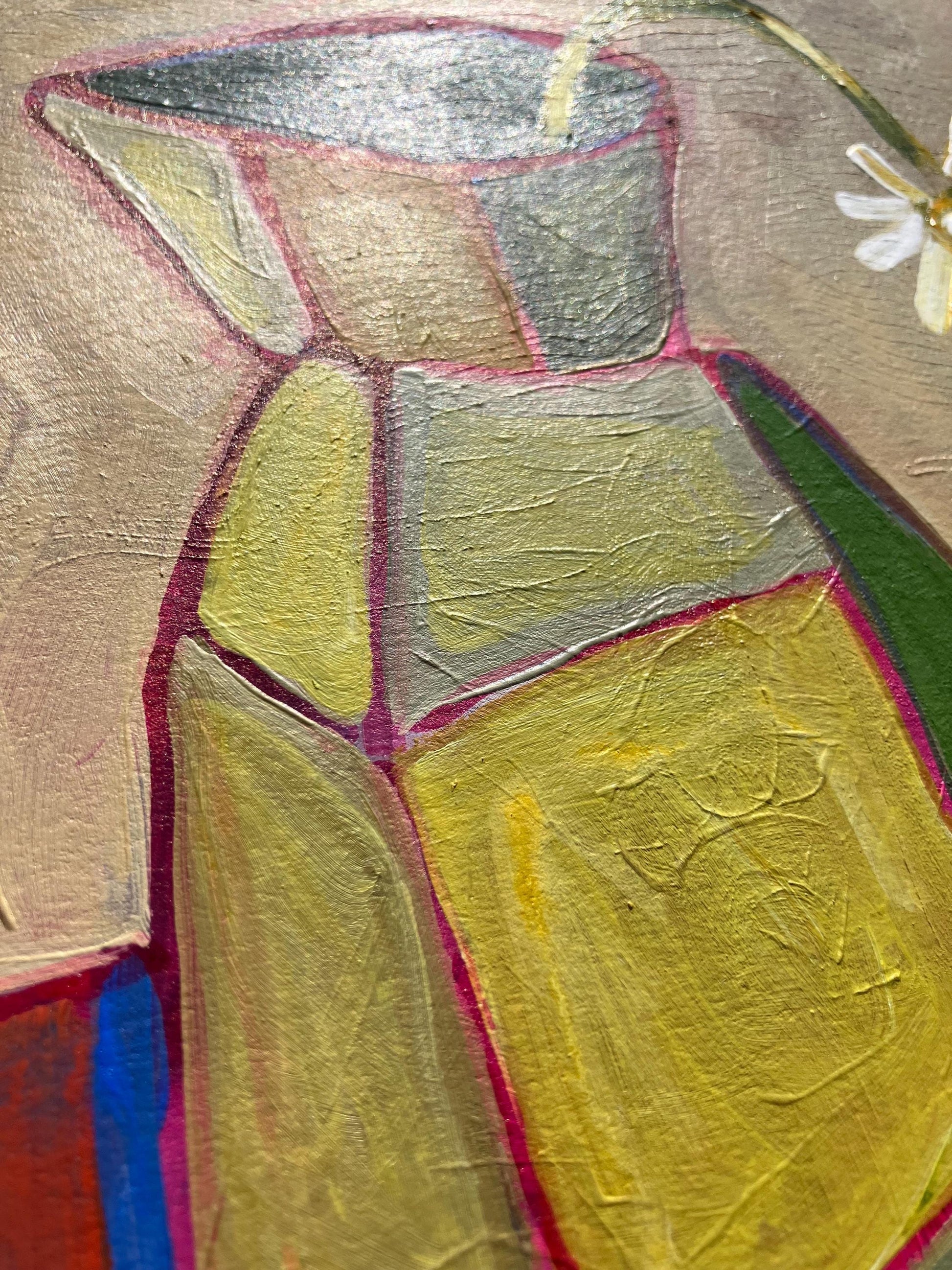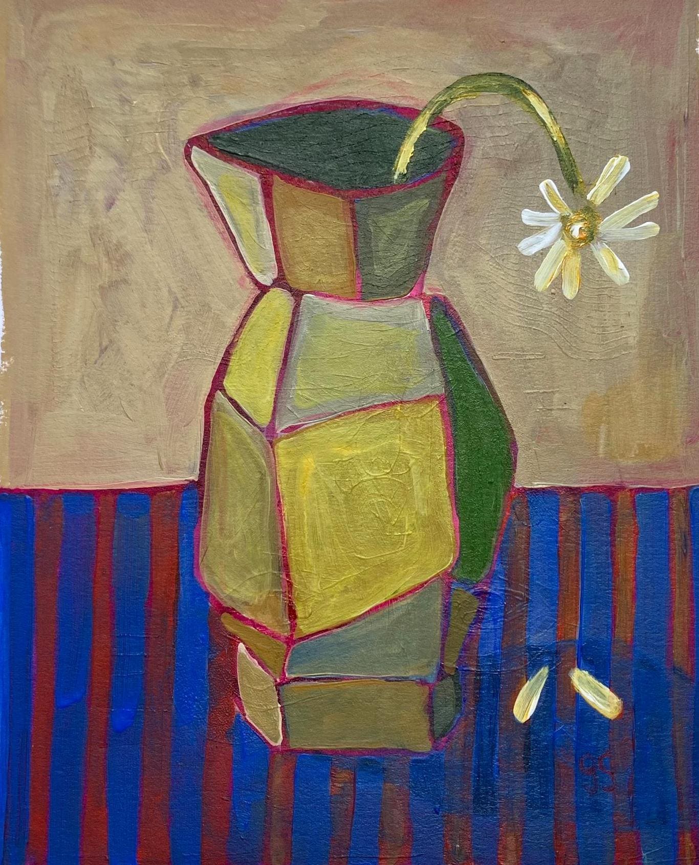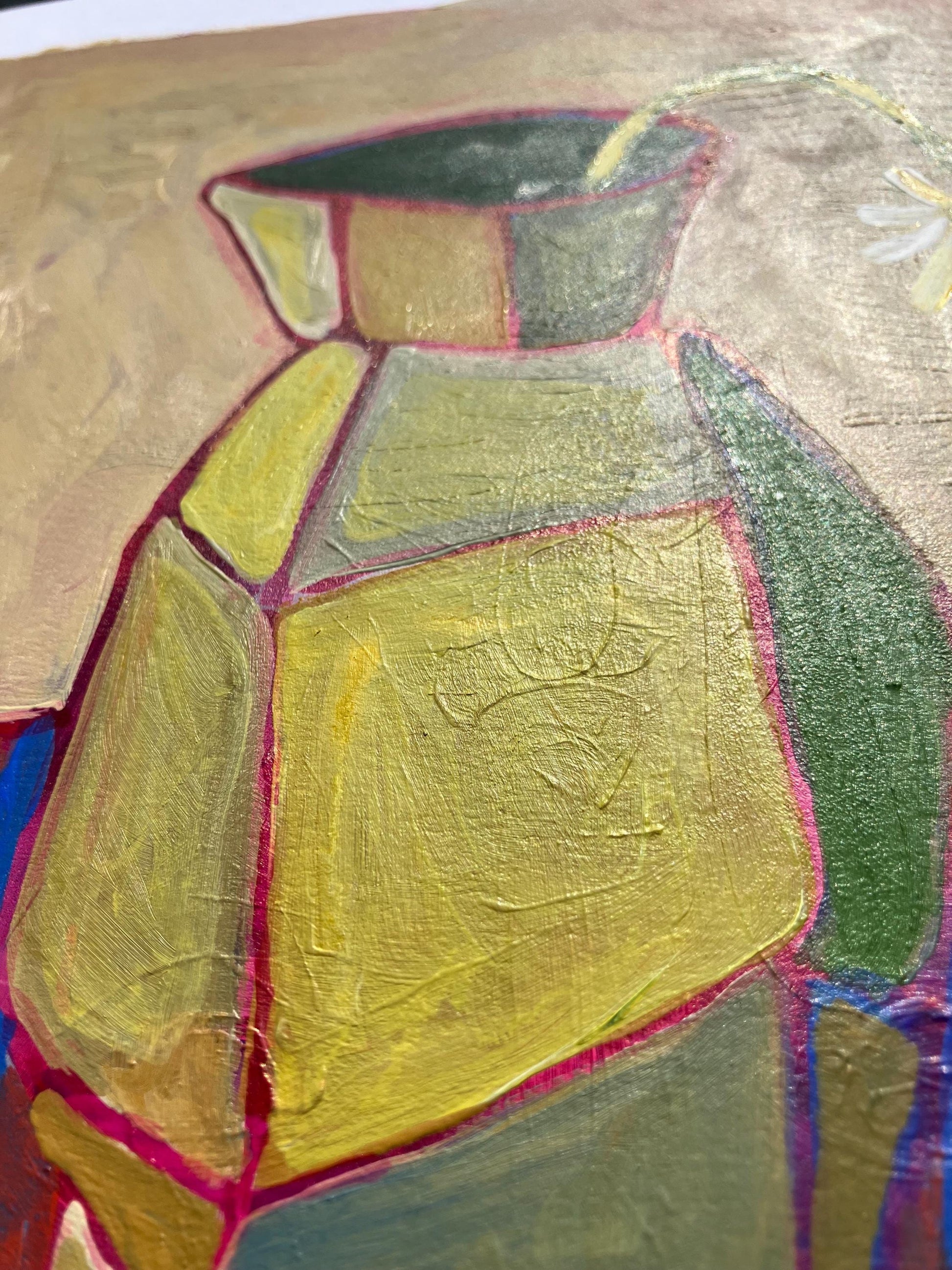 This original 8x10" acrylic painting of sad flower was painted in olive green and blue. This piece features short brushstrokes and neutral colors. It was painted on cotton Lettra paper. This original painting is nicely textured. The paper was recycled from a linocut print, giving it a unique texture. This piece is an original, texture abound! Ready to be framed.