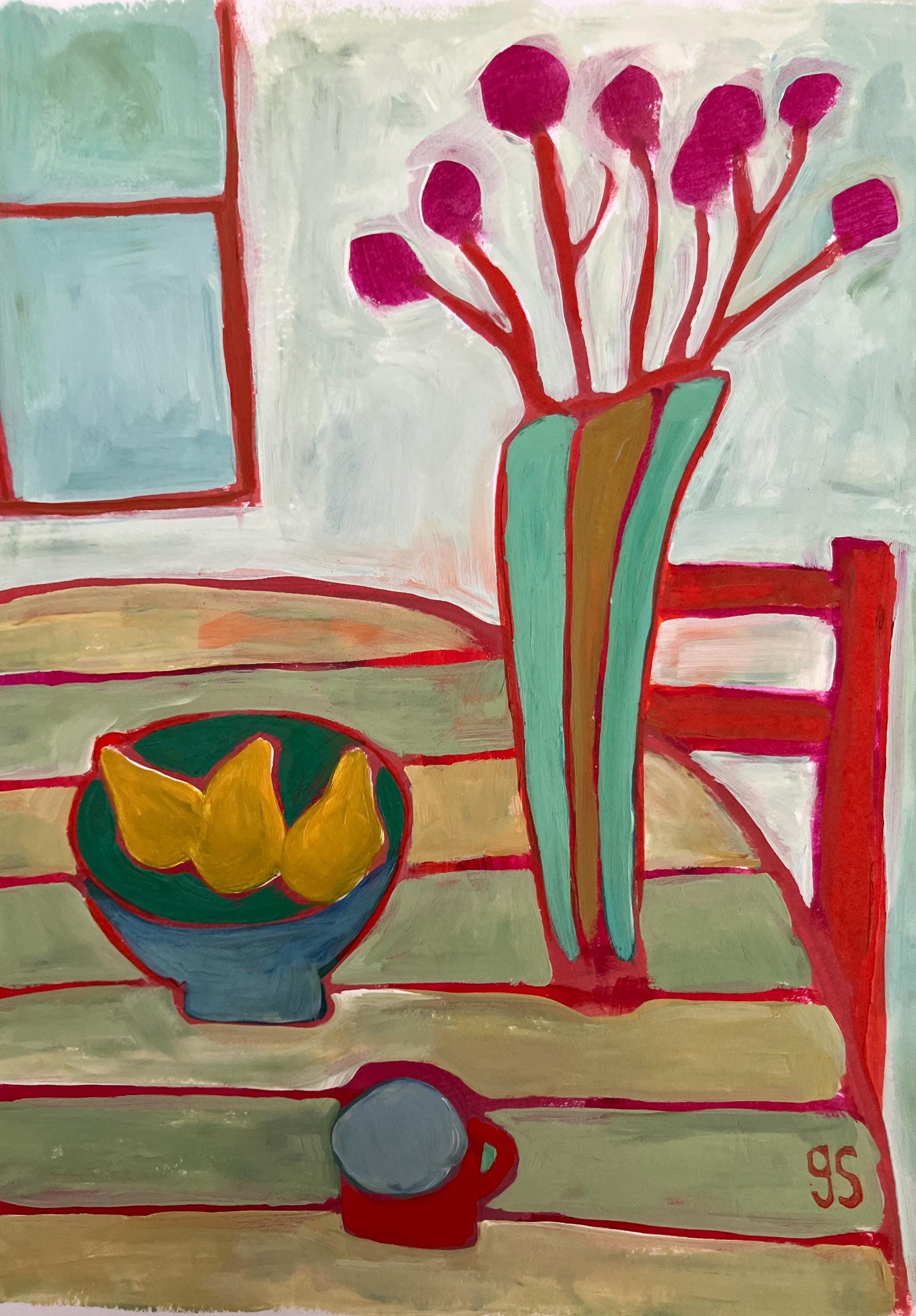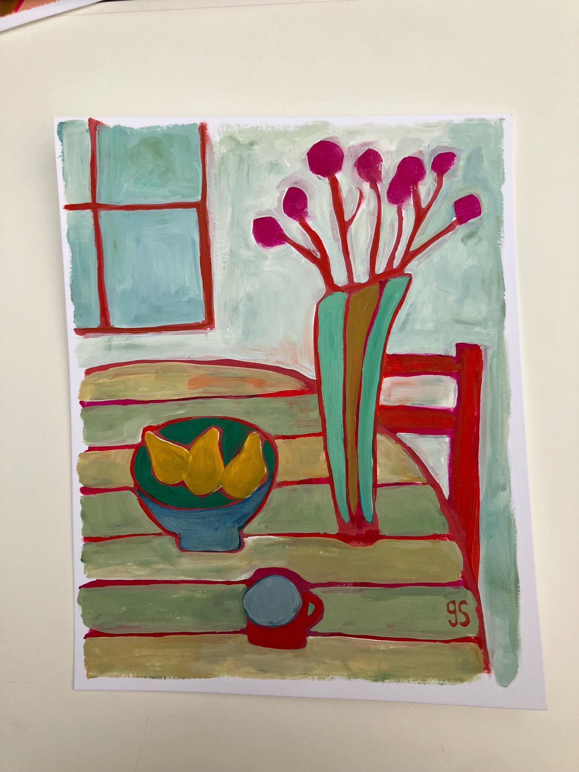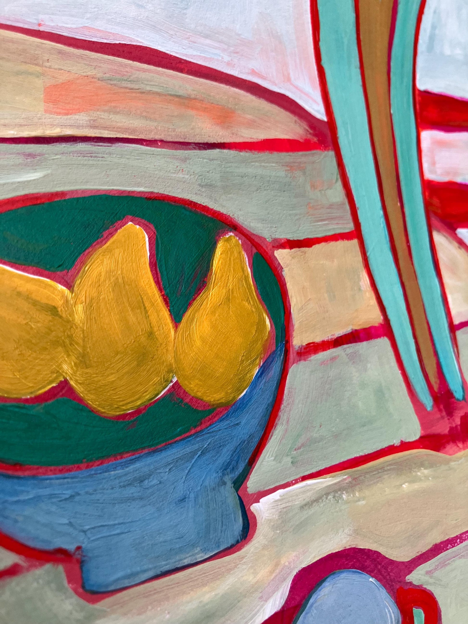 This original 8x10" acrylic painting of a bowl of pears and a minimal bouquet of flowers was painted in neutral colors with red highlights. This piece features short brushstrokes and neutral colors. This original painting is nicely textured. The paper was recycled from a linocut print, giving it a unique texture. This piece is an original, texture abound!
