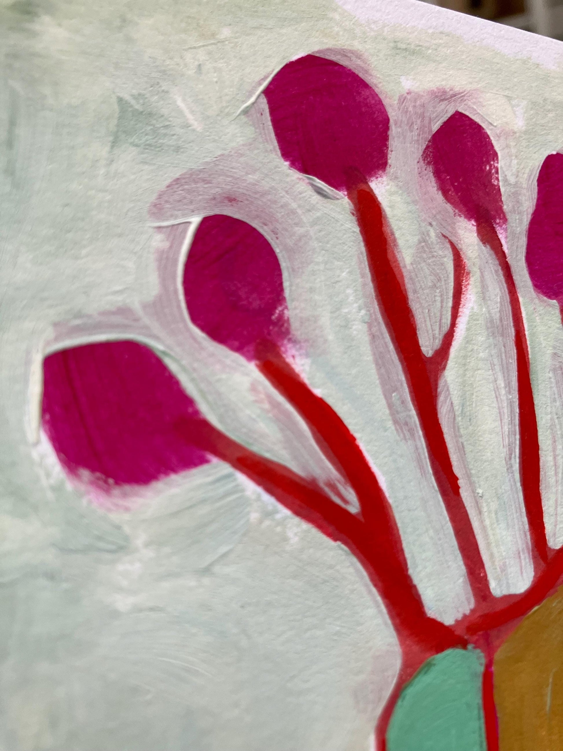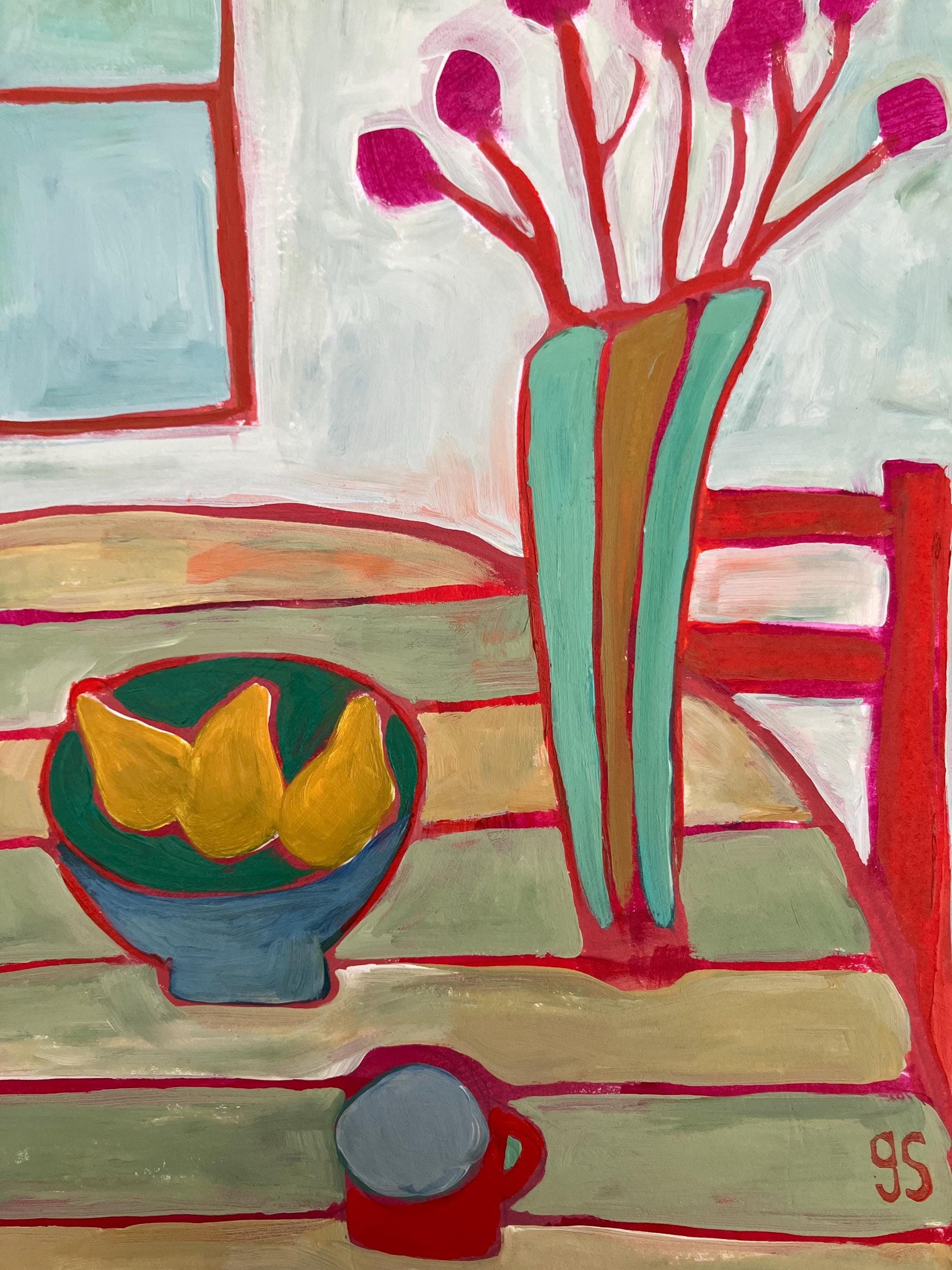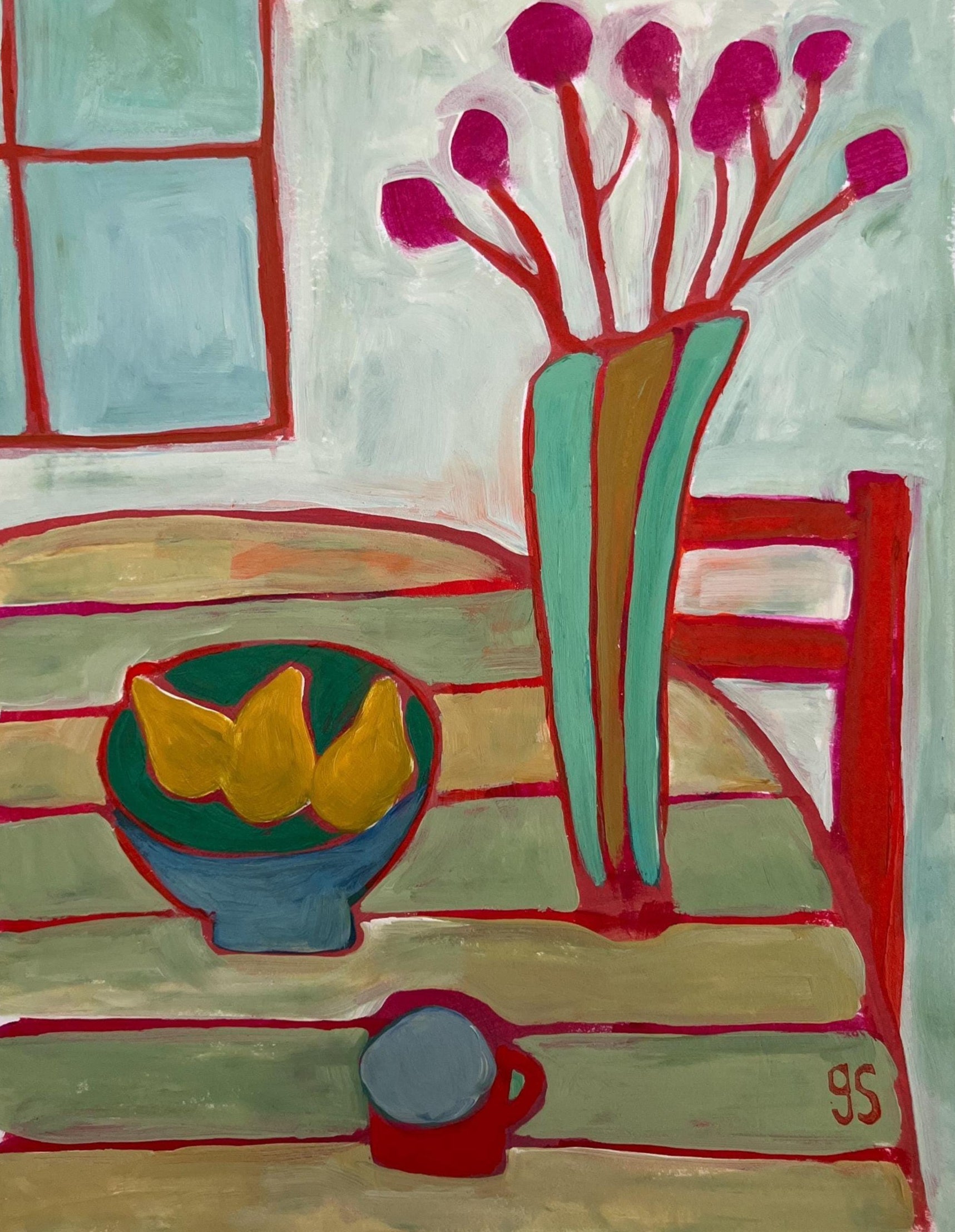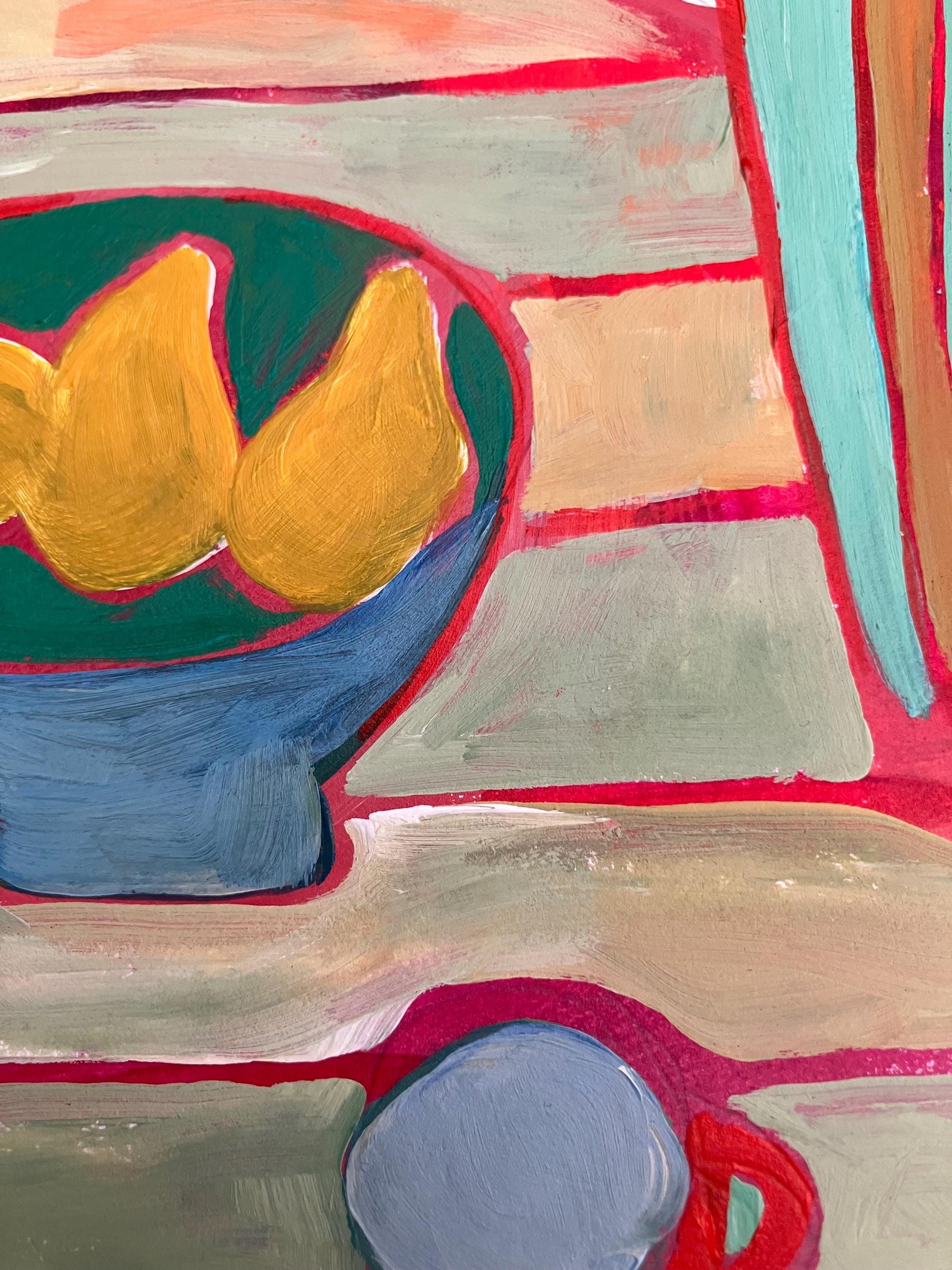 This original 8x10" acrylic painting of a bowl of pears and a minimal bouquet of flowers was painted in neutral colors with red highlights. This piece features short brushstrokes and neutral colors. This original painting is nicely textured. The paper was recycled from a linocut print, giving it a unique texture. This piece is an original, texture abound!