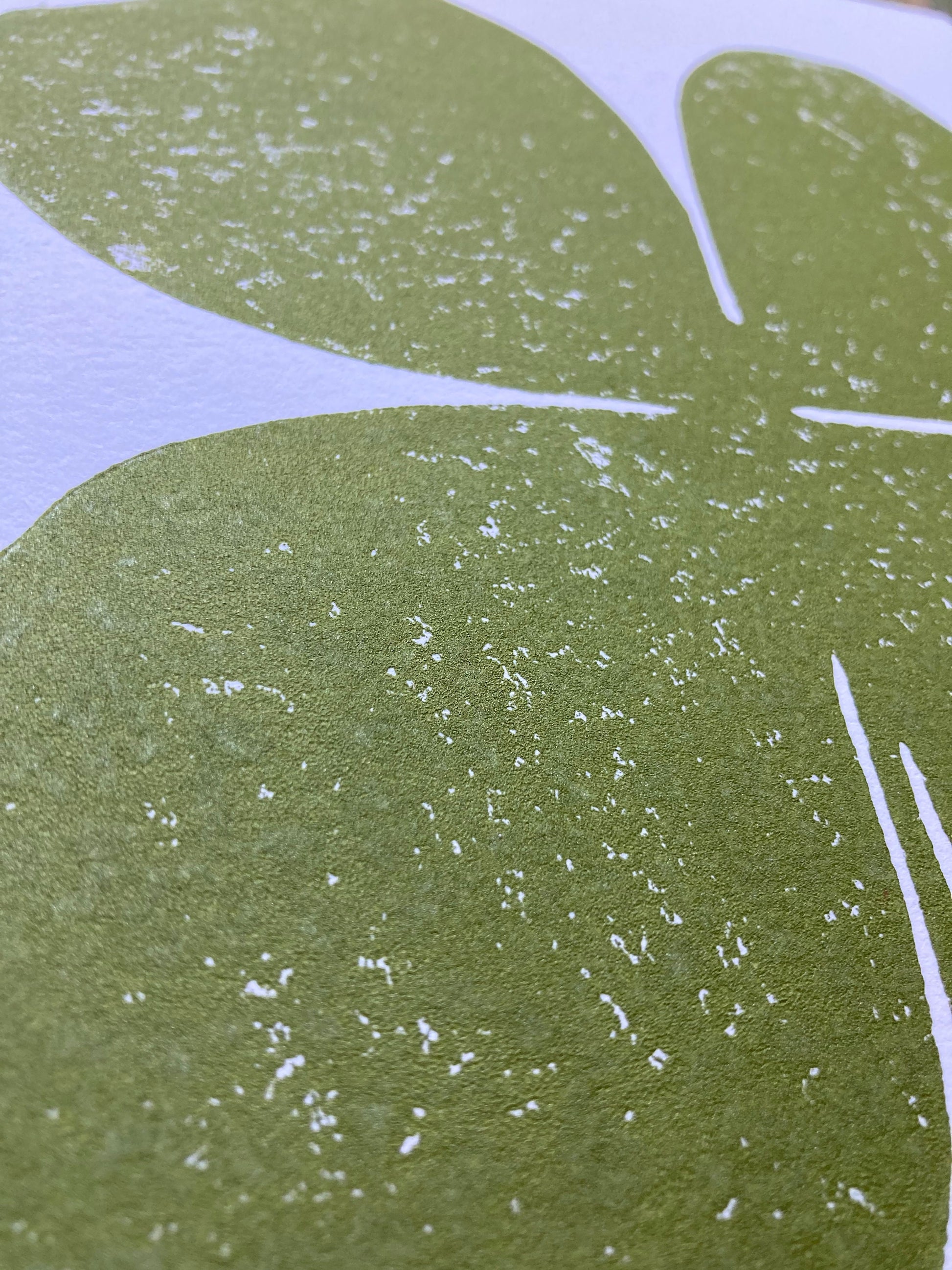 This hand-pressed linocut print of a four leaf clover comes in shimmery green on beautiful letterpress paper. The linoleum block is gently carved by hand, inked, then each print is pressed individually. Due to the printmaking process (which is done entirely by hand), there will be variations from print to print giving you an original and unique piece of artwork. All materials are archival.