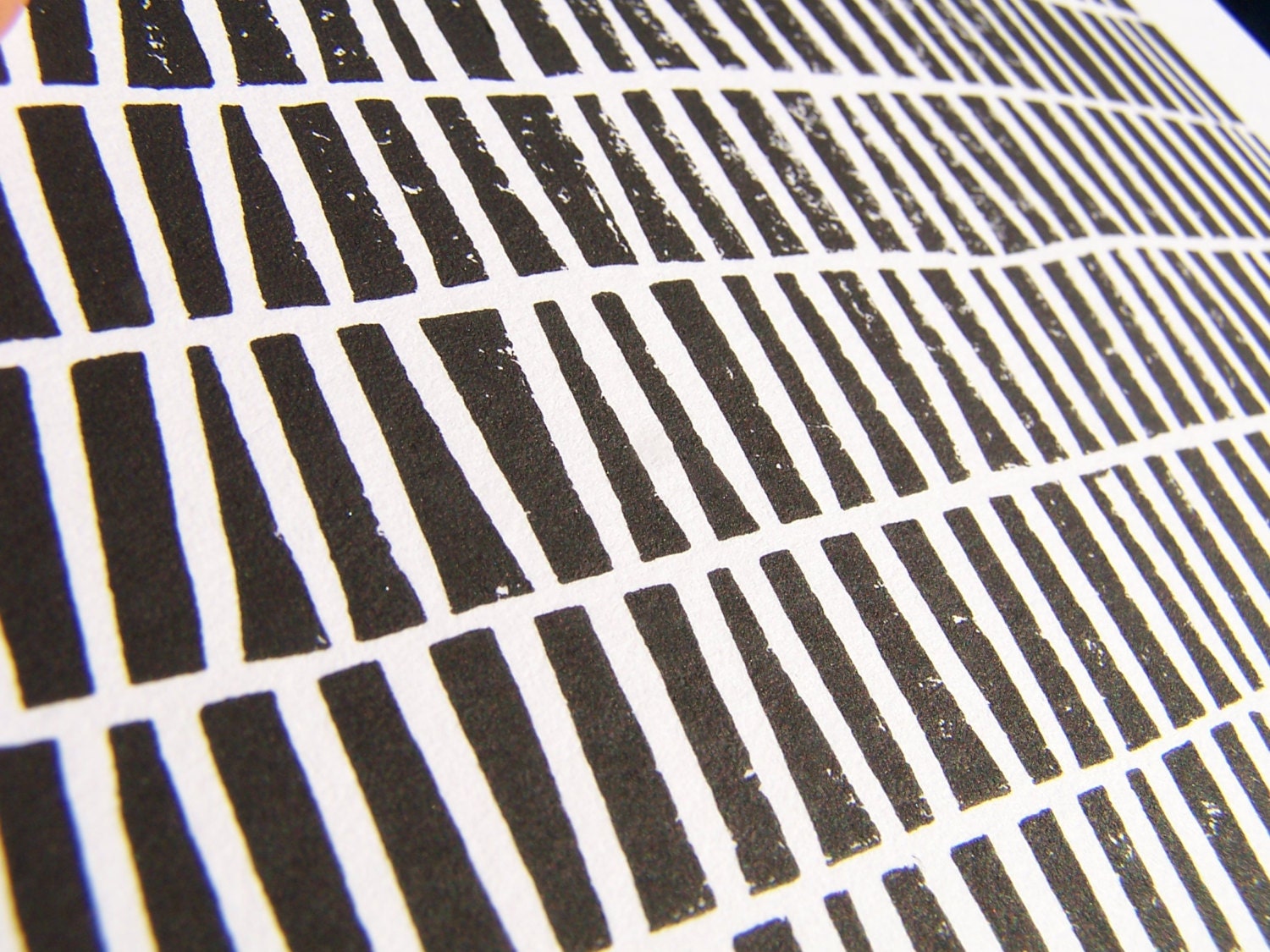 This minimal, geometric hand-pulled lincut print was hand-pressed in black on beautiful letterpress paper. The linoleum block is cut by hand, inked, then each linoprint is pressed individually. Due to the printmaking process, there will be slight variations from print to print. All materials are archival. Wide margins give you room to mat and frame to your liking.