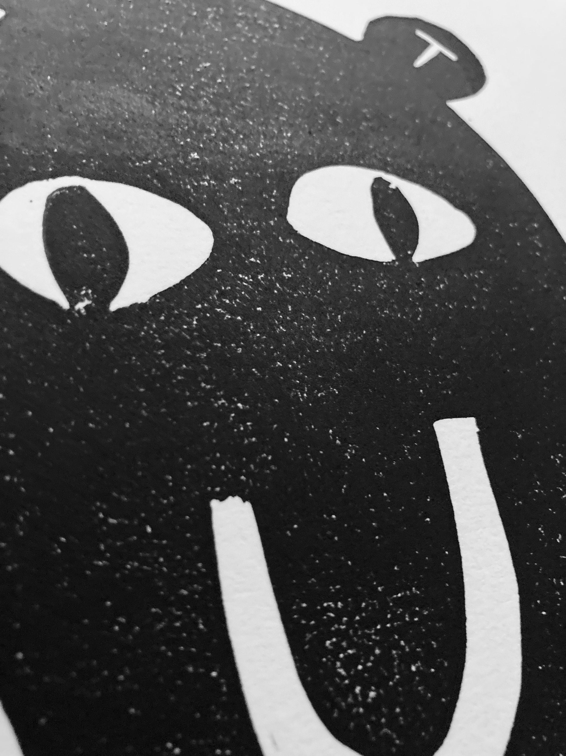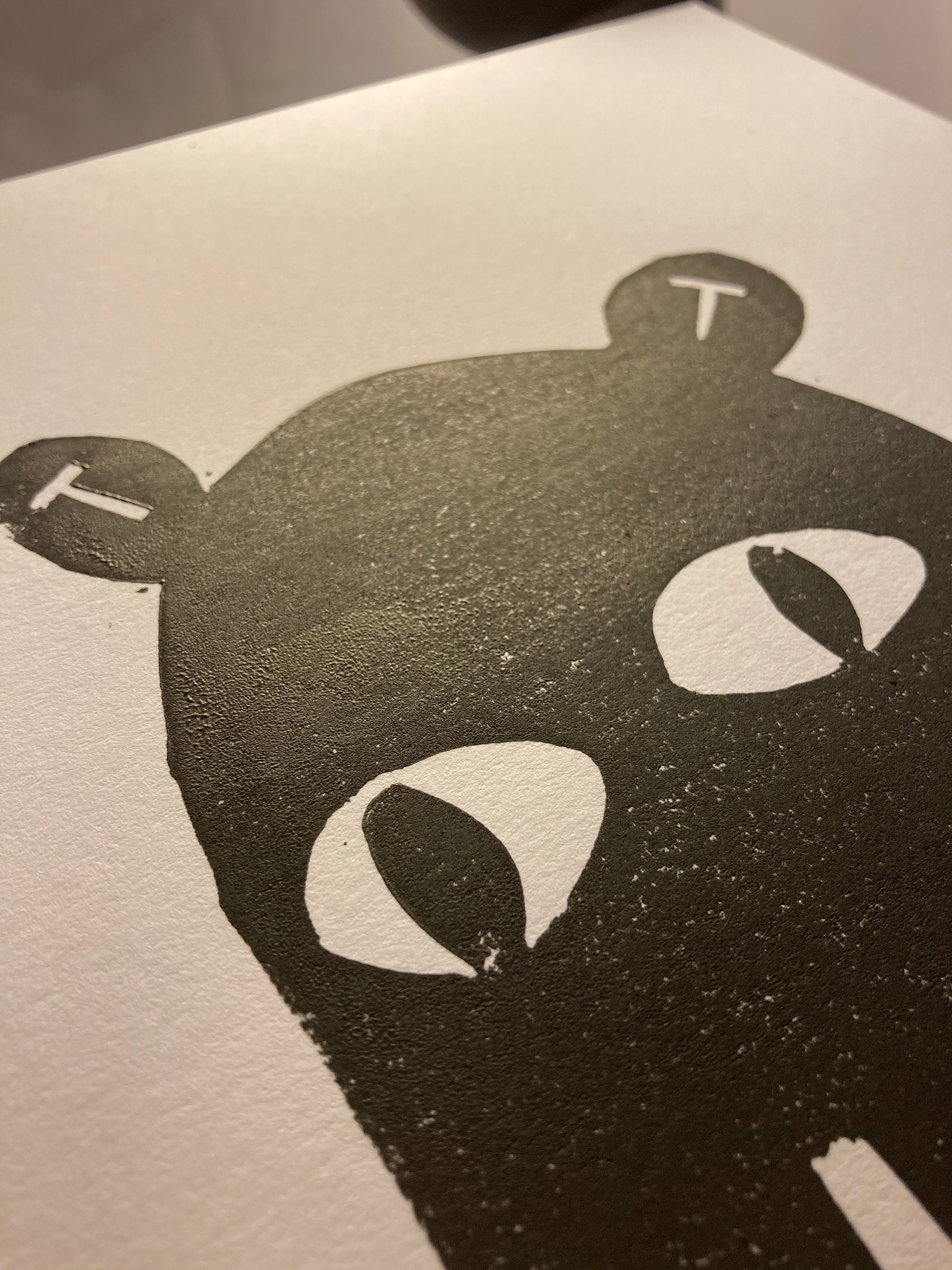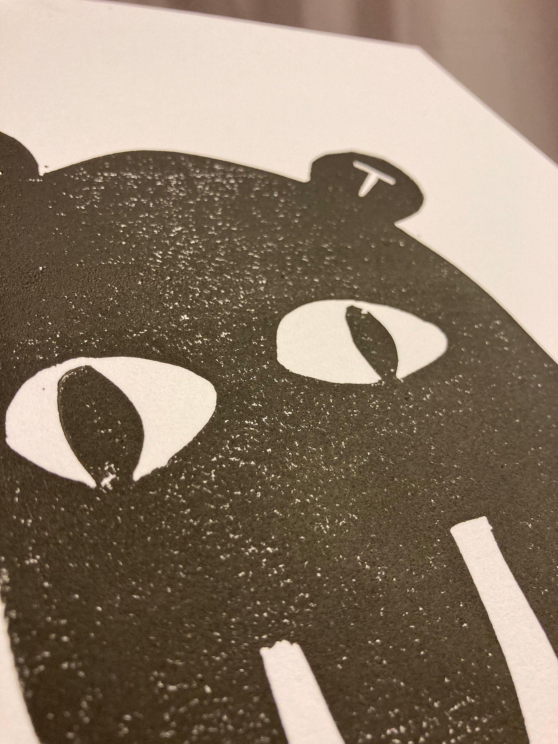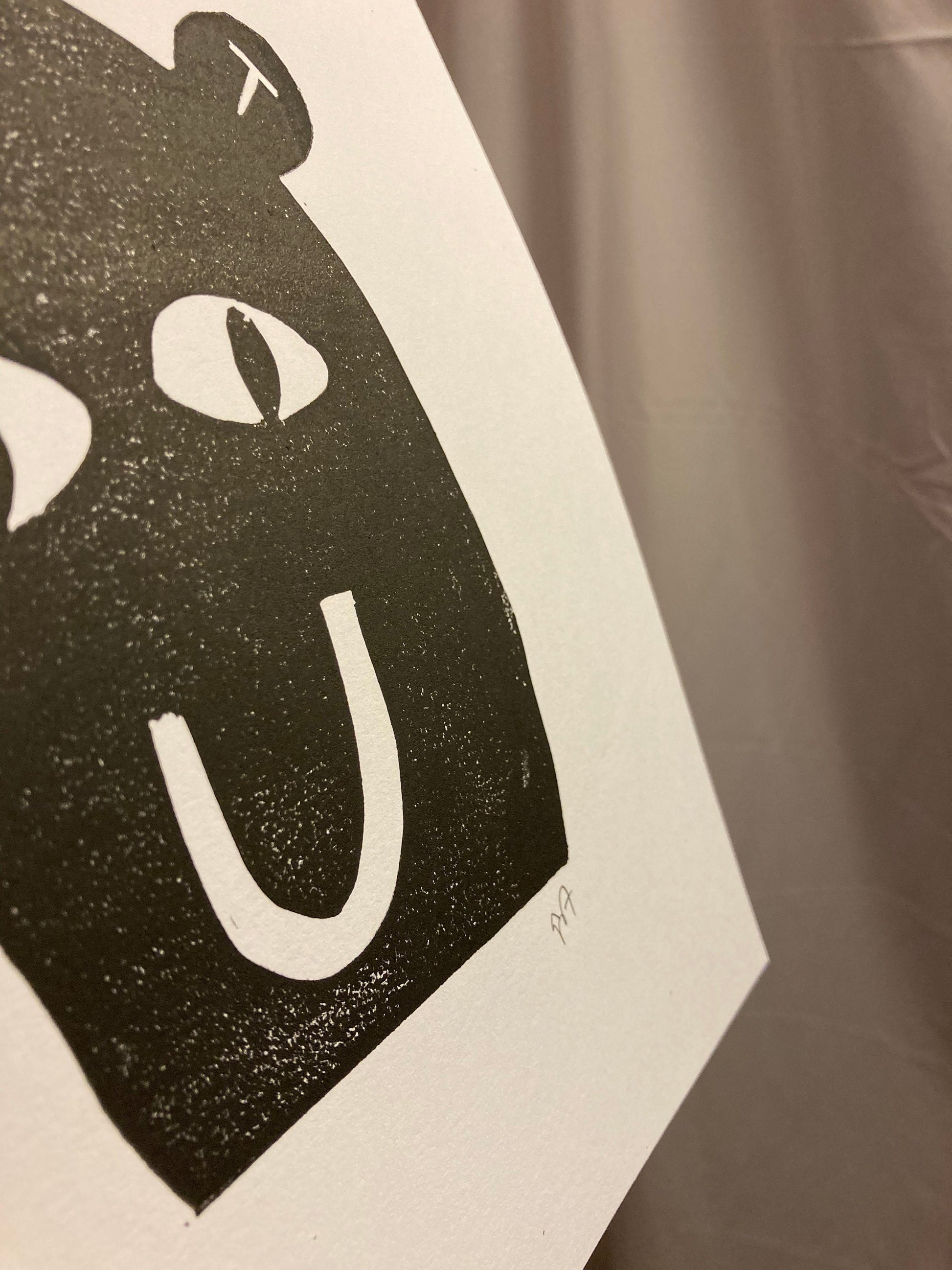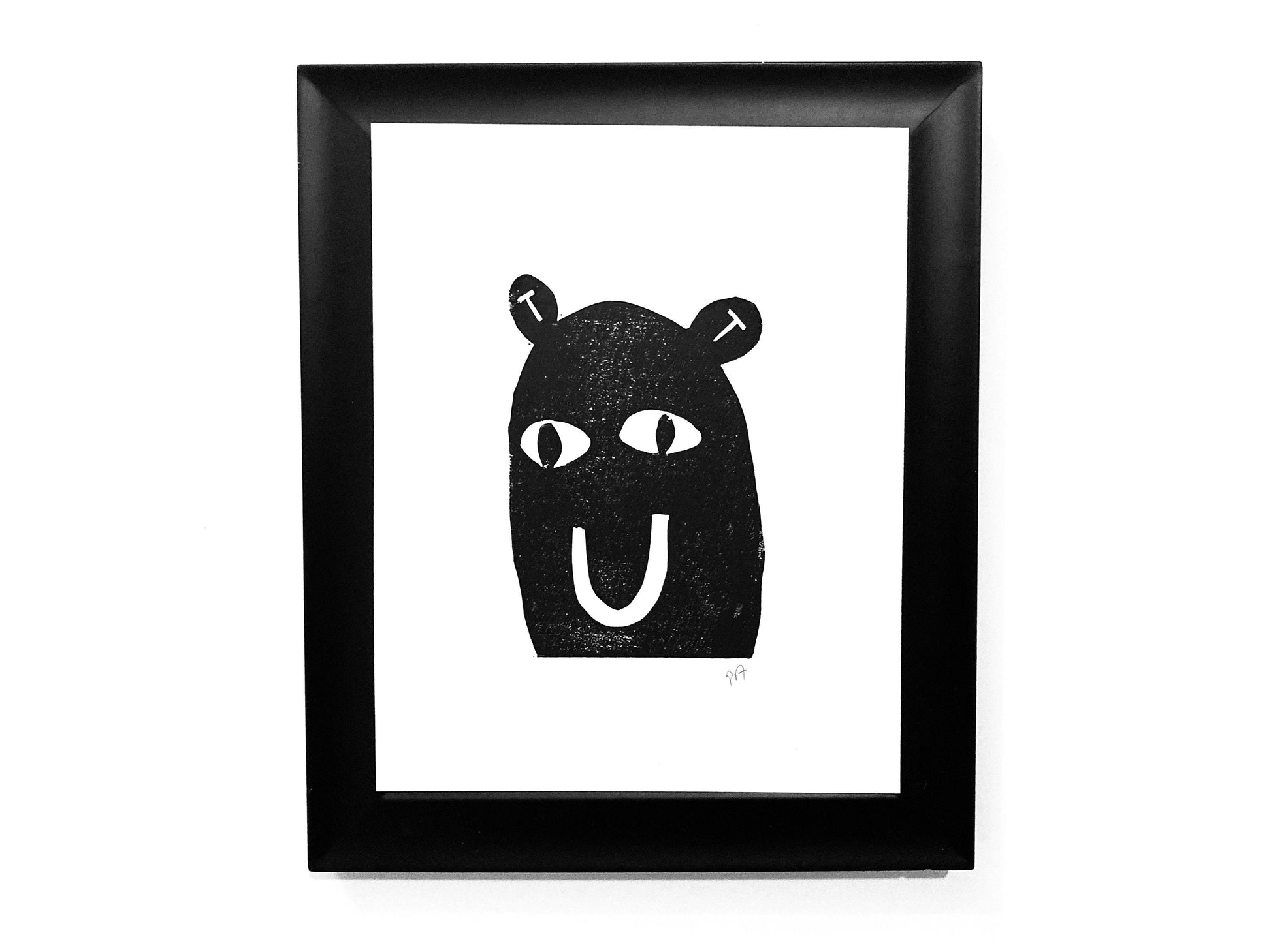 Adorable happy monster linocut print in black. This hand-pulled linoleum block print of an adorable little smiling monster was printed on gorgeous letterpress paper. The linoleum block is cut by hand, inked, then each linoprint is pressed individually. Due to the printmaking process, there will be slight variations from print to print. All materials are archival. Wide margins give you room to mat and frame to your liking. This is the perfect gift for monsters.