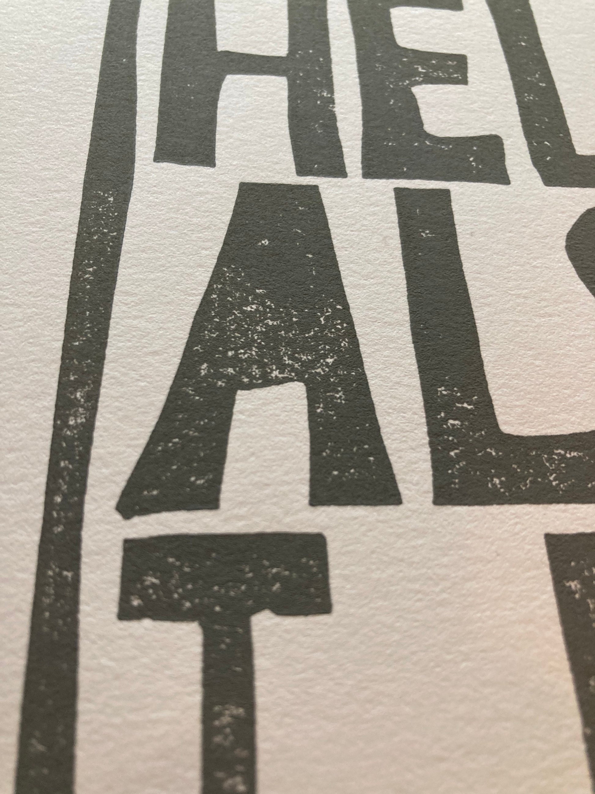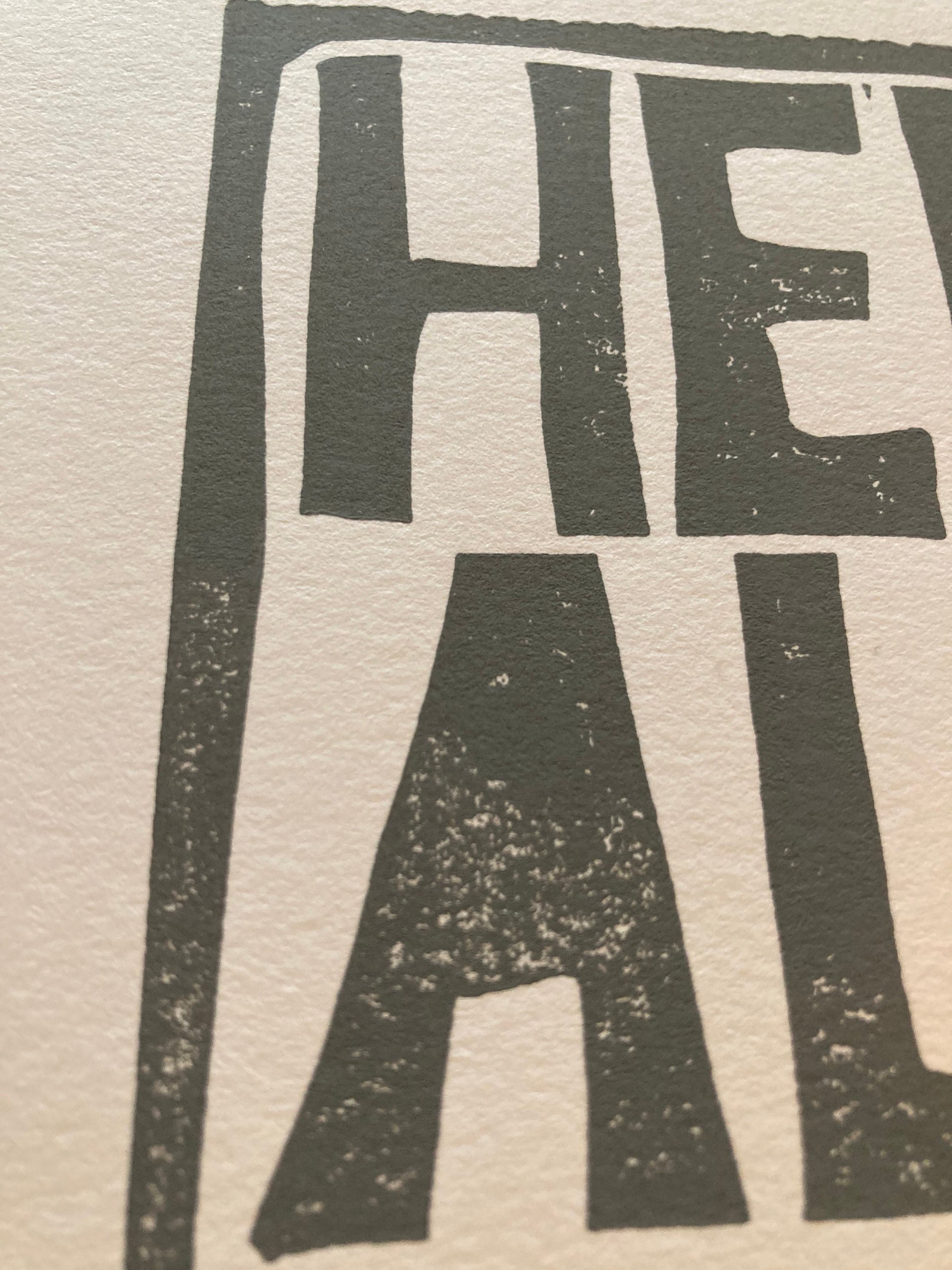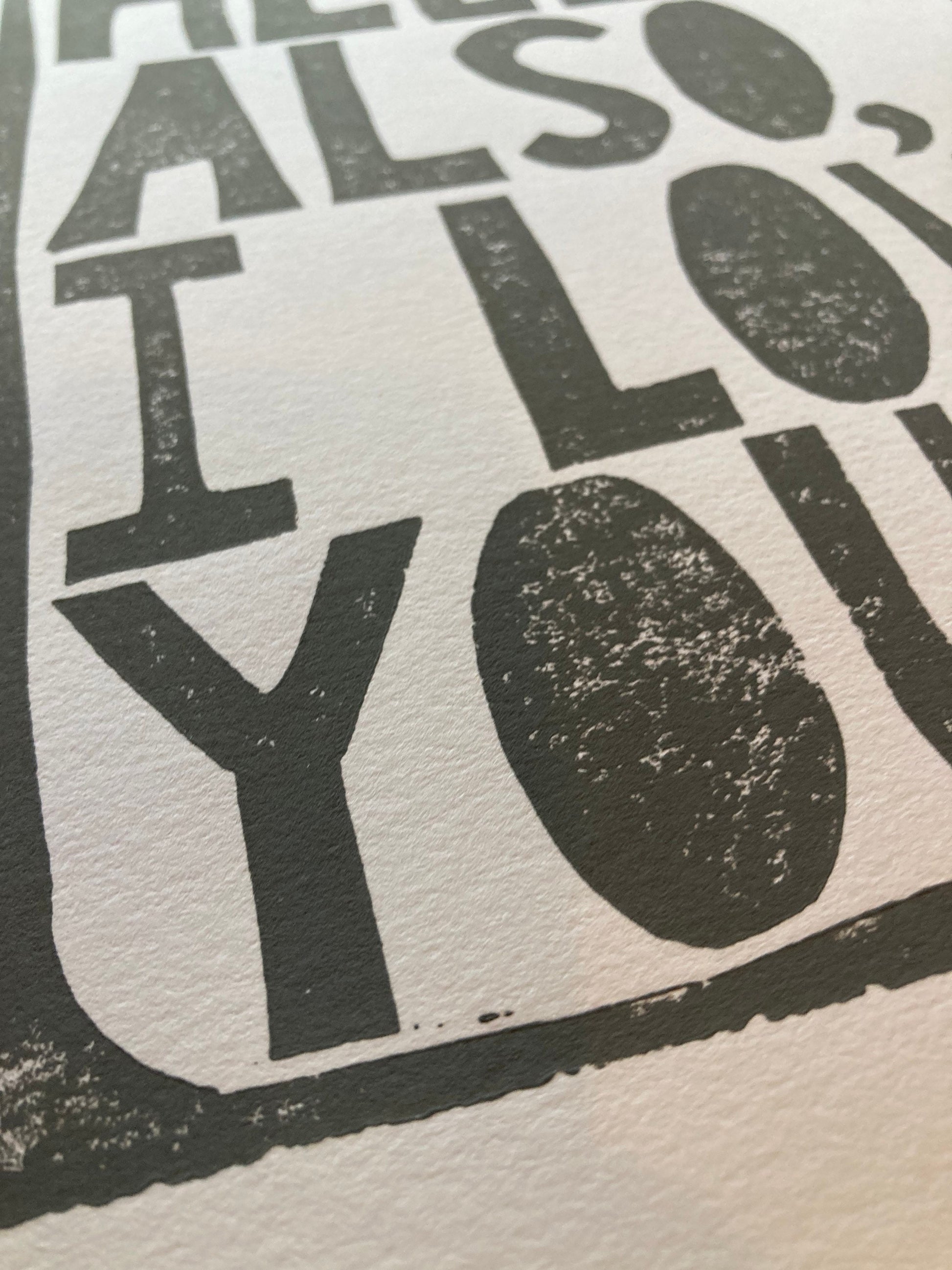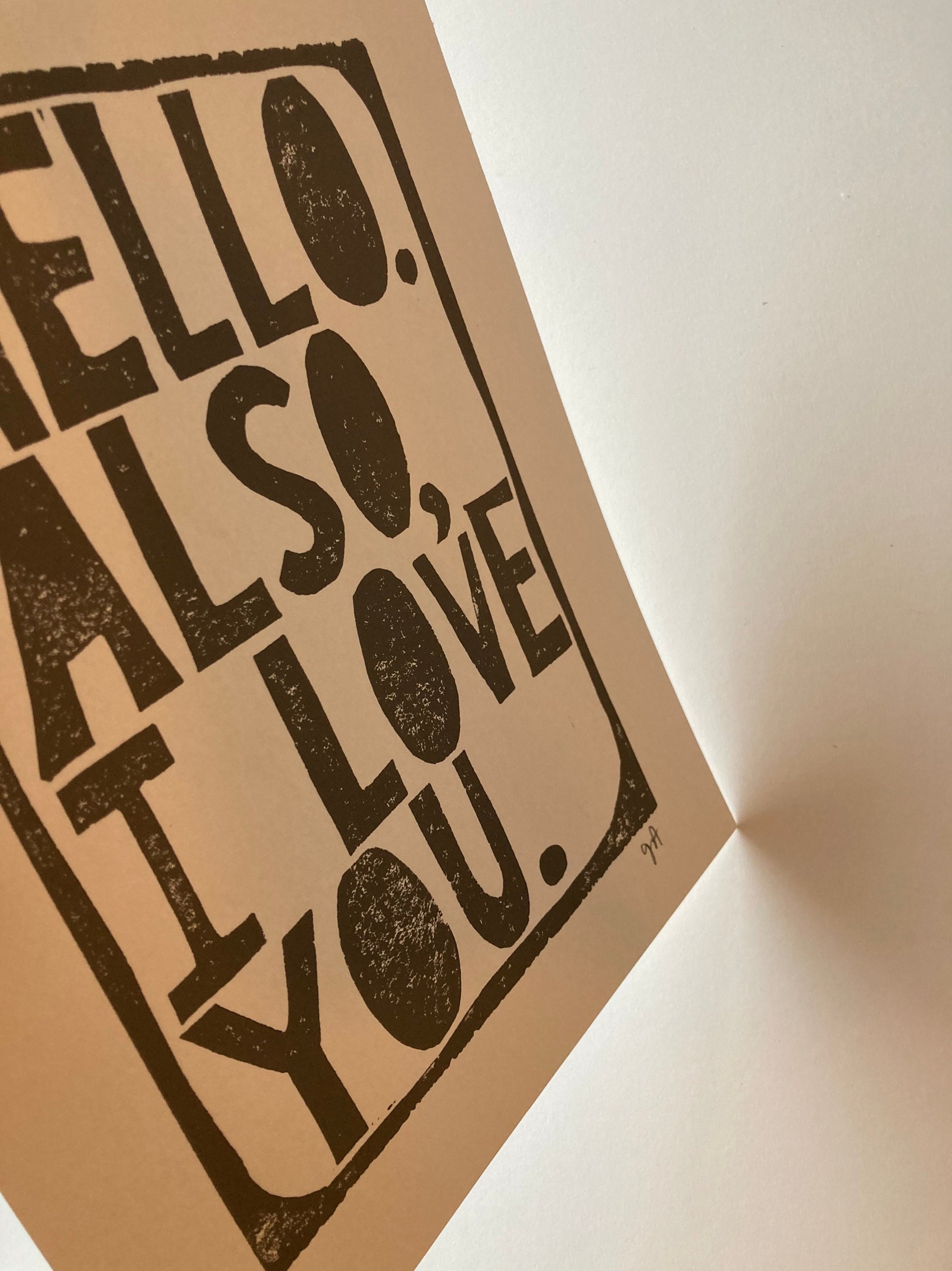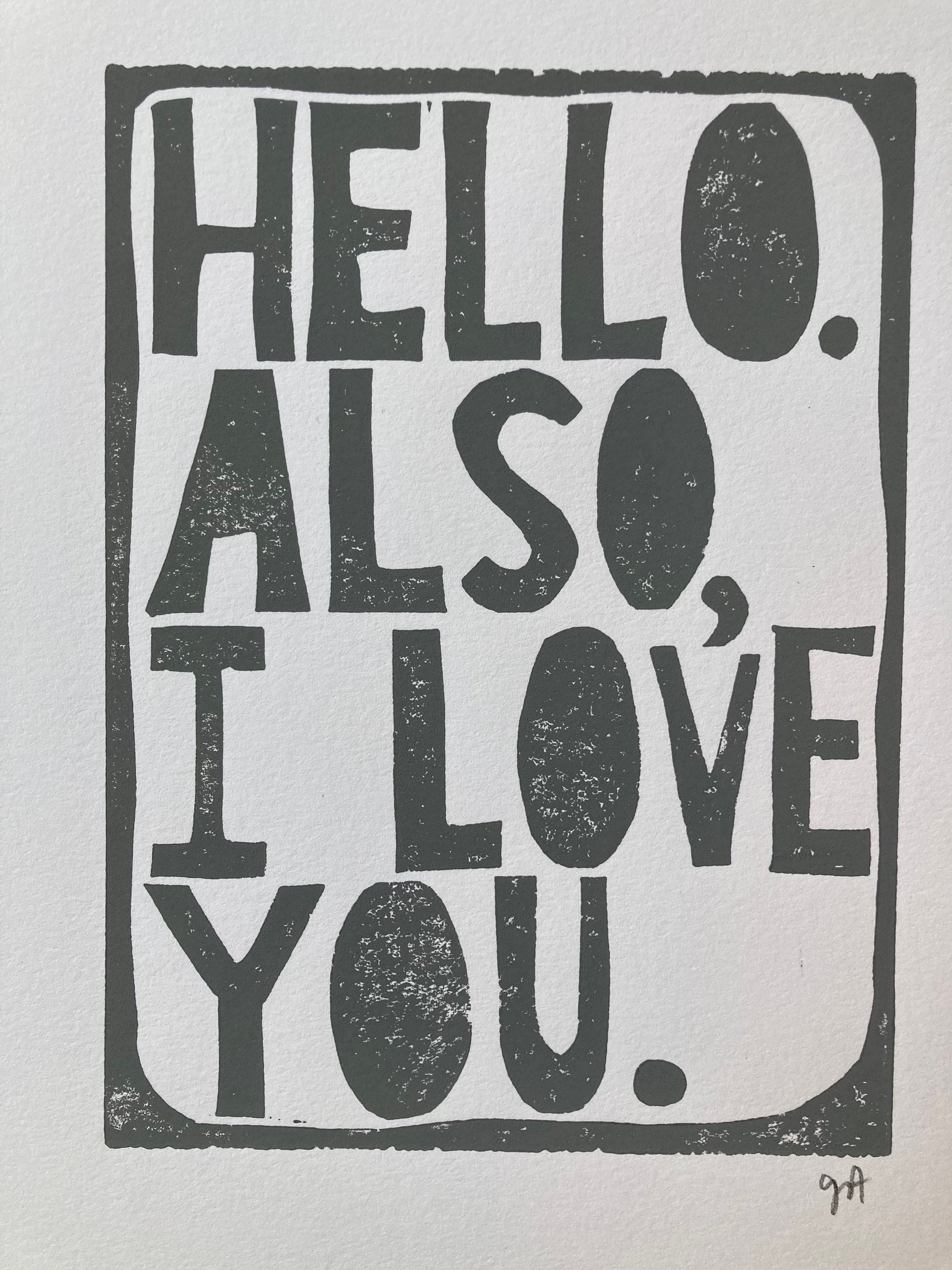 HELLO. ALSO, I LOVE YOU - original linocut print in medium grey, 8x10in.
