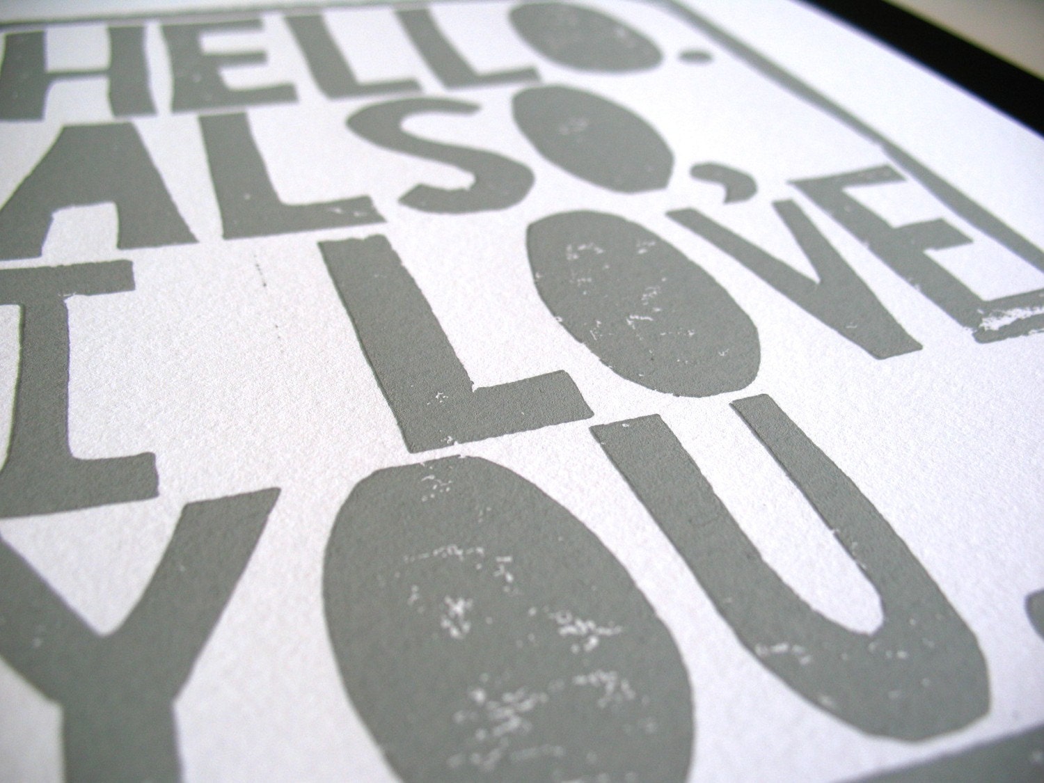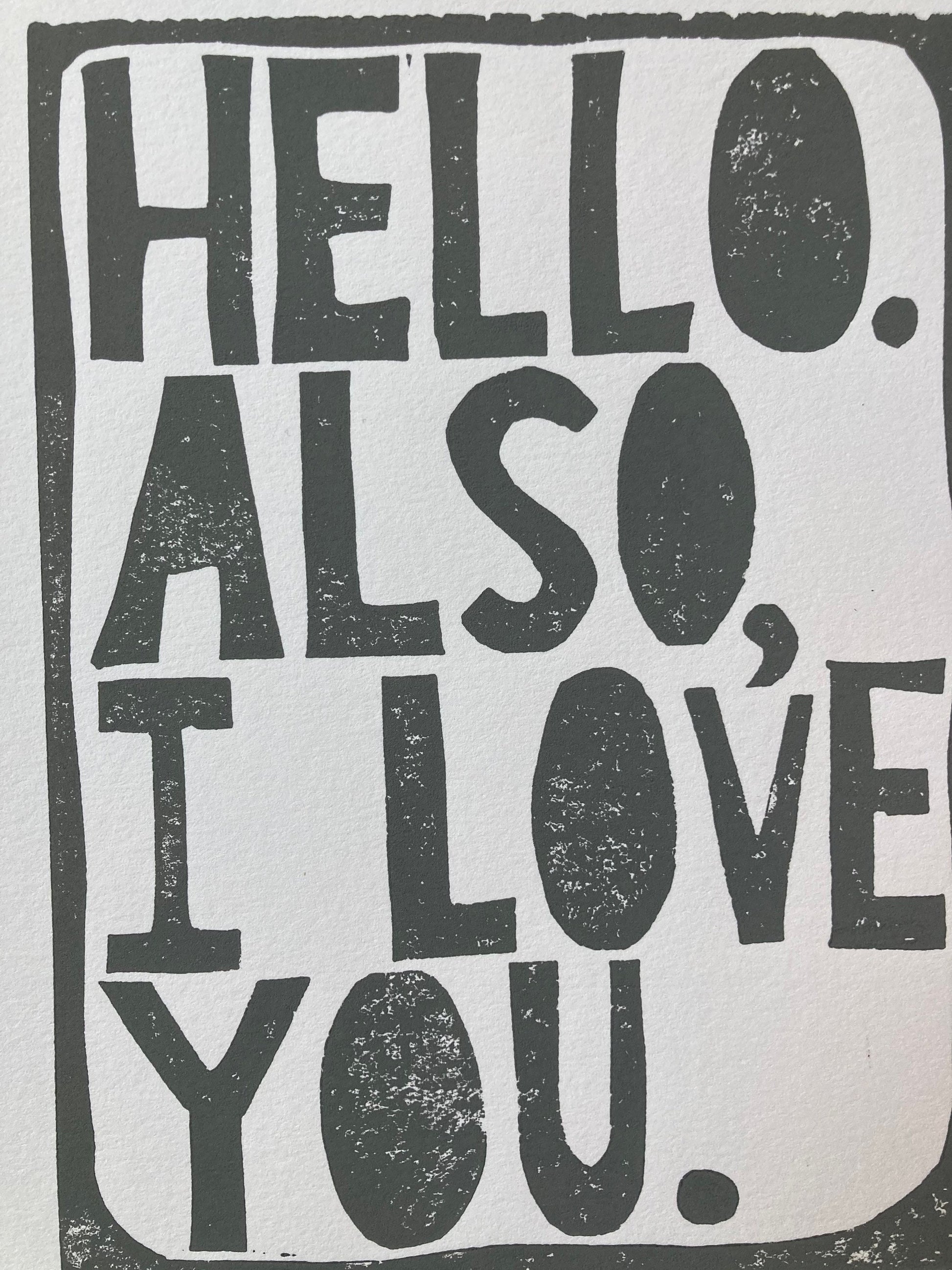 Minimal linocut print for so many occasions. This makes a wonderful gift! This sweet, original, hand-pulled linocut typography print was pressed in medium grey on beautiful cotton Lettra paper. The linoleum block is carved by hand, inked, then each piece is printed individually. Due to the printing process, there will be variations from print to print giving you a one-of-a-kind piece of art! All materials are archival.