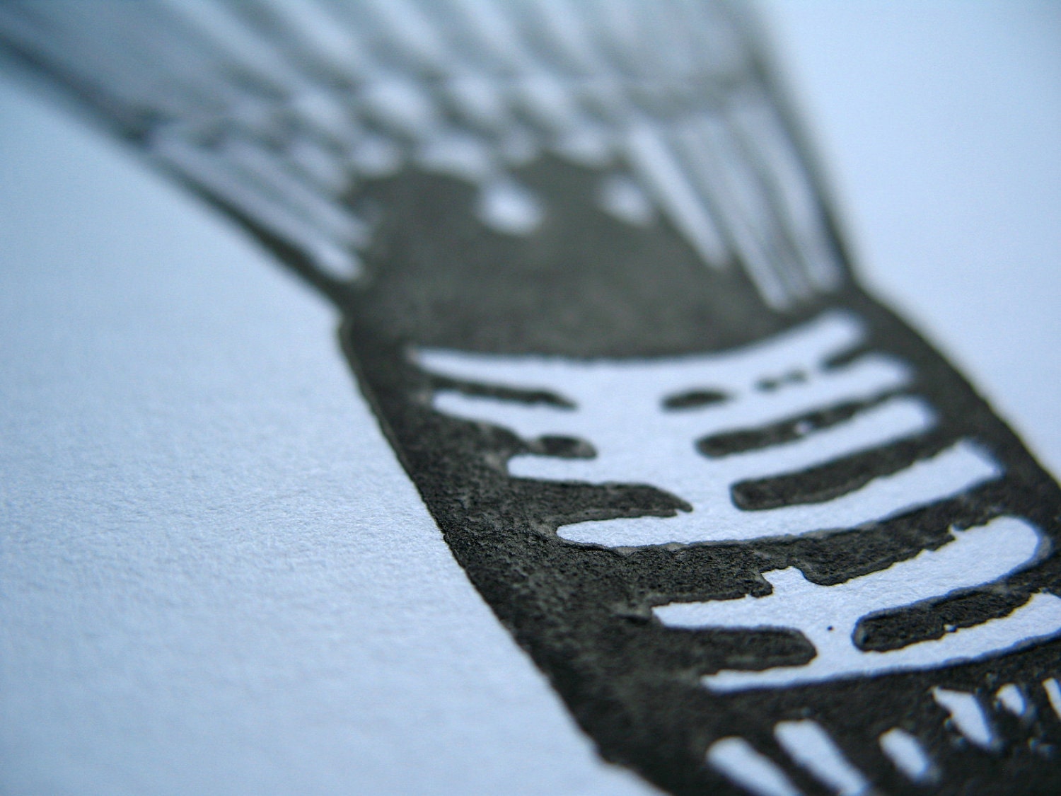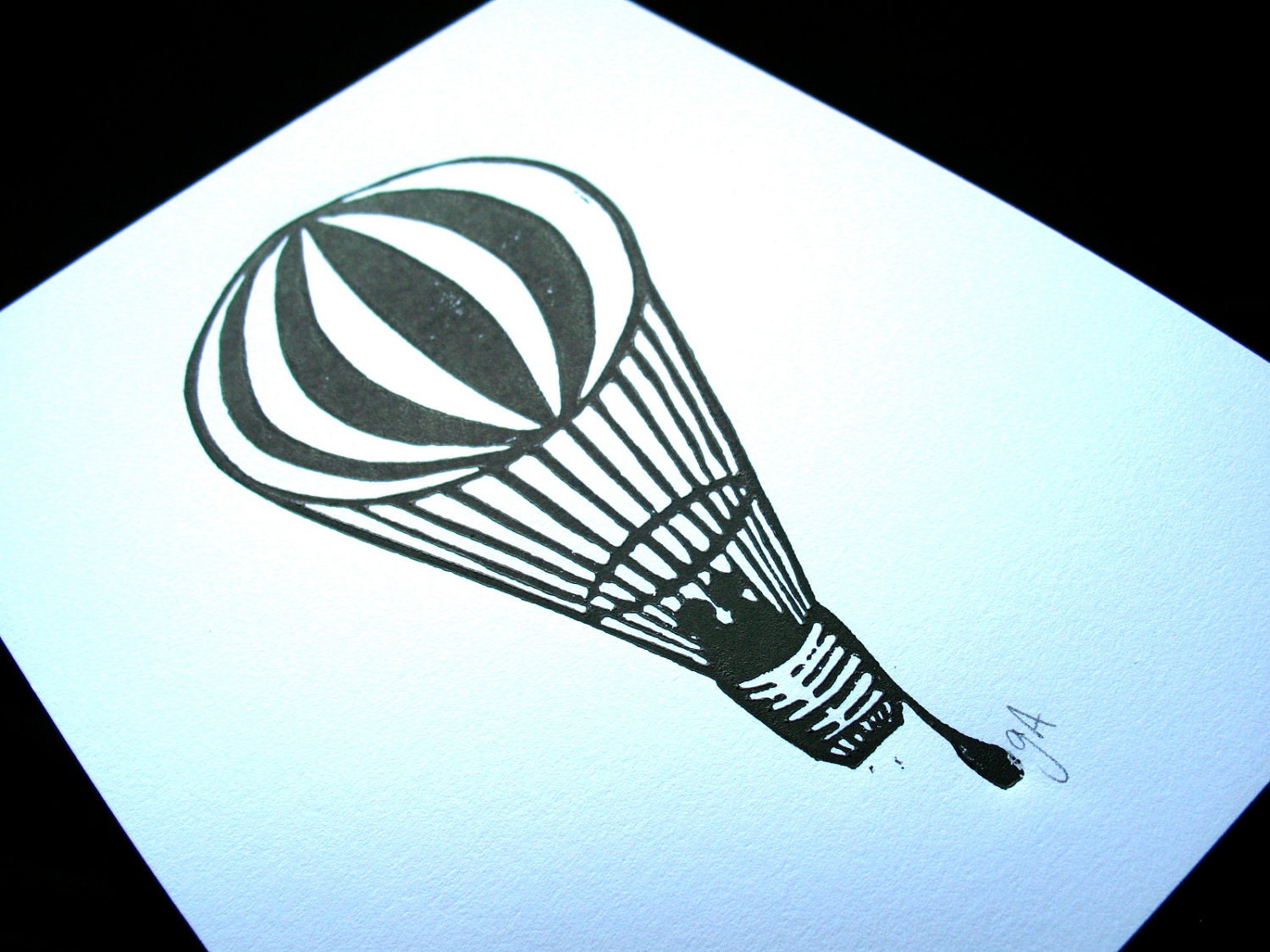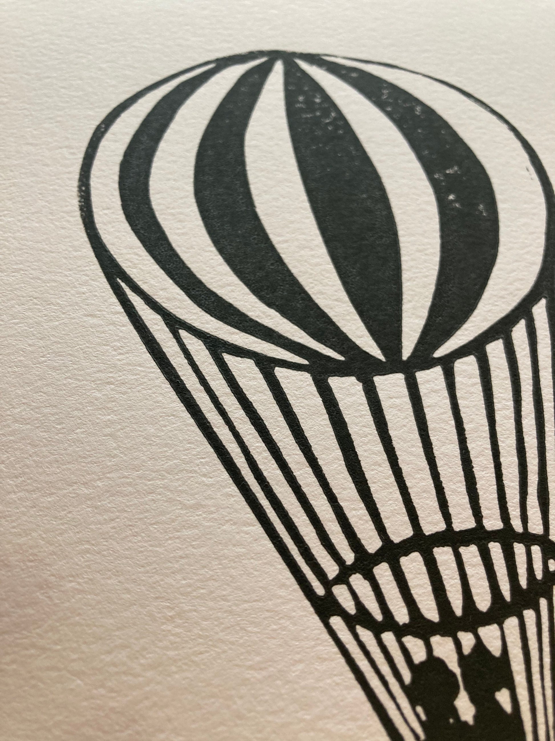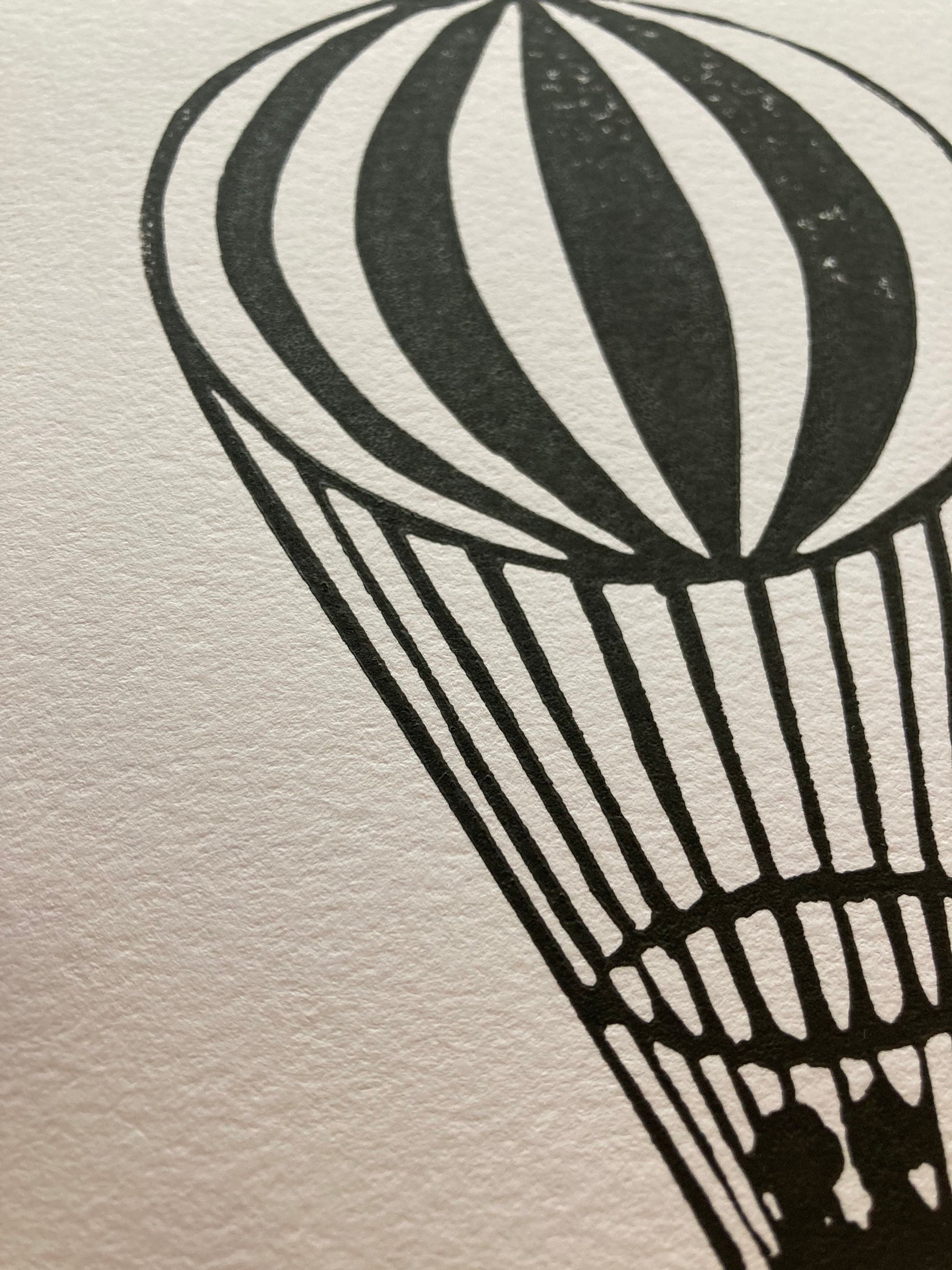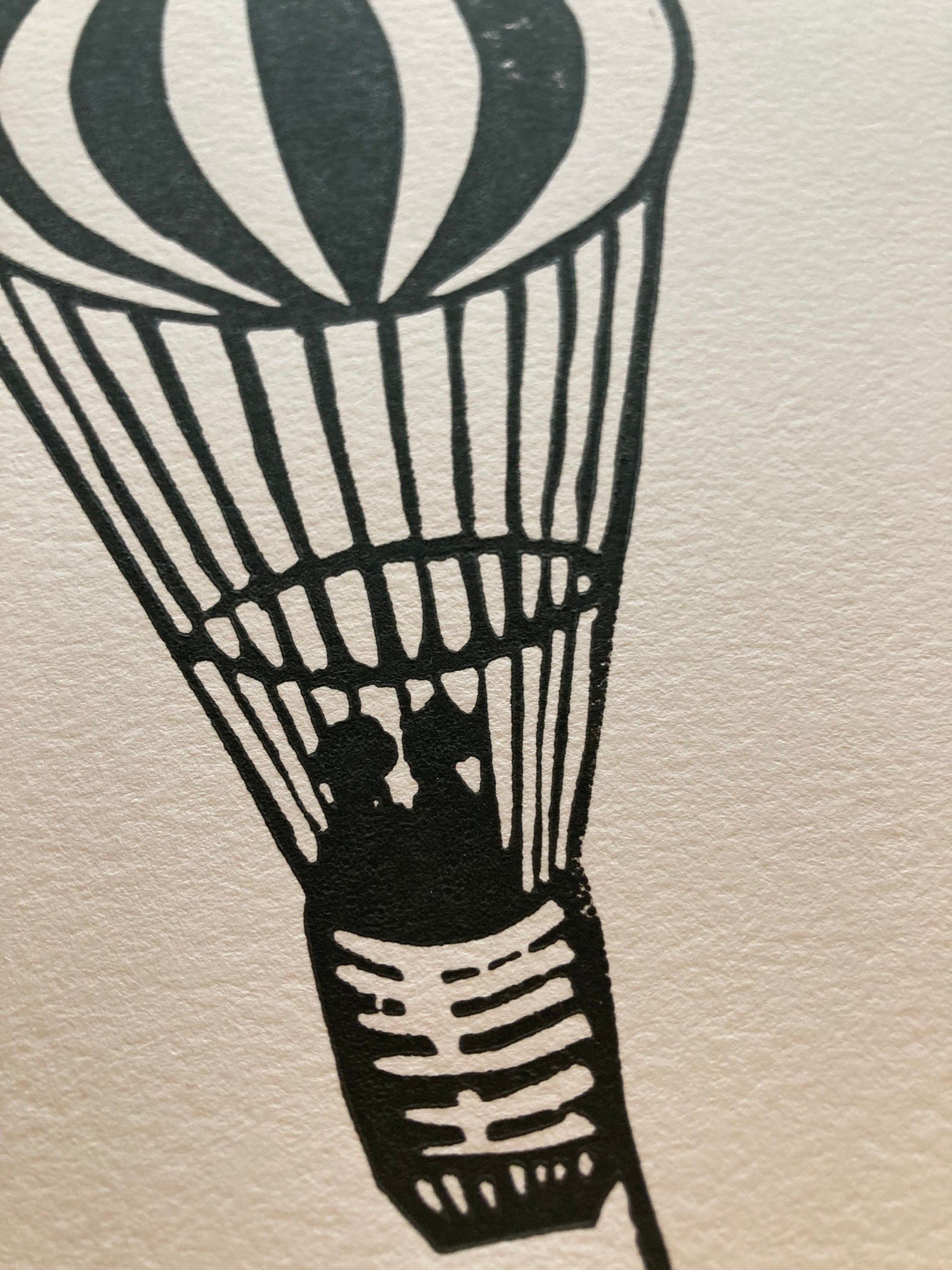 Minimal hand-pressed linocut print of a hot air balloon, 8x10