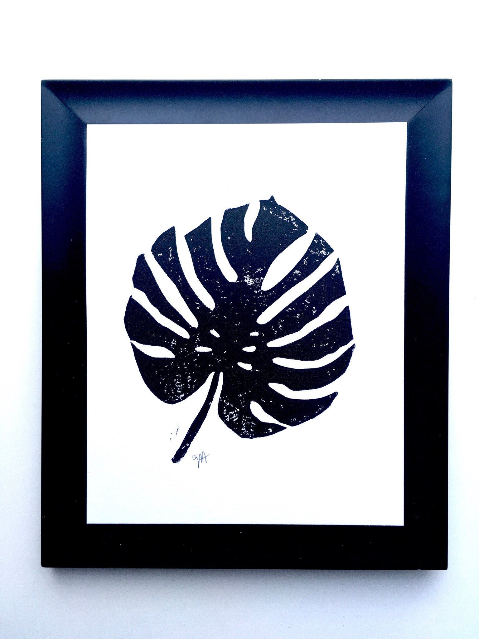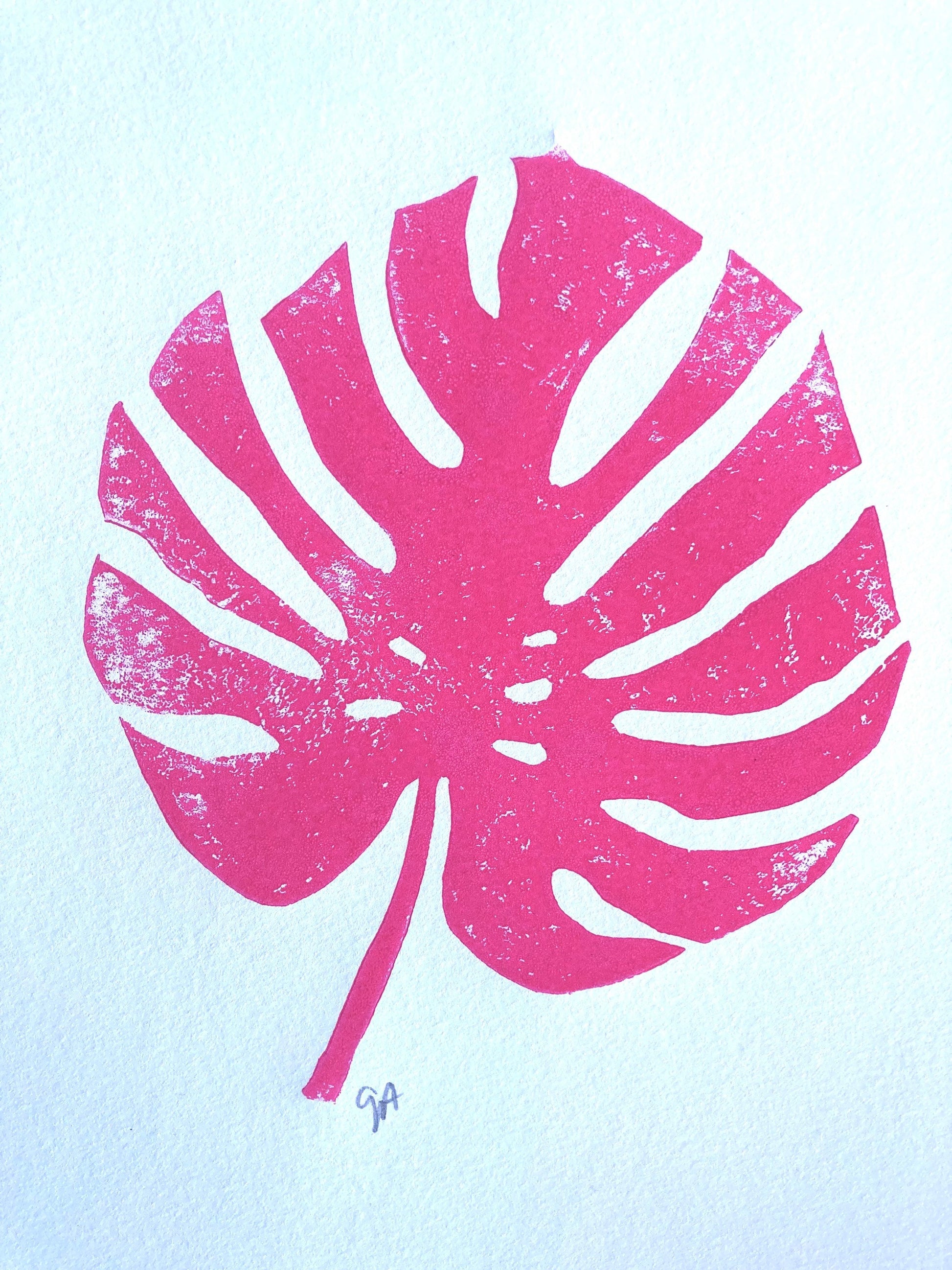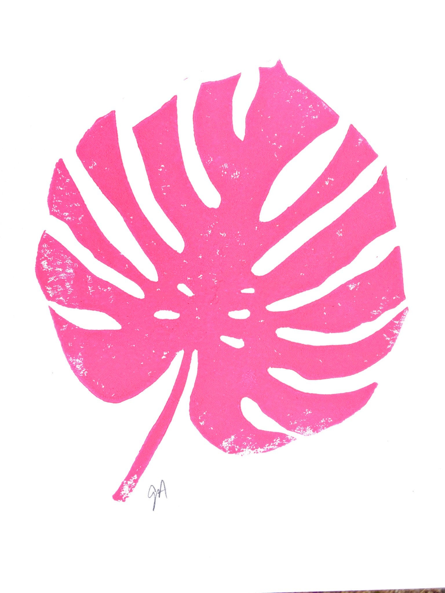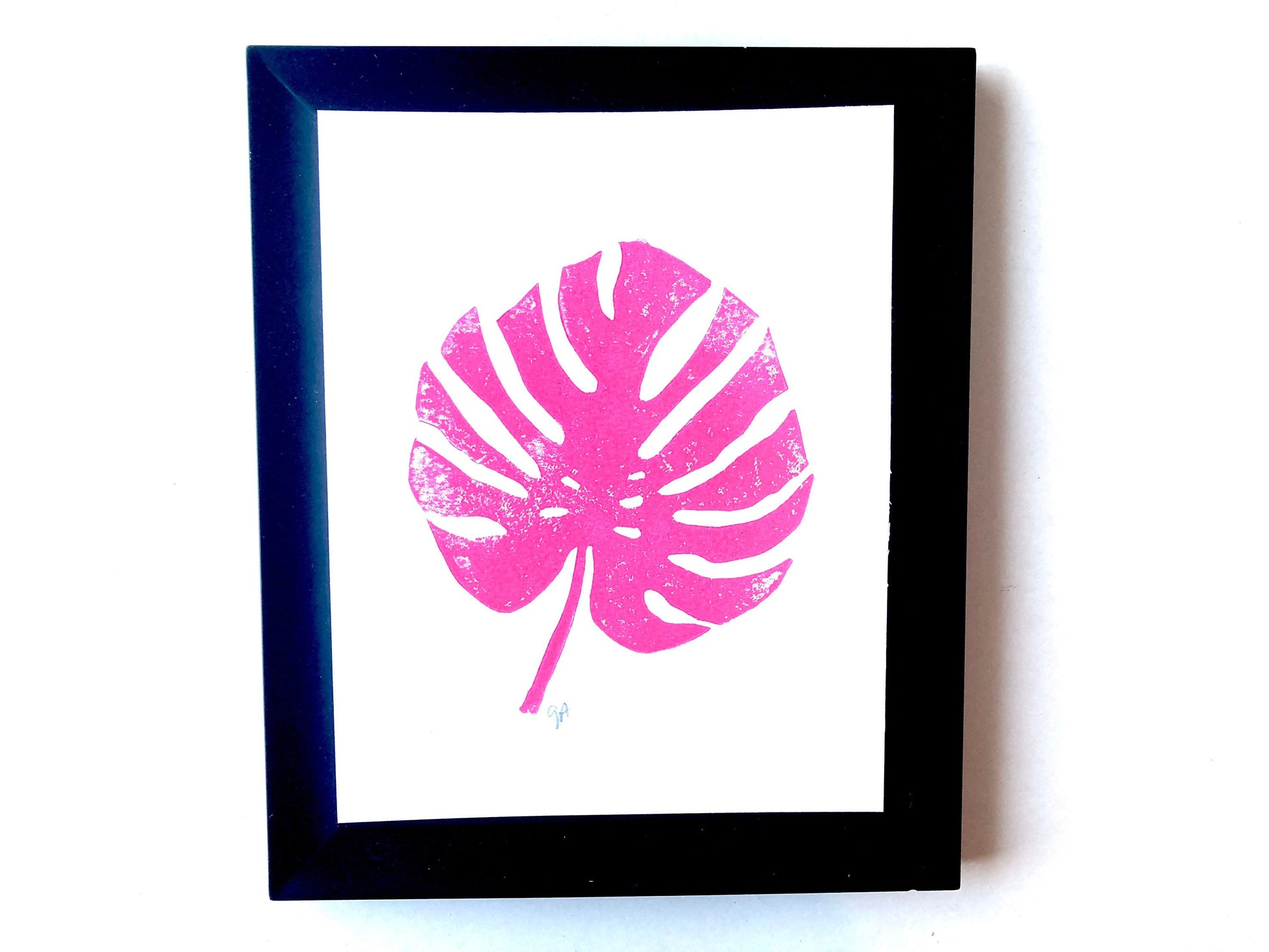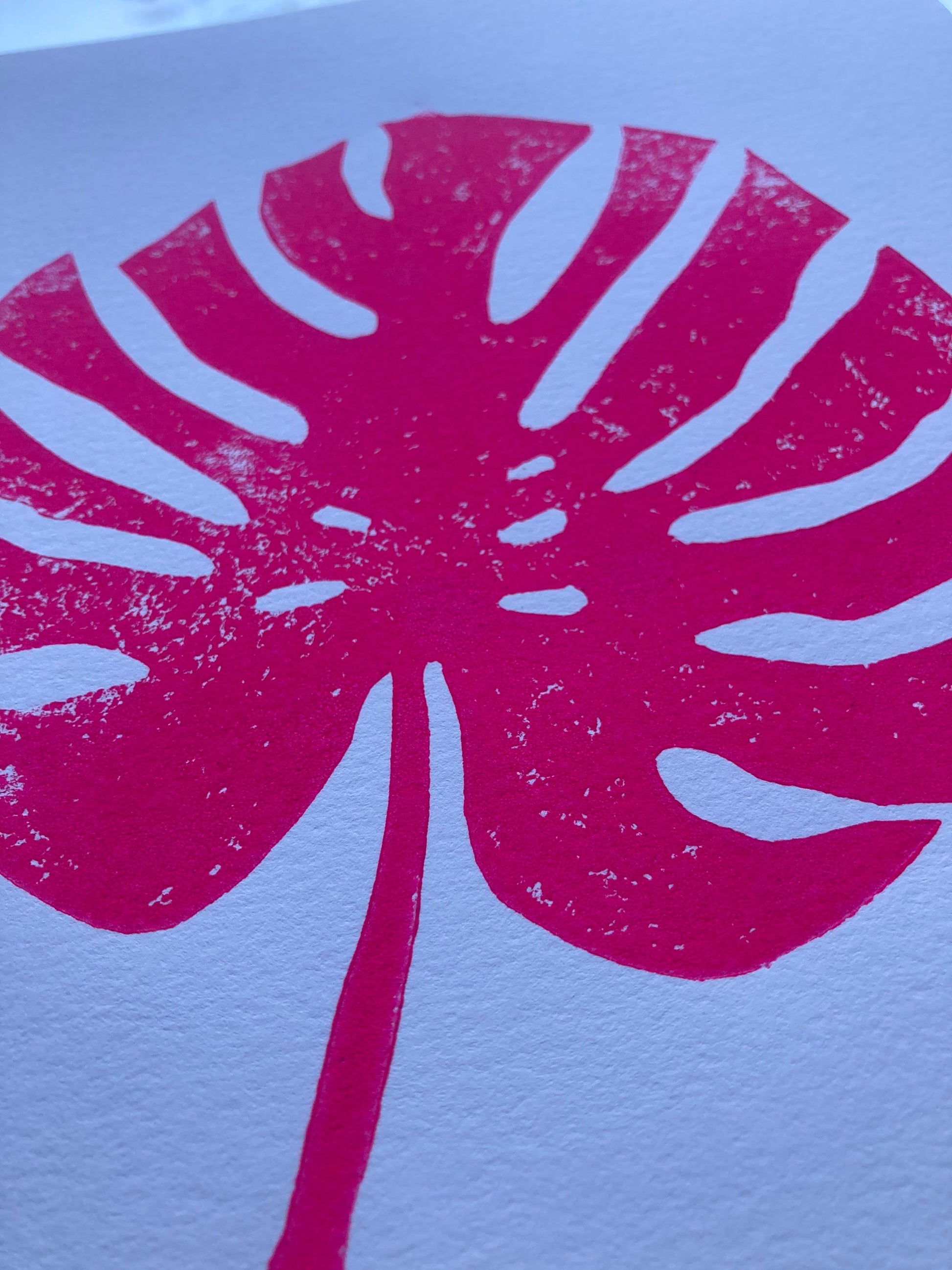Linocut print of a Monstera leaf, in hot pink. 8x10.