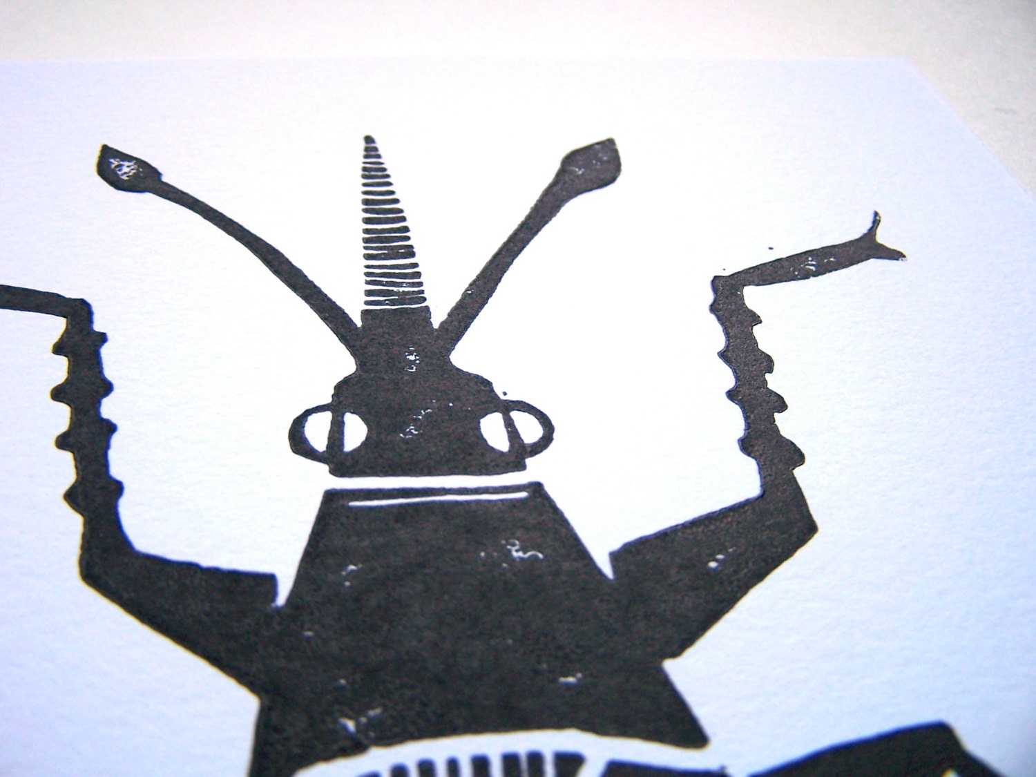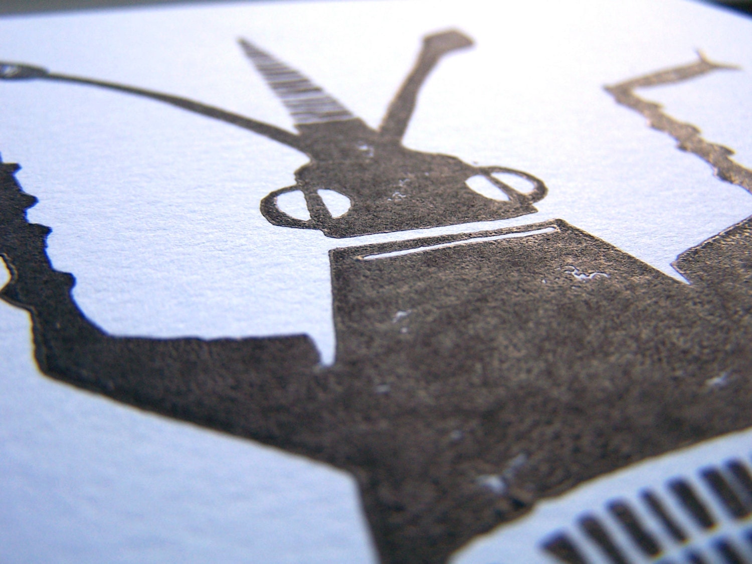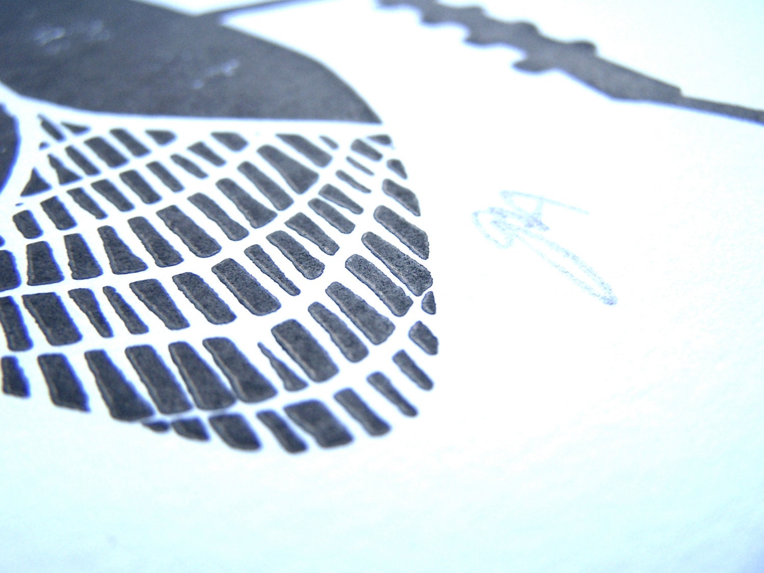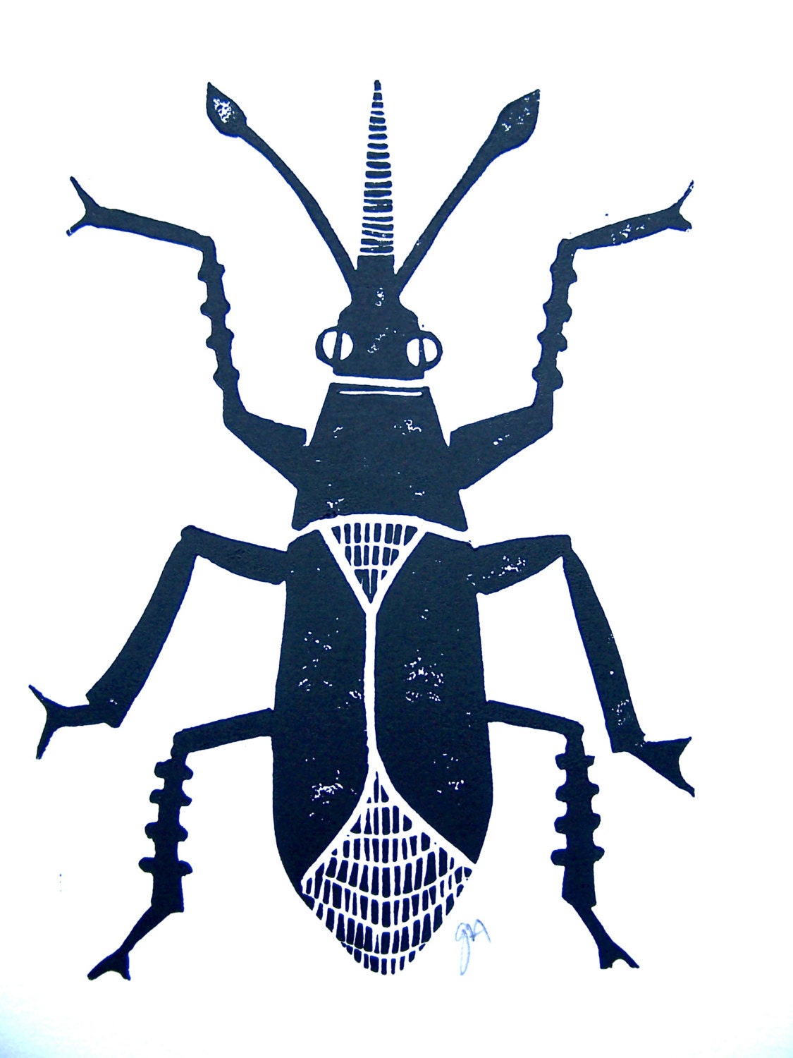 This hand-pulled linoleum block print of a flower beetle is inspired by nuts, bolts, and gears. It is printed in black on thick, cotton letterpress paper. The linoleum block is first carved by hand, then inked, and each linoprint is pressed individually. Due to the printing process, there will be slight variations from print to print. All materials are archival. Wide margins give you room to mat and frame to your liking.