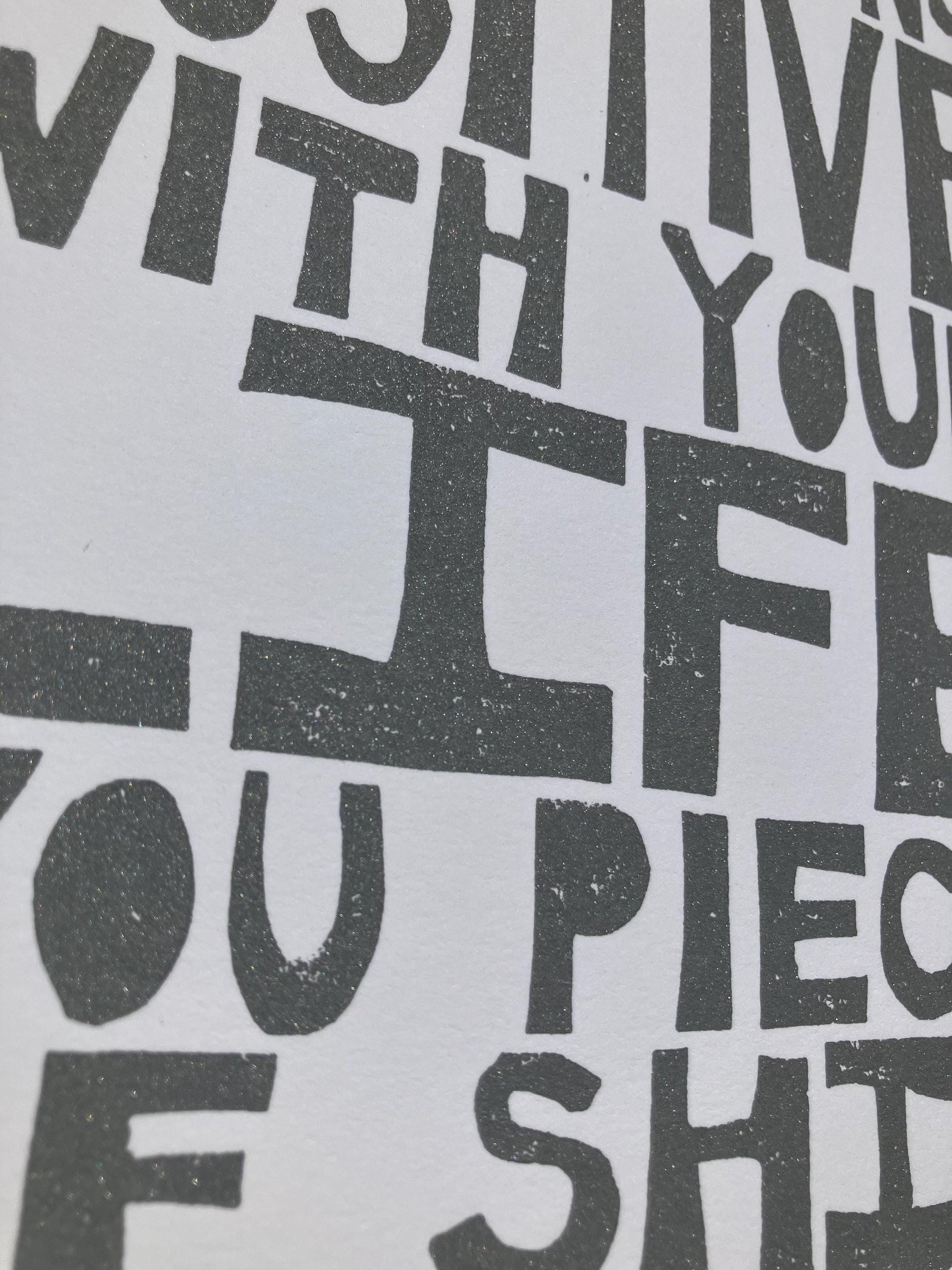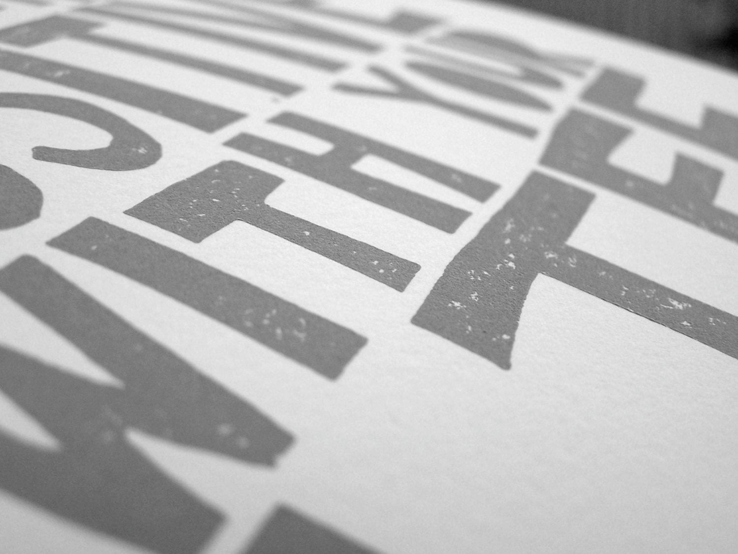This original, hand-pulled typography linocut print was pressed in grey on beautiful cotton paper. The linoleum block is carved by hand, inked, then each piece is printed individually. Due to the printing process, there will be variations from print to print. All materials are permanent and archival.