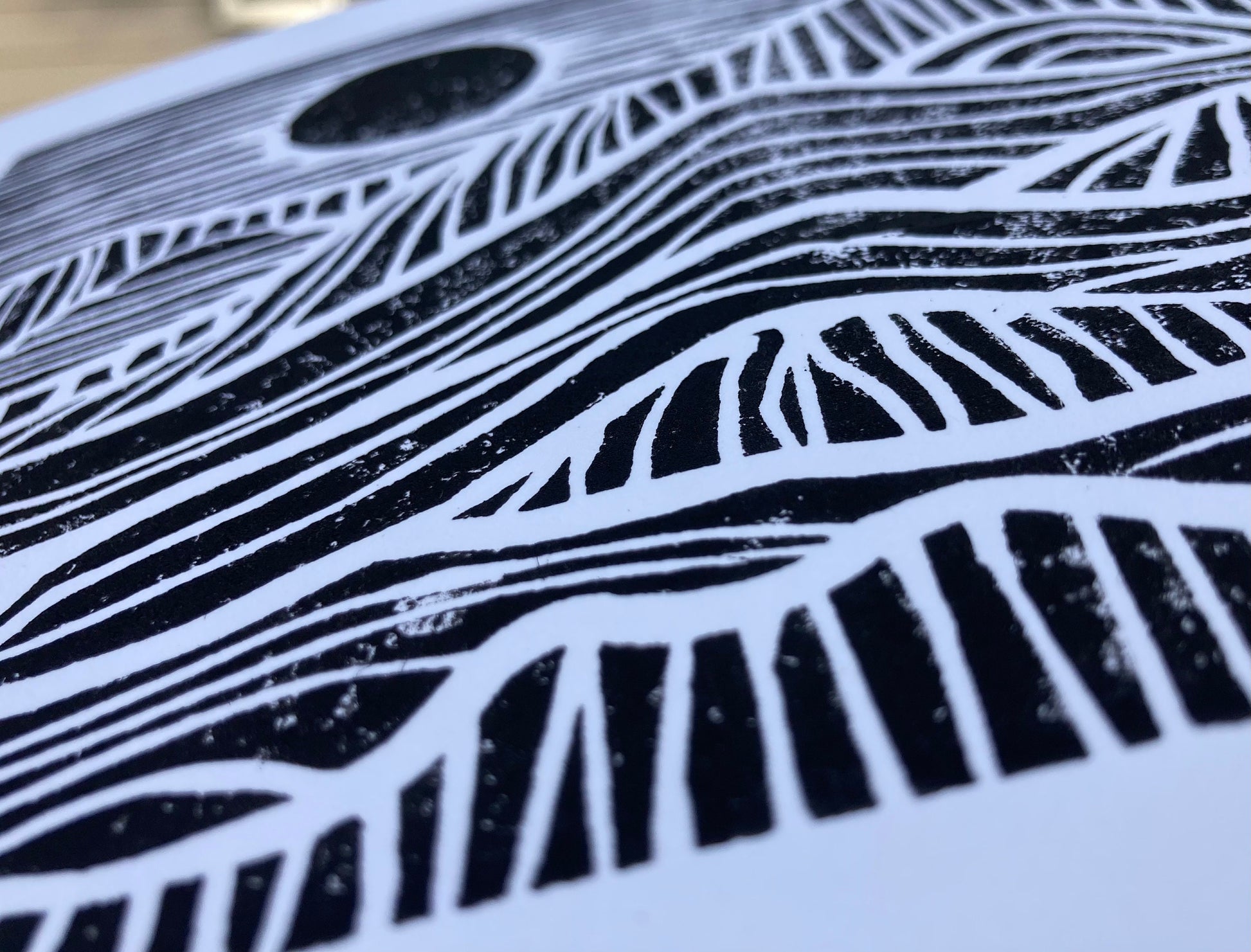 This original, hand-pulled landscape print was hand-pressed in black on beautiful cotton letterpress paper. The linoleum block is cut by hand, inked, then printed individually. Due to the printing process (which is done entirely by hand), there will be variations from print to print giving you an original and unique piece of artwork! All materials are archival.