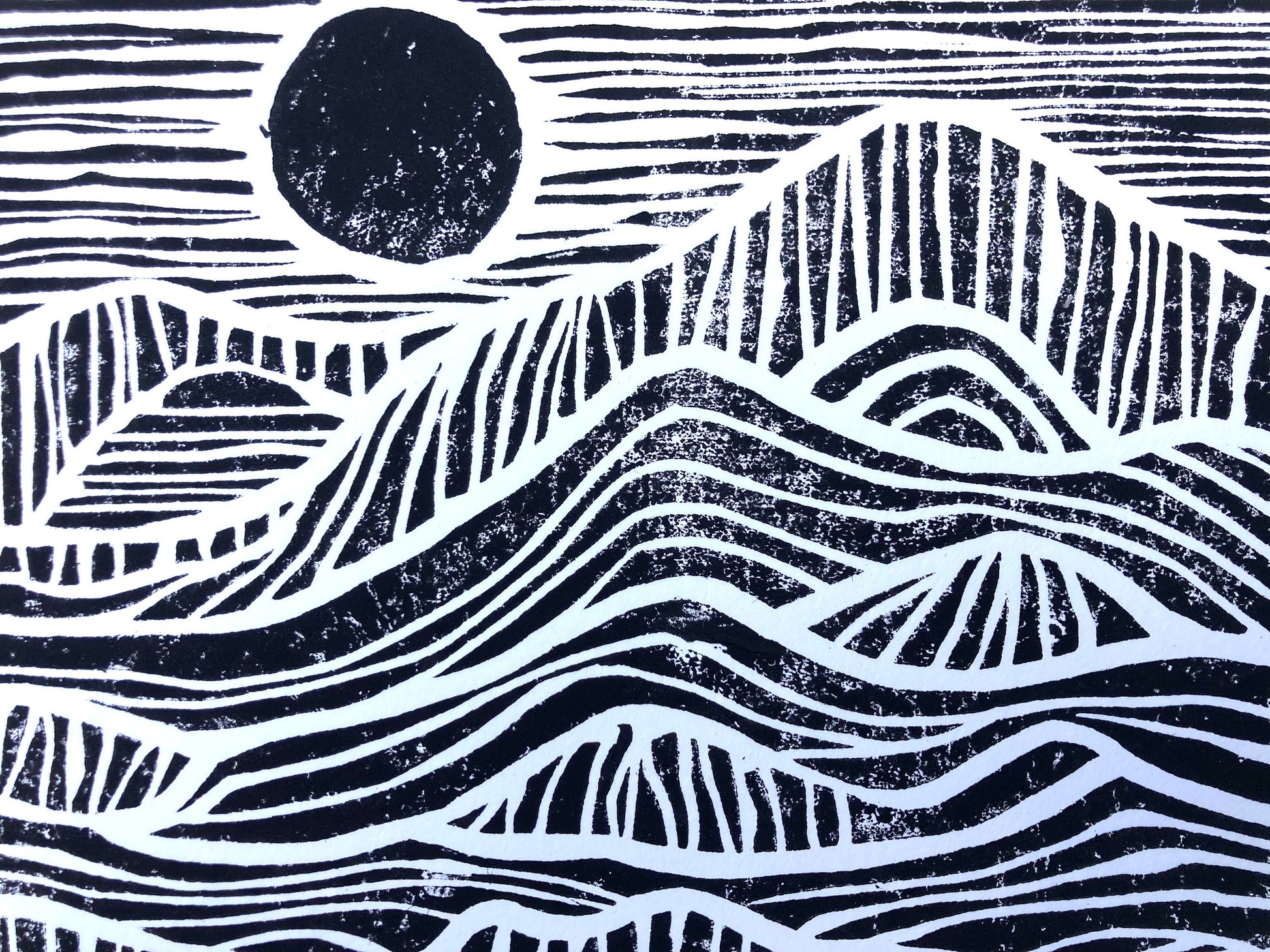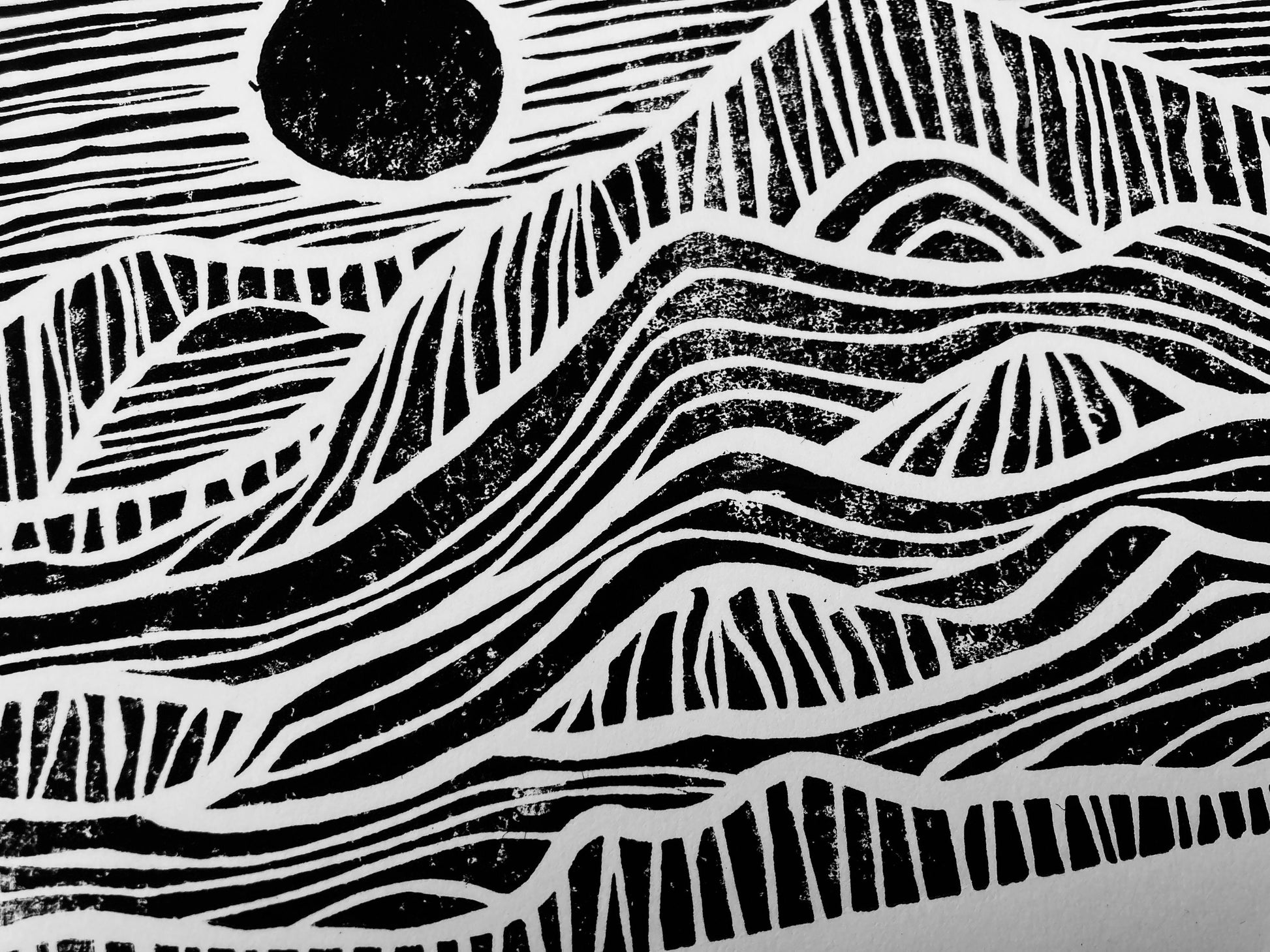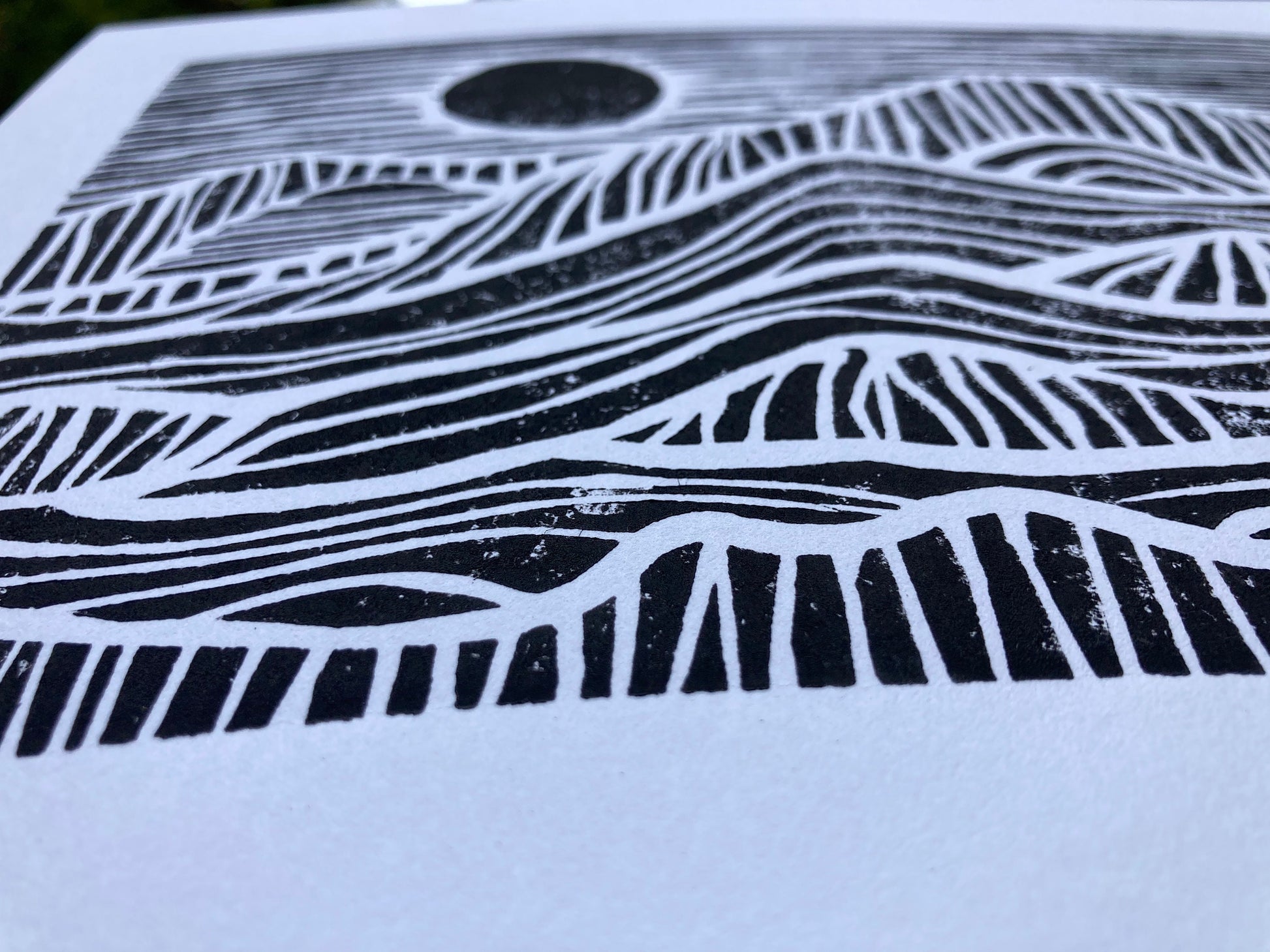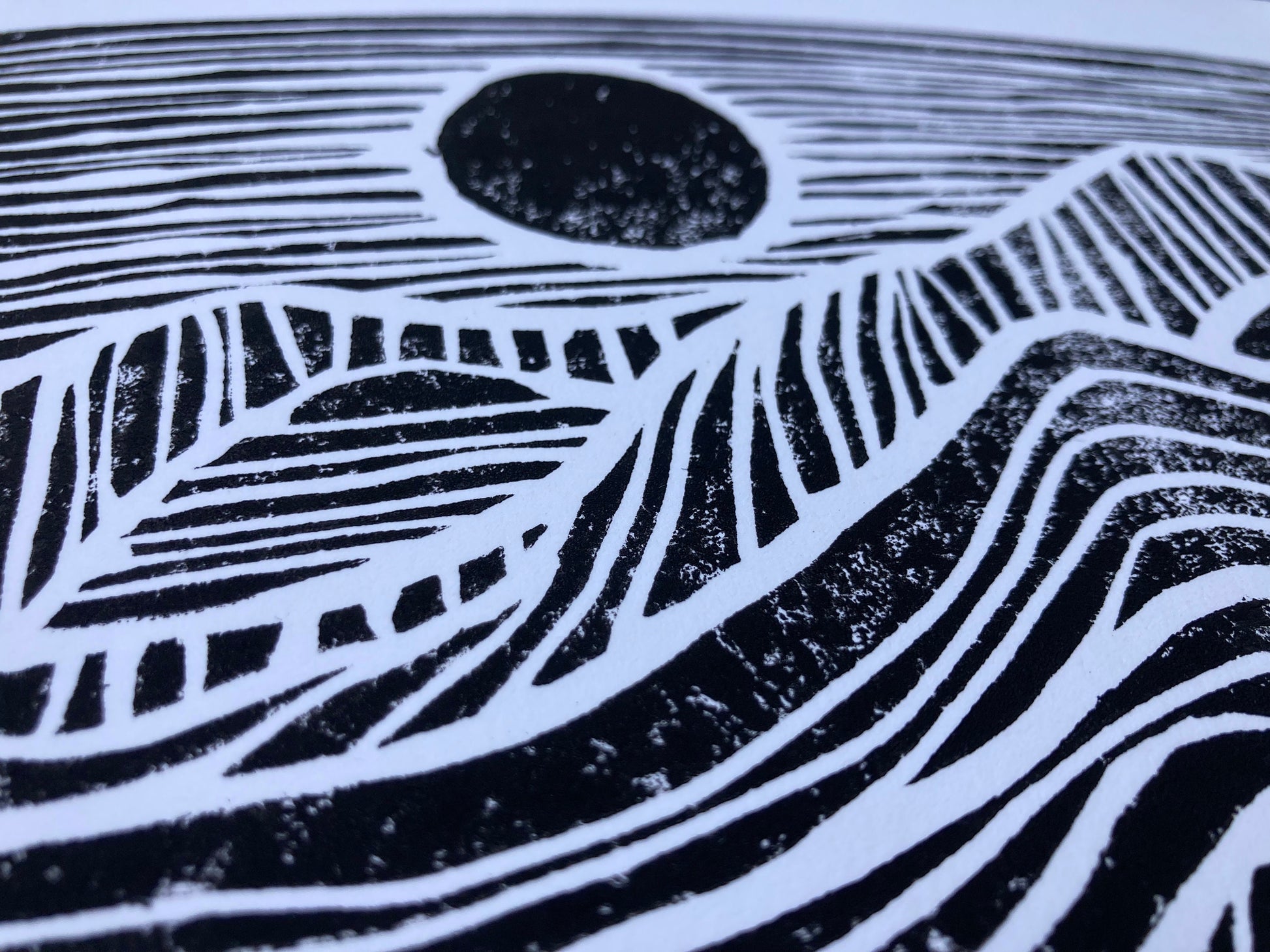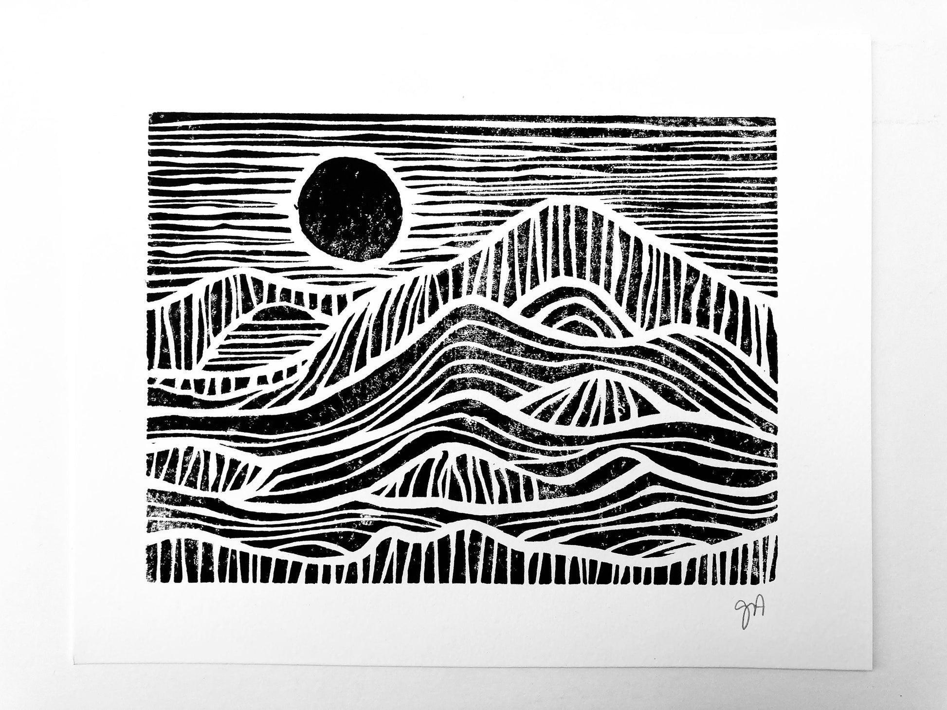 Sunrise on the mountains - linocut relief print in black - 8x10