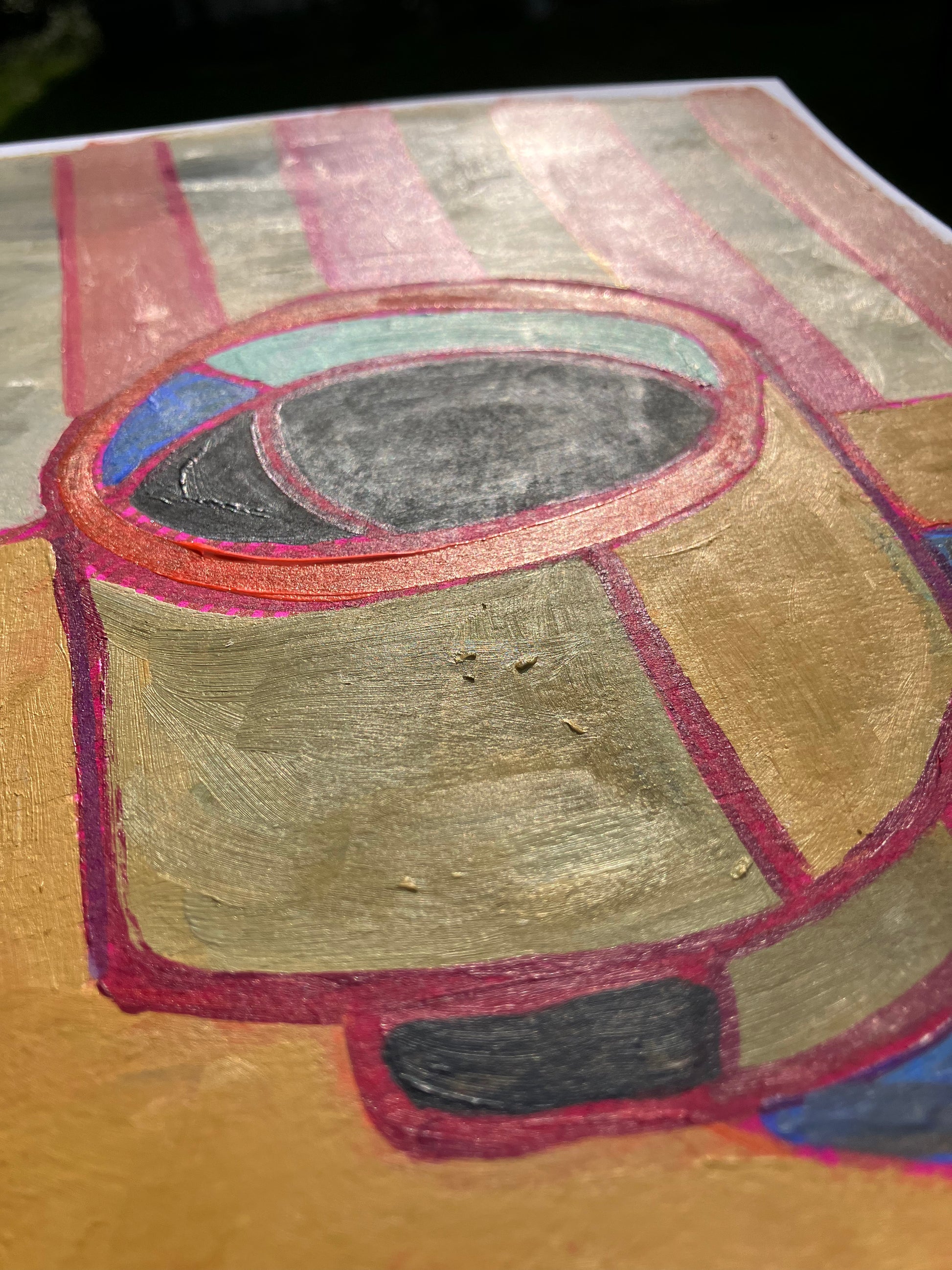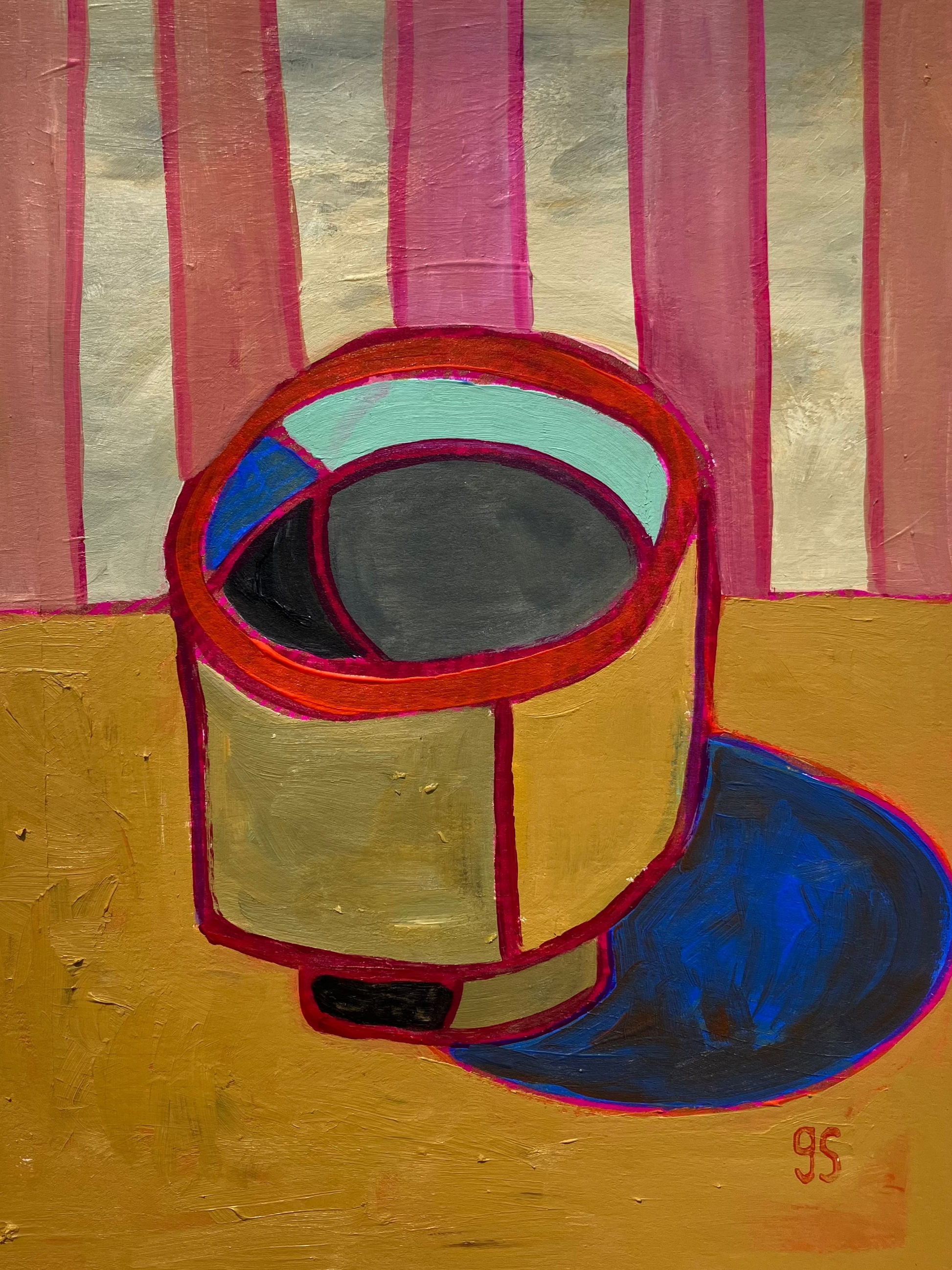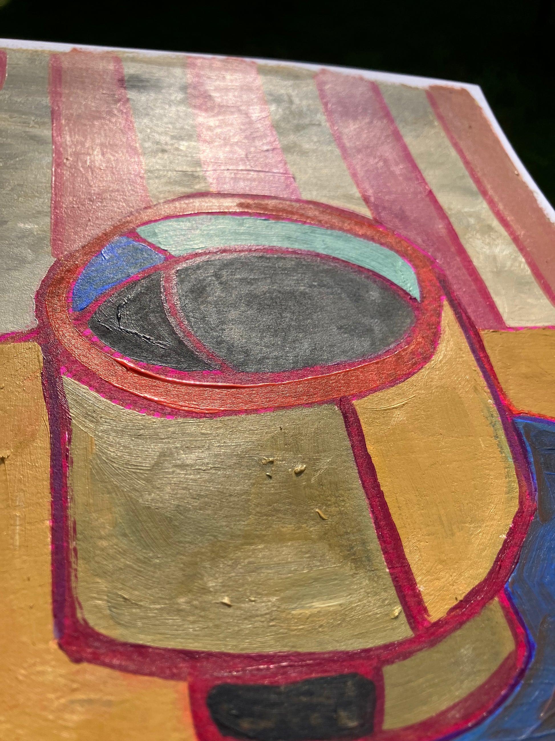 This original 8x10" acrylic painting of a coffee cup was painted in various blue, ochre, and pink on thick cotton paper.