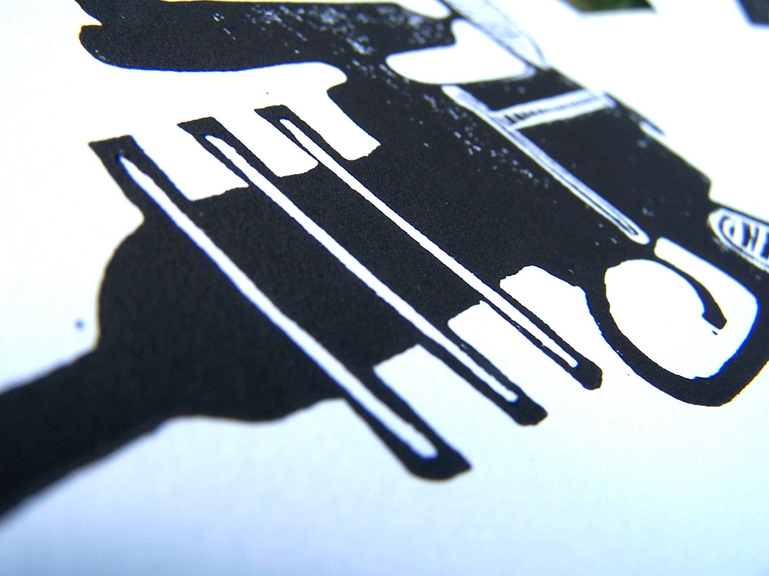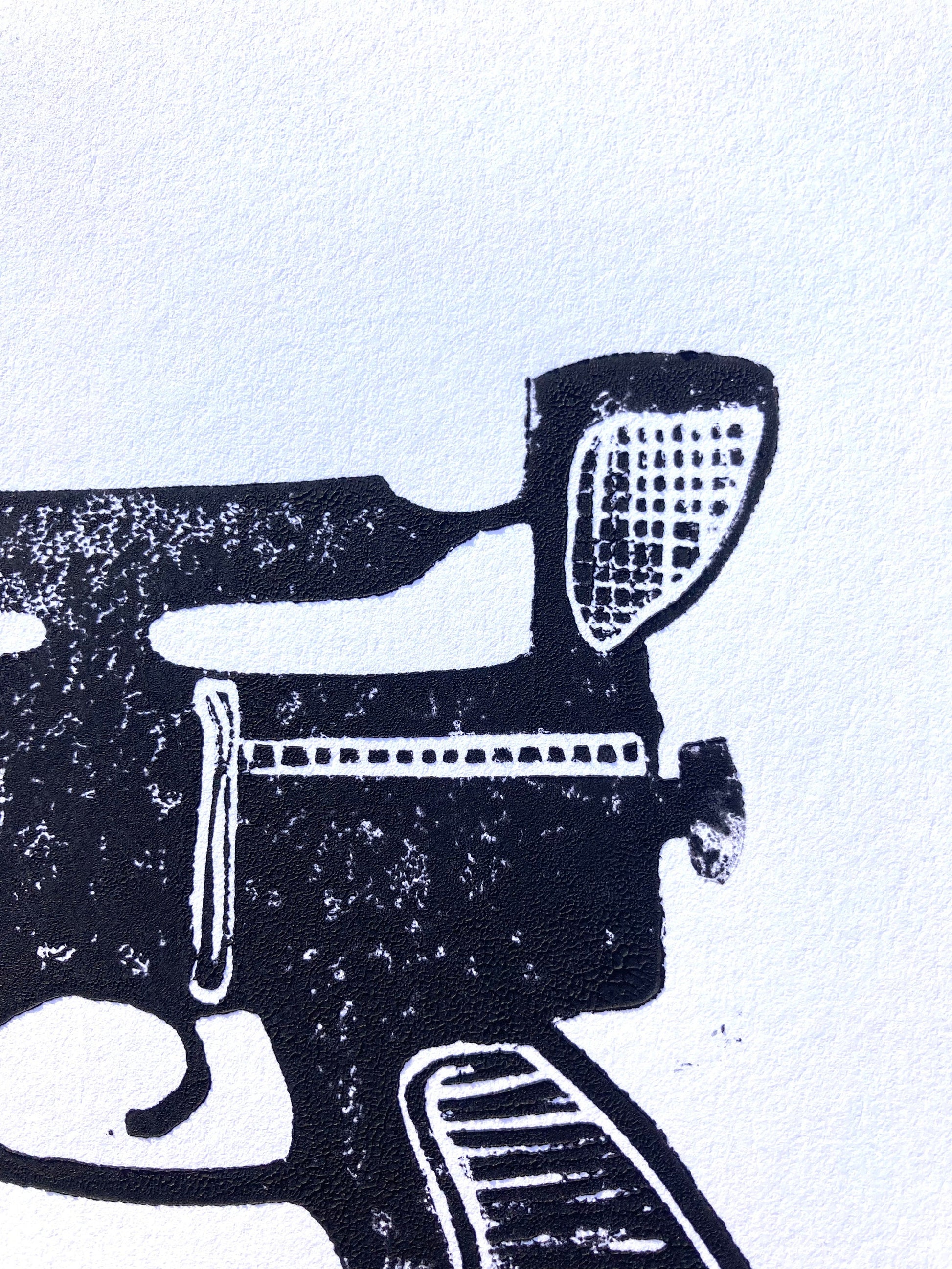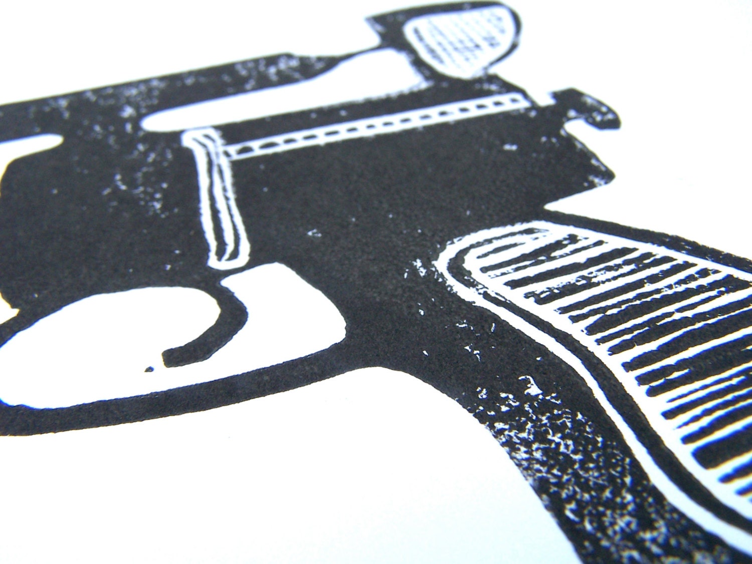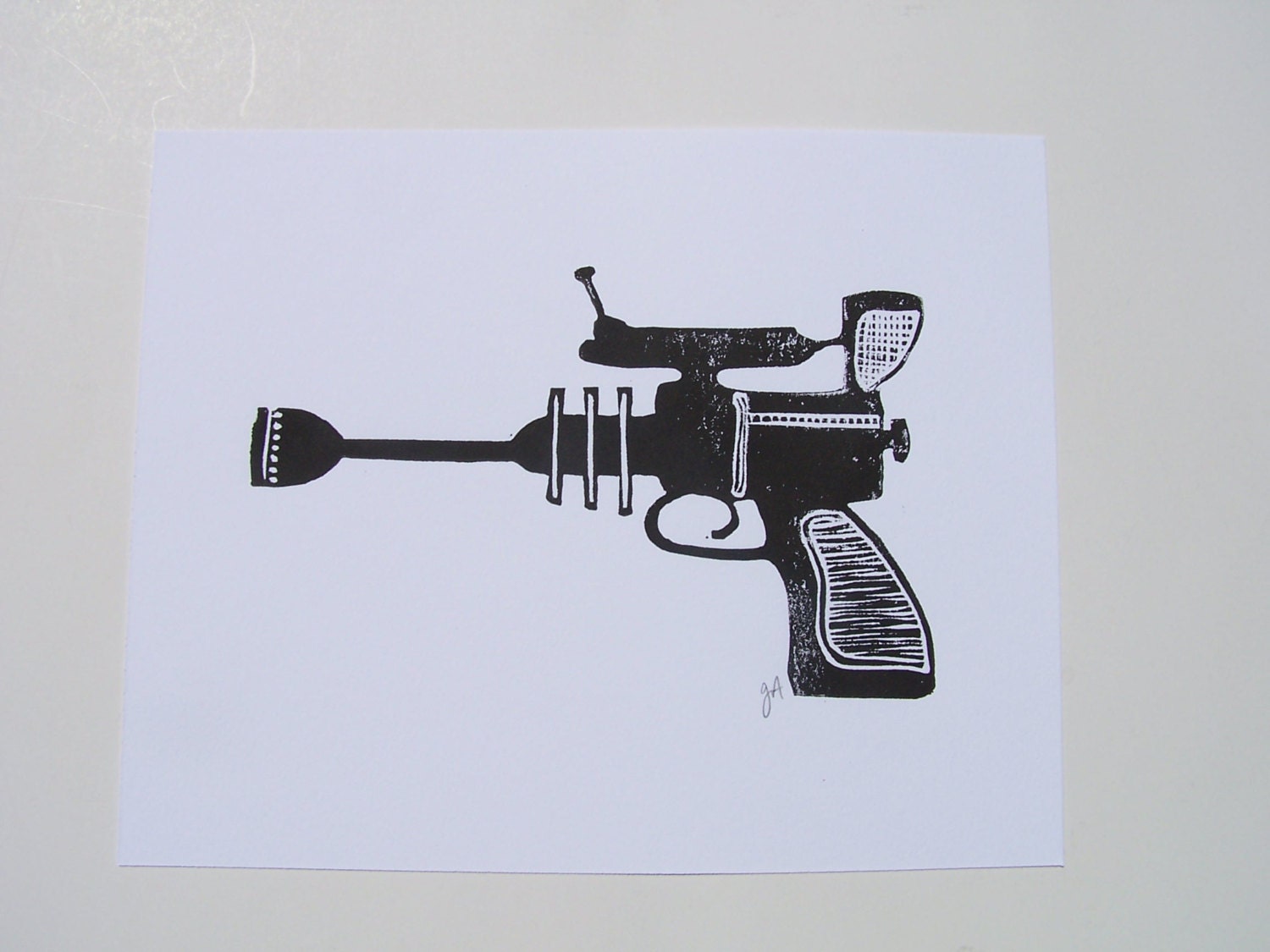 This original, hand-pulled linocut poster of a retro ray gun was printed in black on thick 100% cotton paper. The linoleum block is cut by hand, inked, then each linoprint is pressed individually. Due to the printmaking process, there will be variations from print to print. This gives you an original piece of art. All materials are archival.