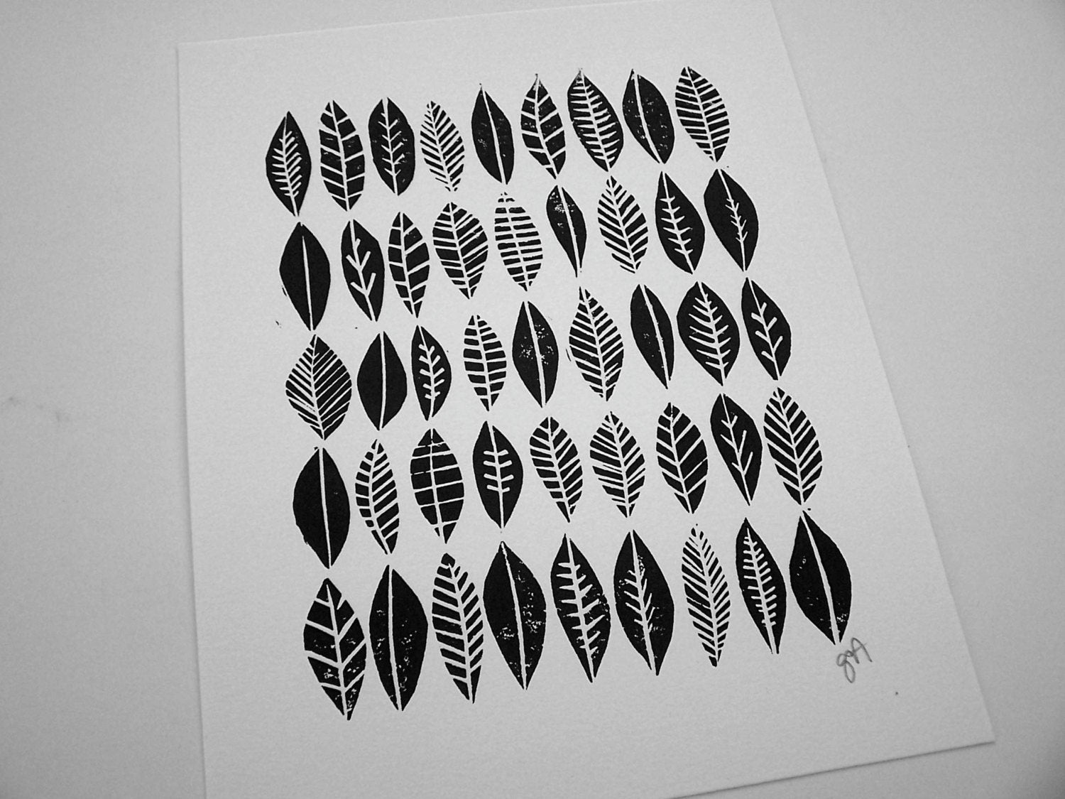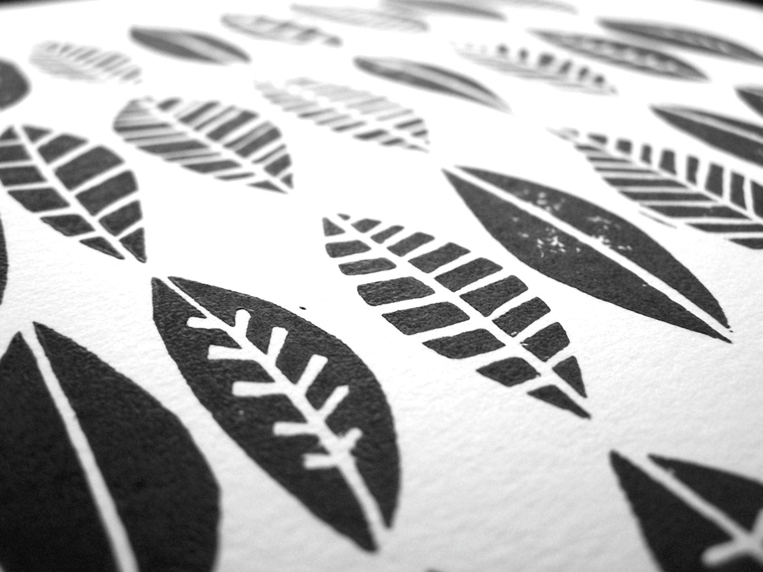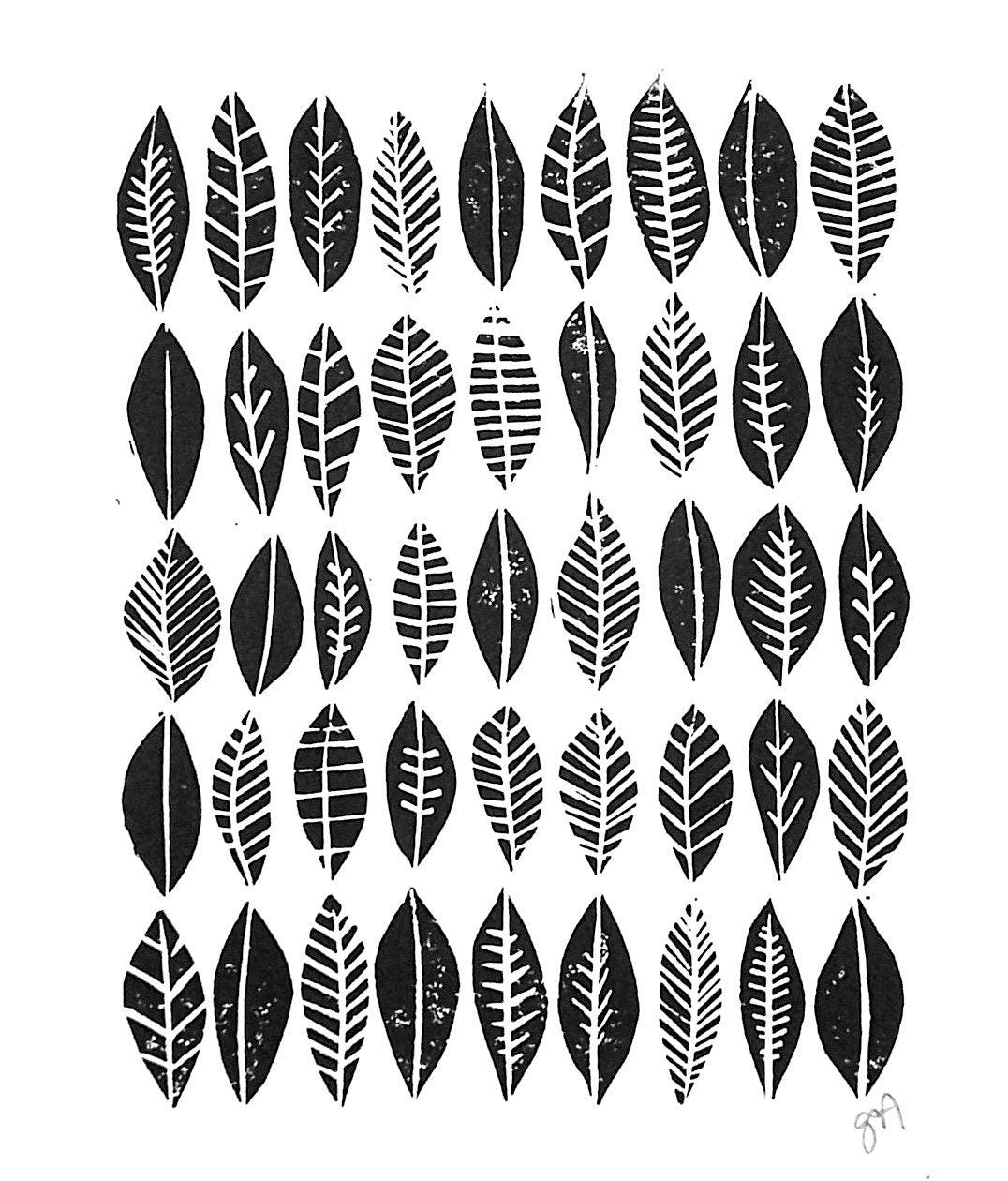 This original, hand-pulled linoleum block relief print of a leaf collection was printed in black on beautiful cotton letterpress paper. The linoleum block is cut by hand, inked, then each print is pressed individually. Due to the printing process, there will be slight variations from print to print. All materials are archival. Wide margins give you room to mat and frame to your liking.