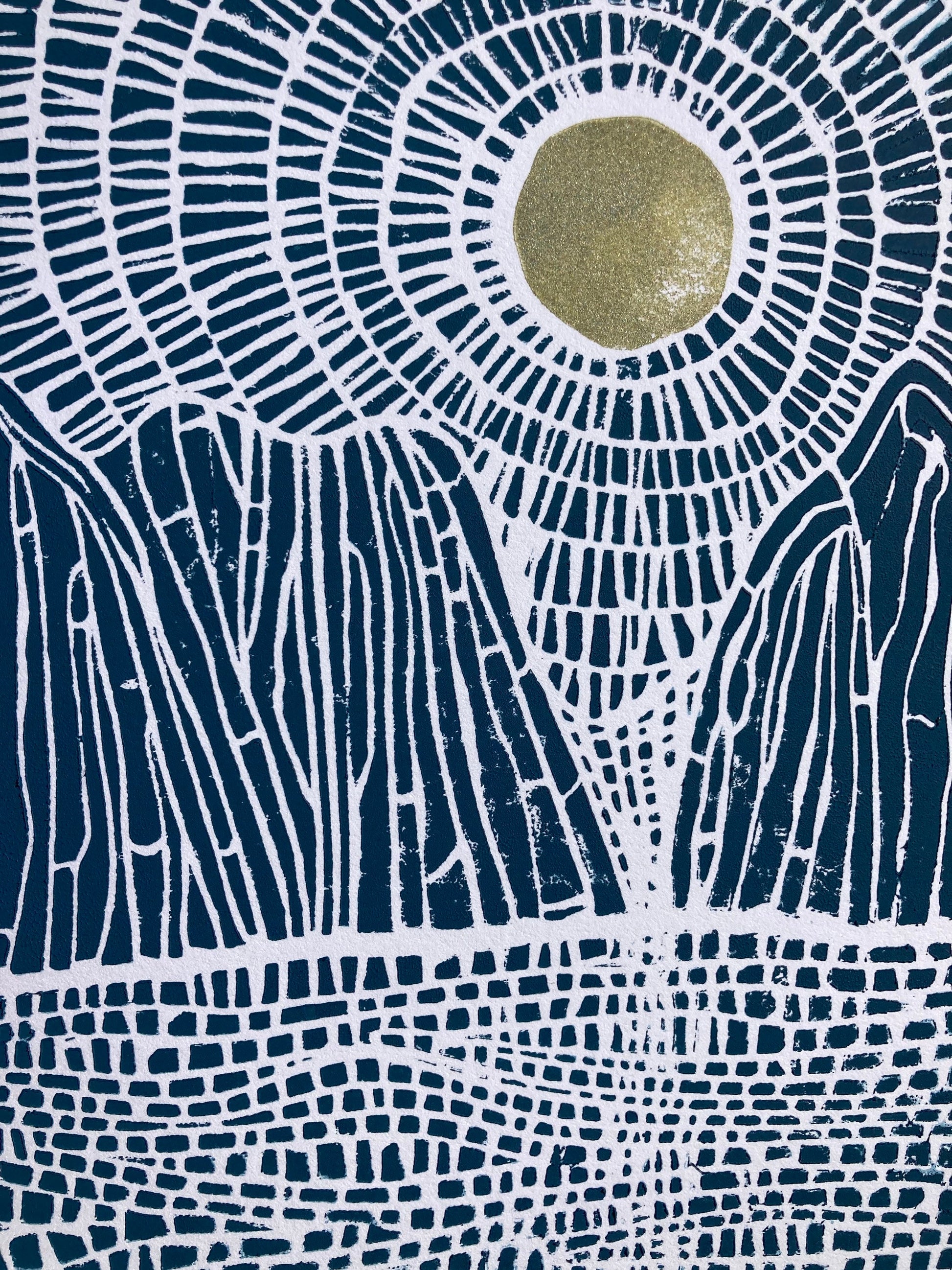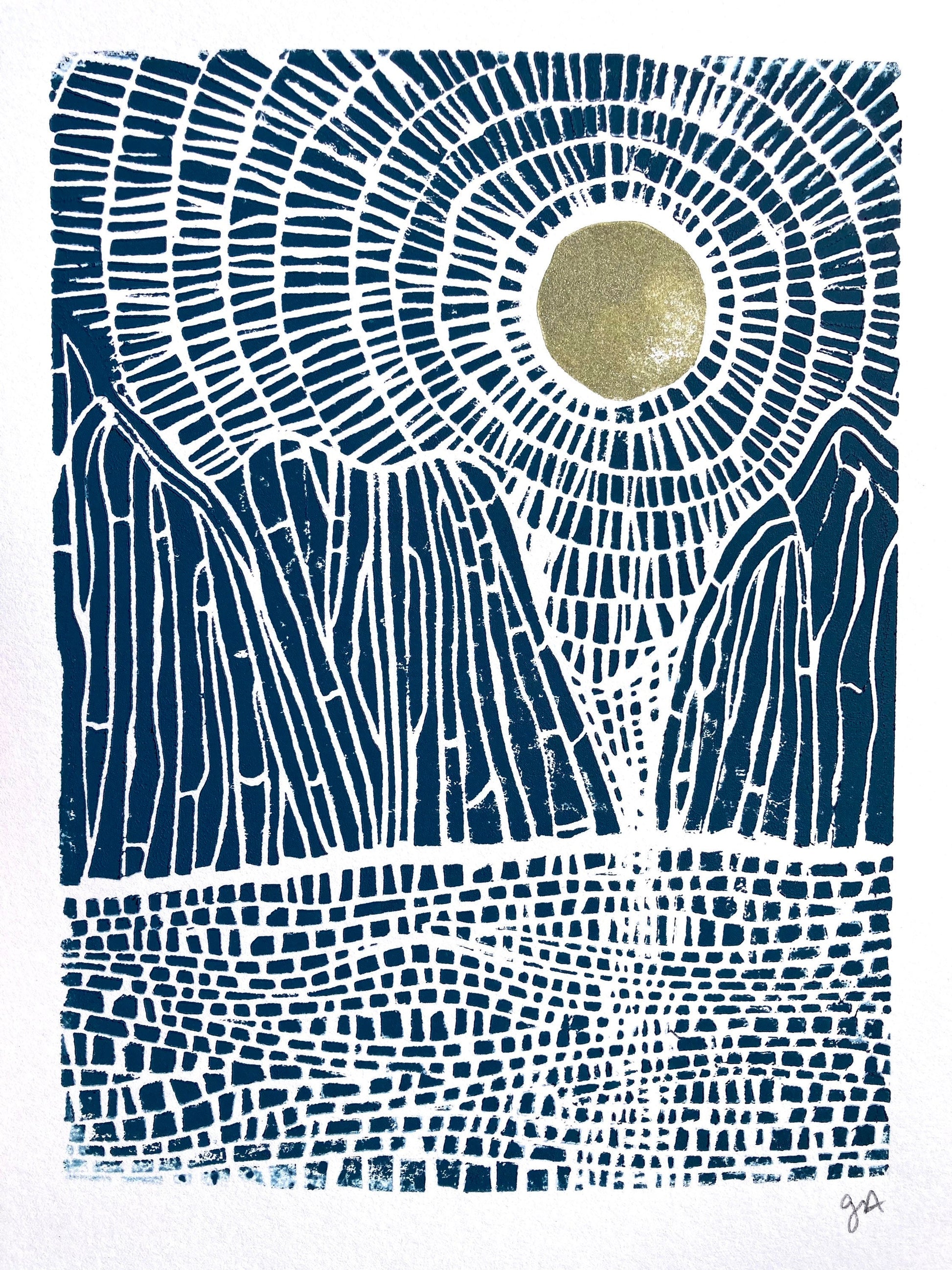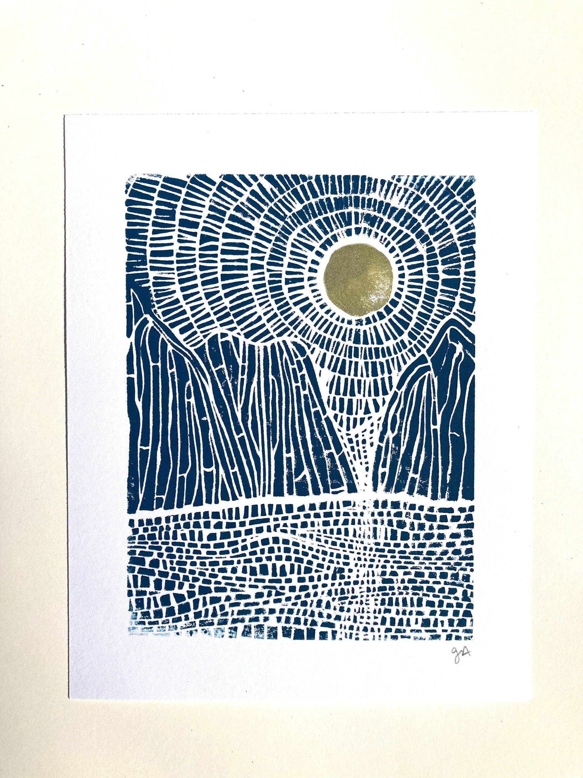 This original hand-pulled print of the moon on the ocean and mountains was hand-pressed in dark blue on beautiful cotton letterpress paper. The linoleum block is carved by hand, inked, then each piece is printed individually. Due to the printing process (which is done entirely by hand), there will be variations from print to print. All materials are archival.