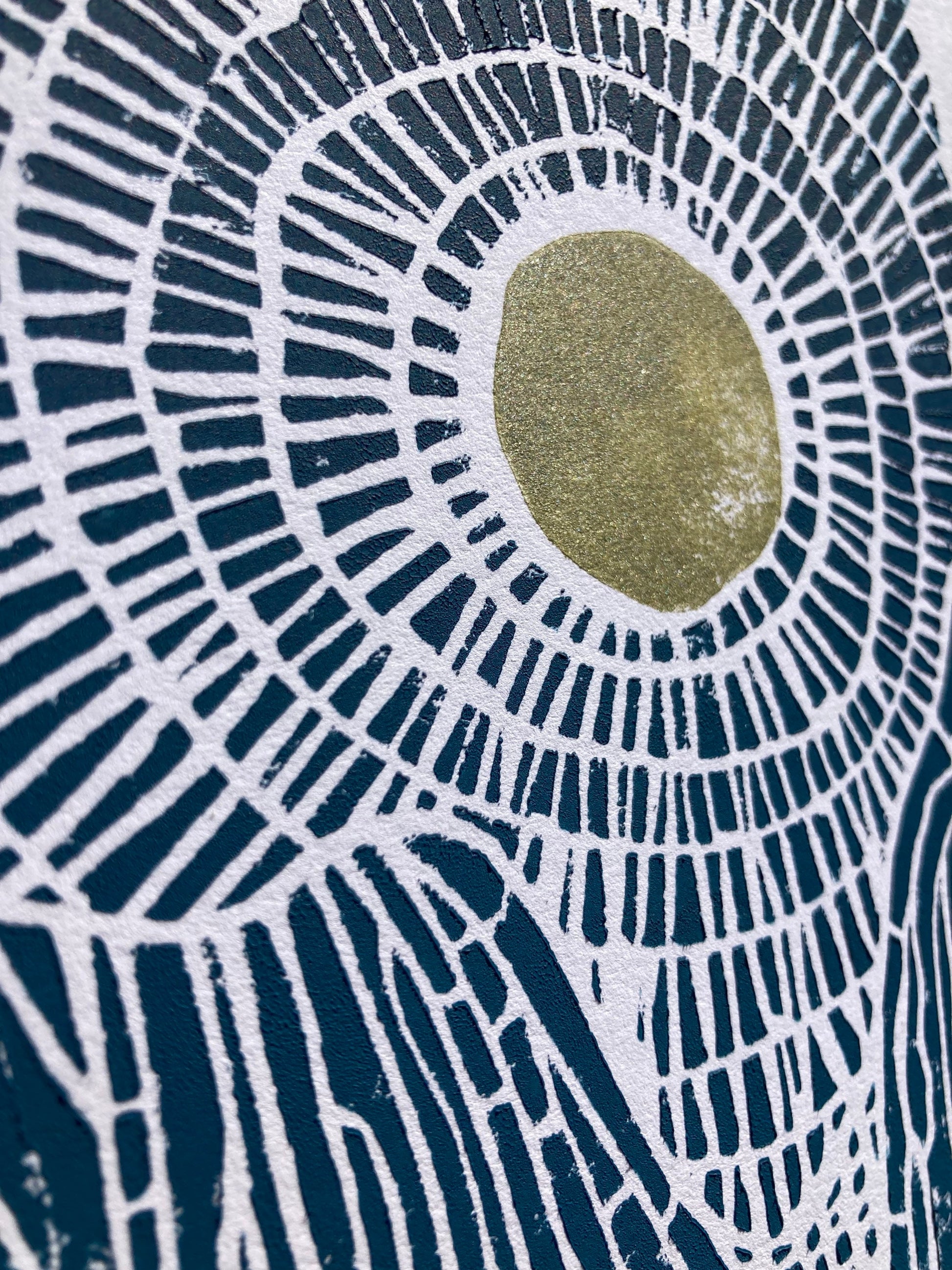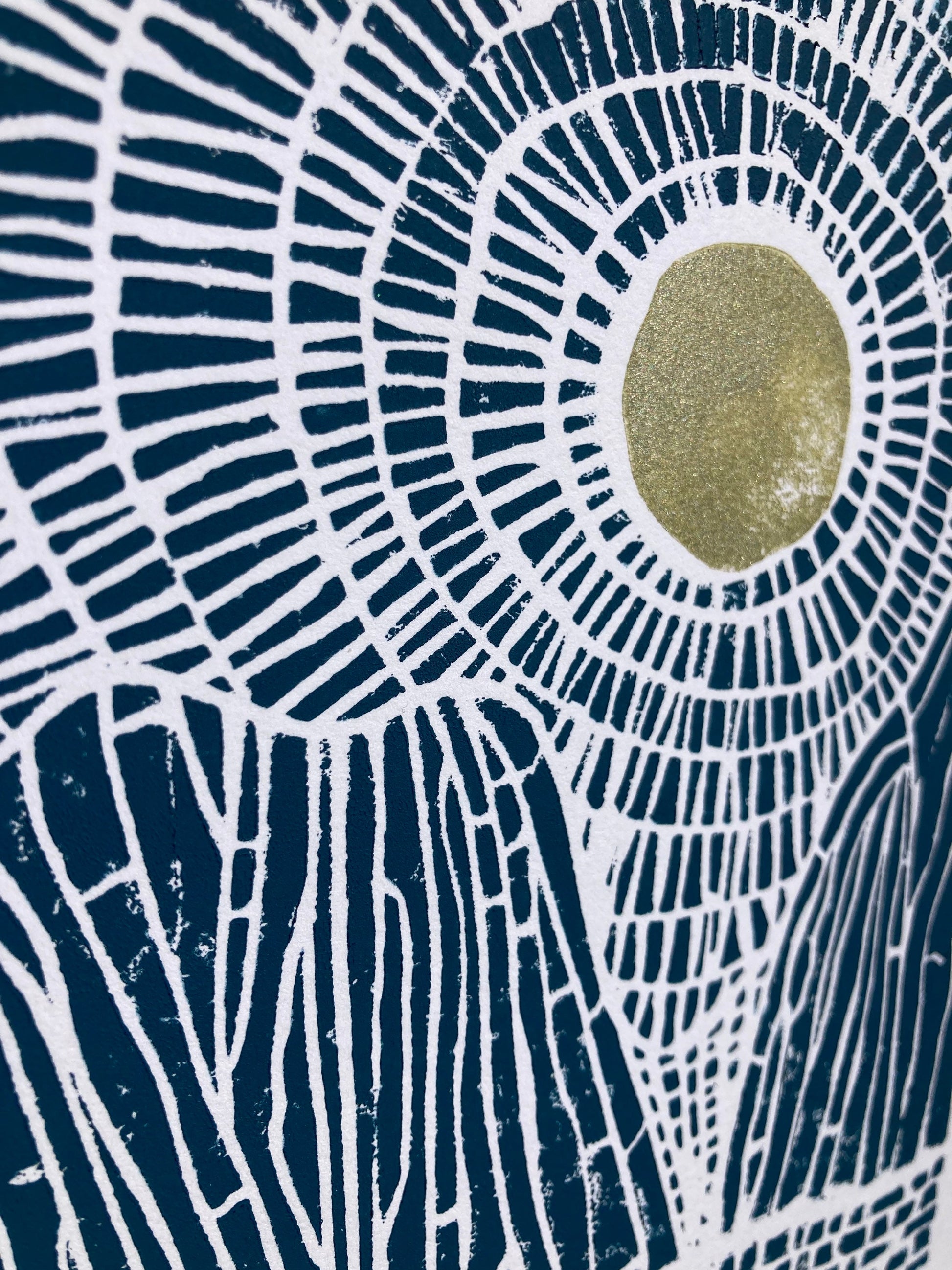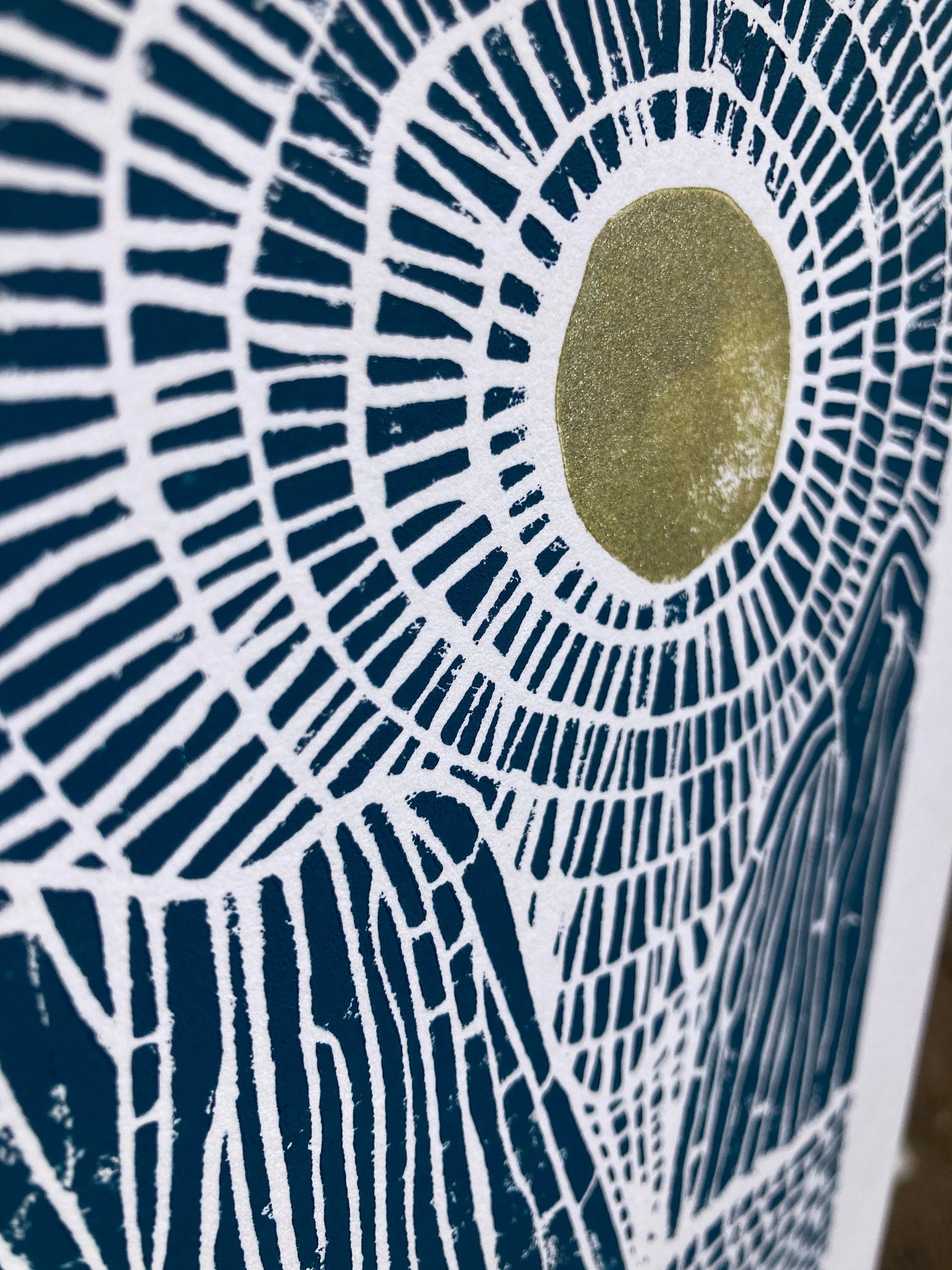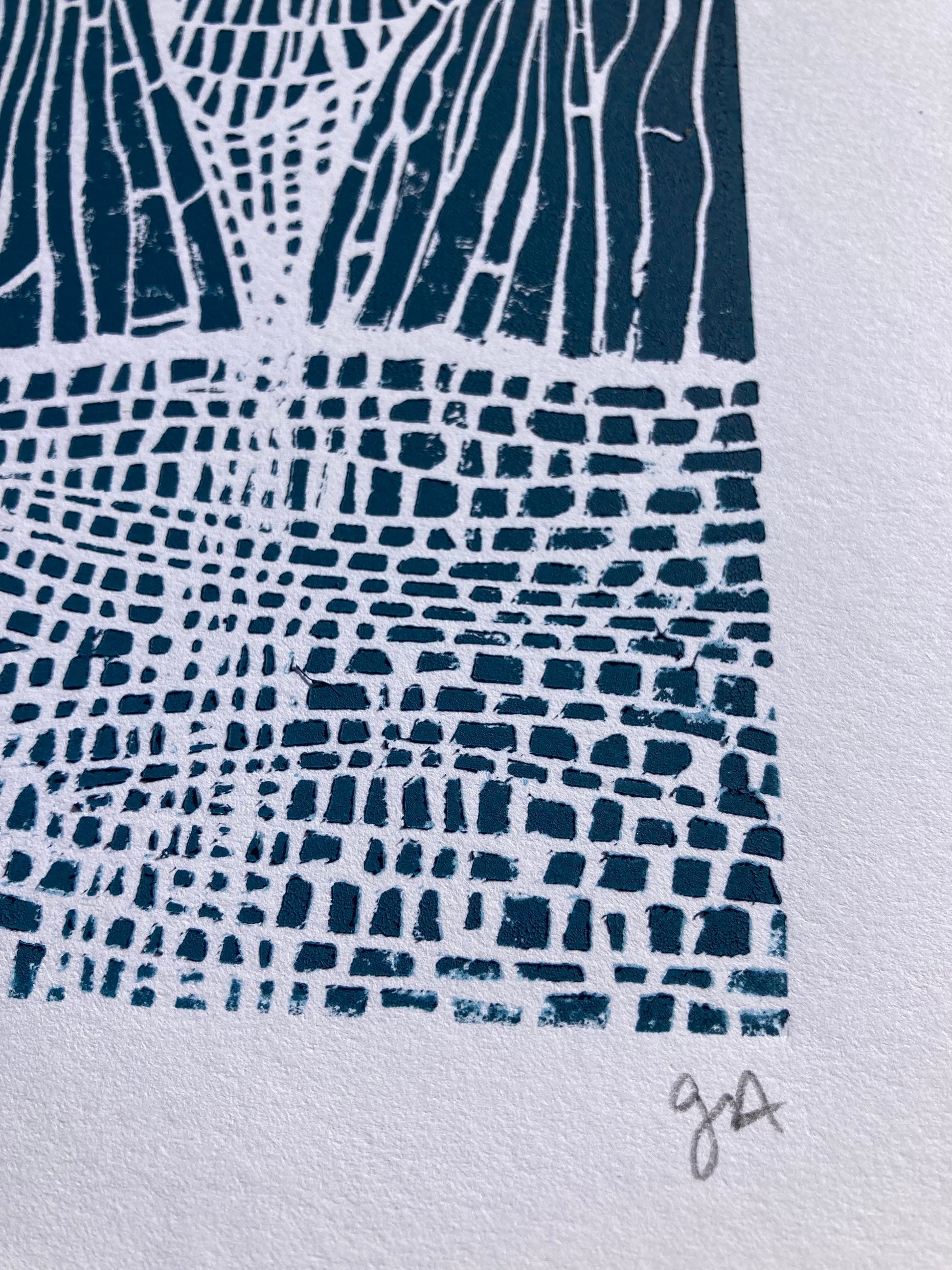 This original hand-pulled print of the moon on the ocean and mountains was hand-pressed in dark blue on beautiful cotton letterpress paper. The linoleum block is carved by hand, inked, then each piece is printed individually. Due to the printing process (which is done entirely by hand), there will be variations from print to print. All materials are archival.