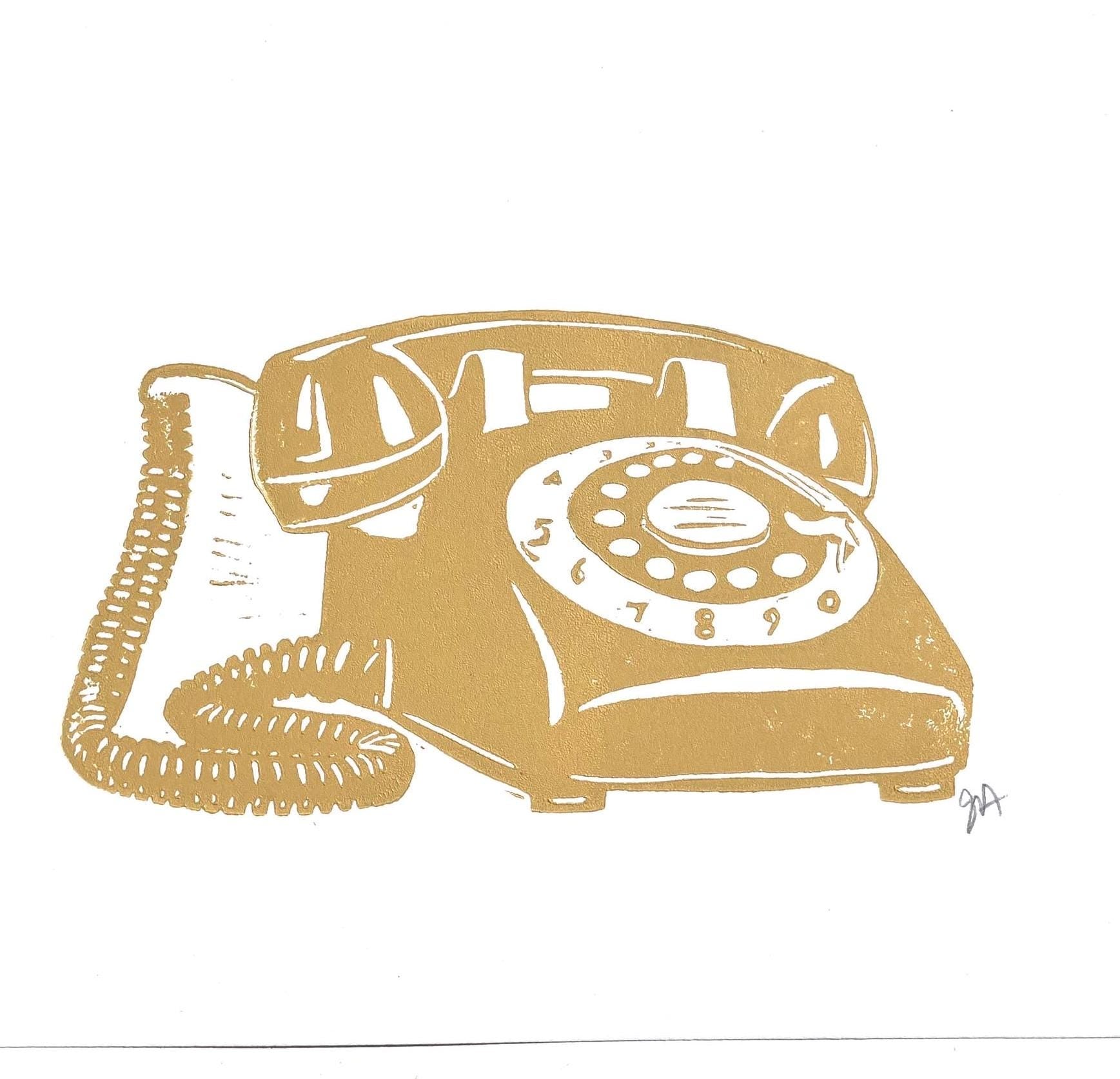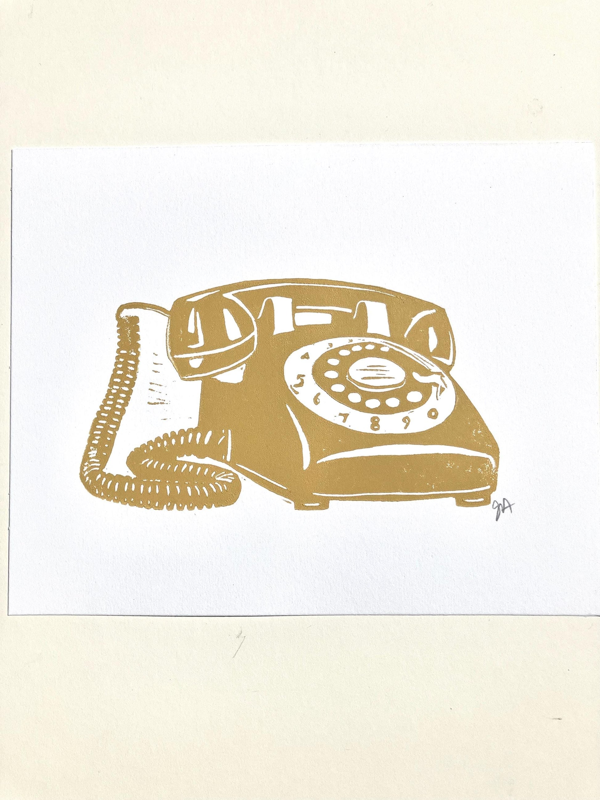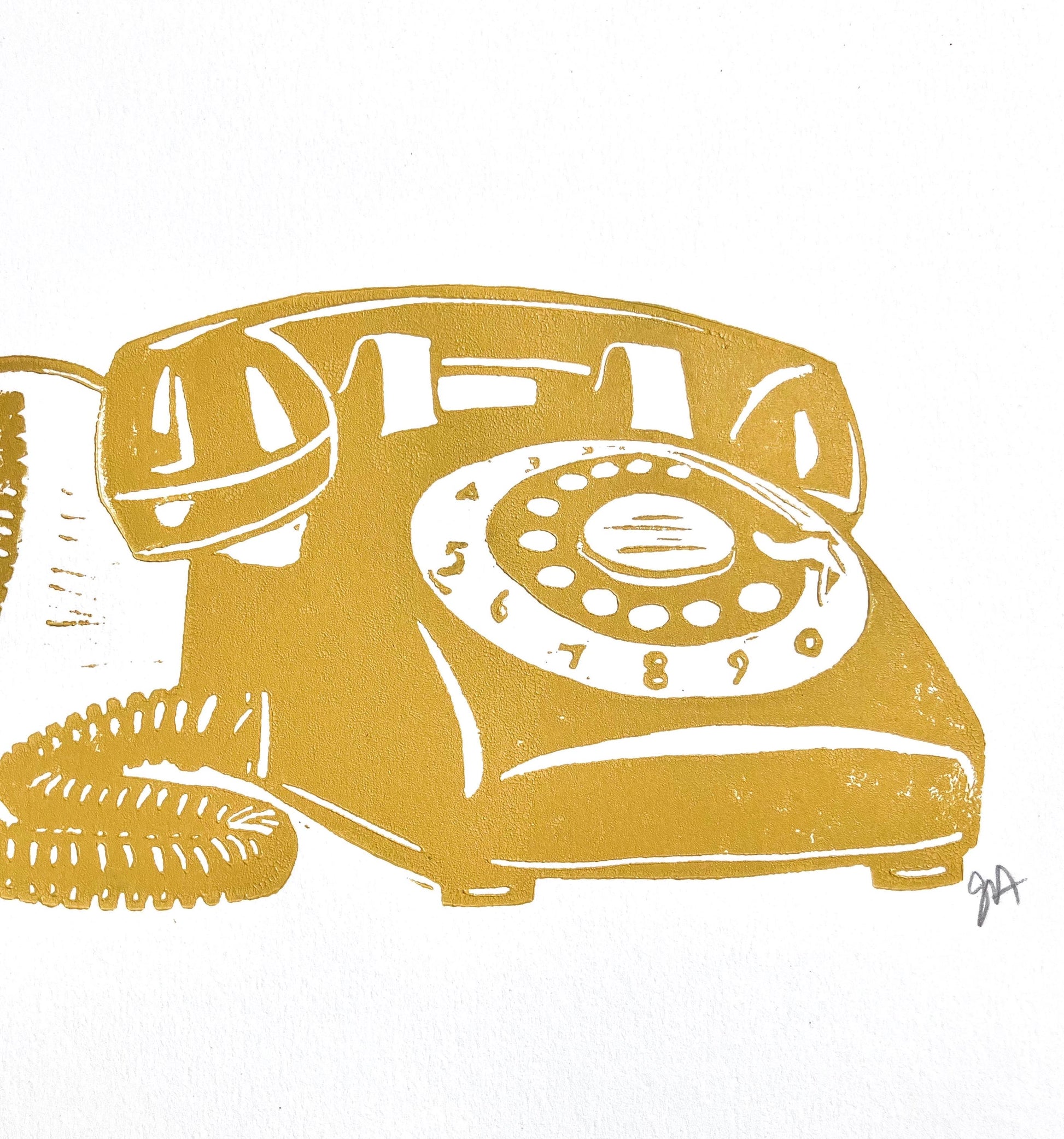 Vintage rotary phone - linoprint in mustard yellow This original, hand-pulled linoleum block print of a vintage telephone was hand-pressed in mustard yellow on beautiful cotton paper. The linoleum block is carved by hand, inked, then each block is printed individually. Due to the printmaking process, there will be variations from print to print giving you a one-of-a-kind piece of art! All materials are archival. Remember the dial tone?