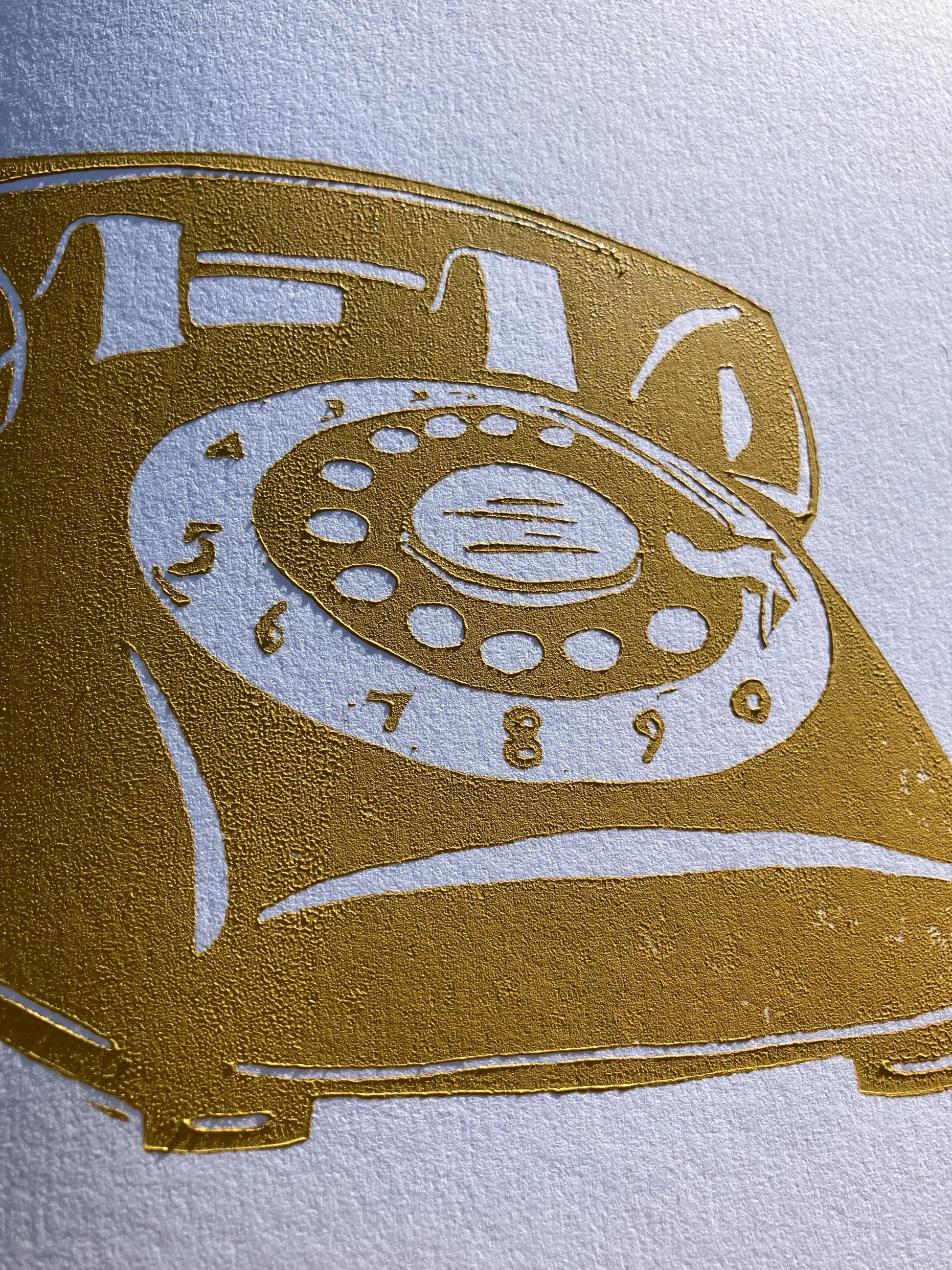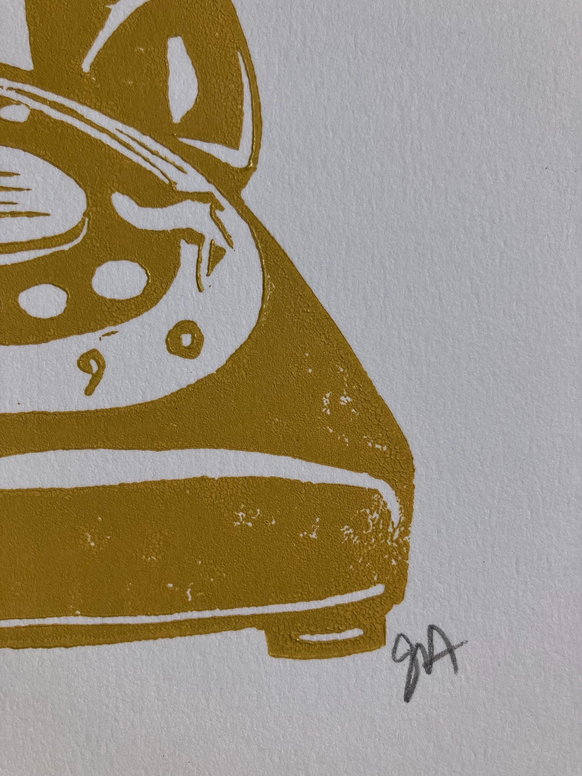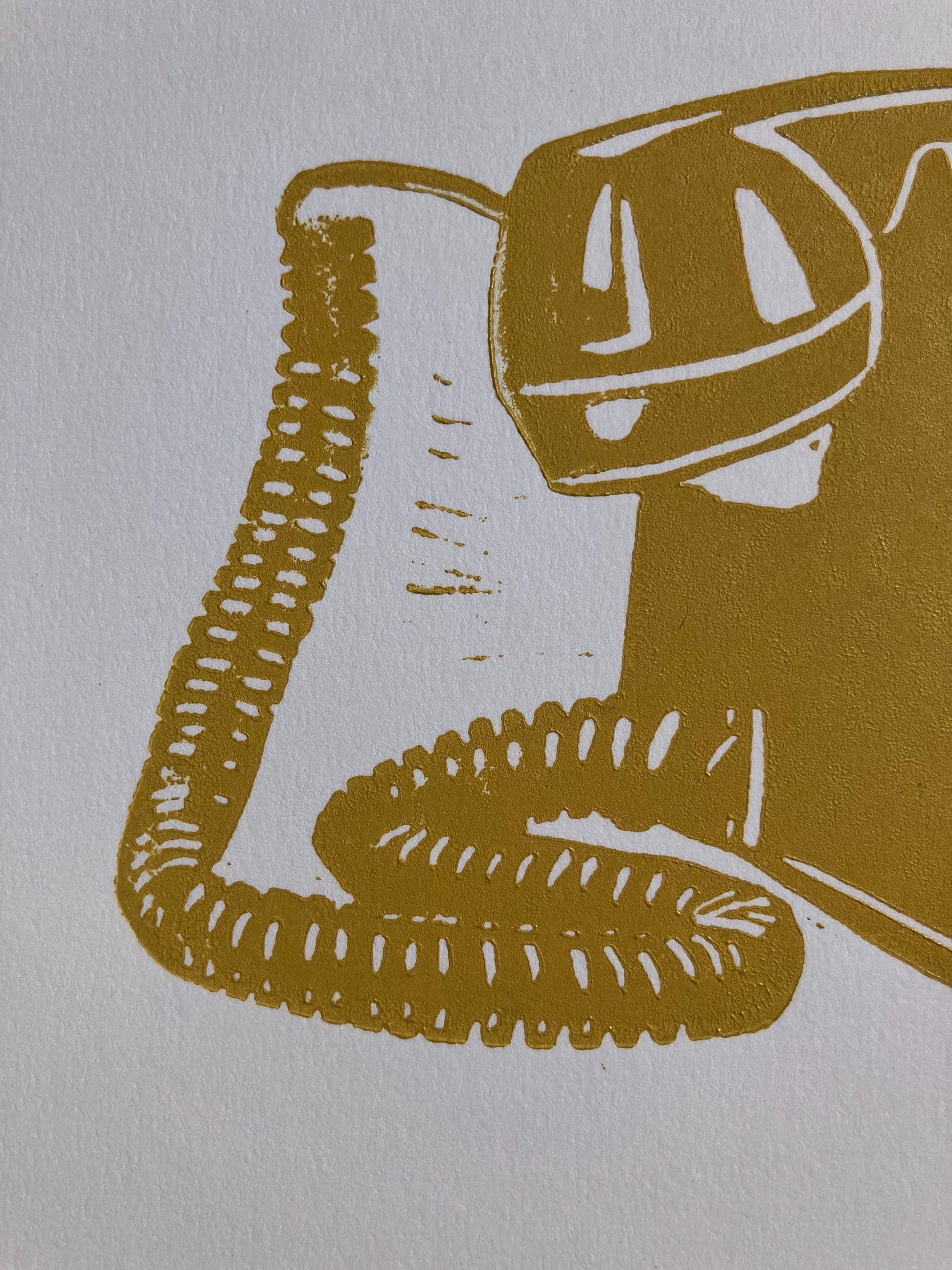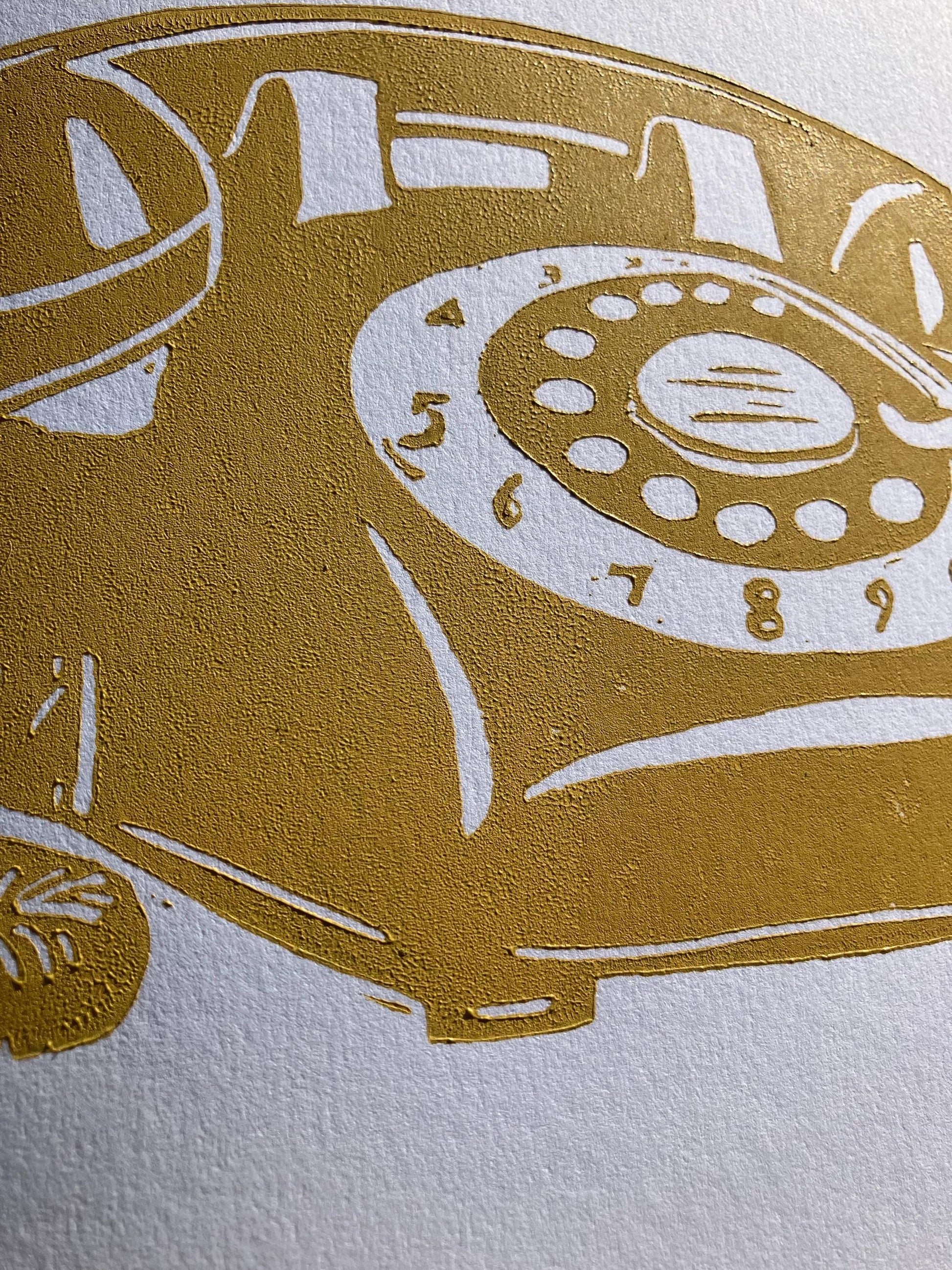 Vintage rotary phone - linoprint in mustard yellow This original, hand-pulled linoleum block print of a vintage telephone was hand-pressed in mustard yellow on beautiful cotton paper. The linoleum block is carved by hand, inked, then each block is printed individually. Due to the printmaking process, there will be variations from print to print giving you a one-of-a-kind piece of art! All materials are archival. Remember the dial tone?