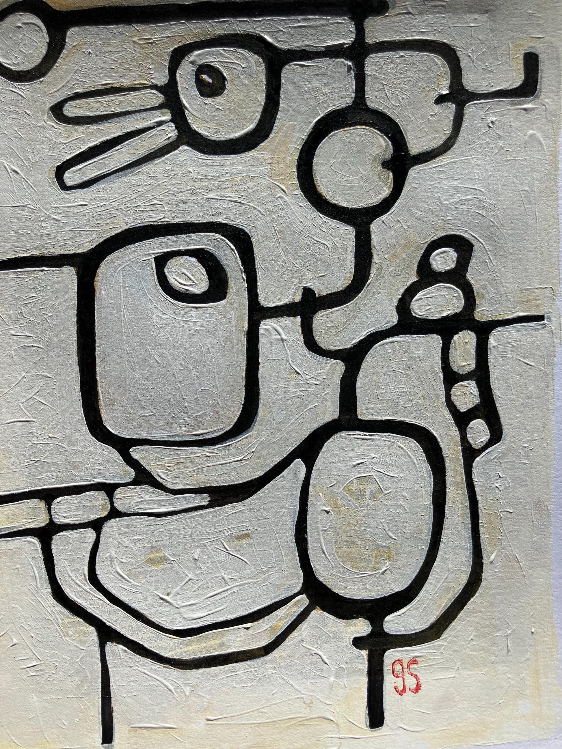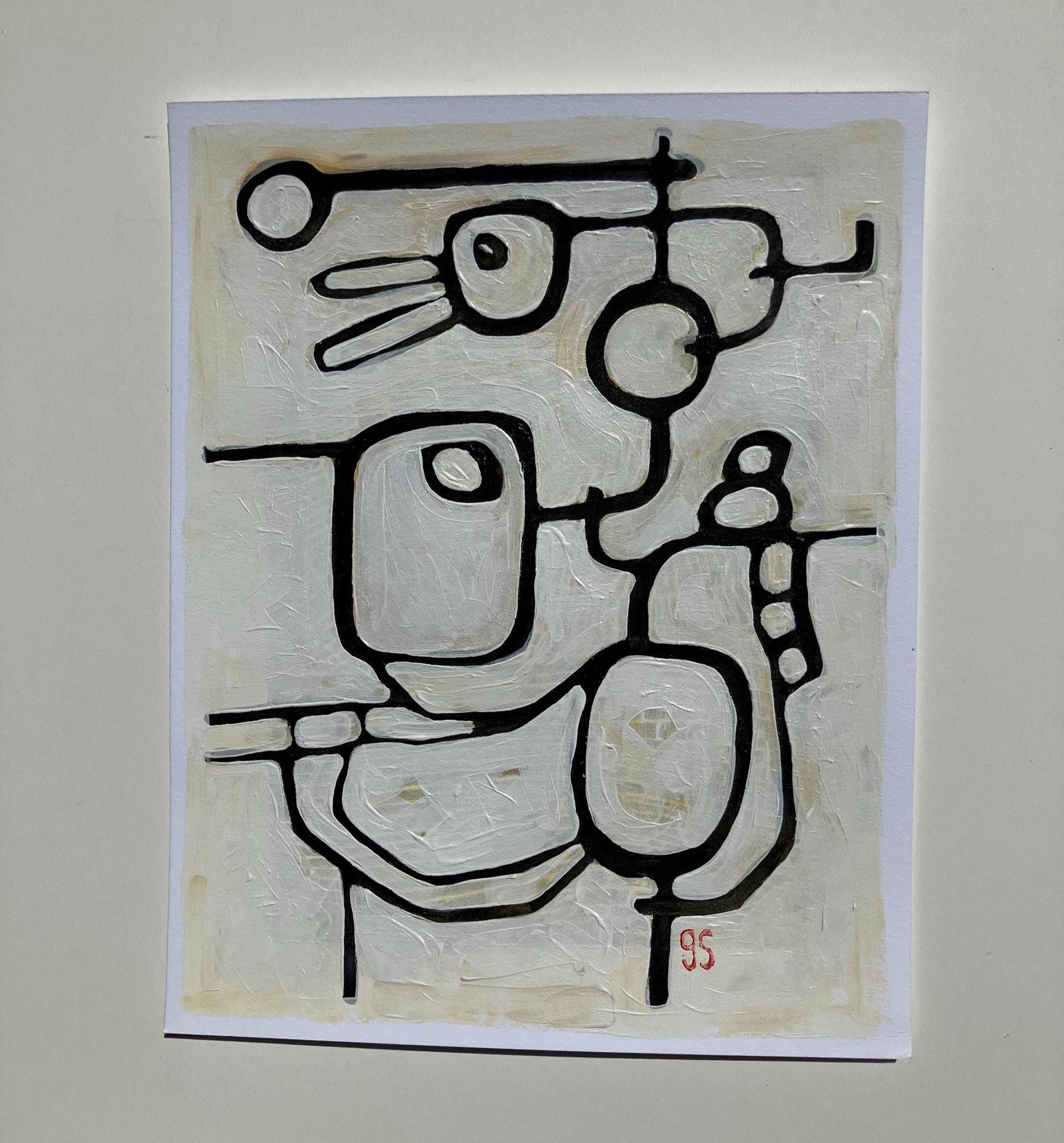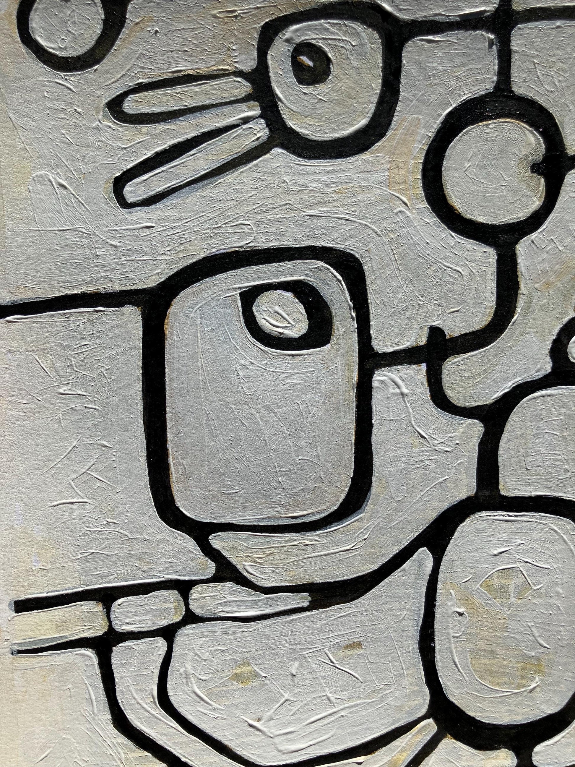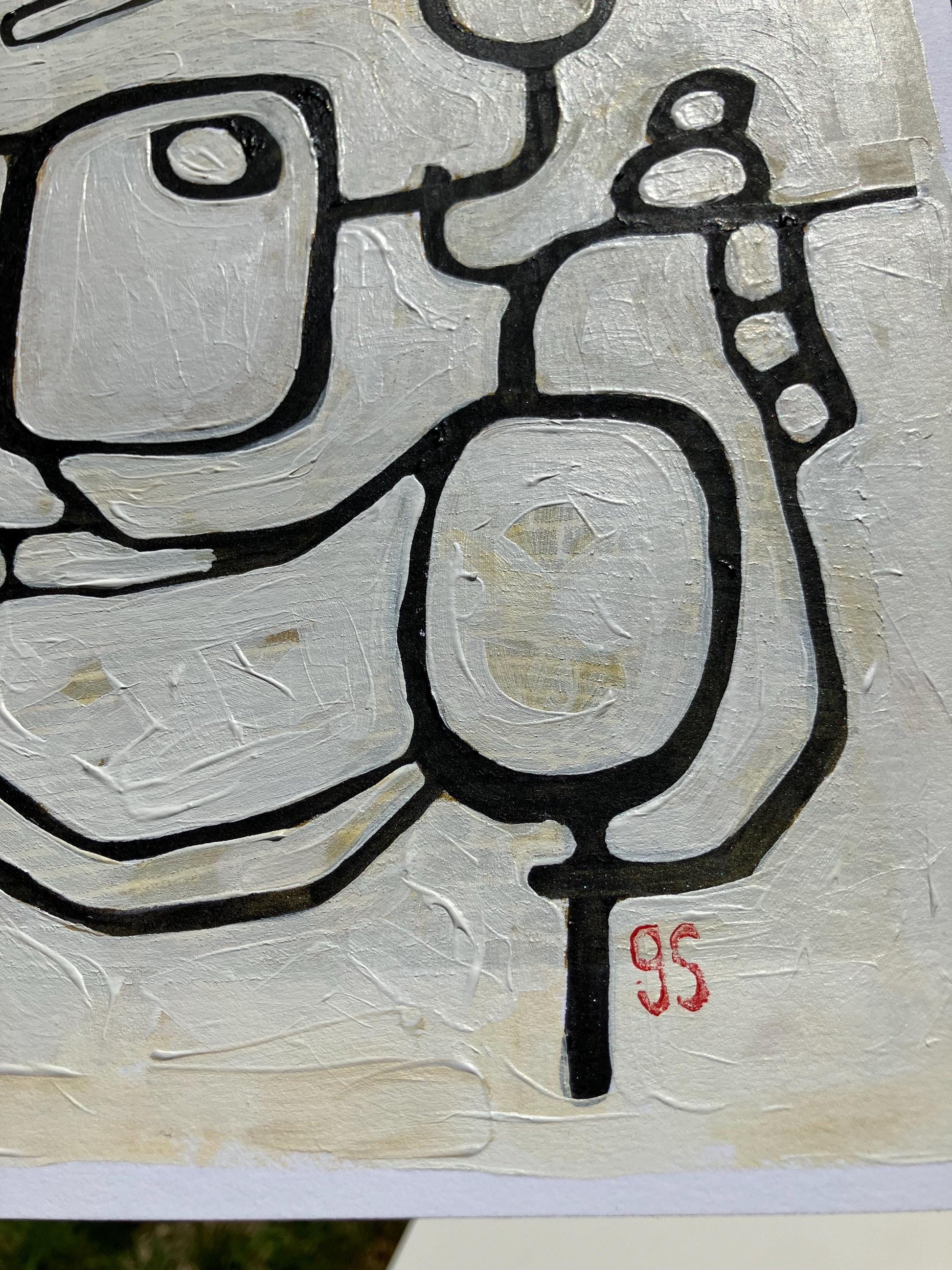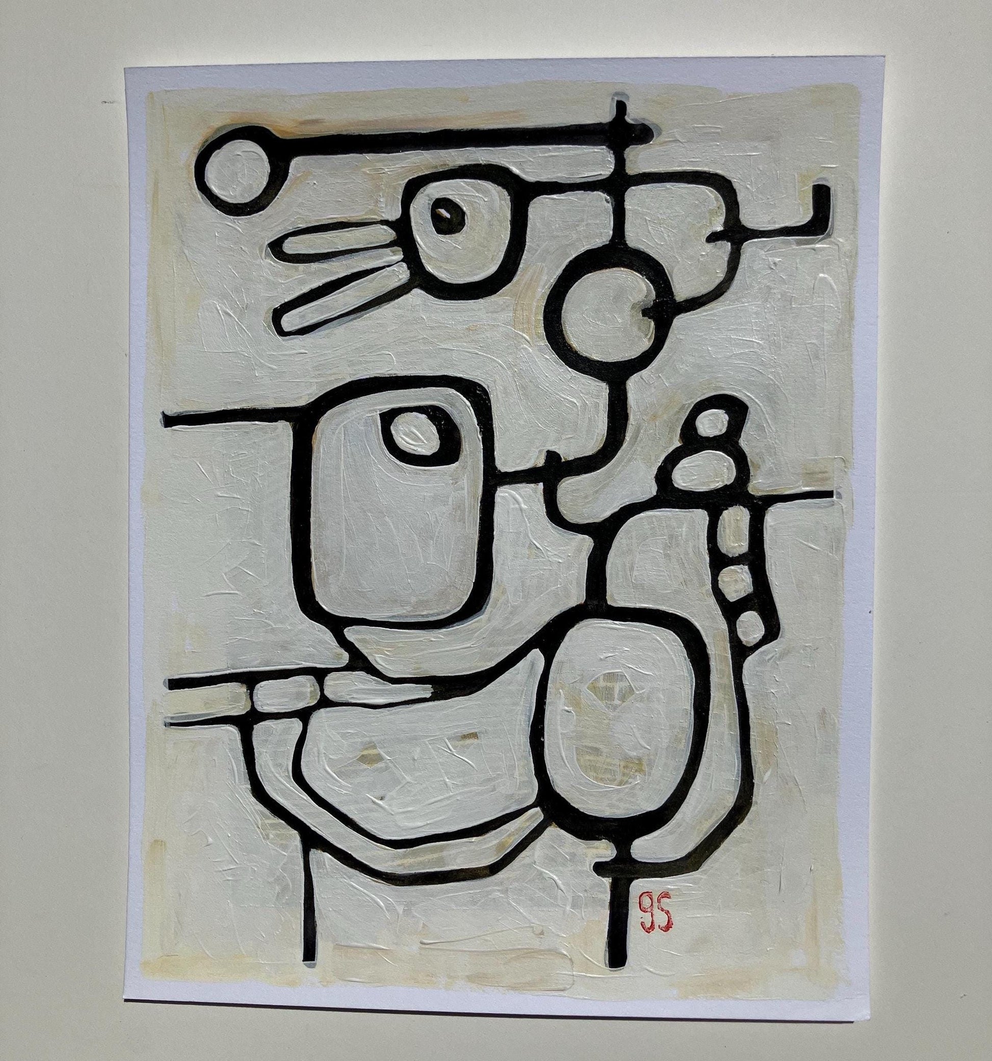 This original 8x10" abstract acrylic painting was hand-painted in black, white, and neutral colors on thick cotton paper. Because this piece was painted on a linocut, it is uniquely and nicely textured. This piece hints to machines, animal relationships, and movement. Ready to be framed.