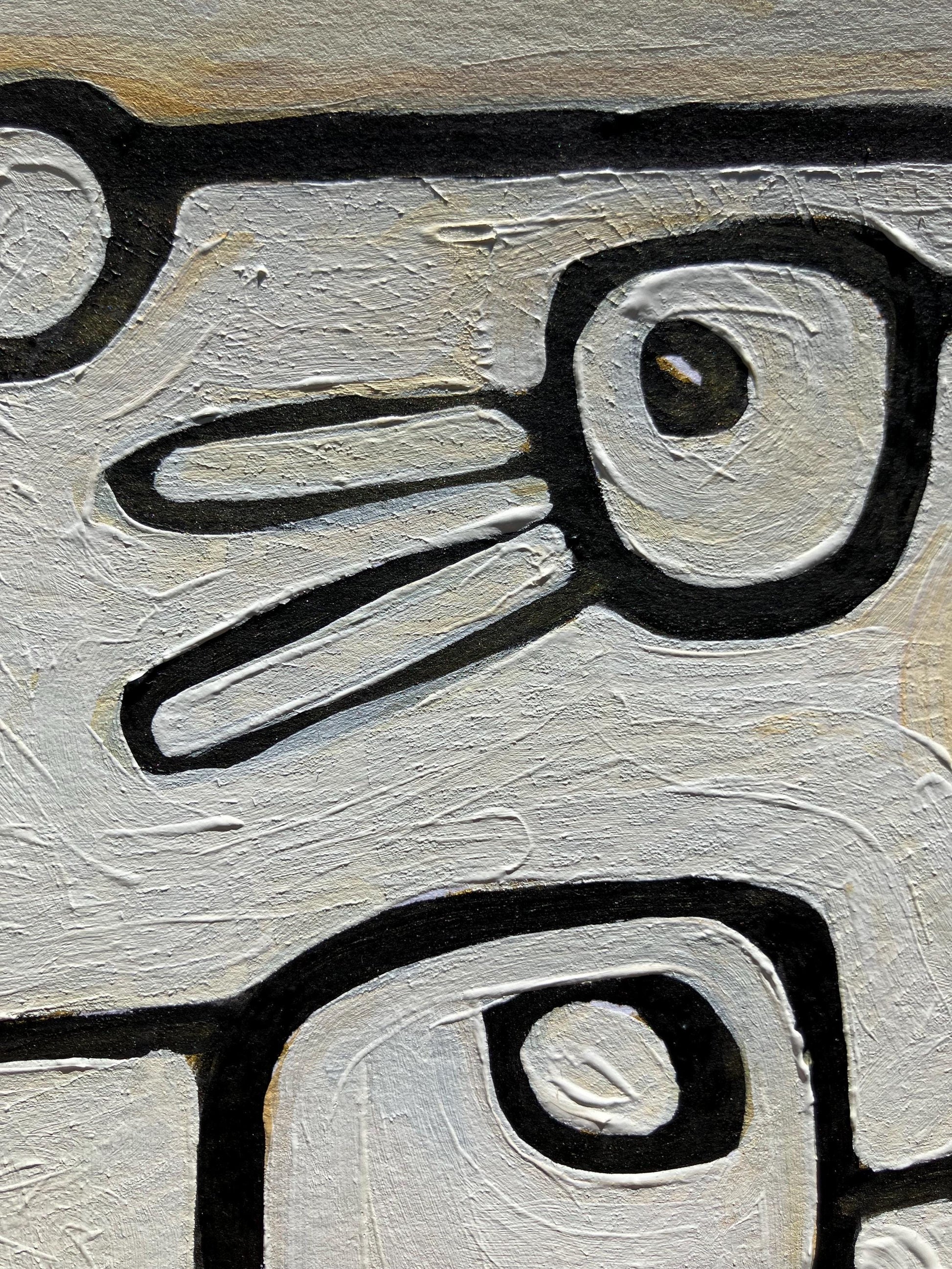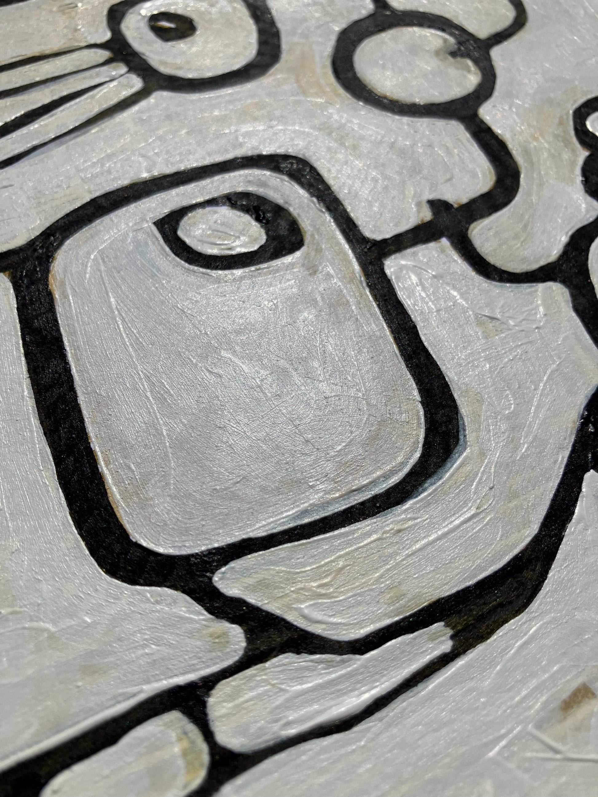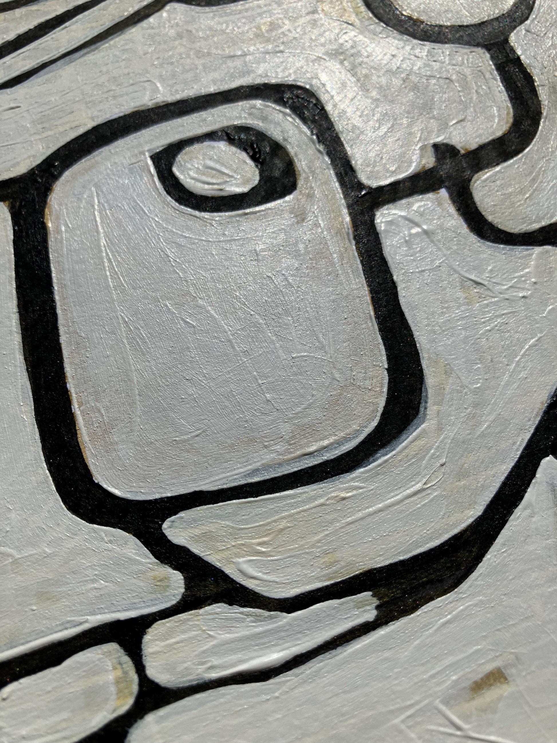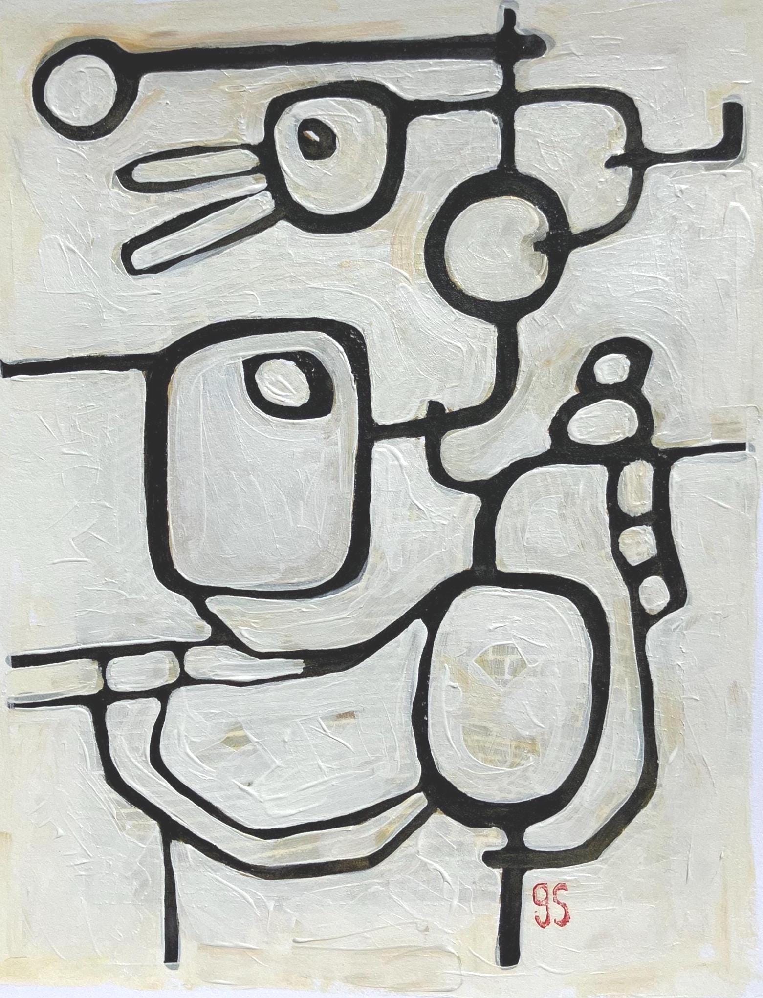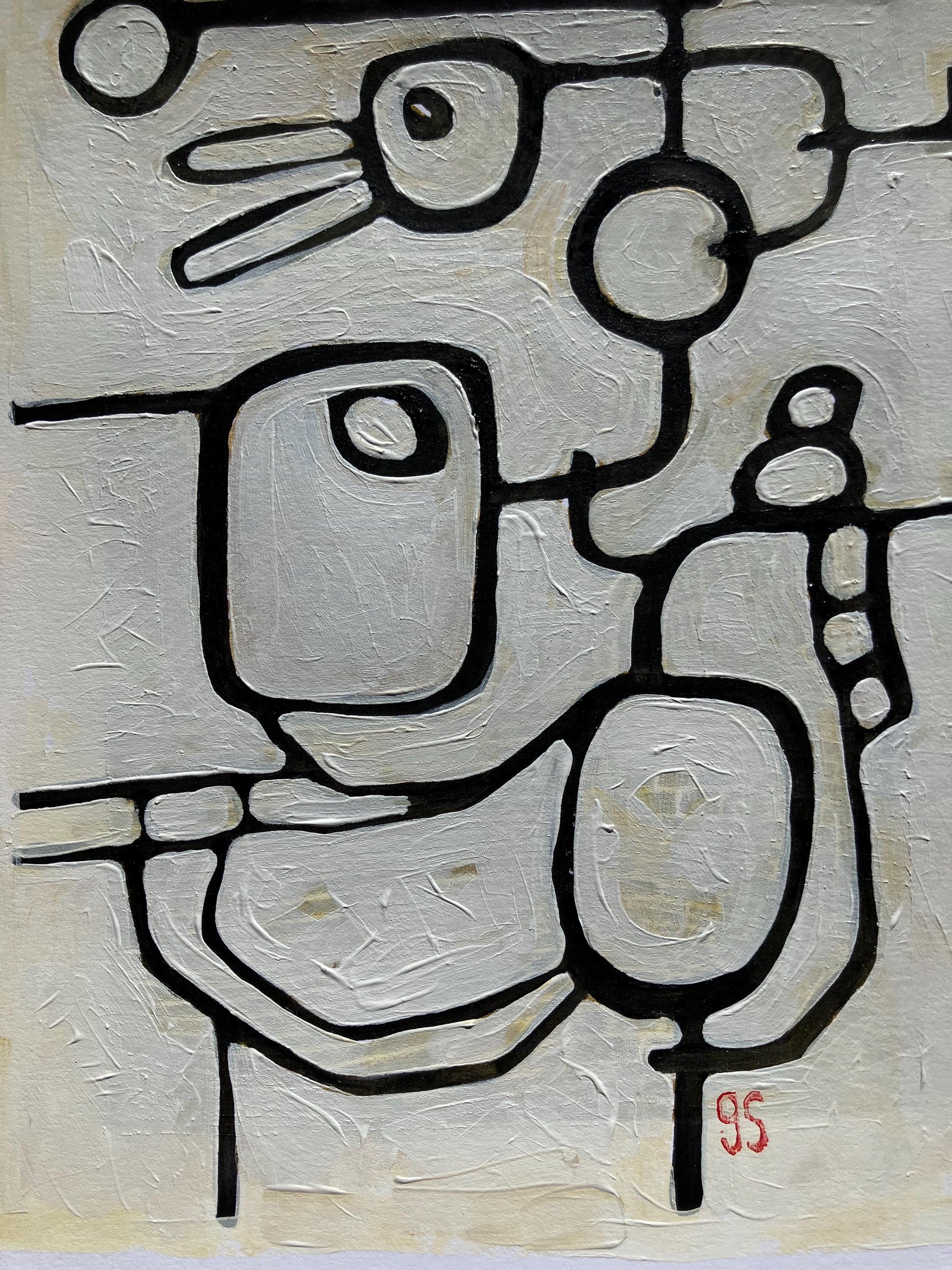 This original 8x10" abstract acrylic painting was hand-painted in black, white, and neutral colors on thick cotton paper. Because this piece was painted on a linocut, it is uniquely and nicely textured. This piece hints to machines, animal relationships, and movement. Ready to be framed.