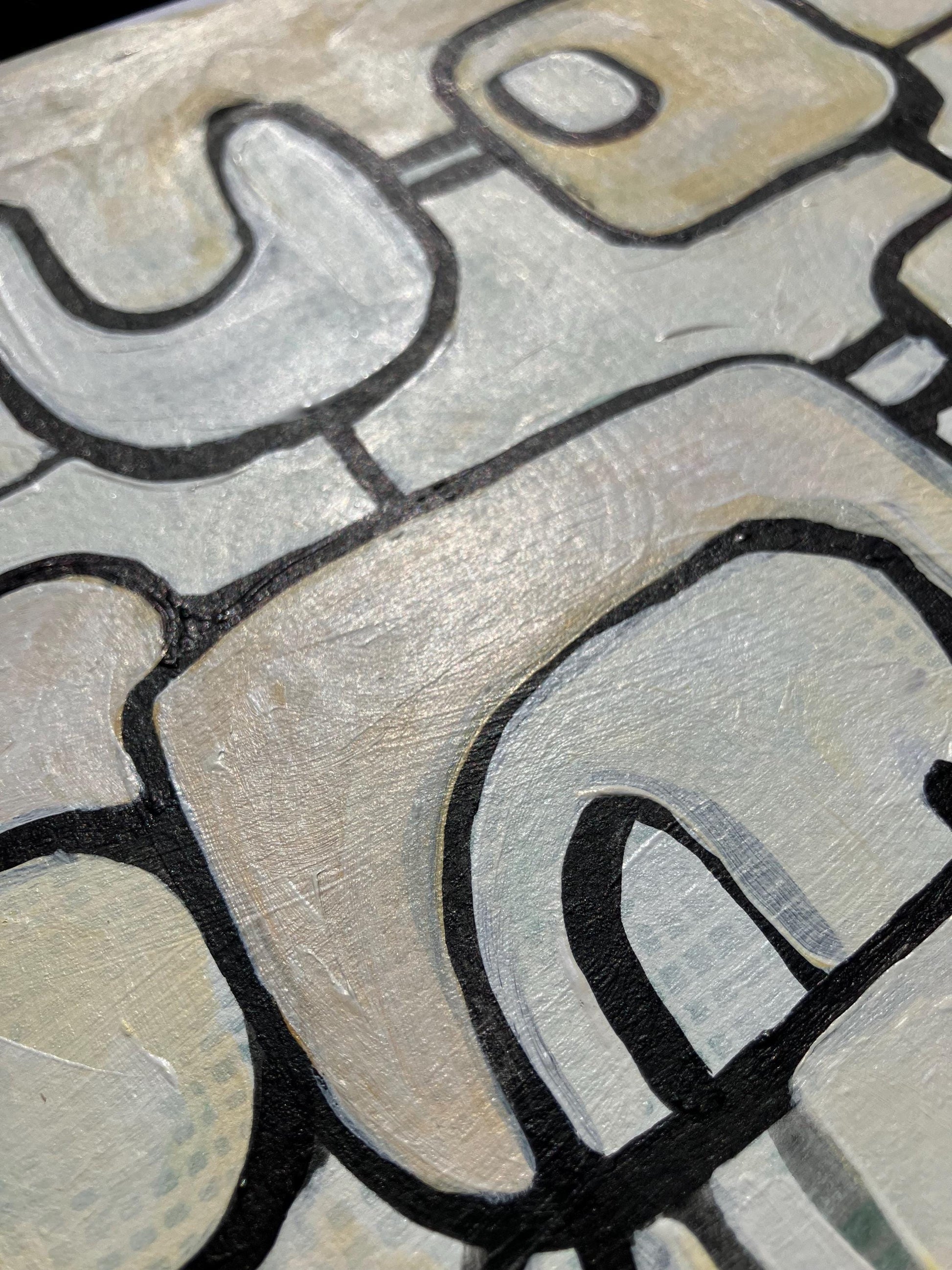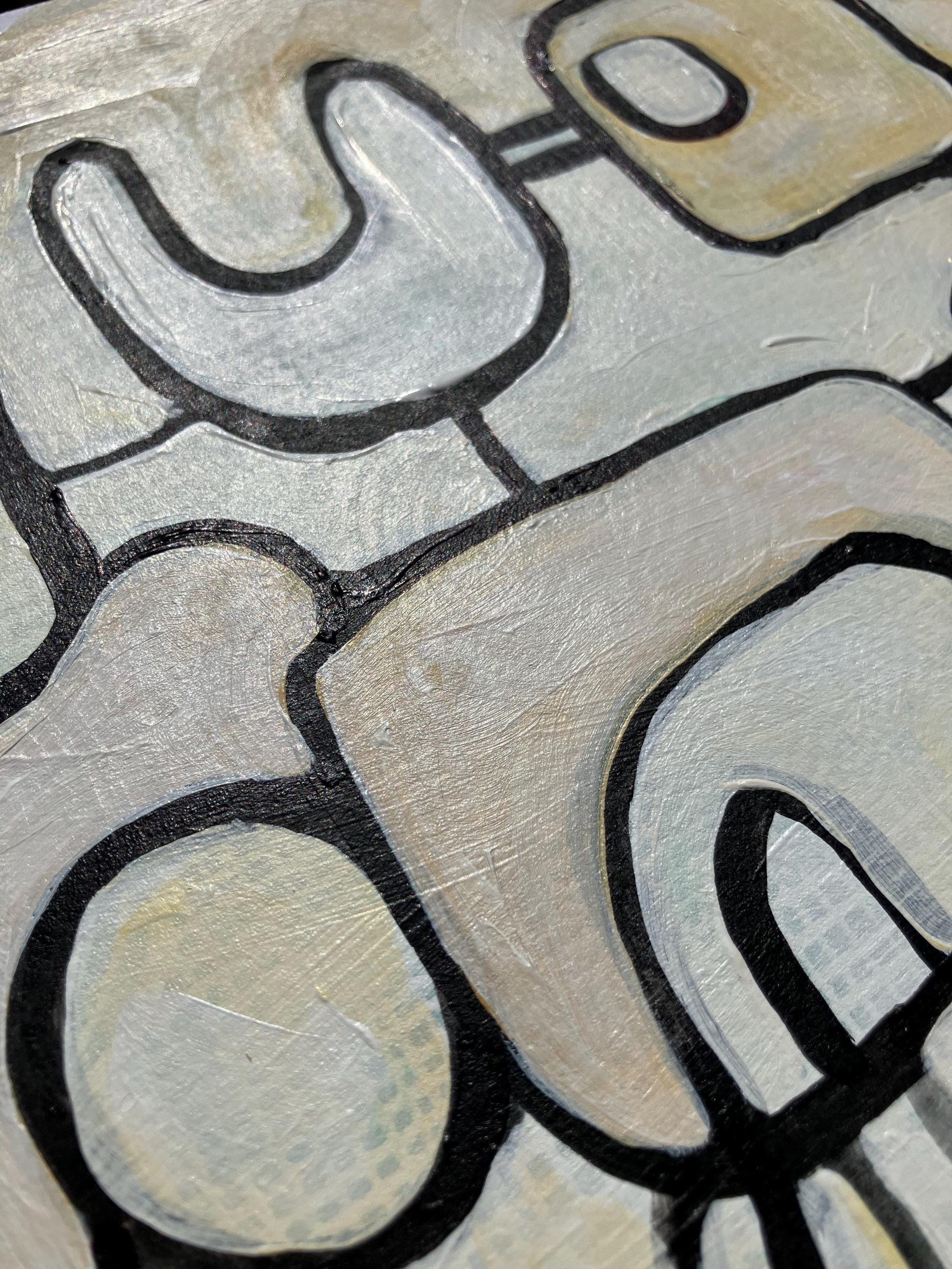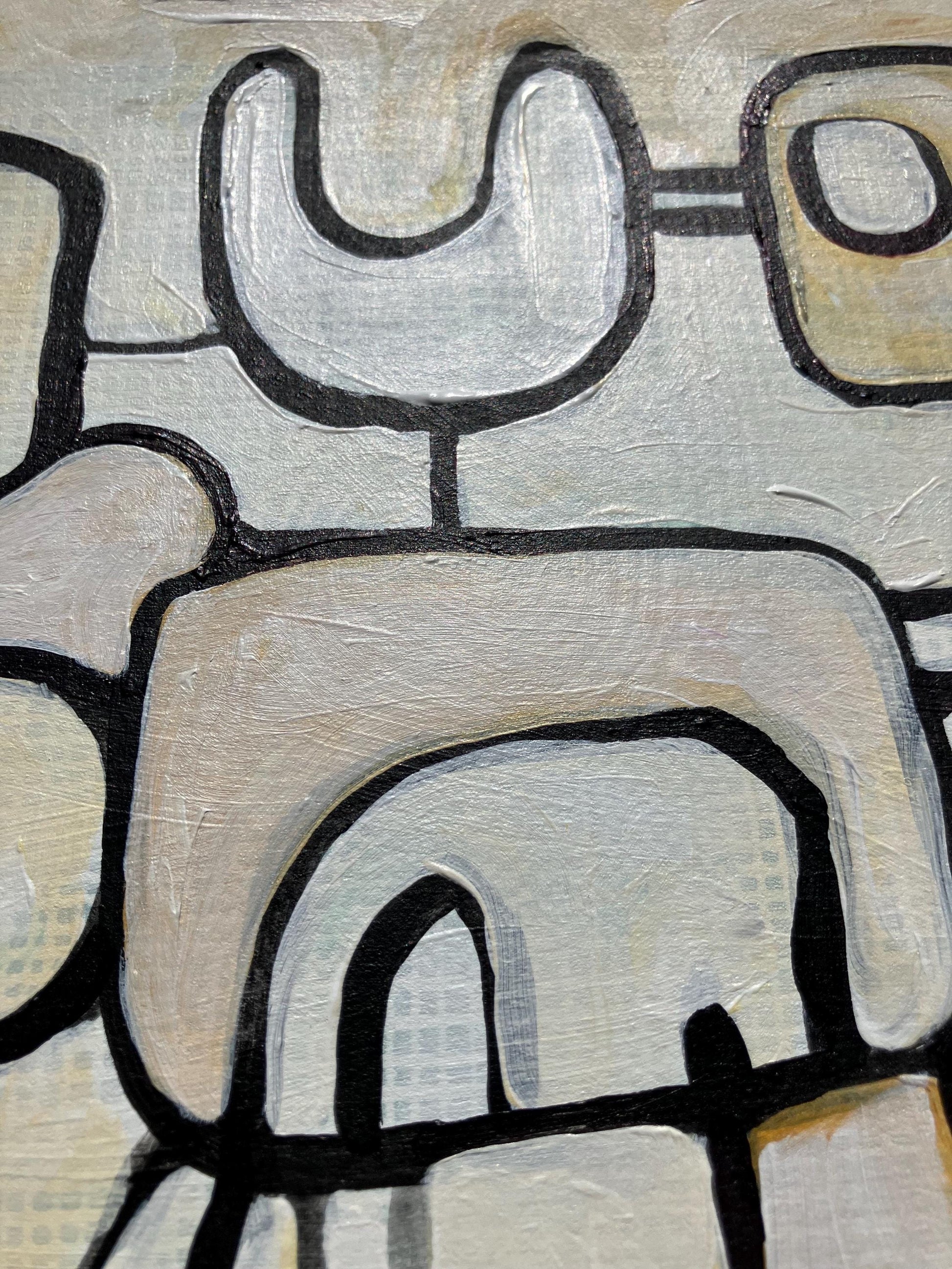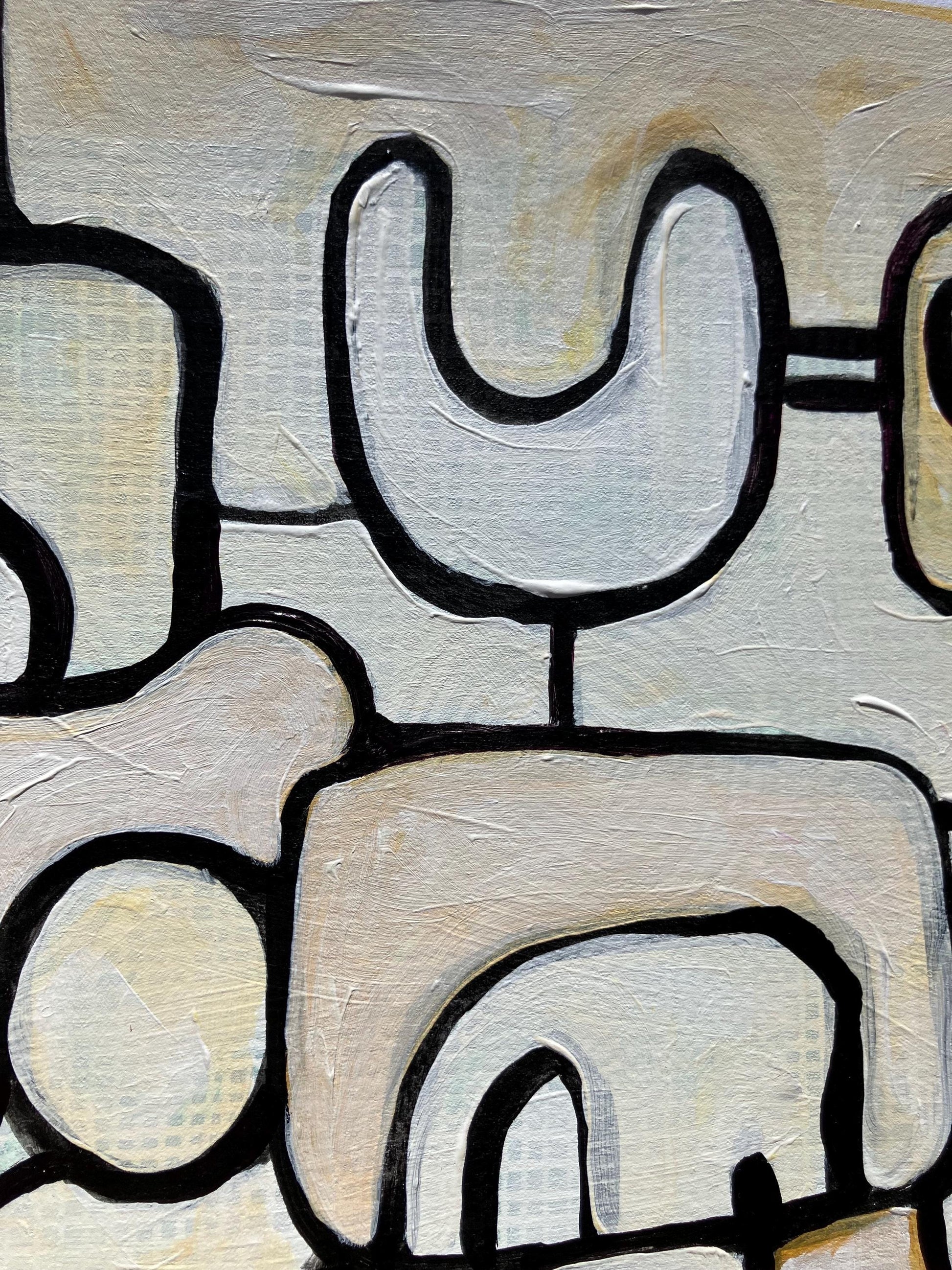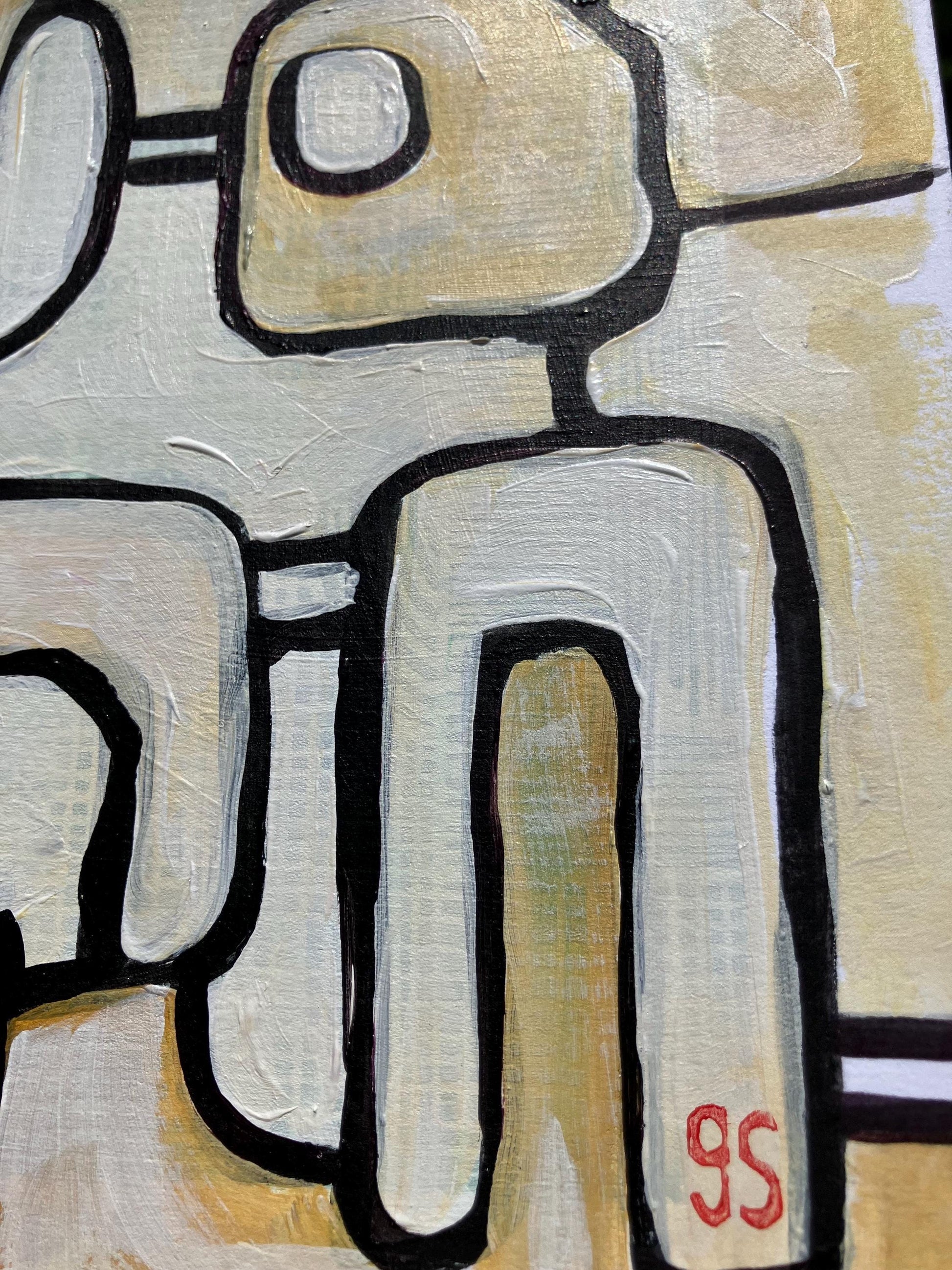 This original 8x10" abstract acrylic painting was hand-painted in black, white, and neutral colors on thick cotton paper. Because this piece was painted on a linocut, it is uniquely and nicely textured. This piece hints to machines, animal relationships, and movement.