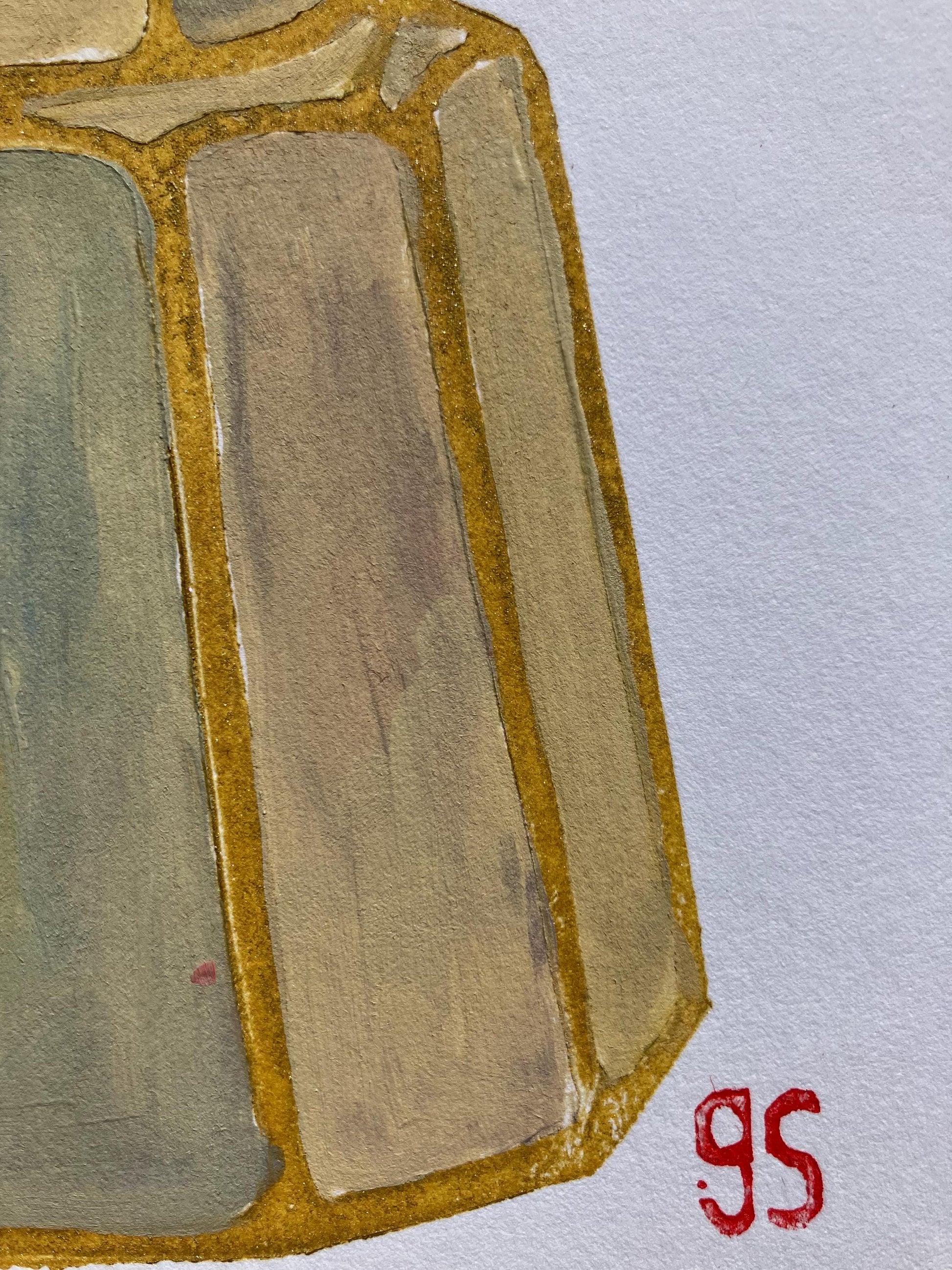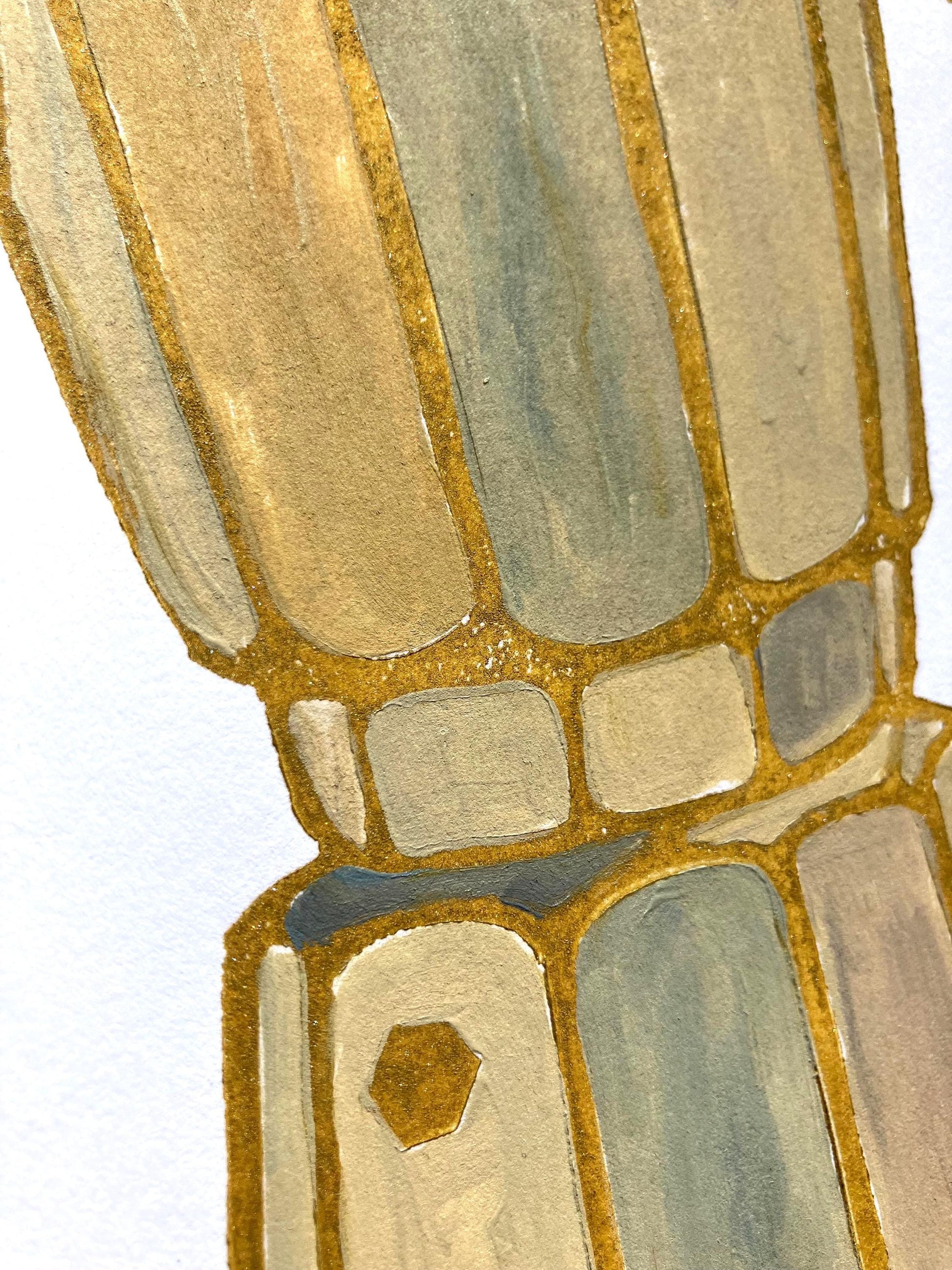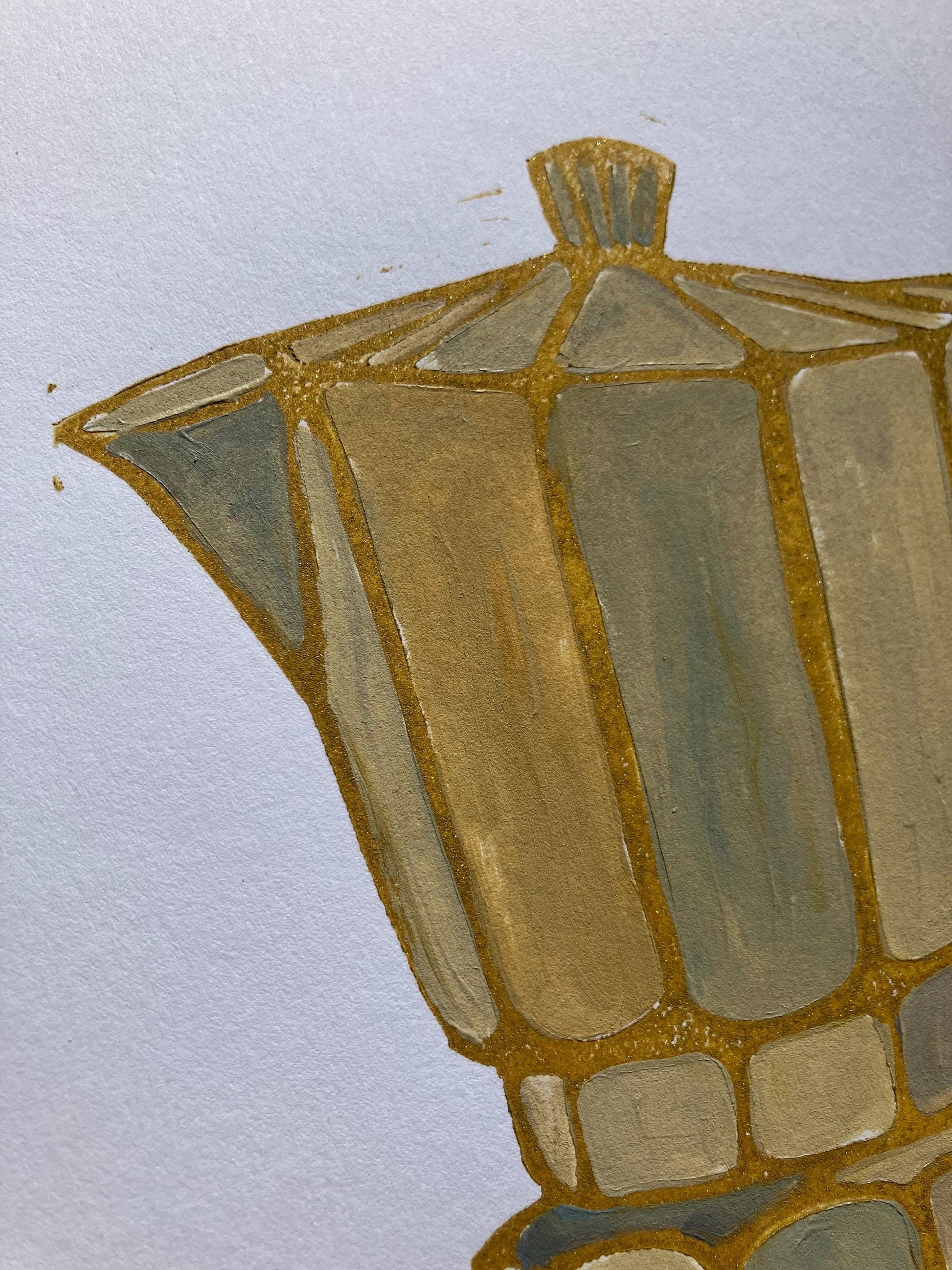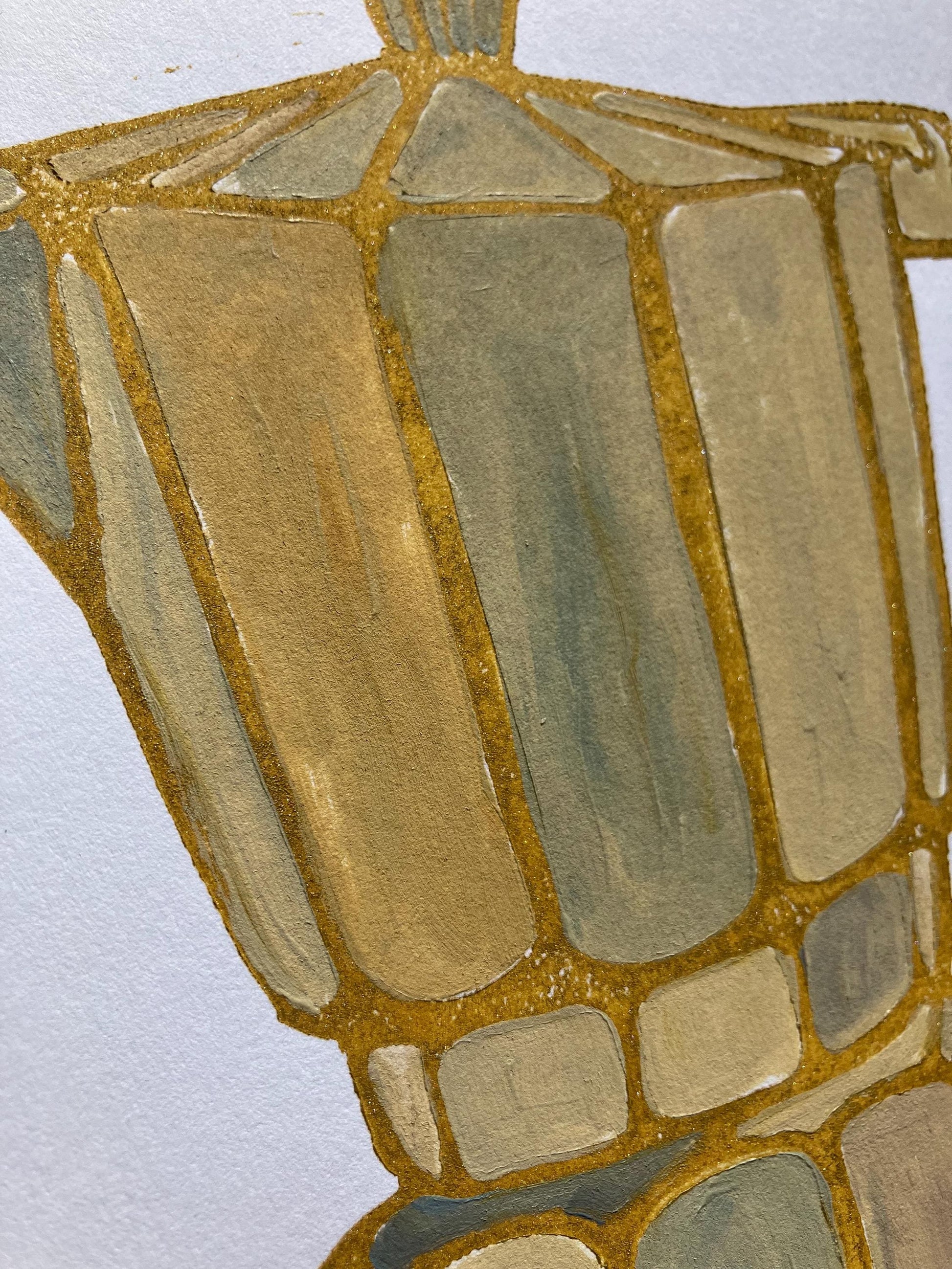 This is an original 8x10" acrylic painting on thick cotton paper. First, the outline was pressed in shimmery gold from a hand-carved linocut block. Finishing touches were hand-painted with acrylics. This painting in particular features neutral colors and shimmery gold highlights.