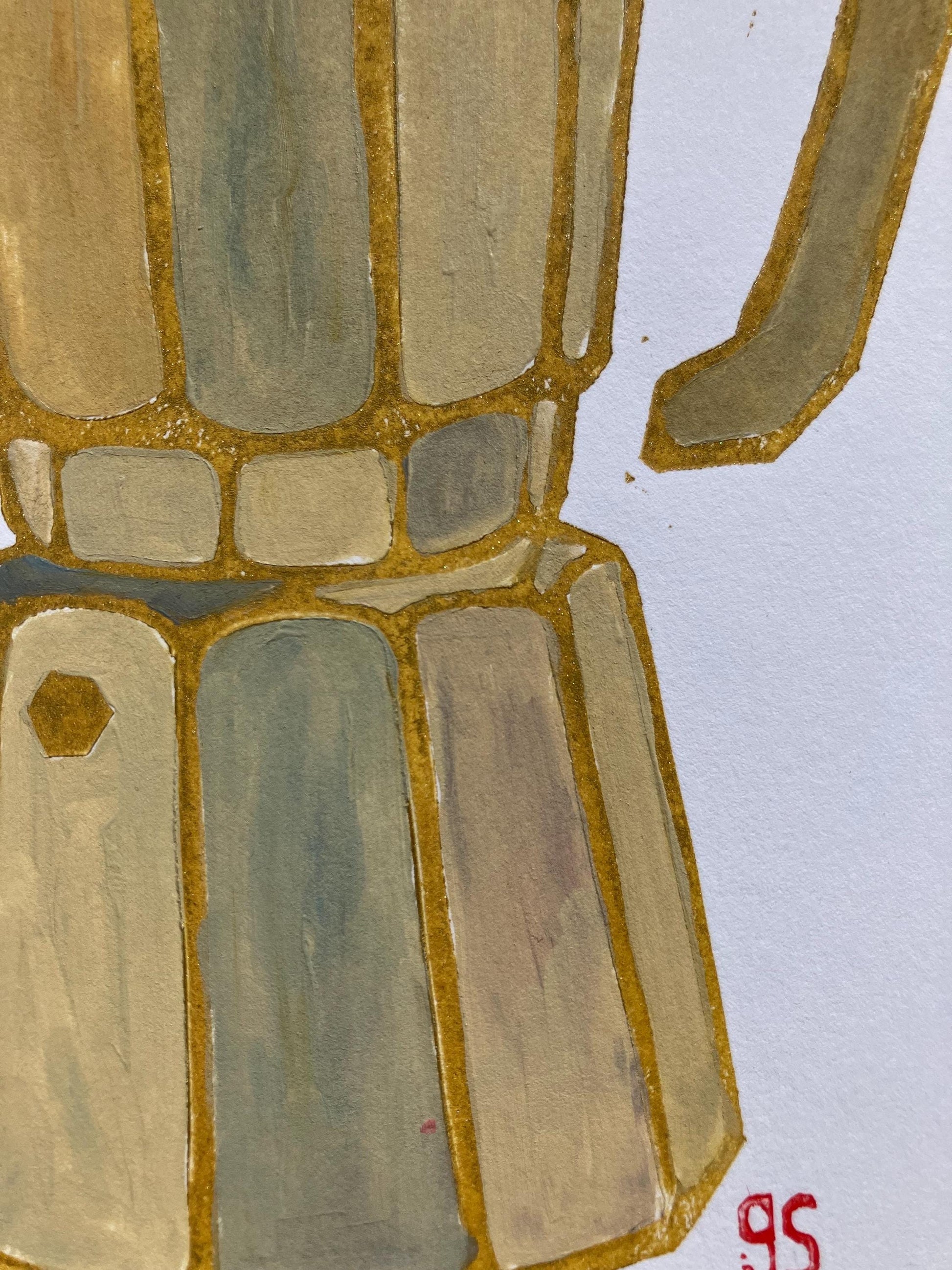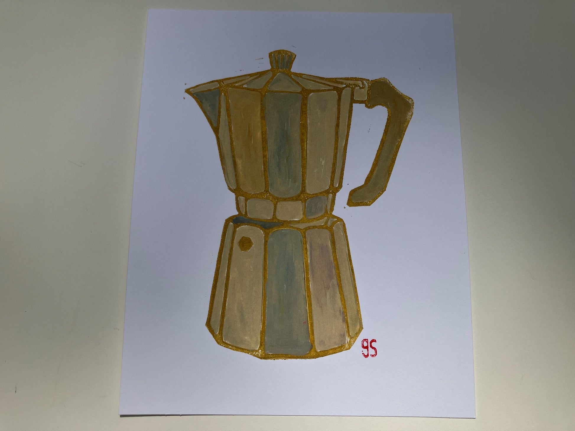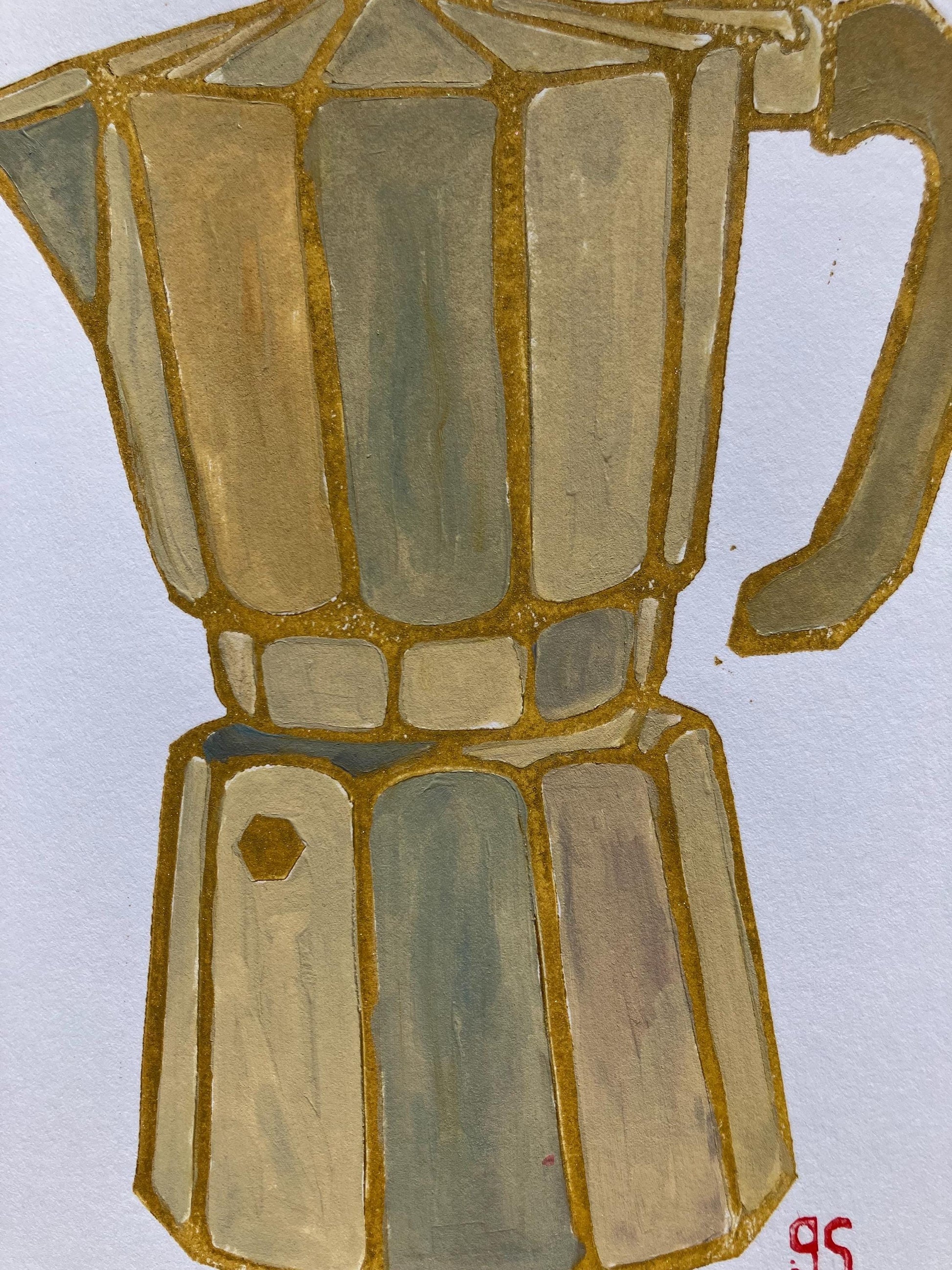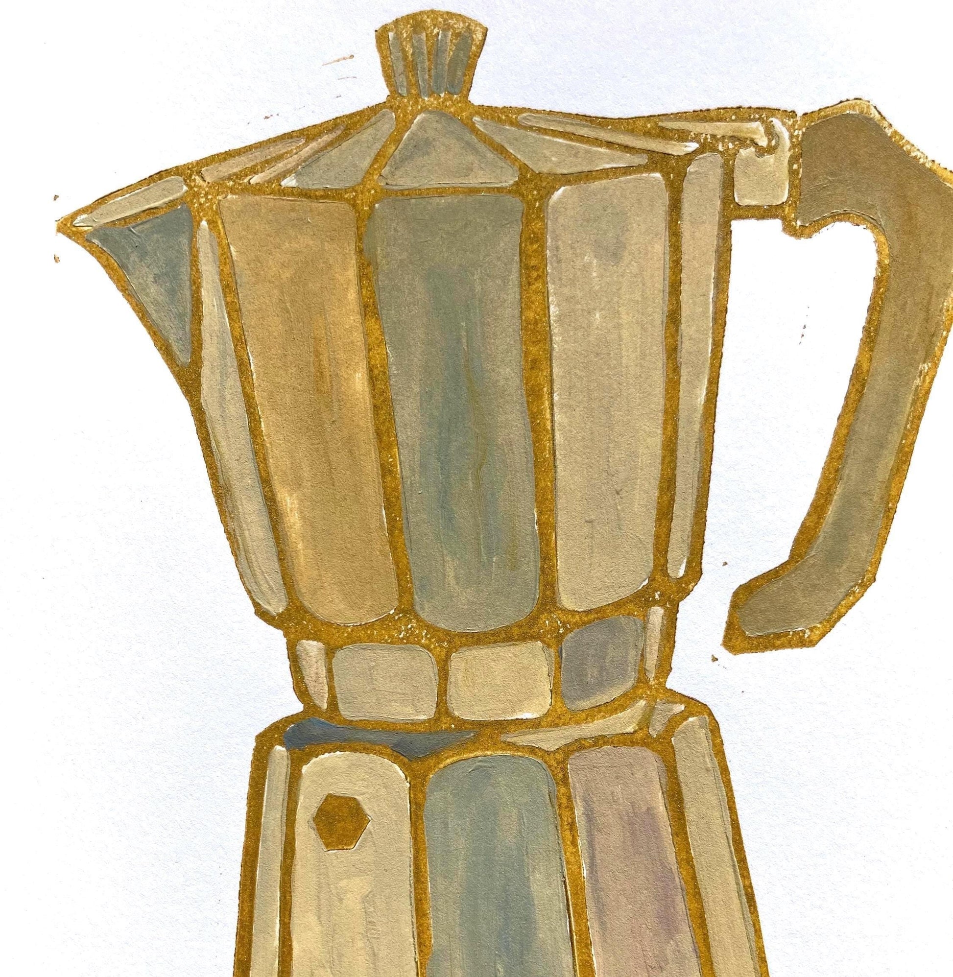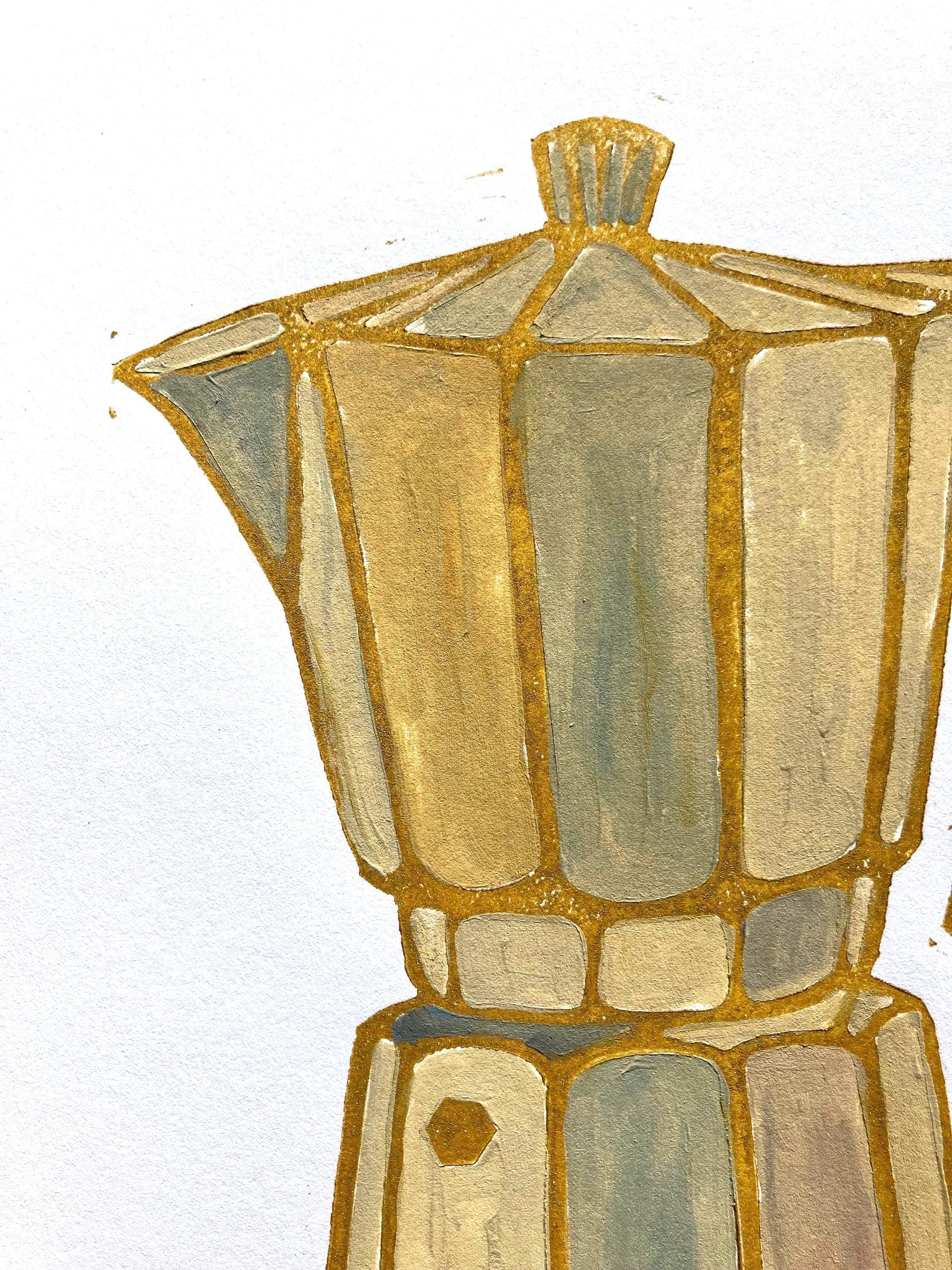 Mixed media acrylic painting of a Moka pot in gold and neutral colors (aka: Italian Bialetti pot, stovetop espresso maker)