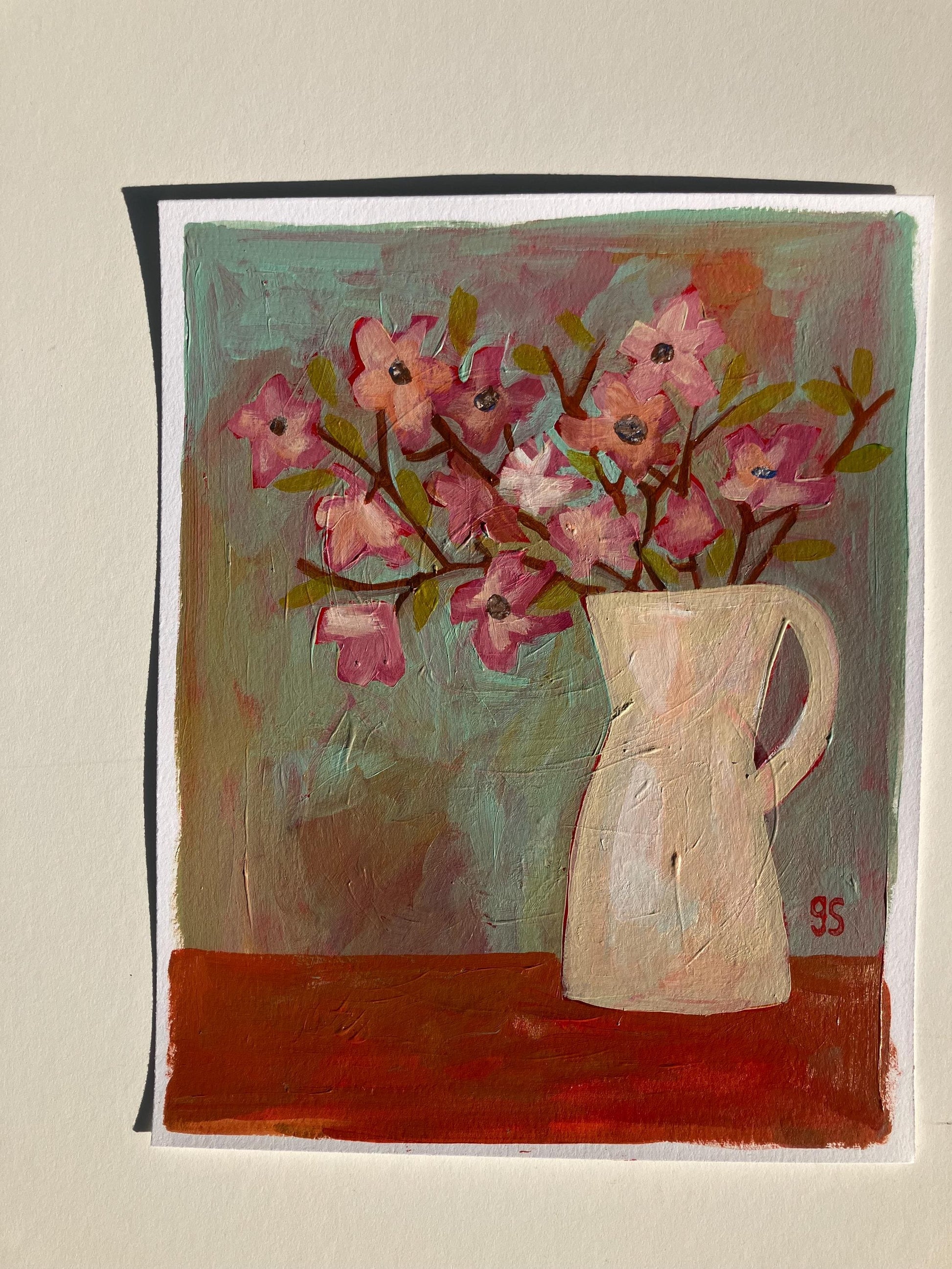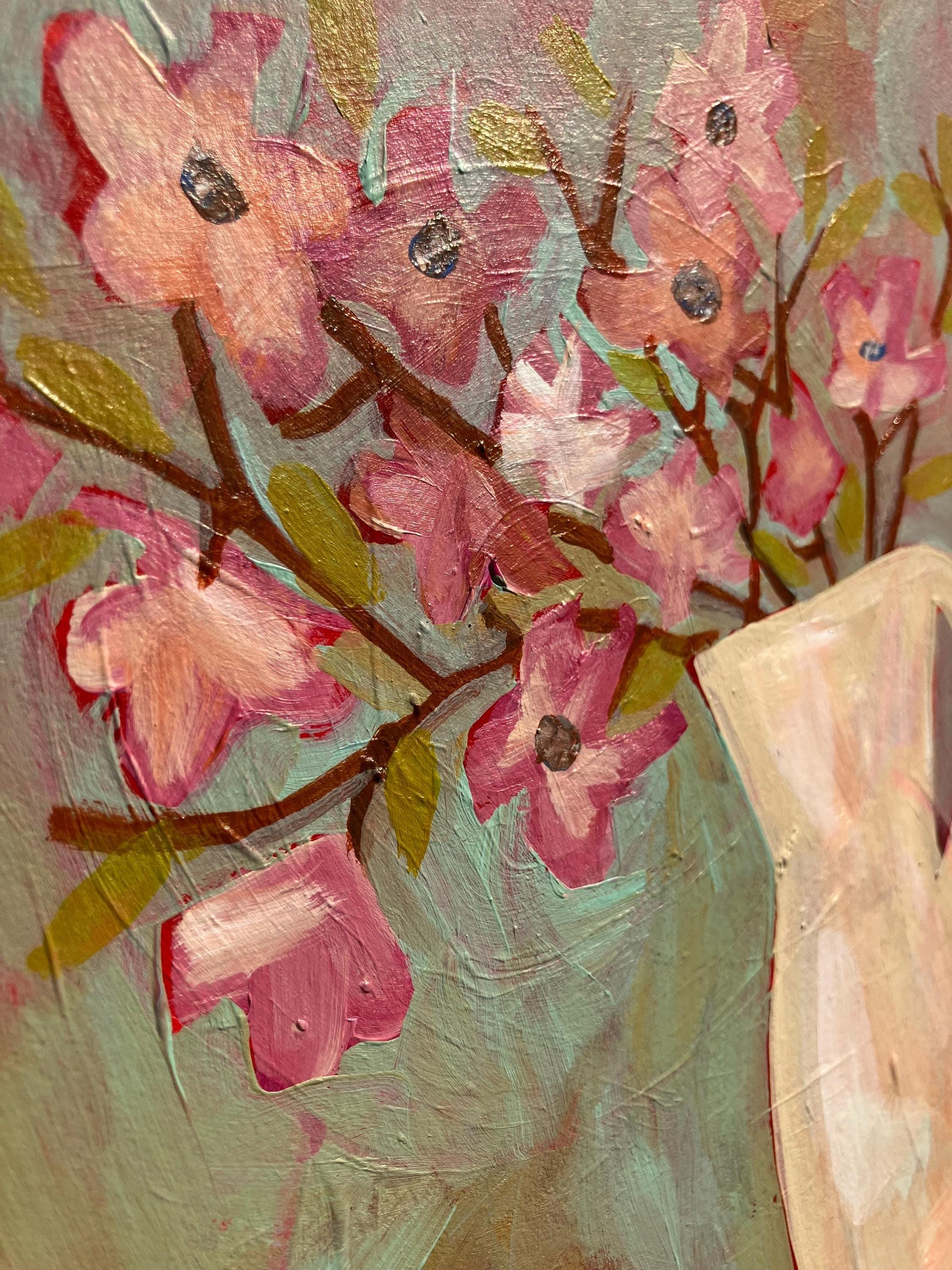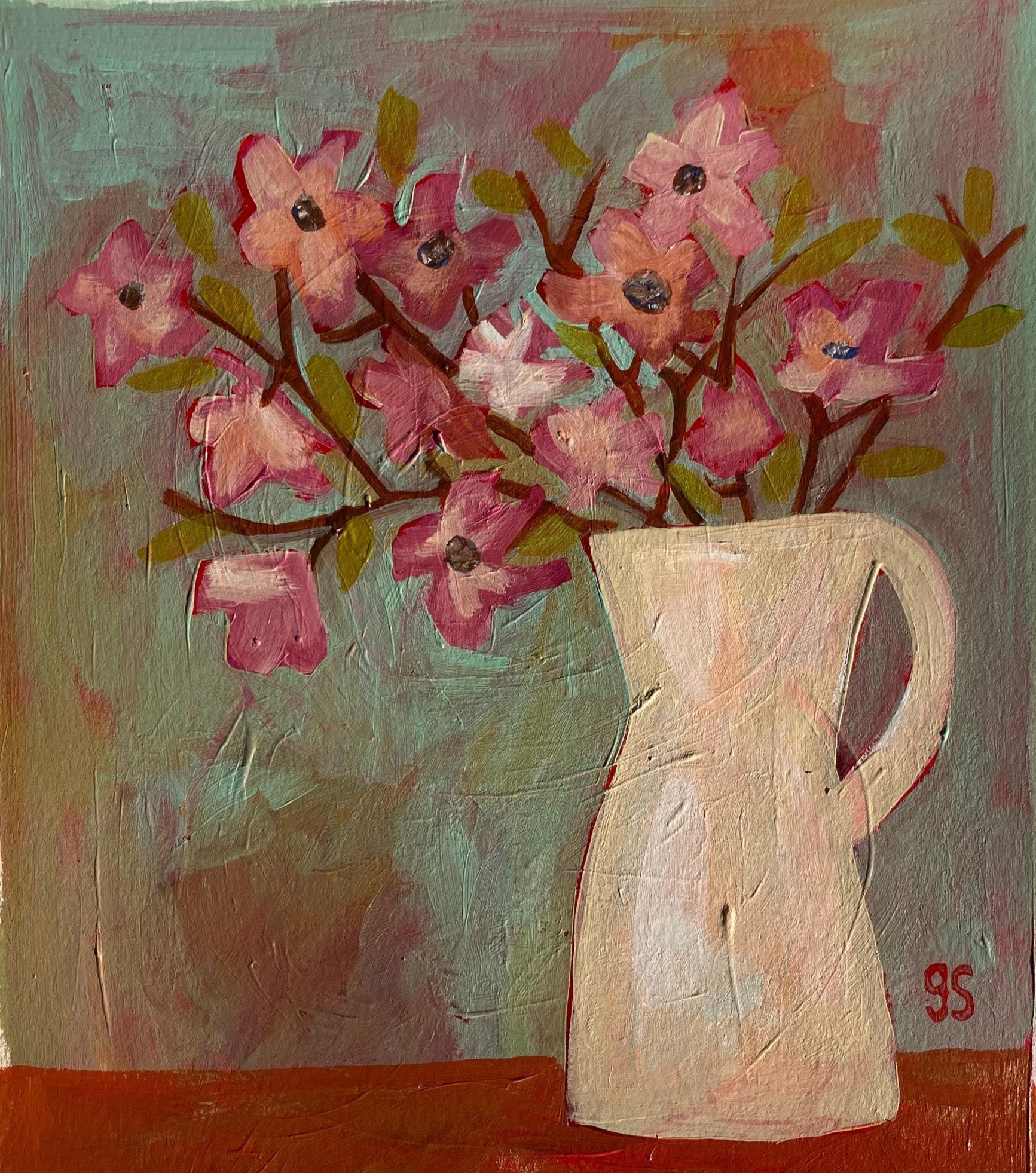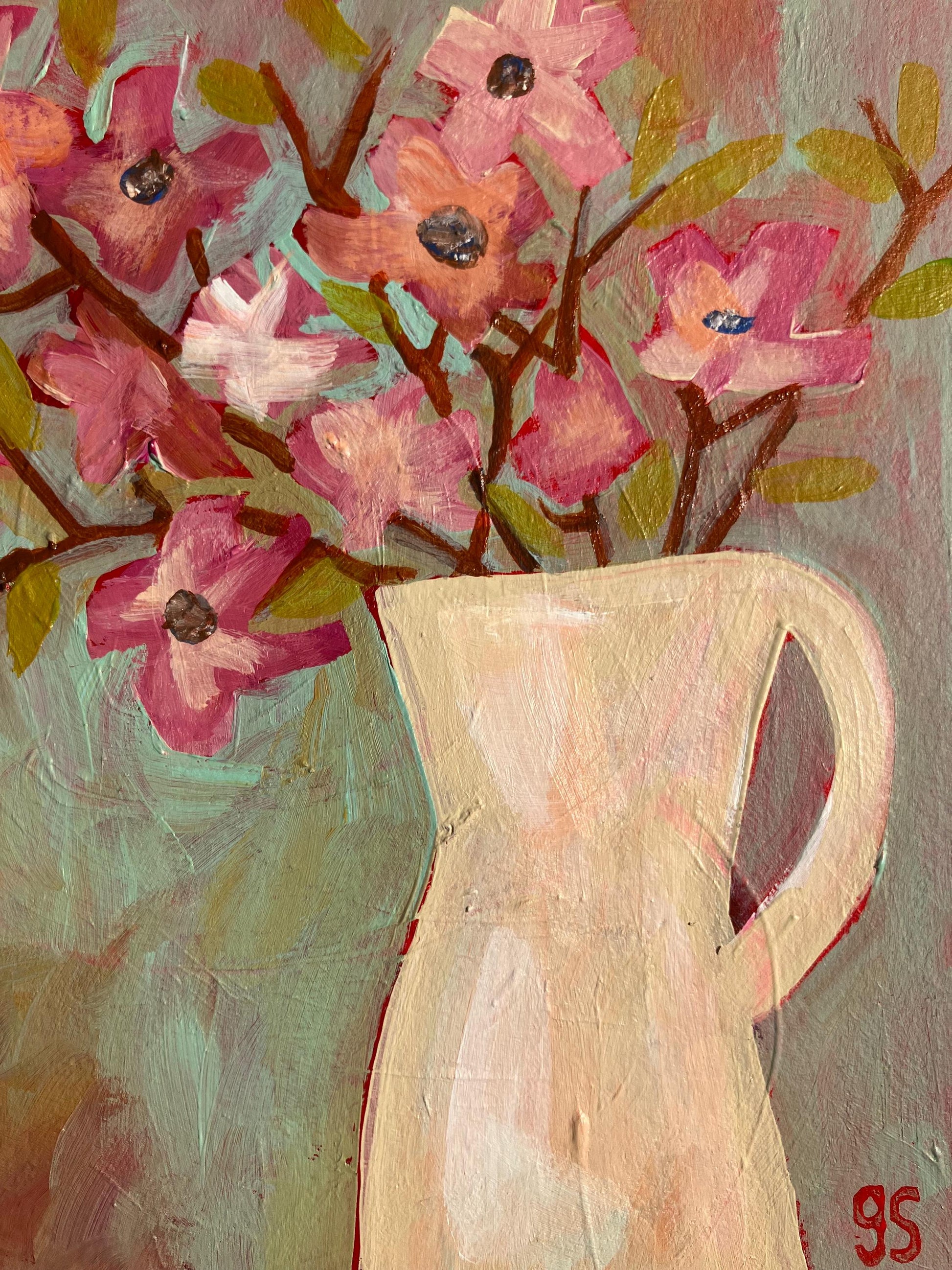 Mixed media acrylic painting of a pitcher of sweet pink flowers.