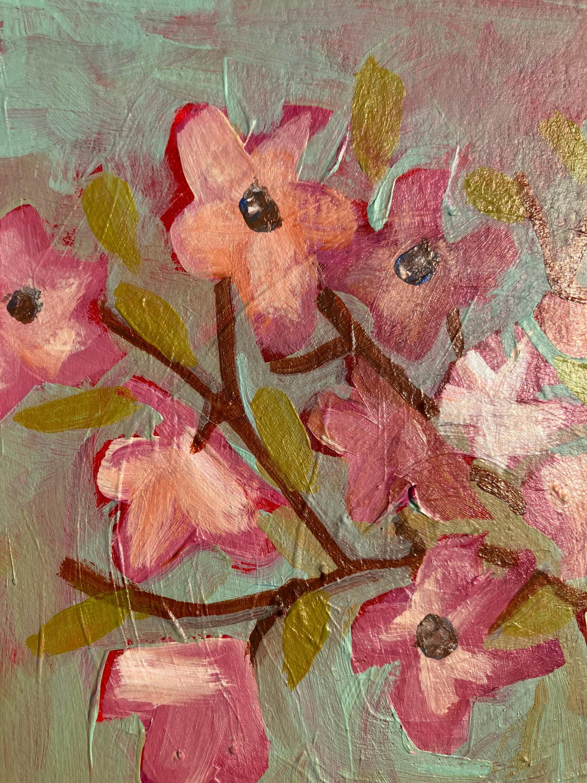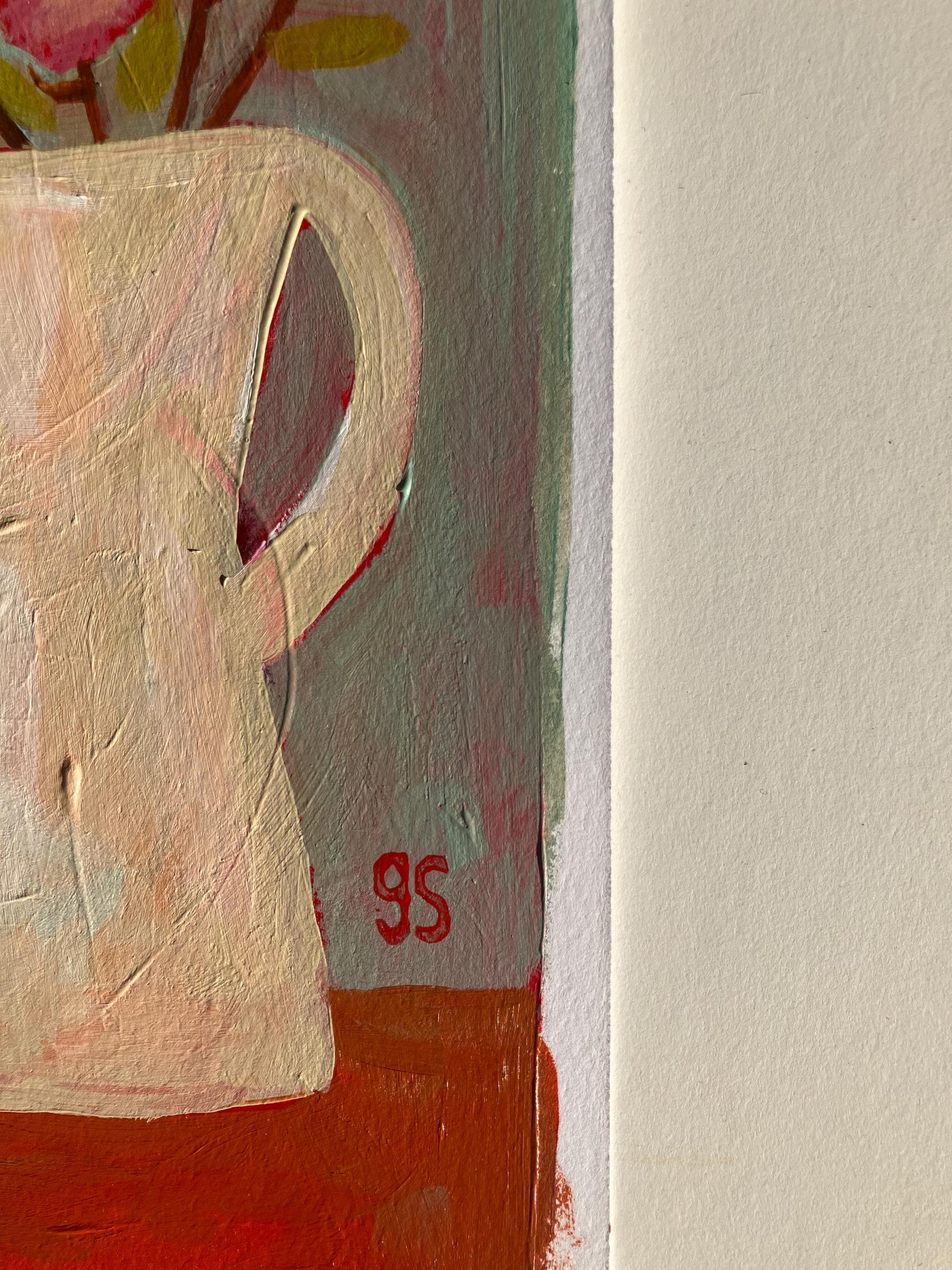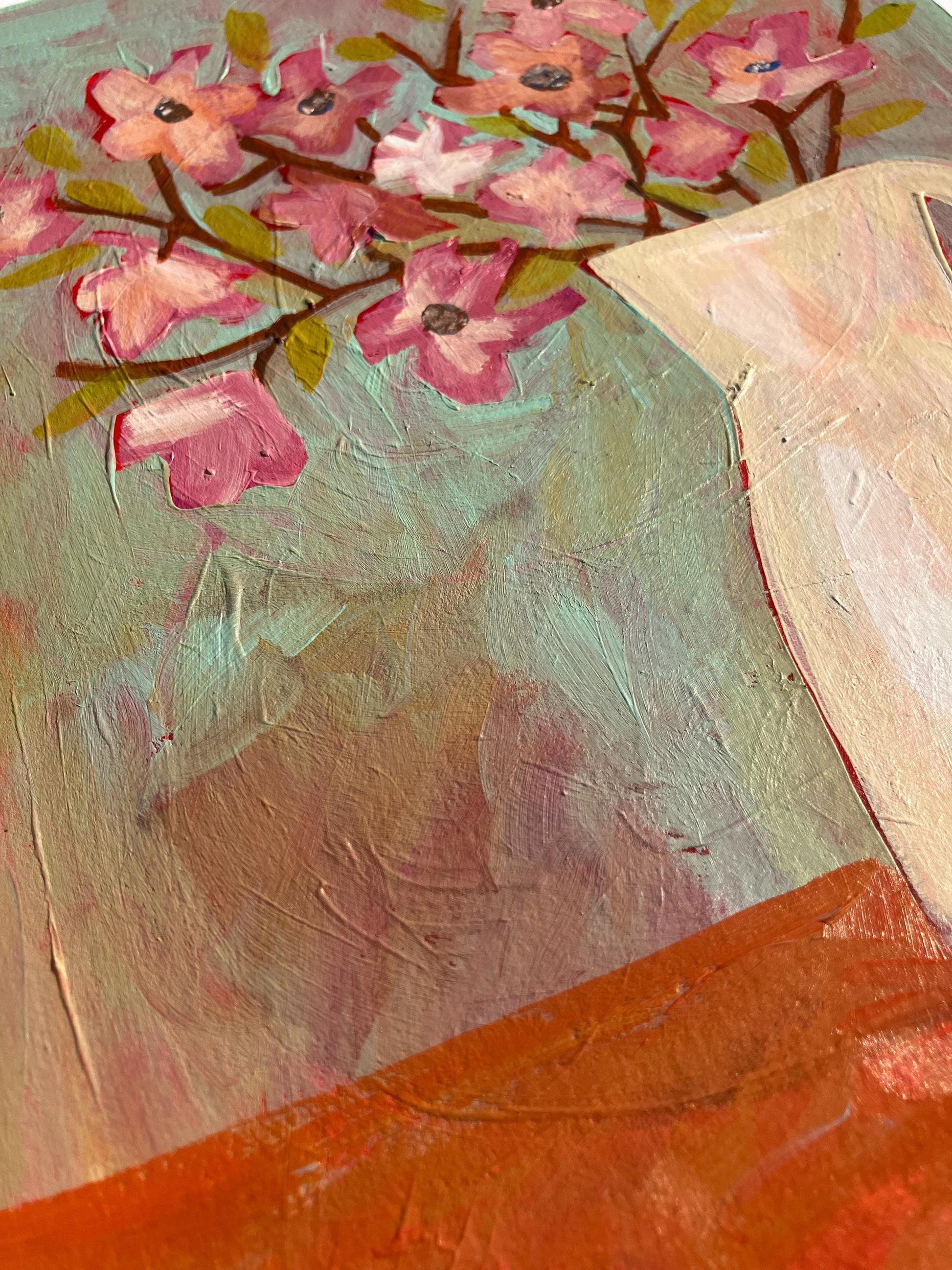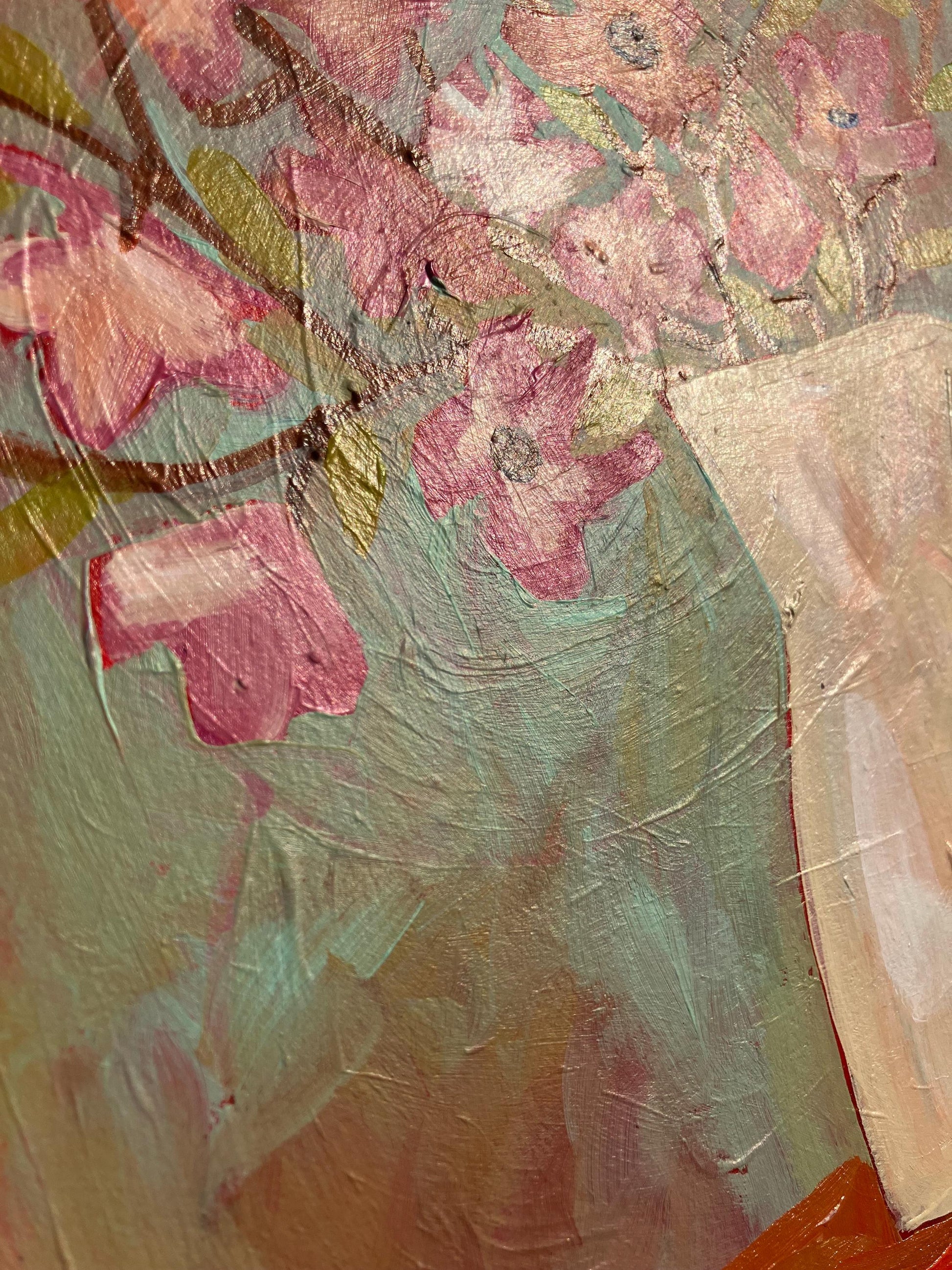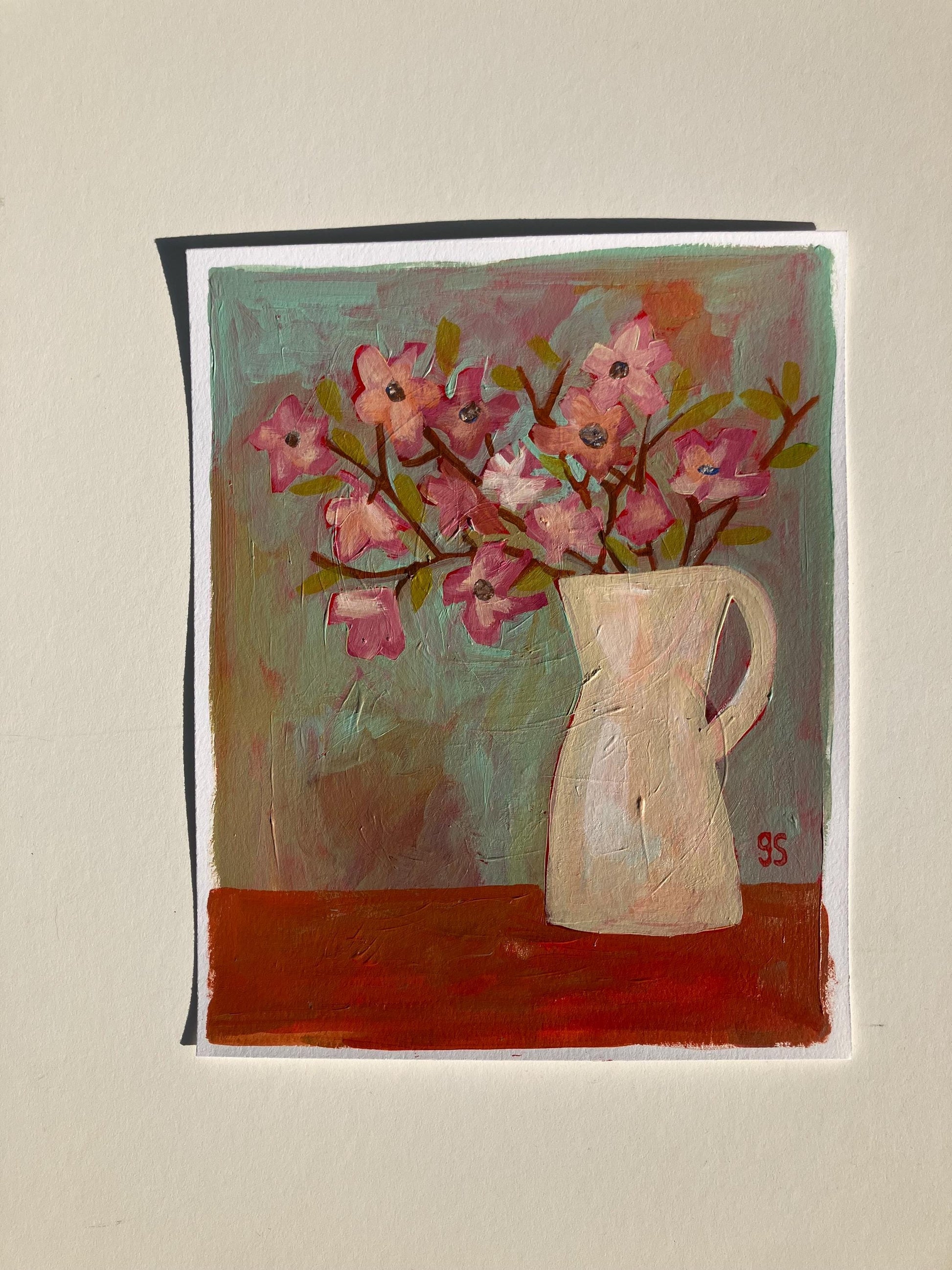 Mixed media acrylic painting of a pitcher of sweet pink flowers.