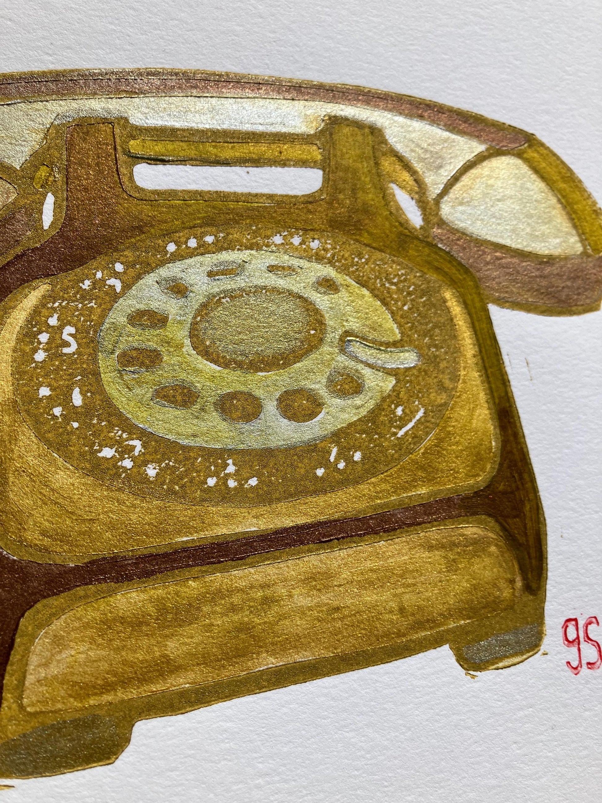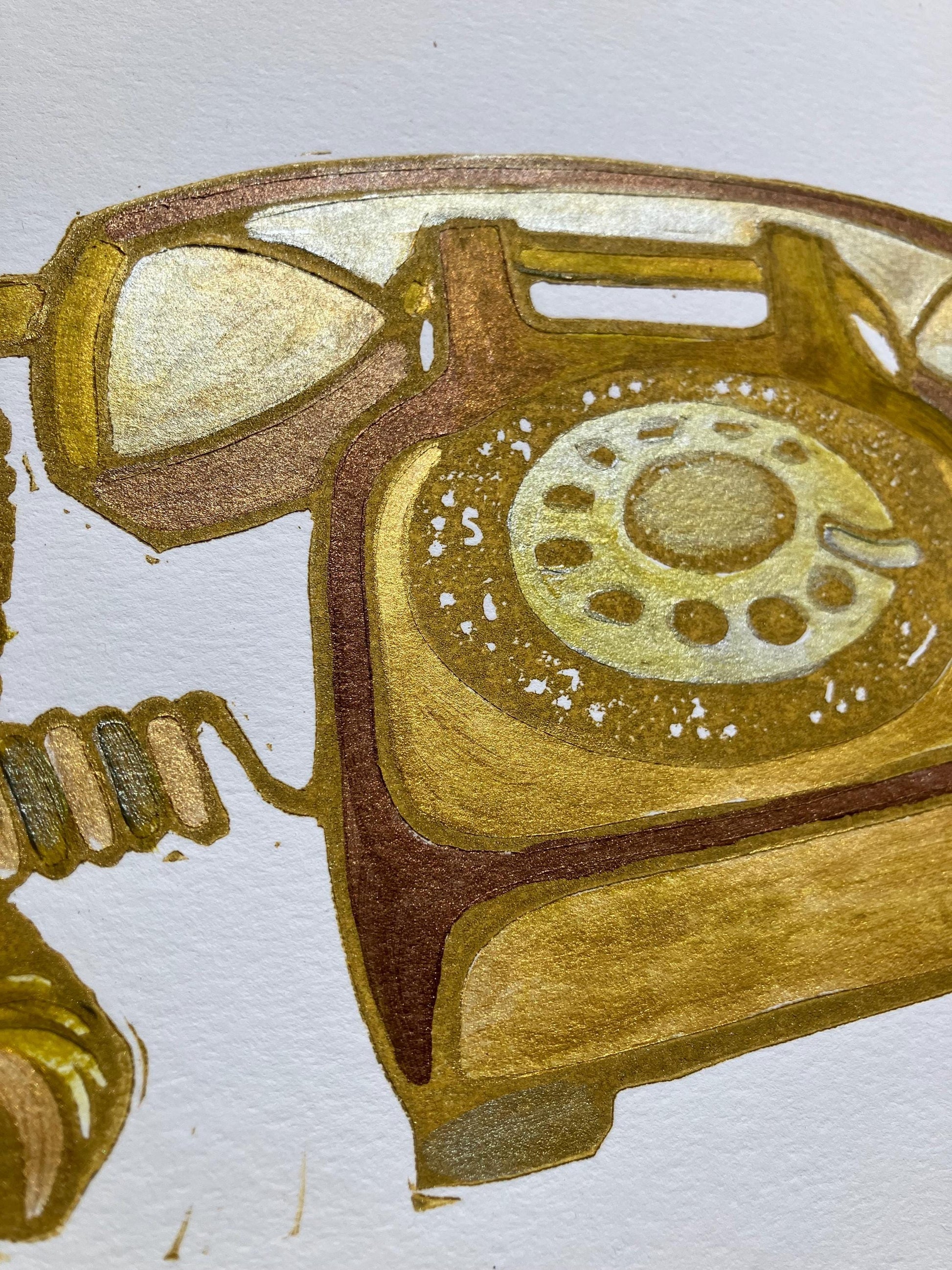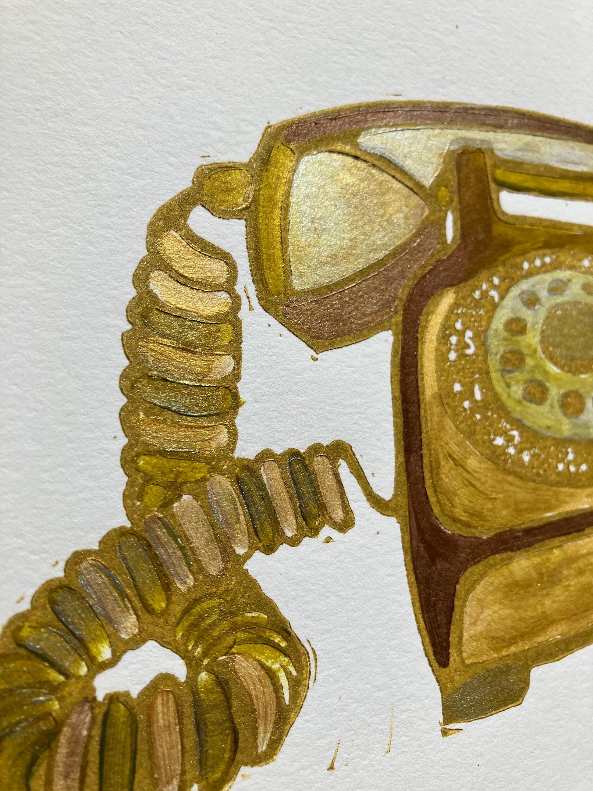 Mixed media acrylic painting of a vintage rotary phone in metallic gold, copper, and silver