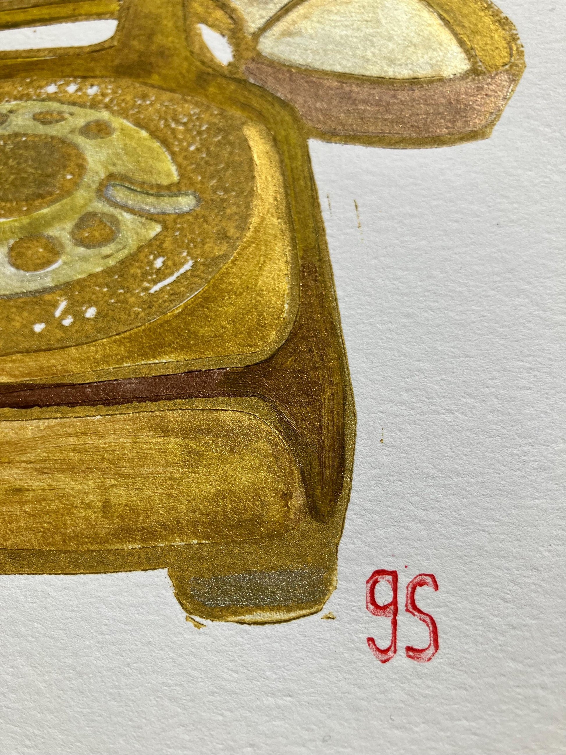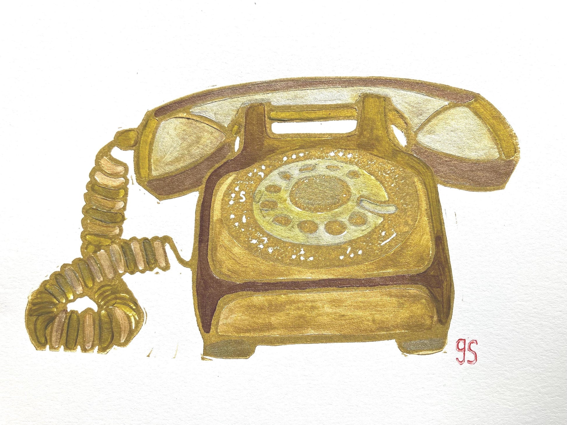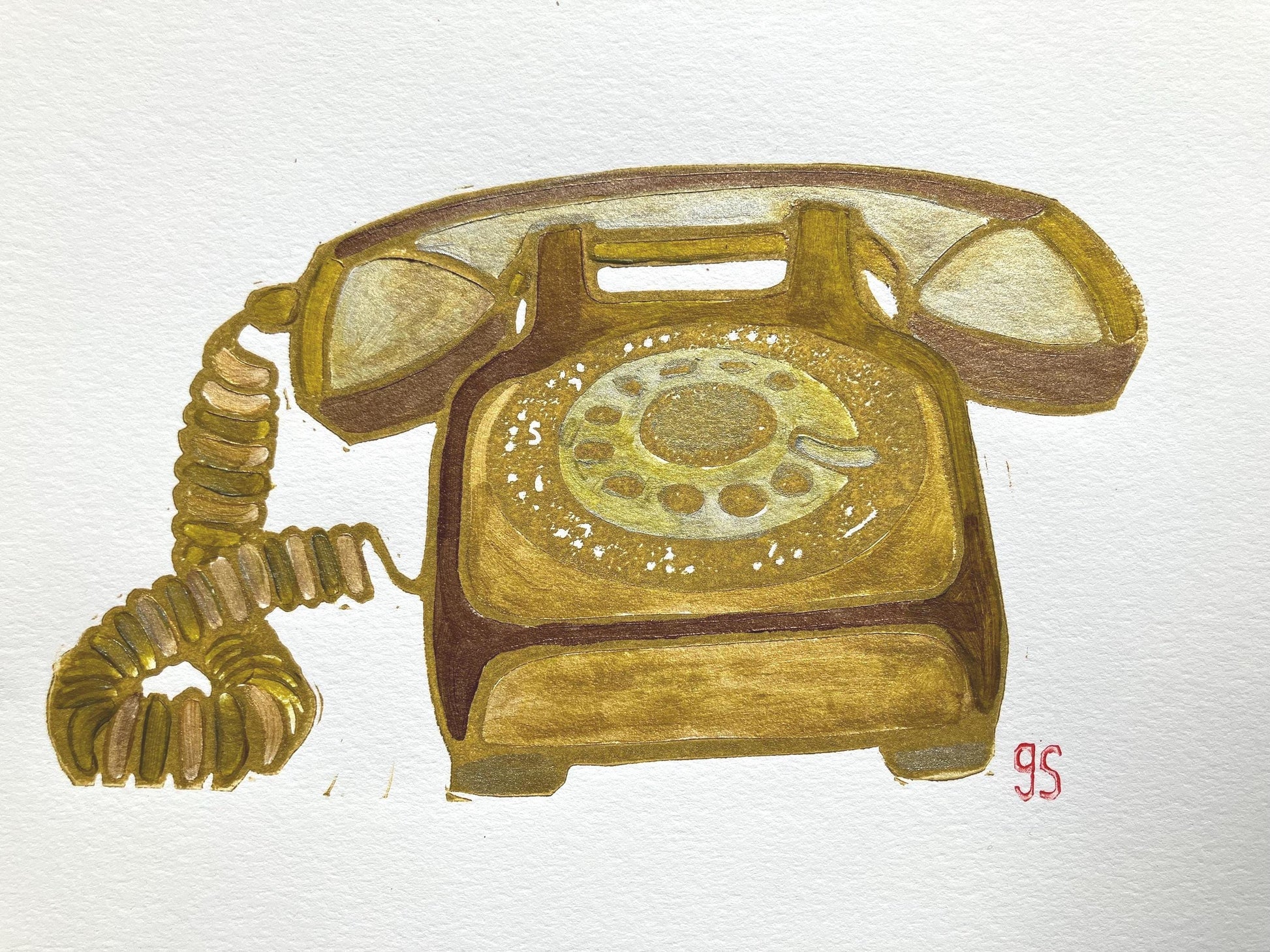 Mixed media acrylic painting of a vintage rotary phone in metallic gold, copper, and silver