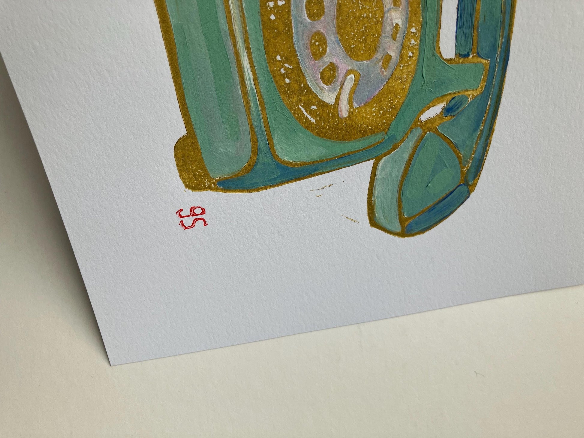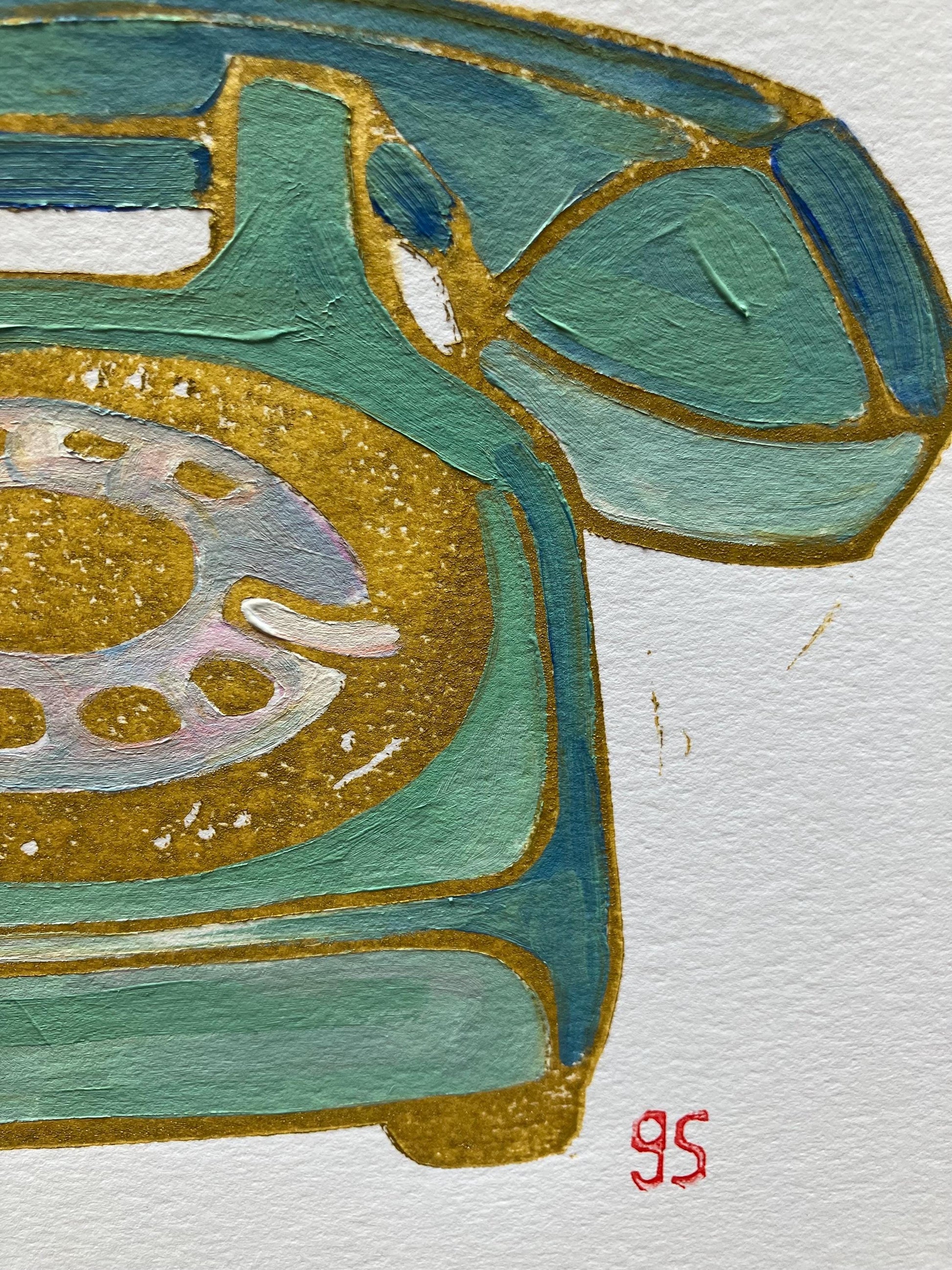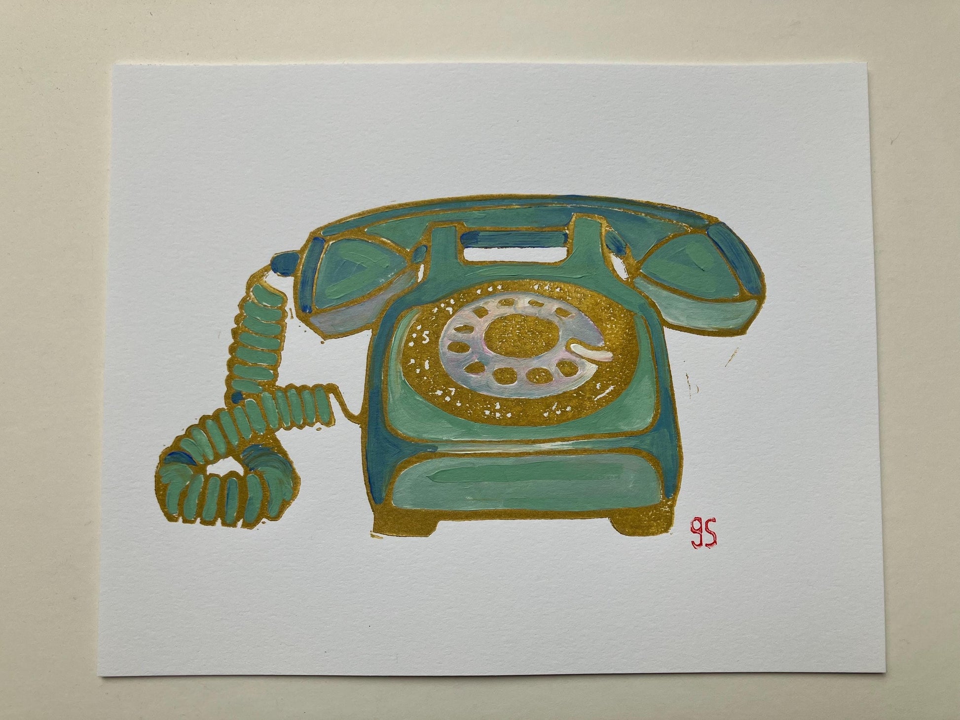 Vintage rotary telephone - Original acrylic linocut painting - (8x10in)