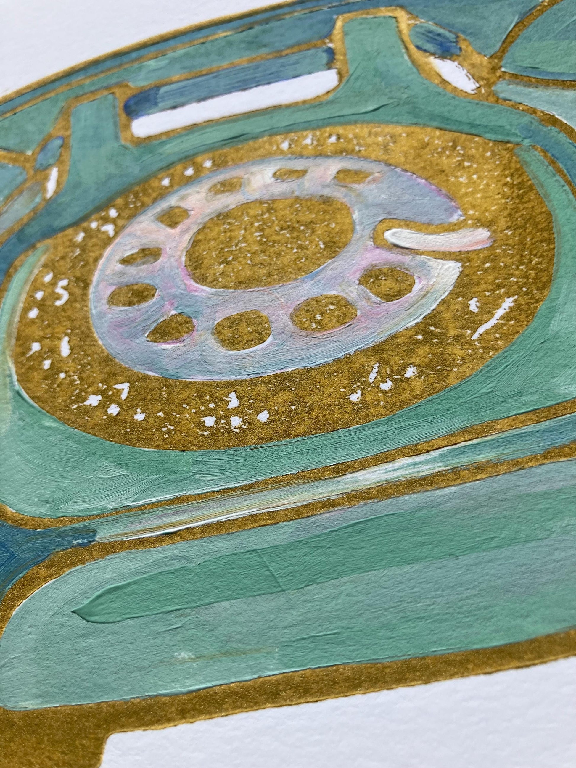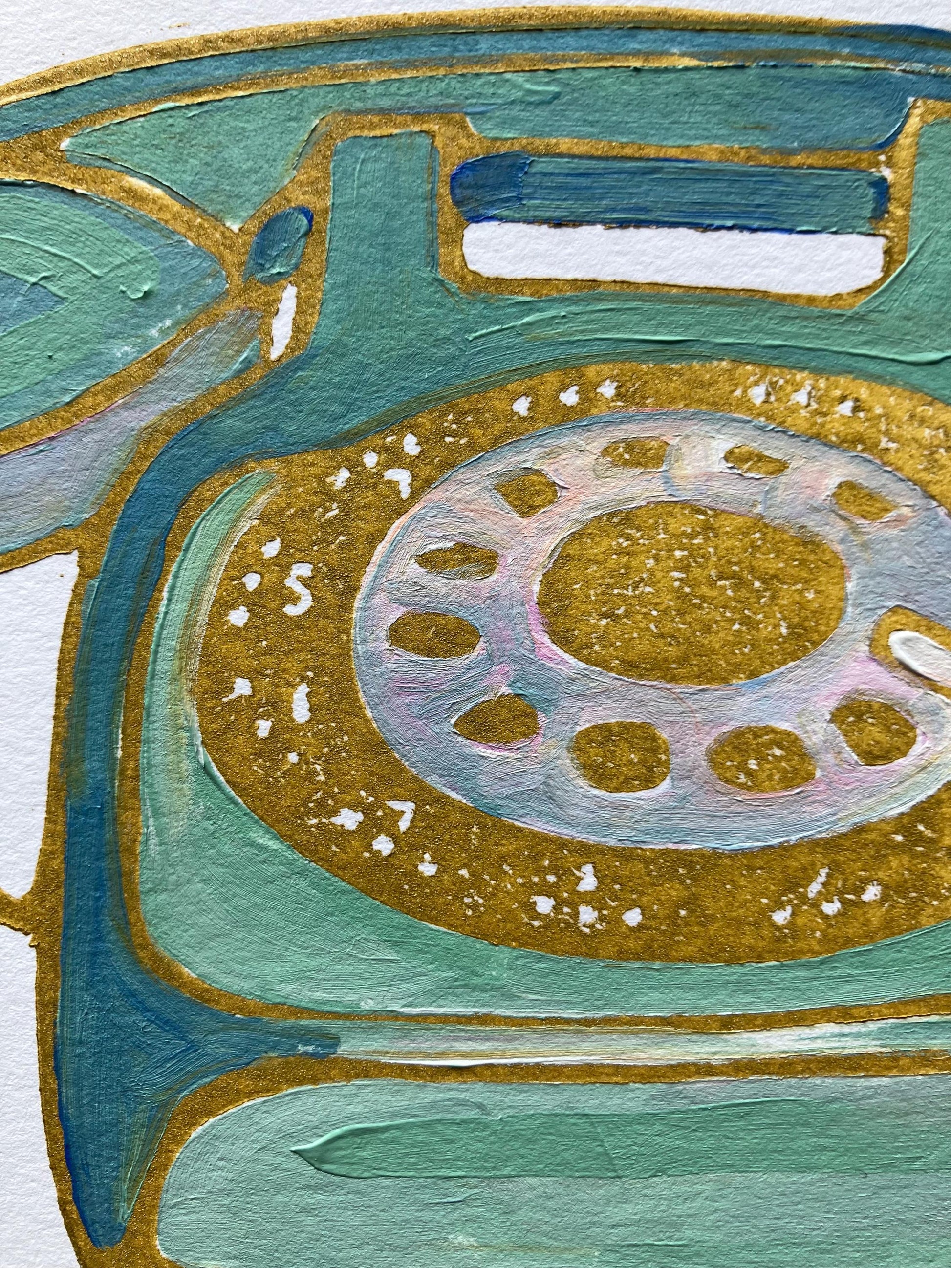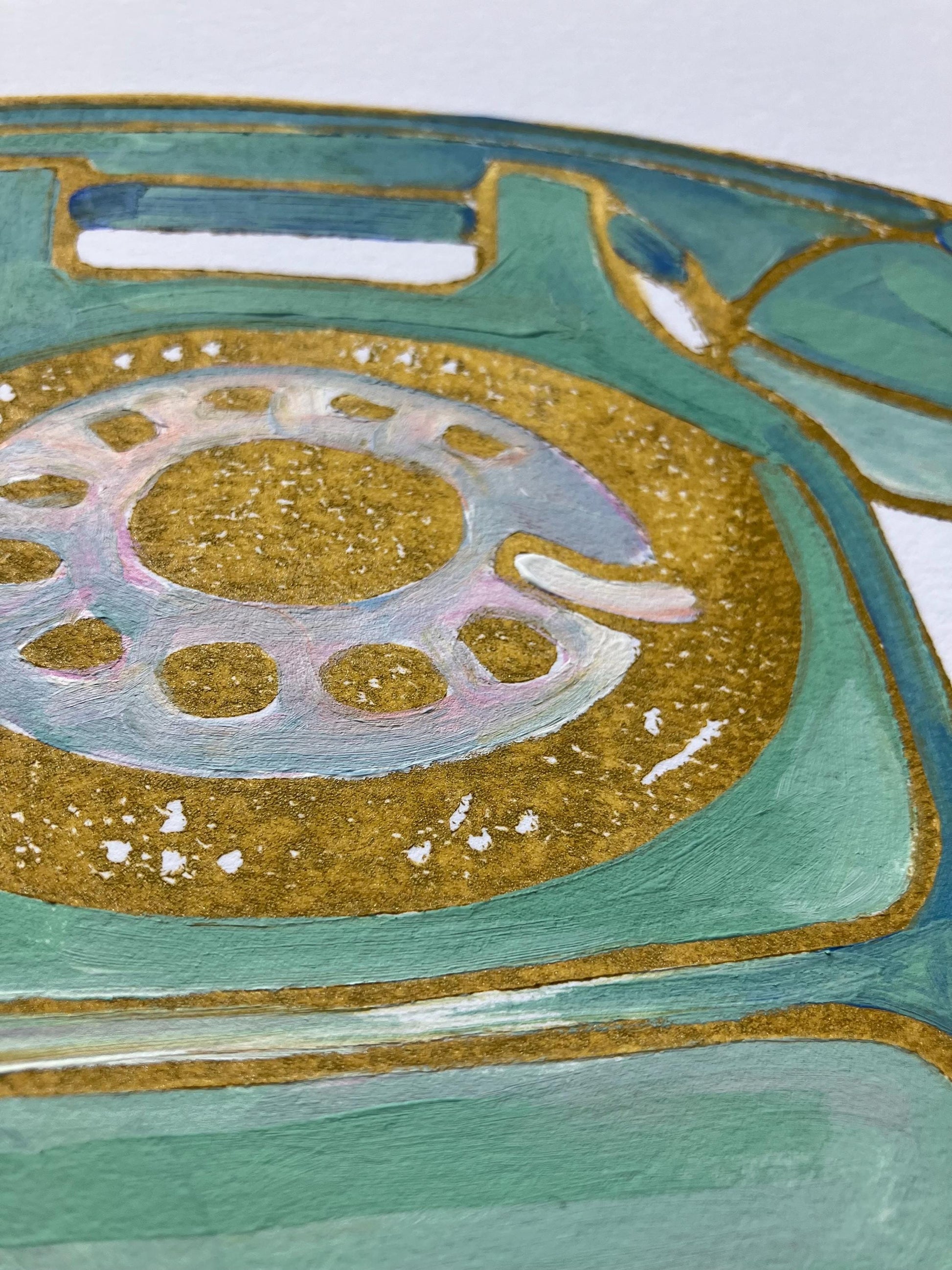 Mixed media acrylic painting of a vintage rotary phone in shimmery gold, turquoise, and teal.